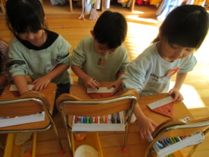 集団生活の中でトイレに行くことを習慣づけて、保護者の方と相談しながら一緒に外す練習をしていきますので、ご協力をお願いします。
