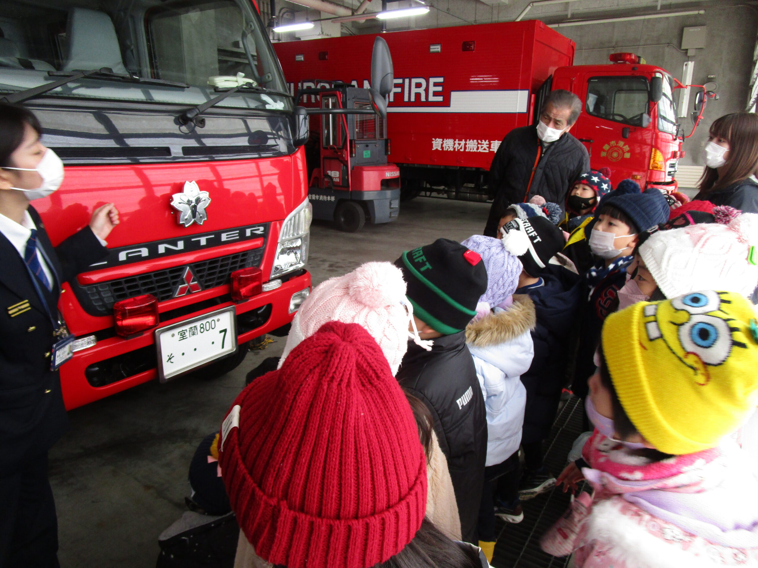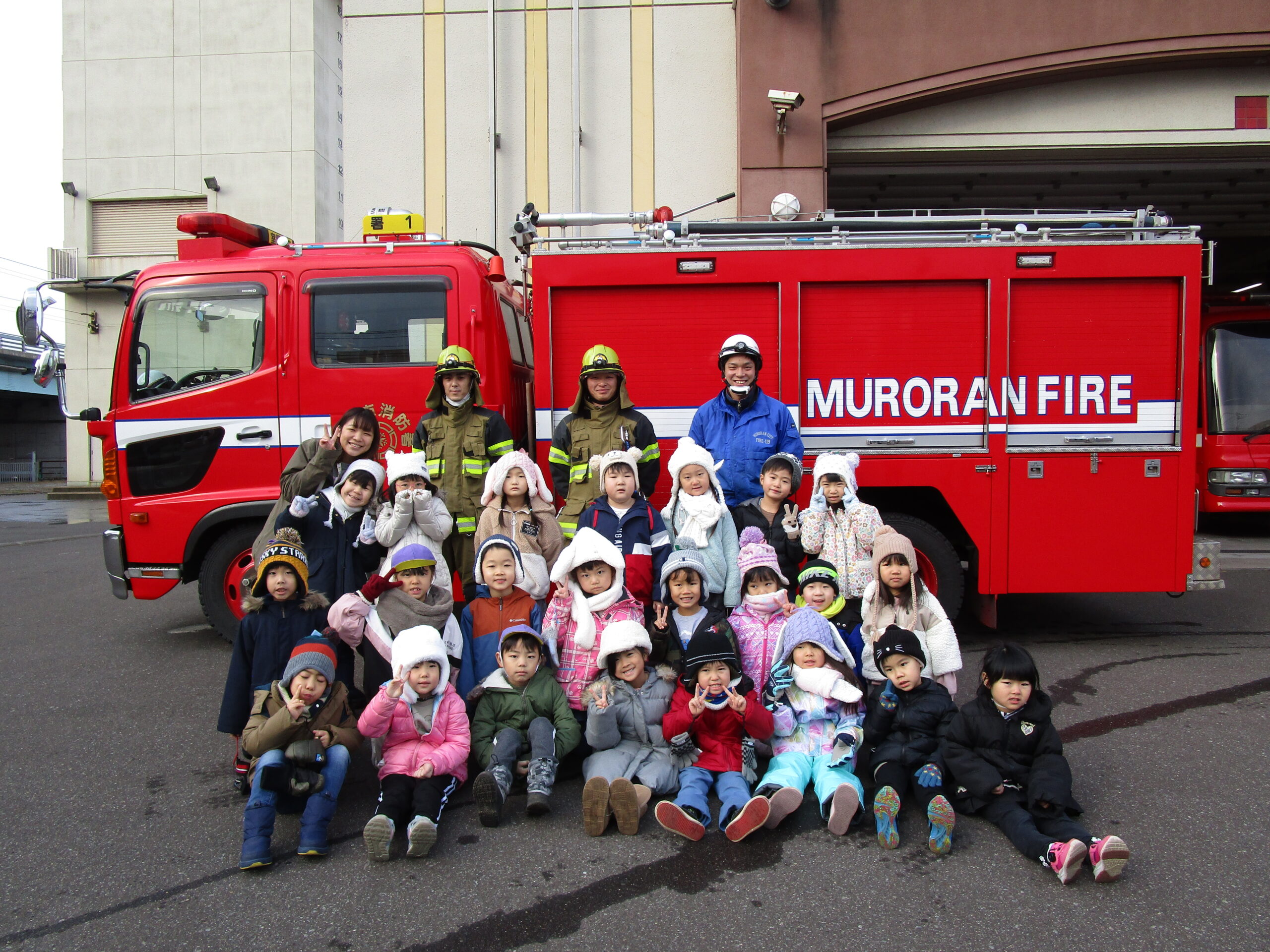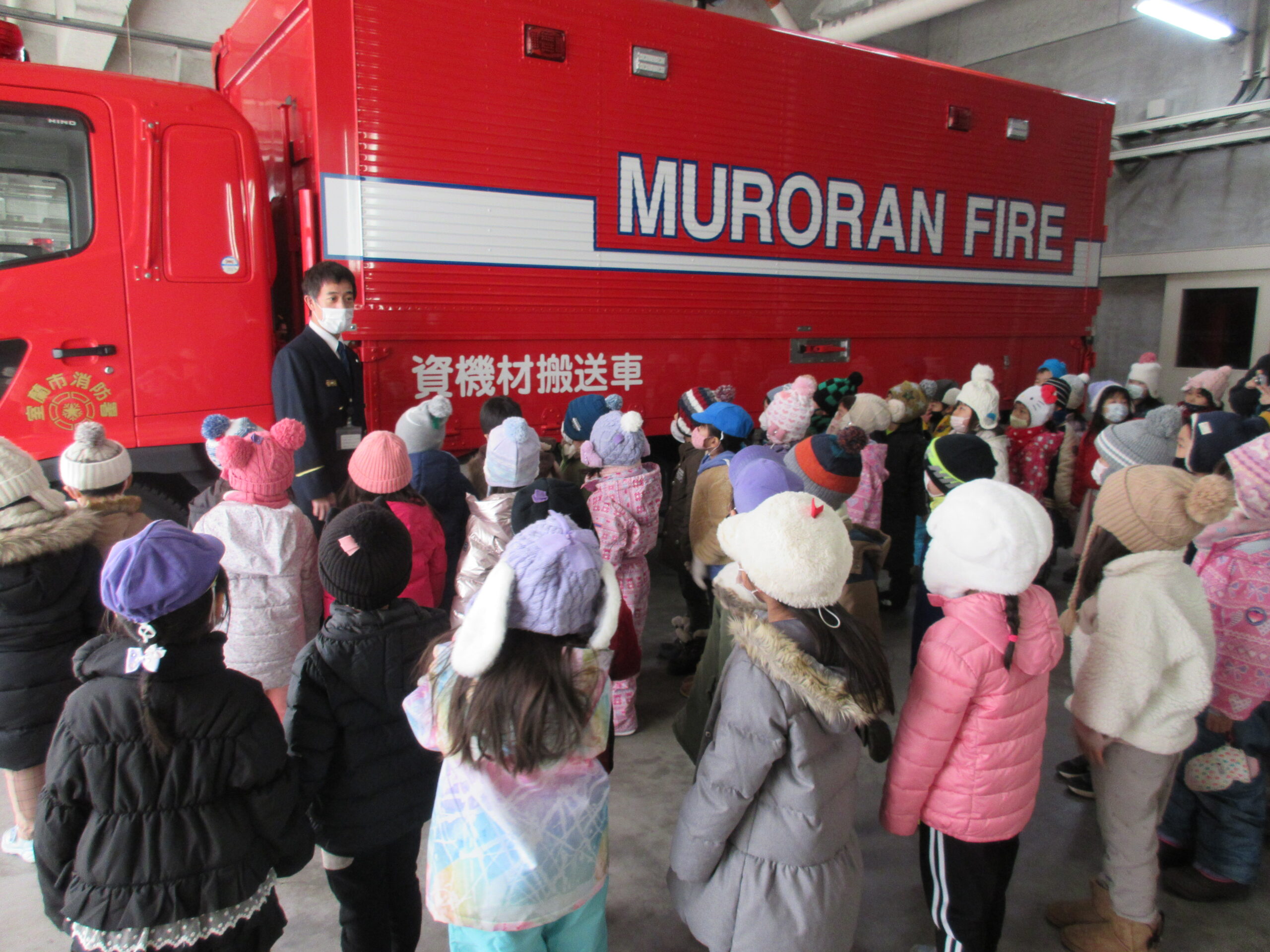 昨年度からコロナ禍の状況により2年続きで避難訓練を独自で実施したことで、園児は消防車を見学出来ませんでした。そこで、この度12月16日(木)10時30分より年長学年が幼稚園バスで室蘭消防署へ見学に出掛けました。現地では消防士さんにご挨拶をし、クラス毎に分かれて消防車や救急車の見学をし、消防士さんのお仕事やお仕事の大切さなど、様々なお話を聞きながら沢山の事を学ぶことが出来ました。また将来の夢に繋がる園児もいたのではないでしょうか。色々な事を吸収し気持ちが高ぶっていた子ども達でした。最後には消防士さんとクラス写真を撮って大満足。今日の見学を受け入れて下さり、御丁寧に説明して頂きました消防の方々、お忙しい中大変有難うございました。