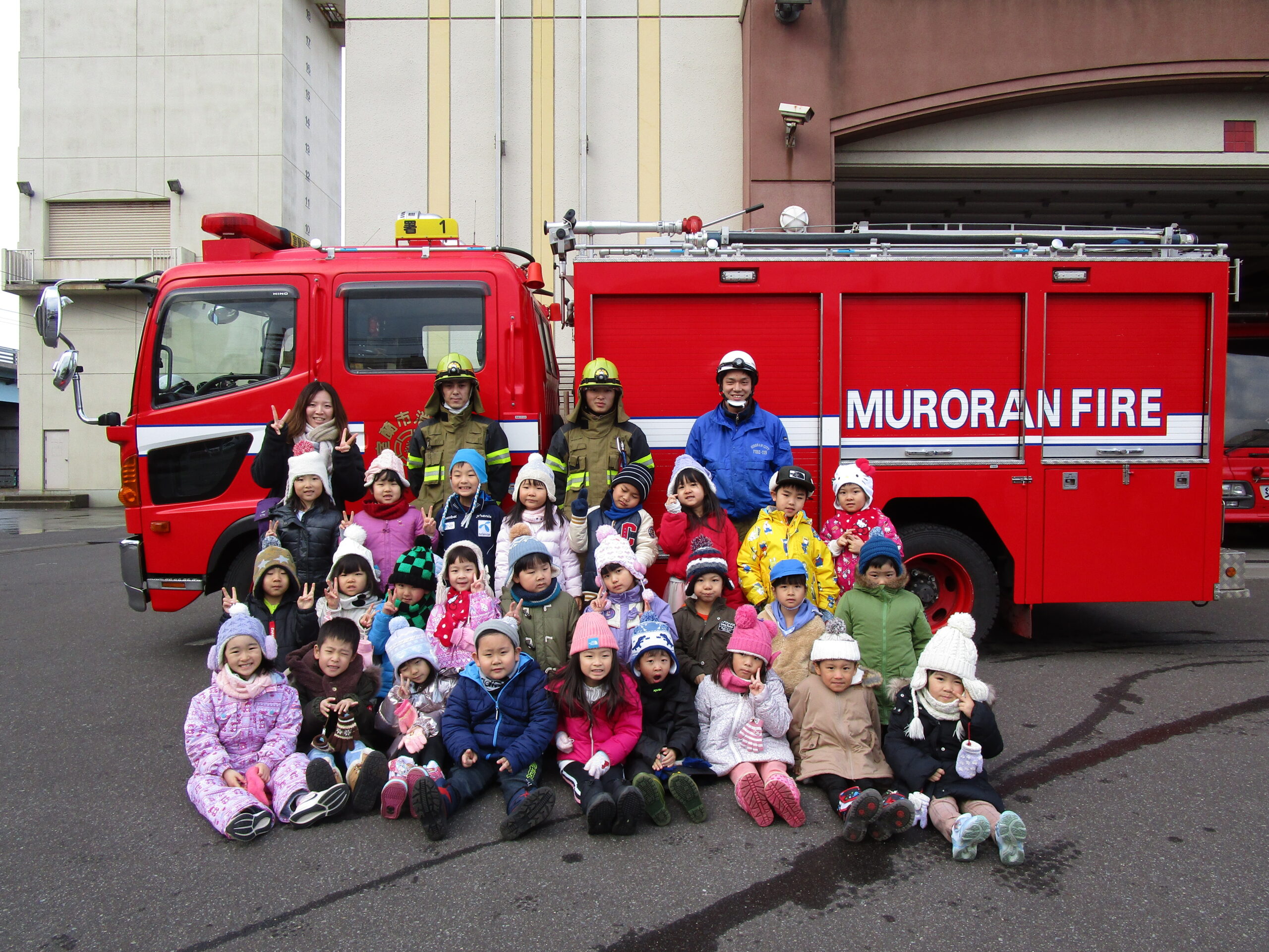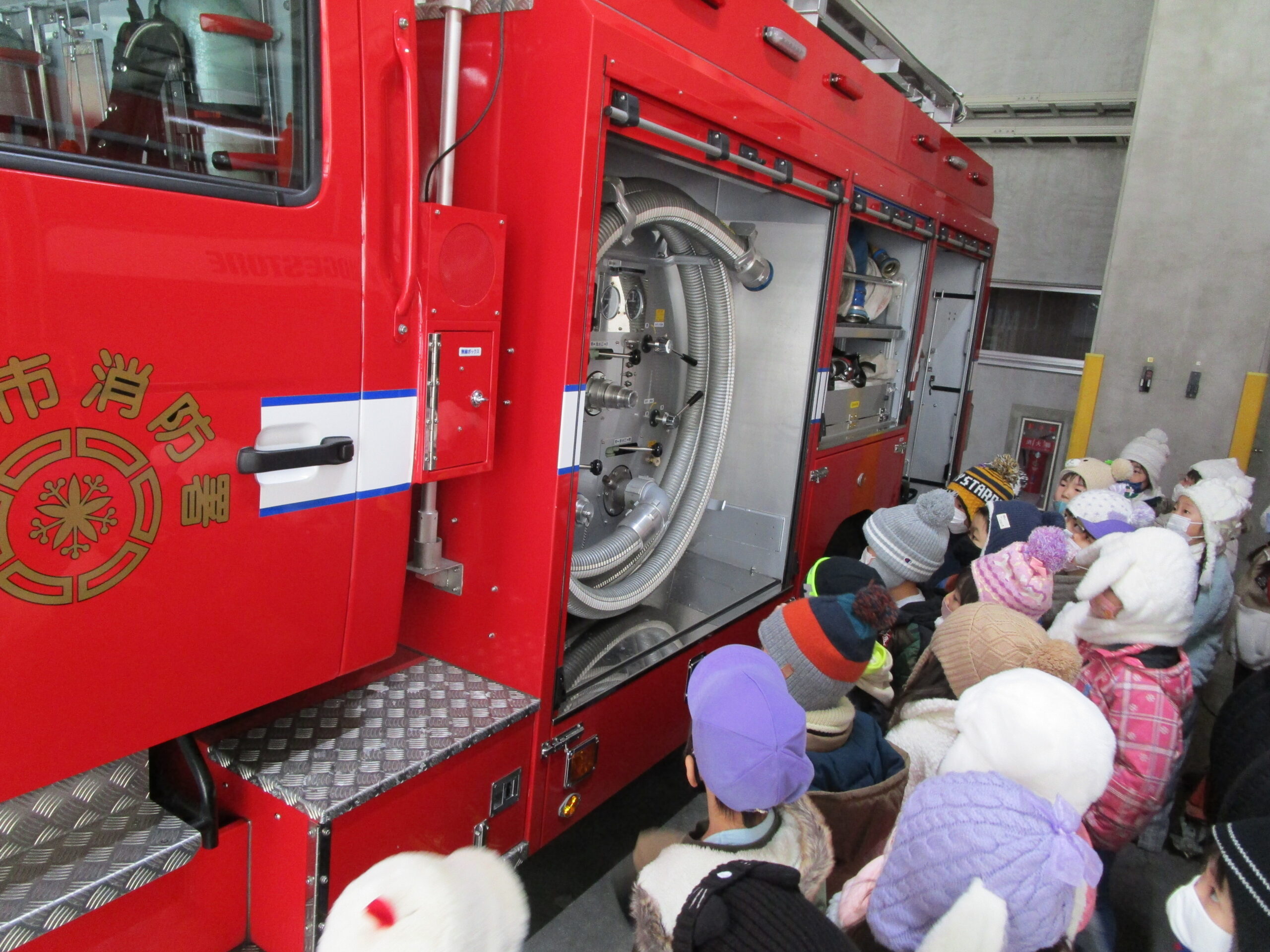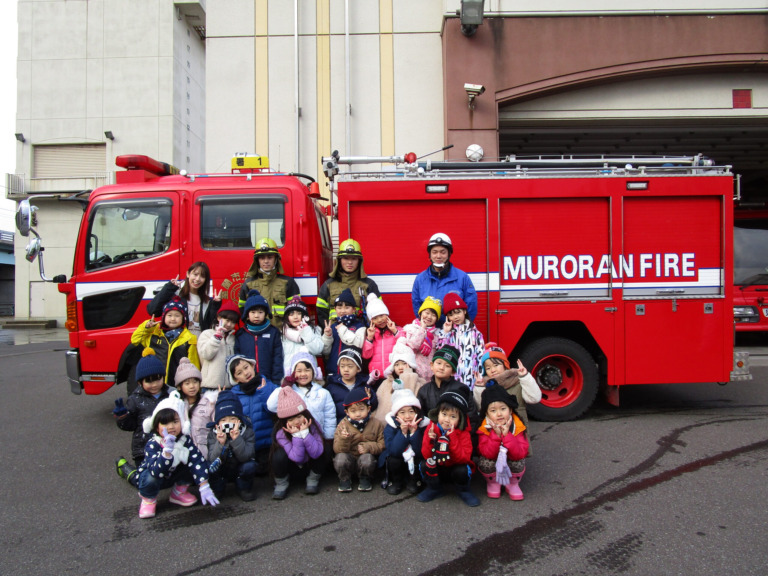 昨年度からコロナ禍の状況により2年続きで避難訓練を独自で実施したことで、園児は消防車を見学出来ませんでした。そこで、この度12月16日(木)10時30分より年長学年が幼稚園バスで室蘭消防署へ見学に出掛けました。現地では消防士さんにご挨拶をし、クラス毎に分かれて消防車や救急車の見学をし、消防士さんのお仕事やお仕事の大切さなど、様々なお話を聞きながら沢山の事を学ぶことが出来ました。また将来の夢に繋がる園児もいたのではないでしょうか。色々な事を吸収し気持ちが高ぶっていた子ども達でした。最後には消防士さんとクラス写真を撮って大満足。今日の見学を受け入れて下さり、御丁寧に説明して頂きました消防の方々、お忙しい中大変有難うございました。