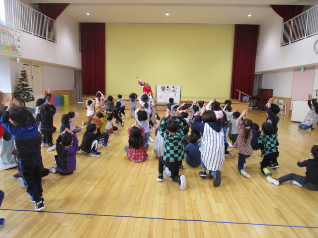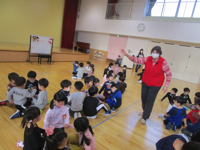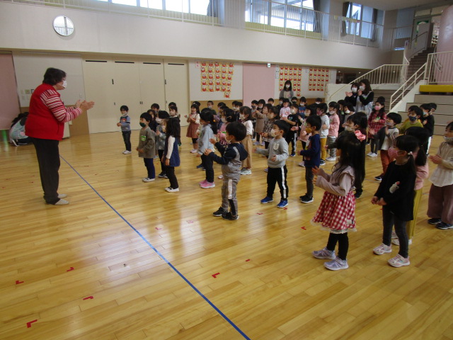 (94)令和3年度「年中組英語指導」 2021年12月15日 園内ブログ 今日は年中学年で、初めてジェーン先生の英語を学びました。ジェーン先生の発音を真似て英語を話したり、英語の歌やゲーム遊びを楽しみました。体も沢山動かし英語の楽しさを味わうことができました。年長学年になったら英語の時間もあるので、進級に期待を膨らませる様子でした。 今日の病気欠席者は、風邪・咳症状5名、発熱2名、胃腸炎1名、大事をとって5名です。