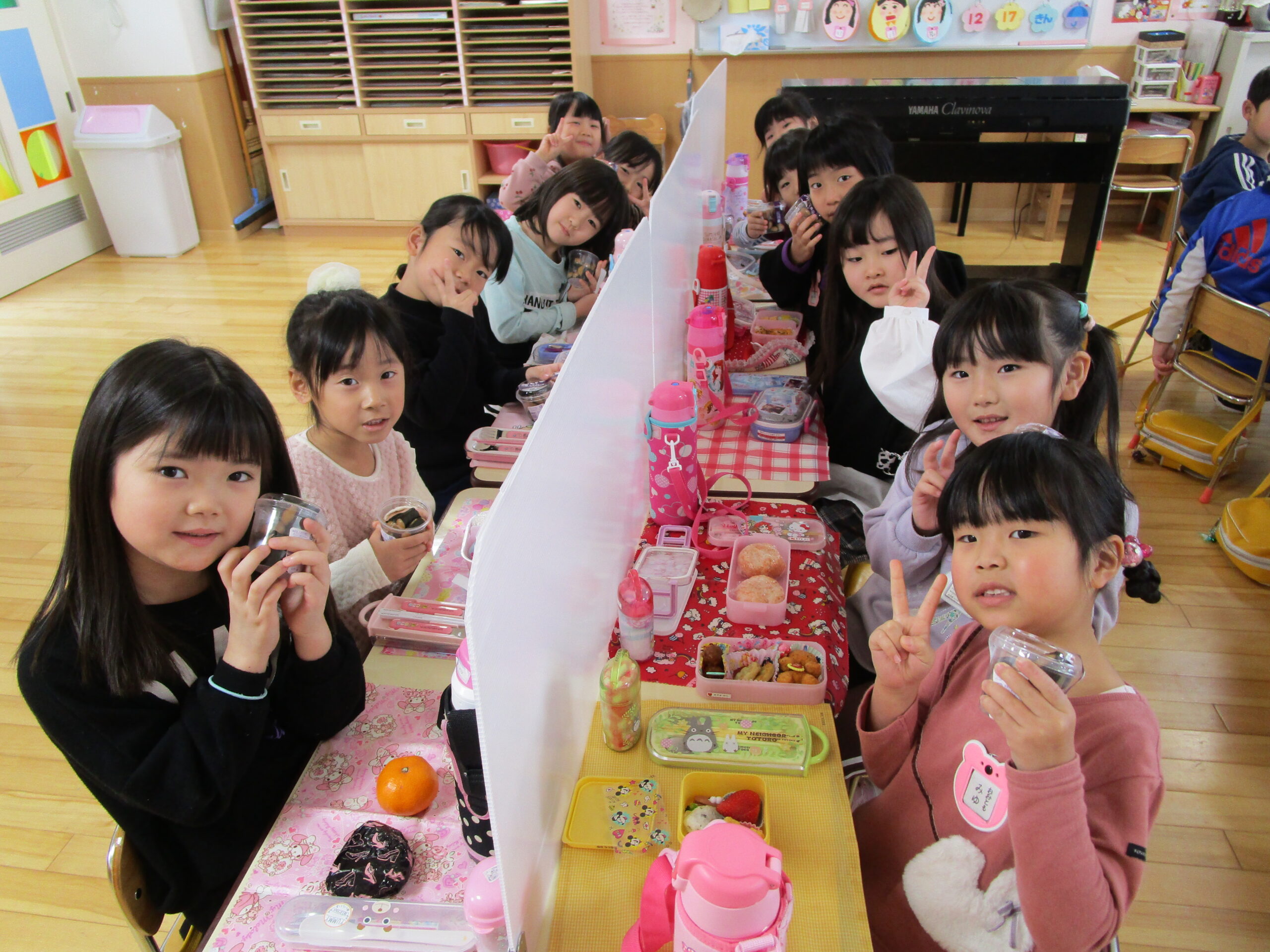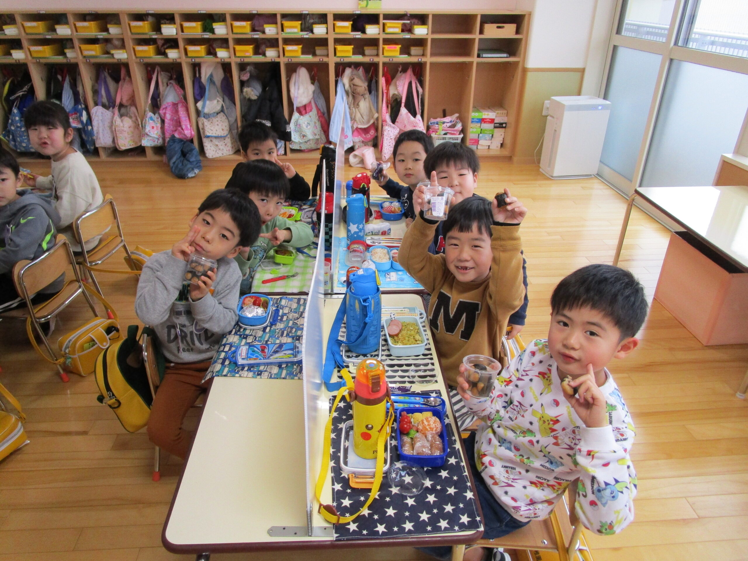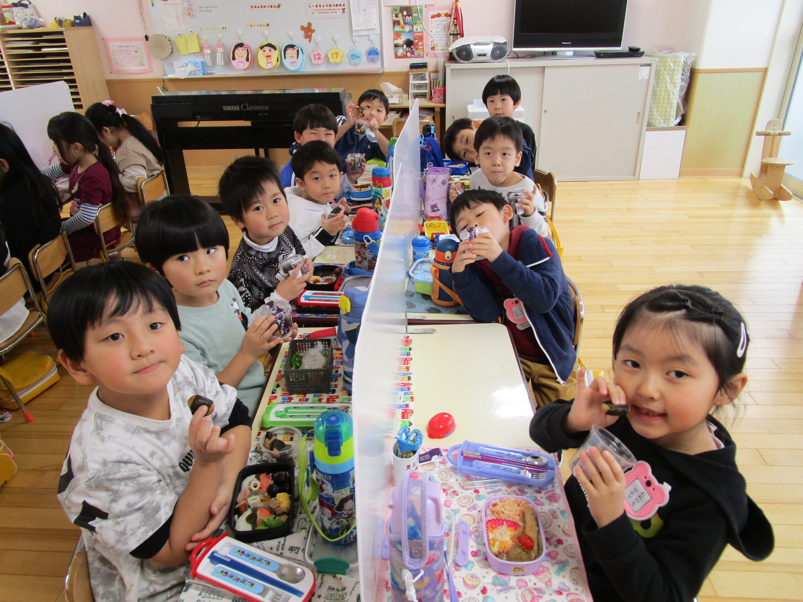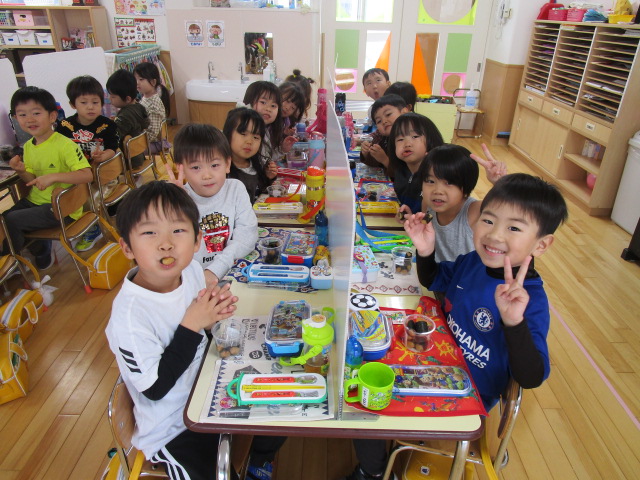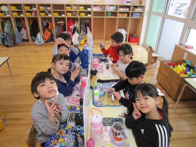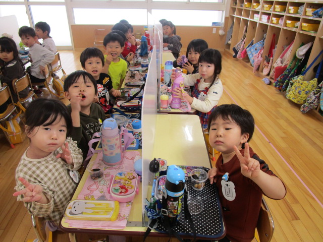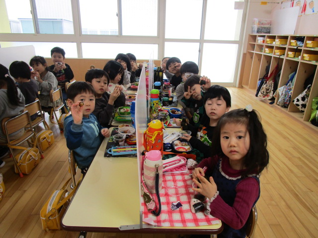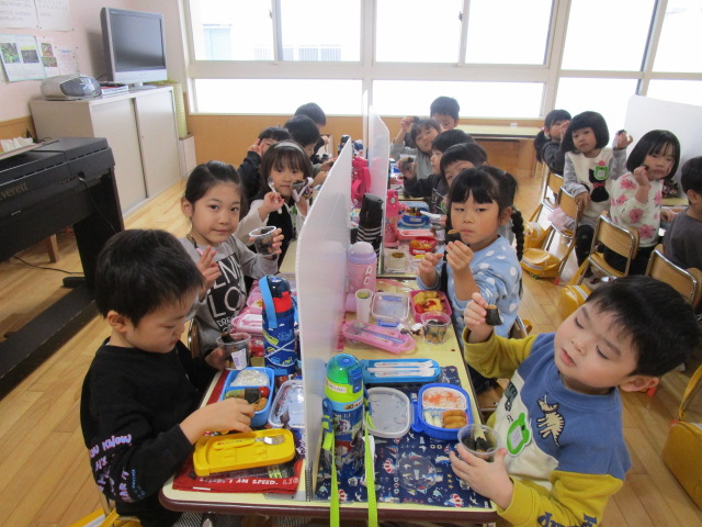 (96)令和3年度「お餅会食」 2021年12月17日 園内ブログ 今日12月17日(金)お餅会食をしました。コロナ禍の状況で一家一役制を取り止めたことにより、お餅つきを断念しましたので、シャトレーゼの磯辺餅を各お部屋で食べて、お餅つき会の気分を味わいました。モチモチのお餅を食べ、「おいしい」と笑顔が溢れていました。来年はお餅つき会ができることを願っています。 今日の病気欠席者は、風邪・咳症状4名、溶連菌1名、大事をとって1名です。 【年少】 【年中】 【年長】
