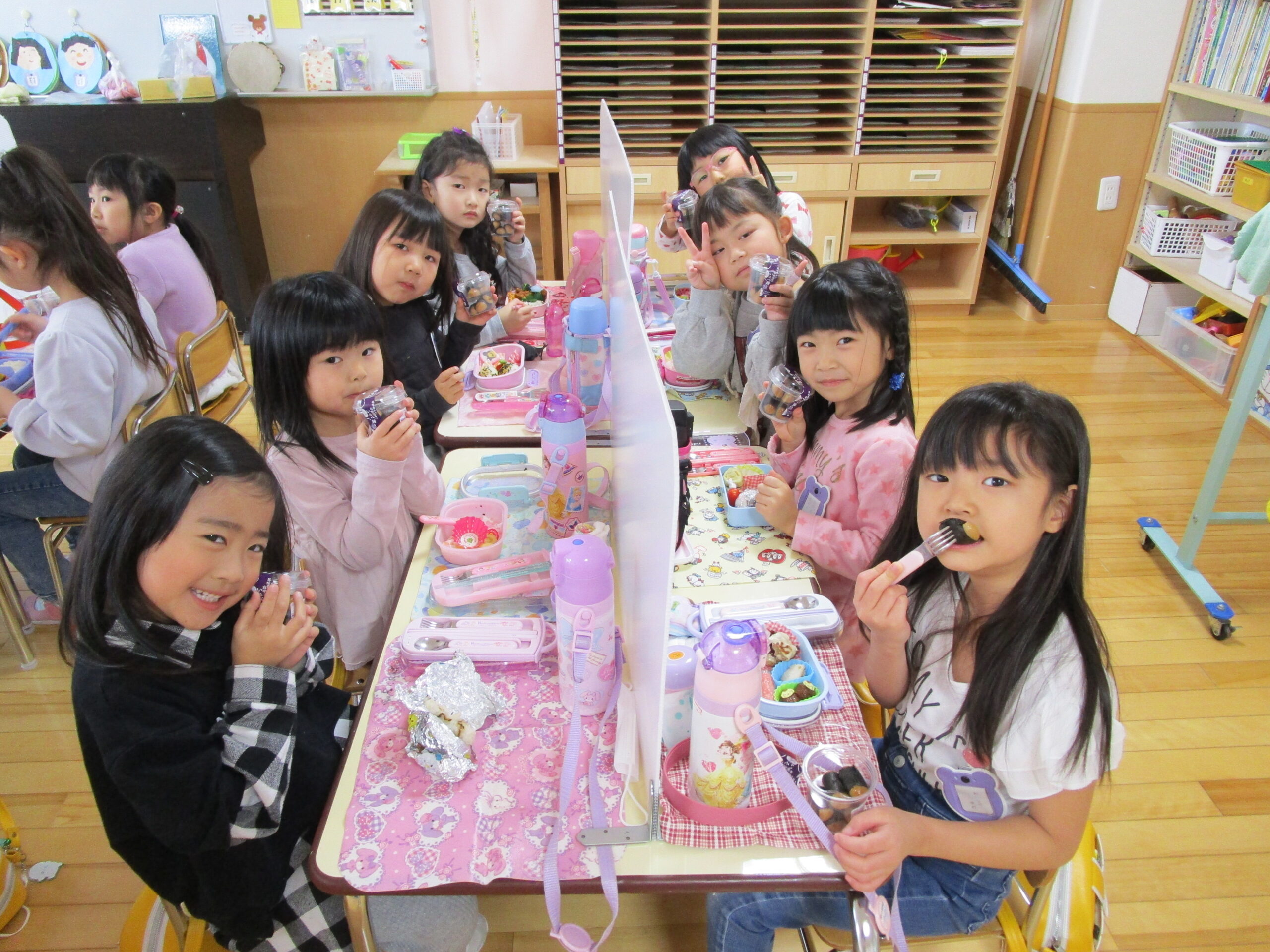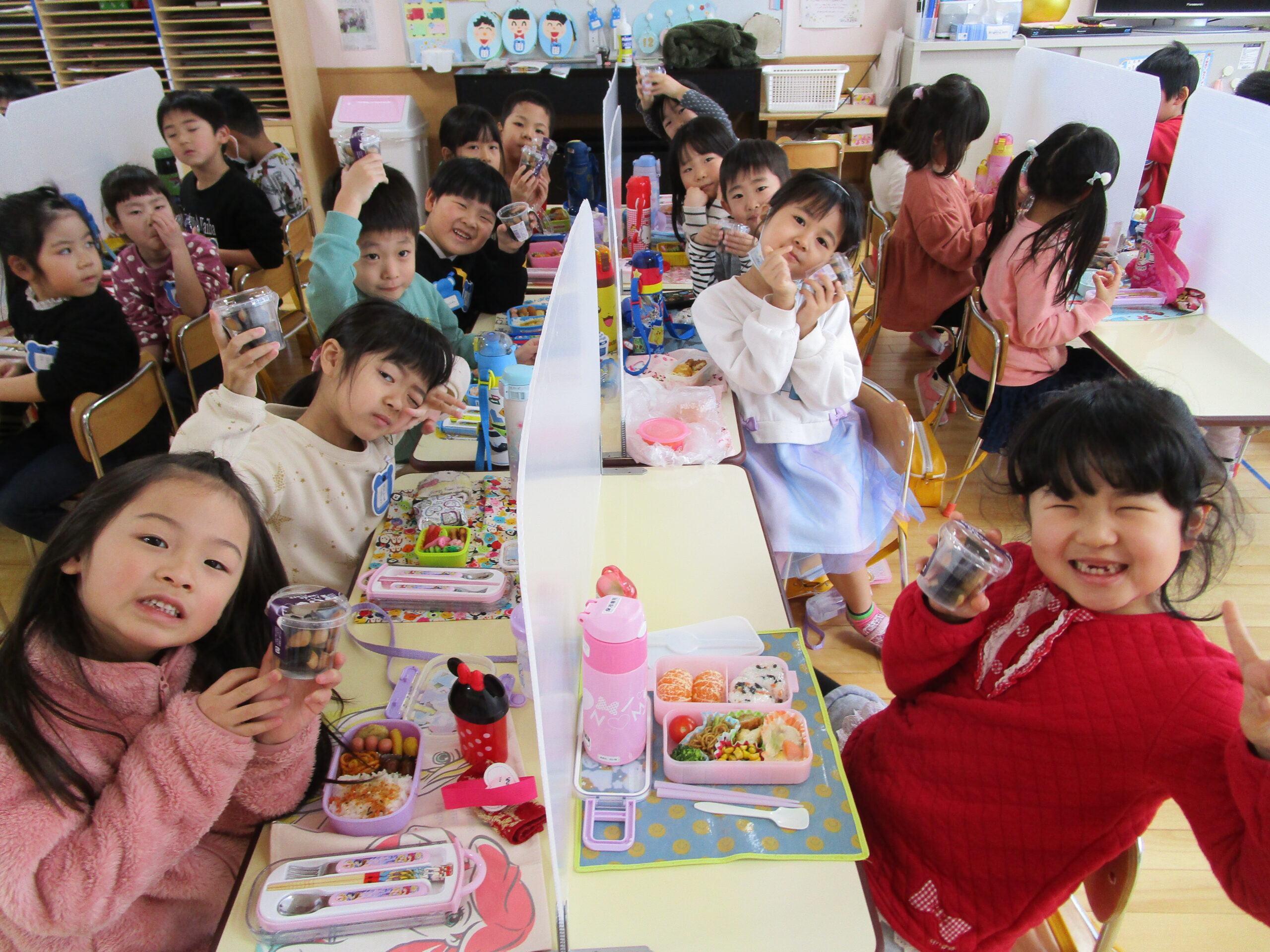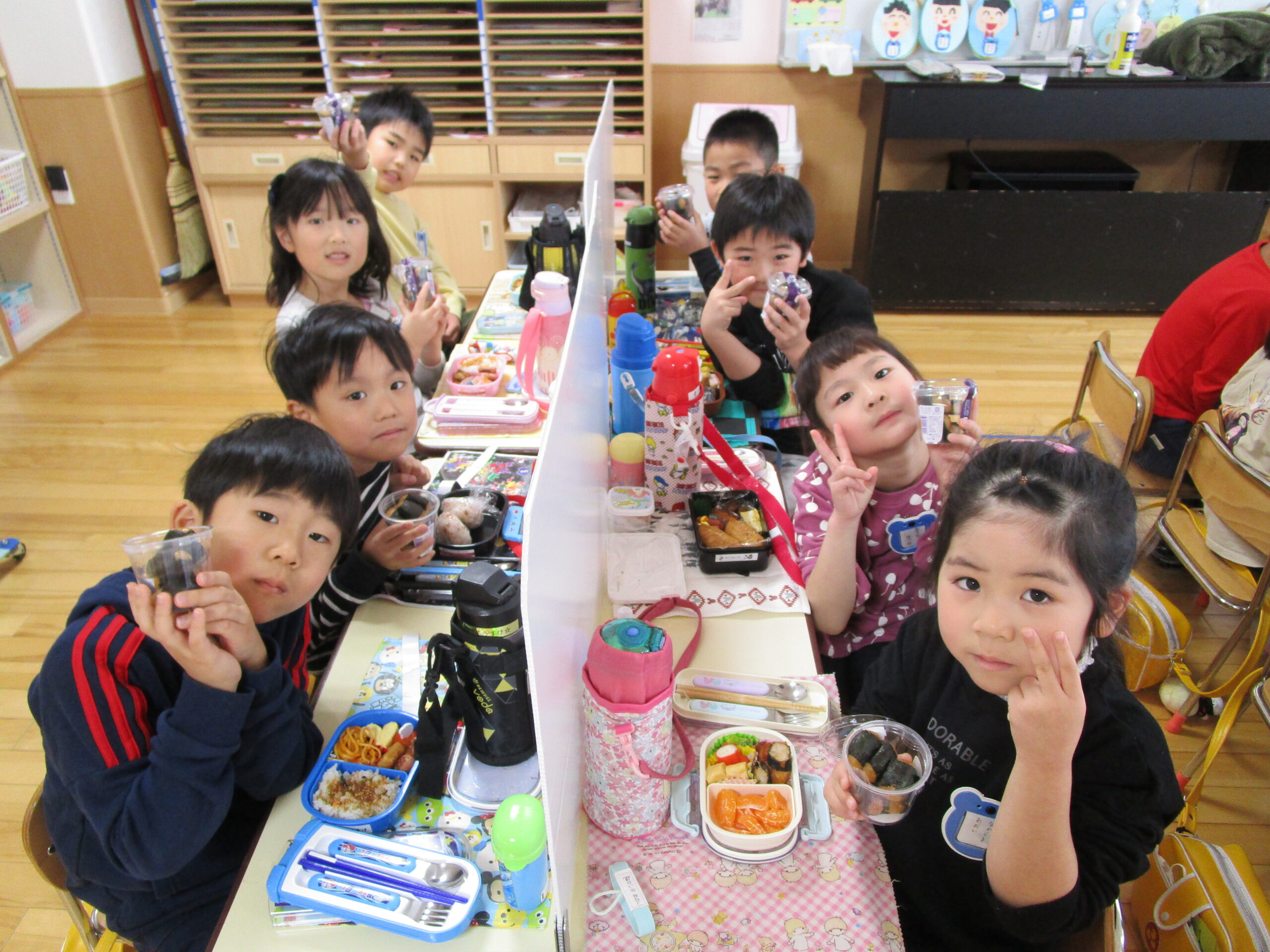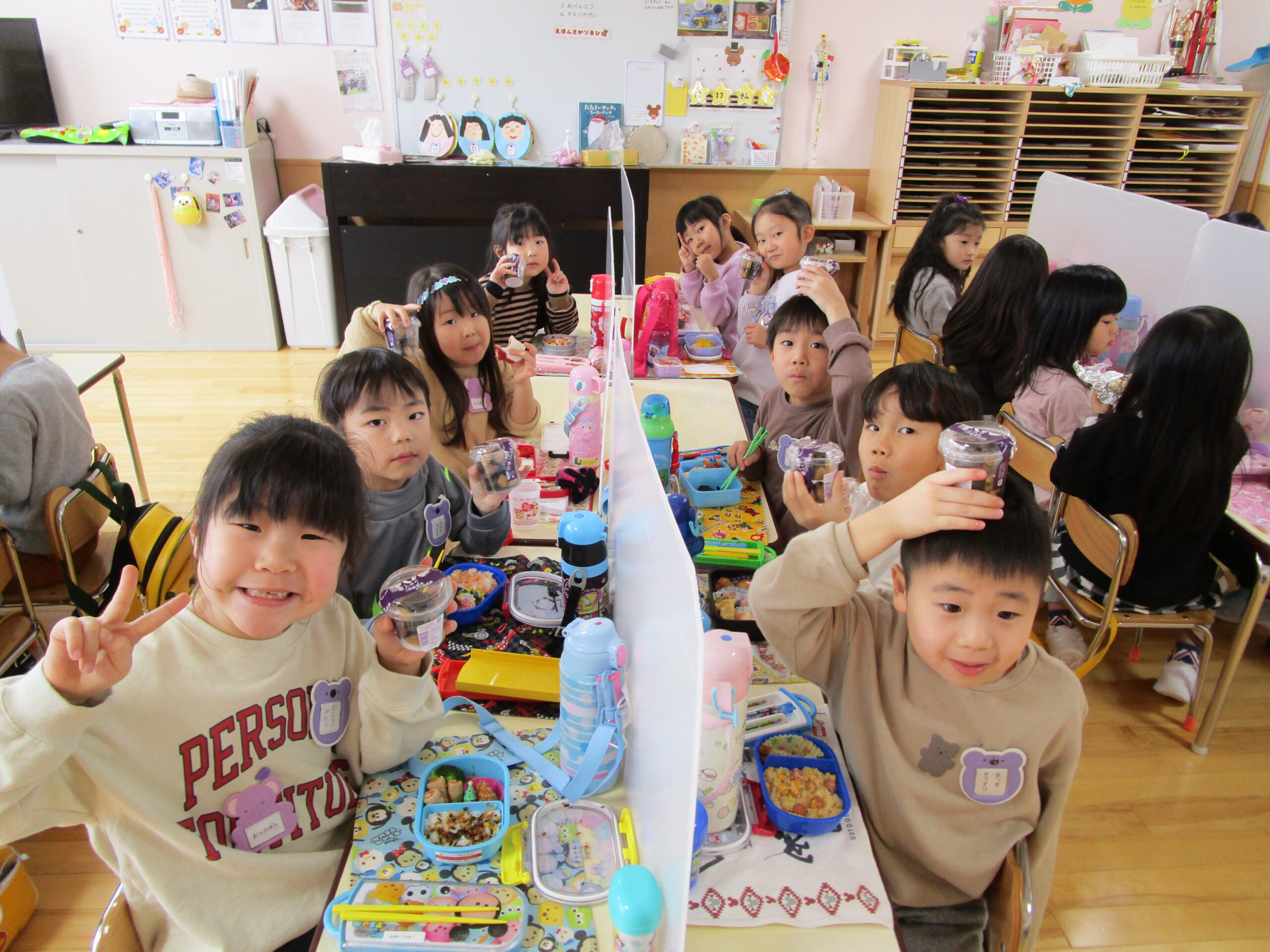 (96)令和3年度「お餅会食」 2021年12月17日 園内ブログ 今日12月17日(金)お餅会食をしました。コロナ禍の状況で一家一役制を取り止めたことにより、お餅つきを断念しましたので、シャトレーゼの磯辺餅を各お部屋で食べて、お餅つき会の気分を味わいました。モチモチのお餅を食べ、「おいしい」と笑顔が溢れていました。来年はお餅つき会ができることを願っています。 今日の病気欠席者は、風邪・咳症状4名、溶連菌1名、大事をとって1名です。 【年少】 【年中】 【年長】