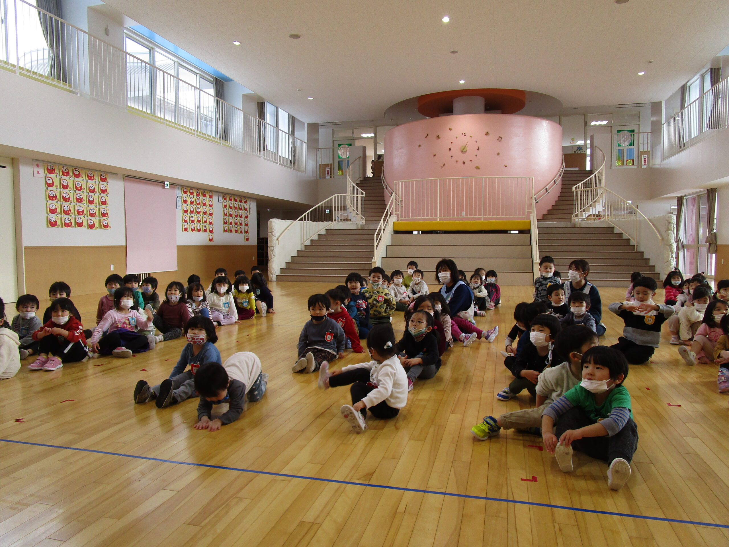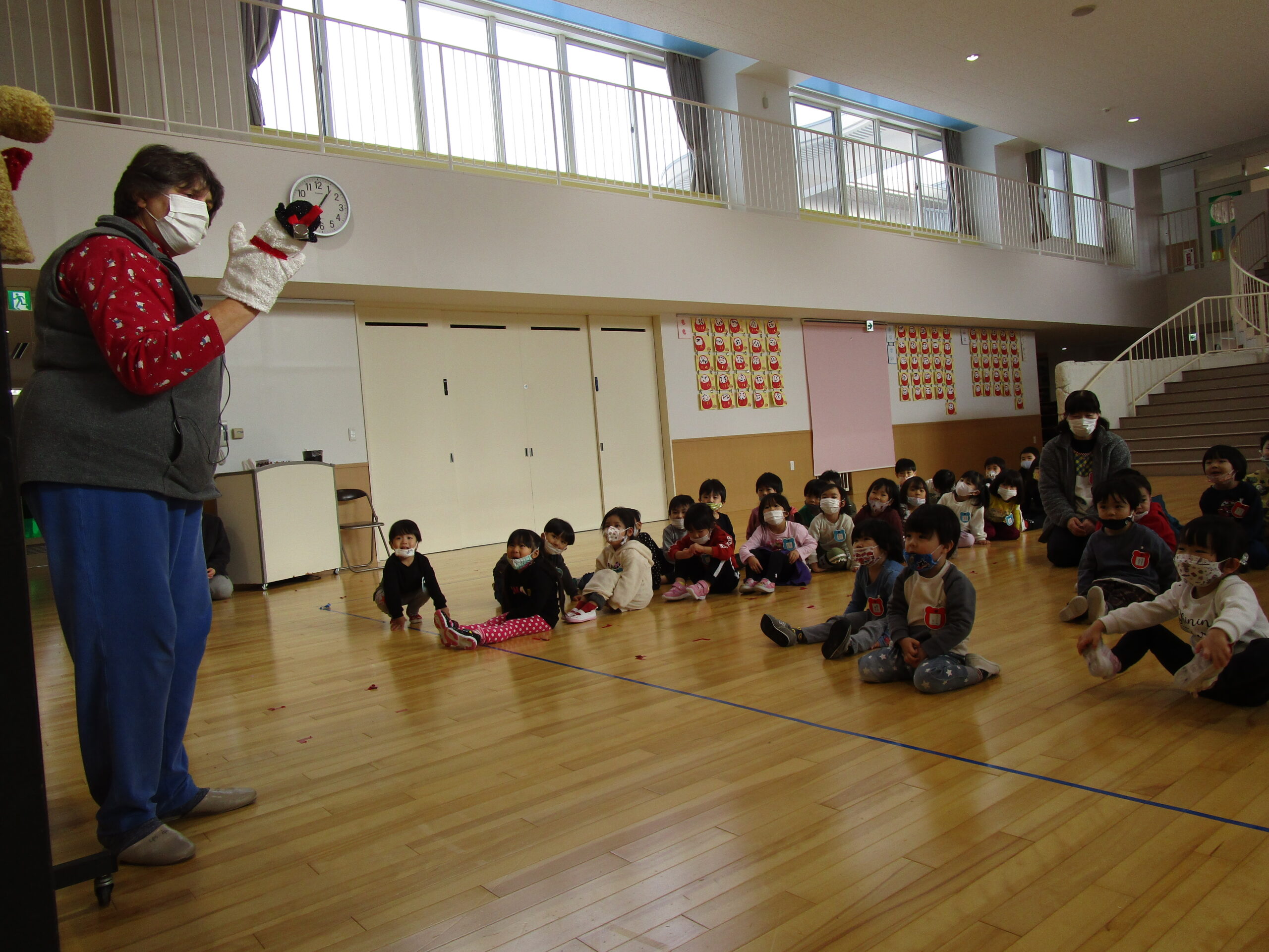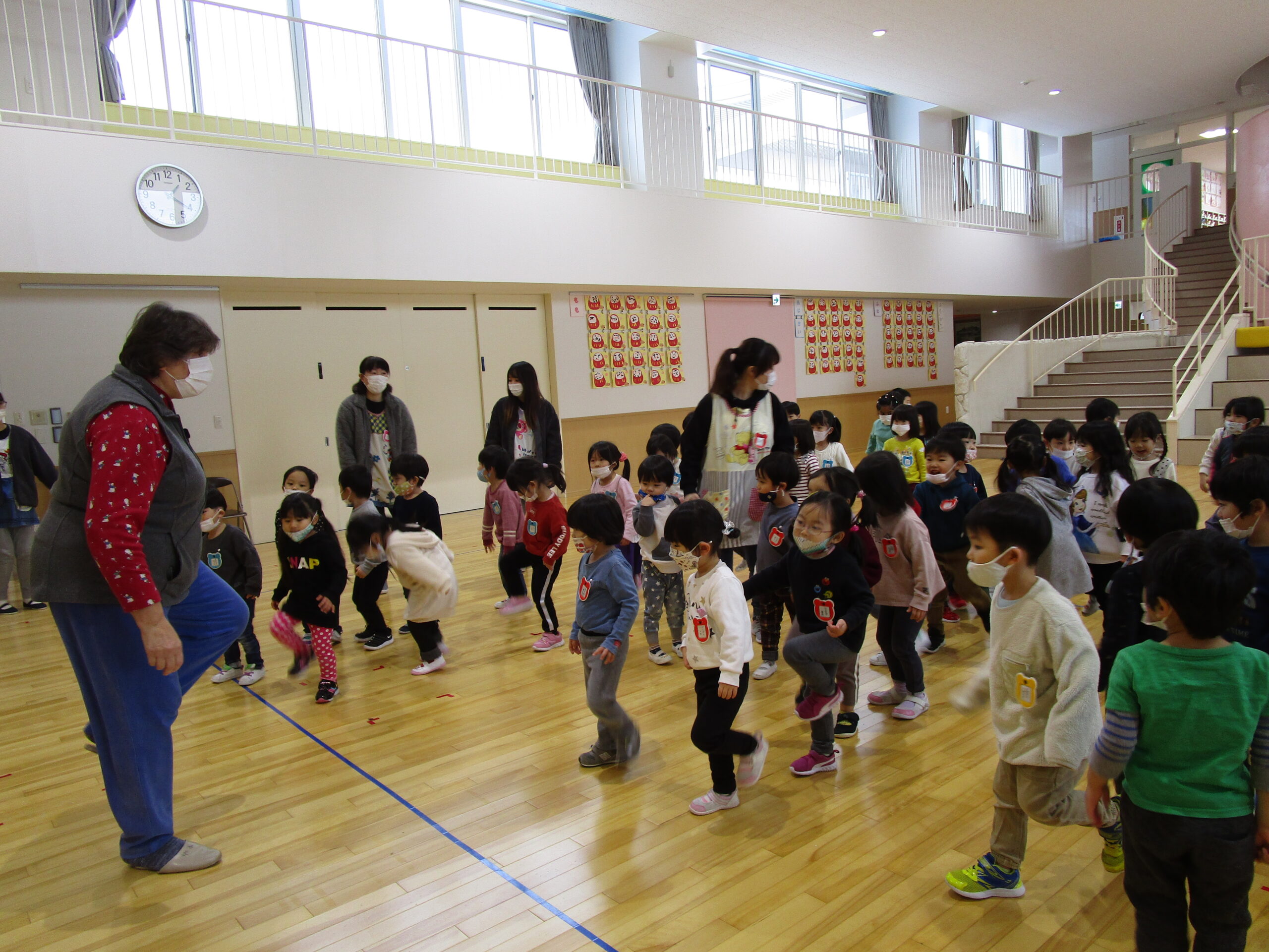 (99)令和3年度「年少組英語指導」 2021年12月22日 園内ブログ 12月22日(水)年少学年は初めてジェーン先生の英語を学びました。普段は年長学年の取り組みですが、今日は特別に年少さんがクリスマスを前にトナカイや雪だるま、サンタの英語を音楽に合わせてお勉強し、身体を動かしながら楽しい時間を過ごしました。 今日の病気欠席者は、風邪・咳症状で4名、腹痛1名、大事をとって2名です。