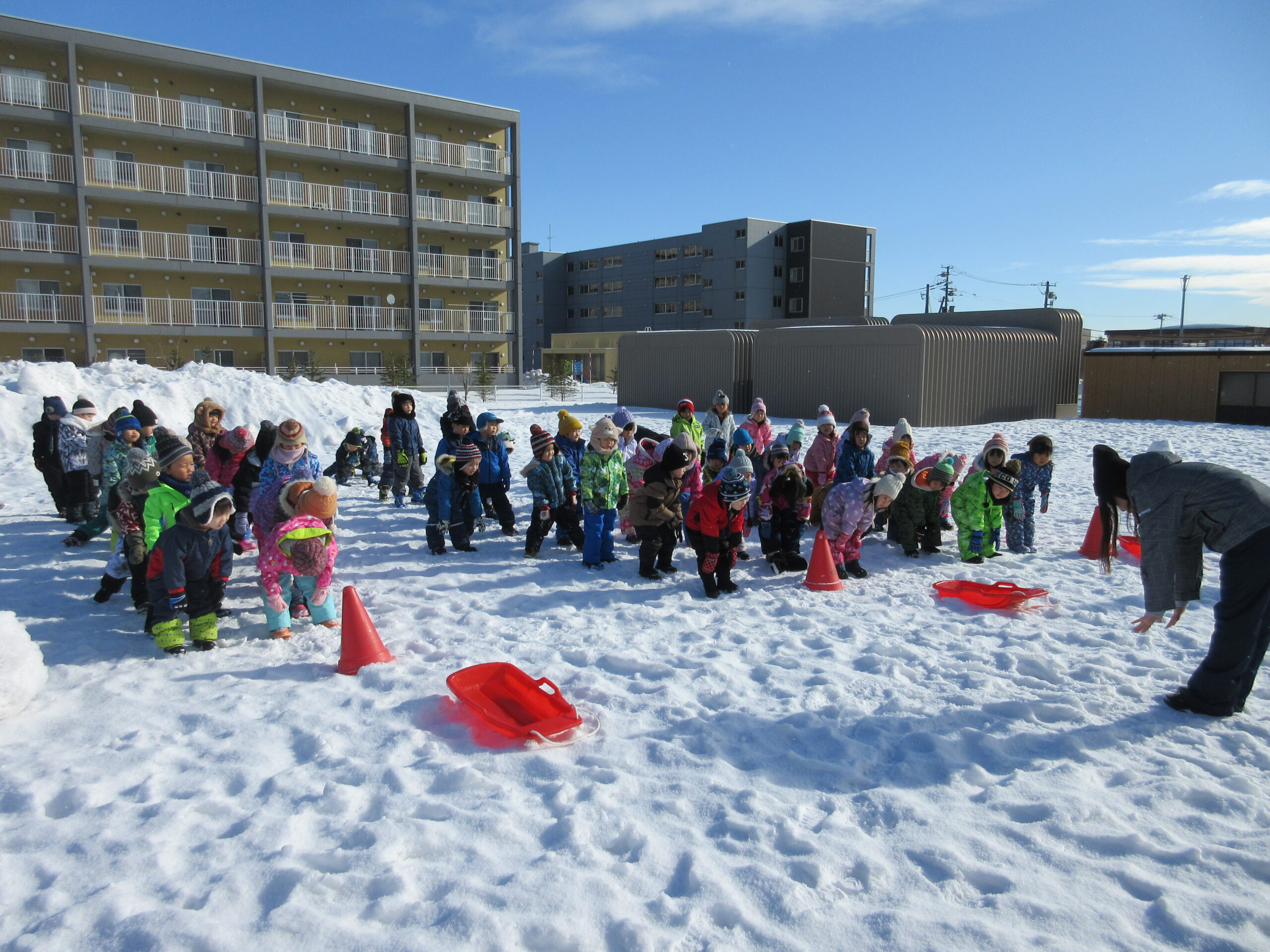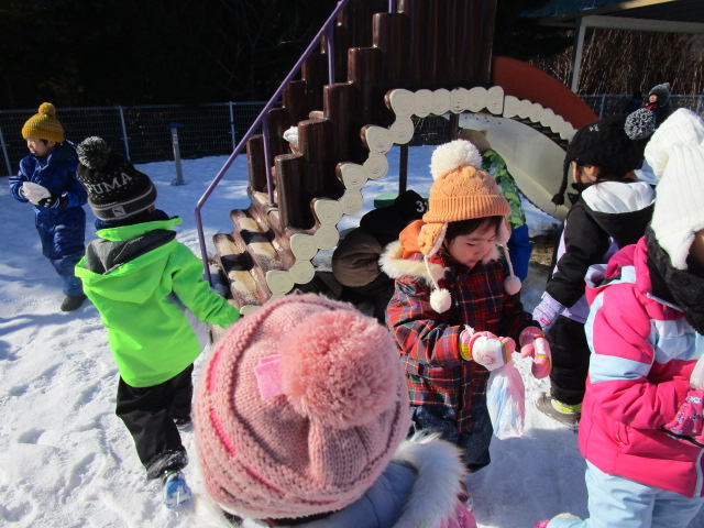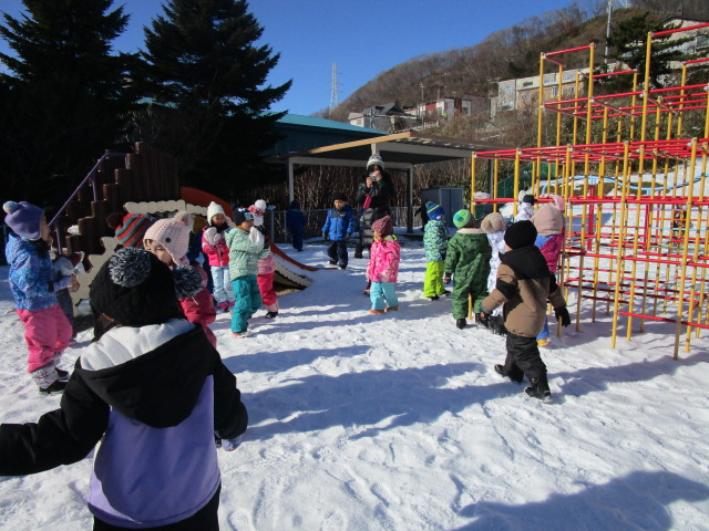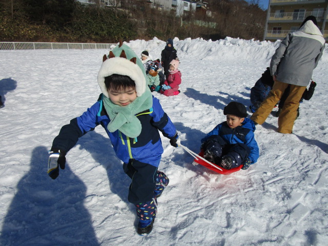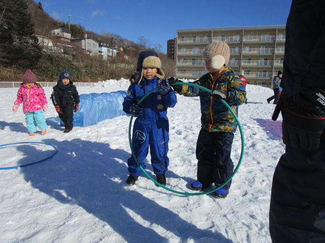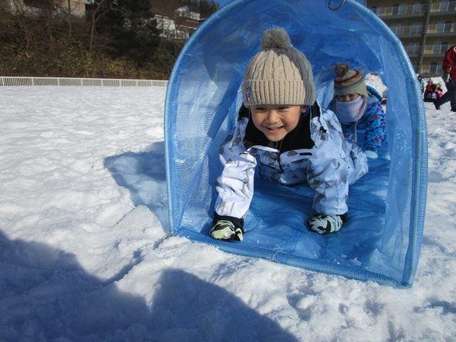 3学期が始まり早々の行事であるウィンタースポーツを園庭にて各学年毎で実施します。今日1月24日(月)は気持ちのよい雪晴れで無風状態の暖かさを感じる中、年中学年のウィンタースポーツを実施しました。年中学年は障害物競争に取り組み、ソリやトンネル、ボールや大小のフープを使いながら各クラスで競争しました。男の子が女の子を乗せてソリを引き、二人でボールを挟めて運ぶ姿が可愛らしく、かにさん歩きで気持ち急いでいる様子も伺えました。最後には宝探しをして楽しいウィンタースポーツを終了しました。