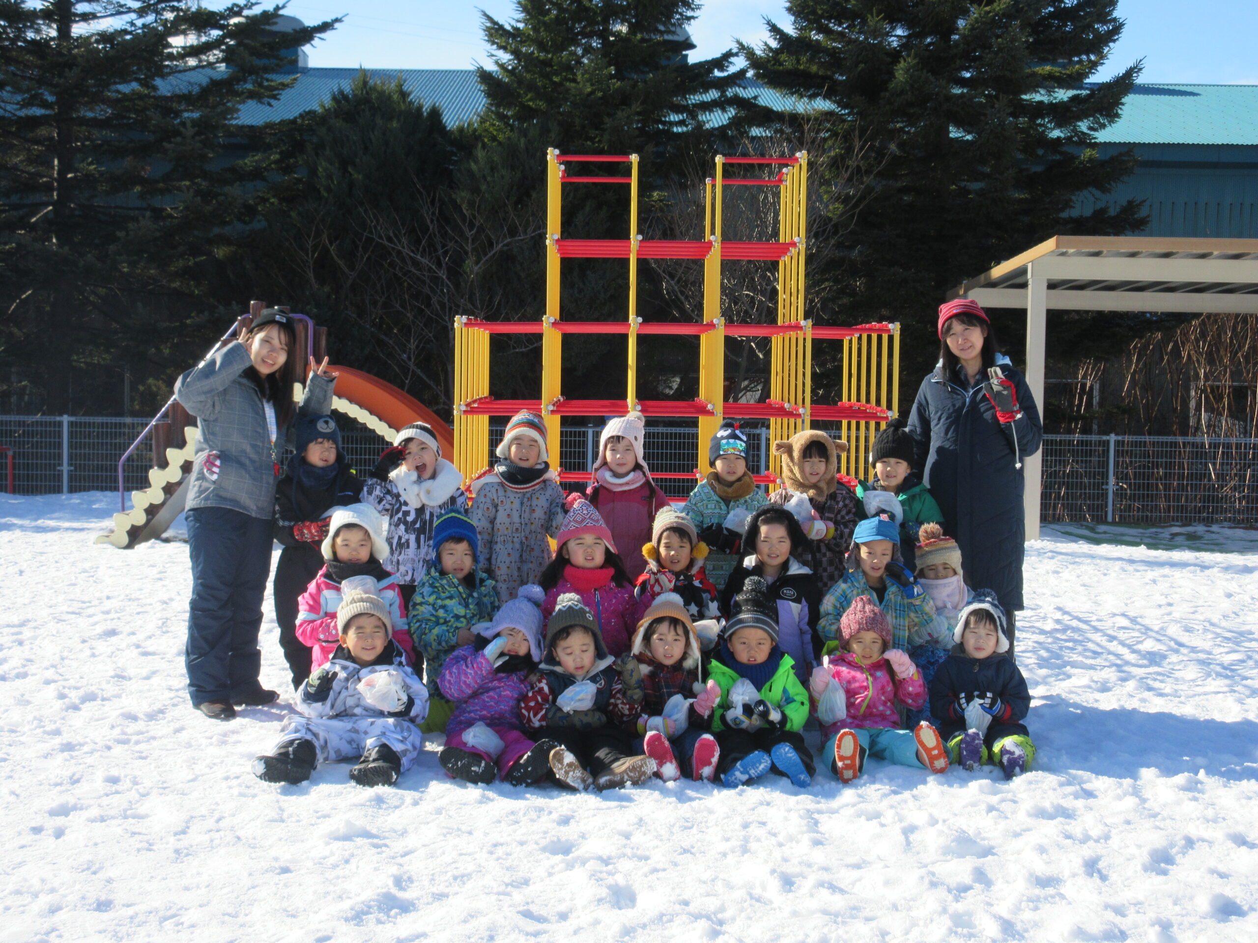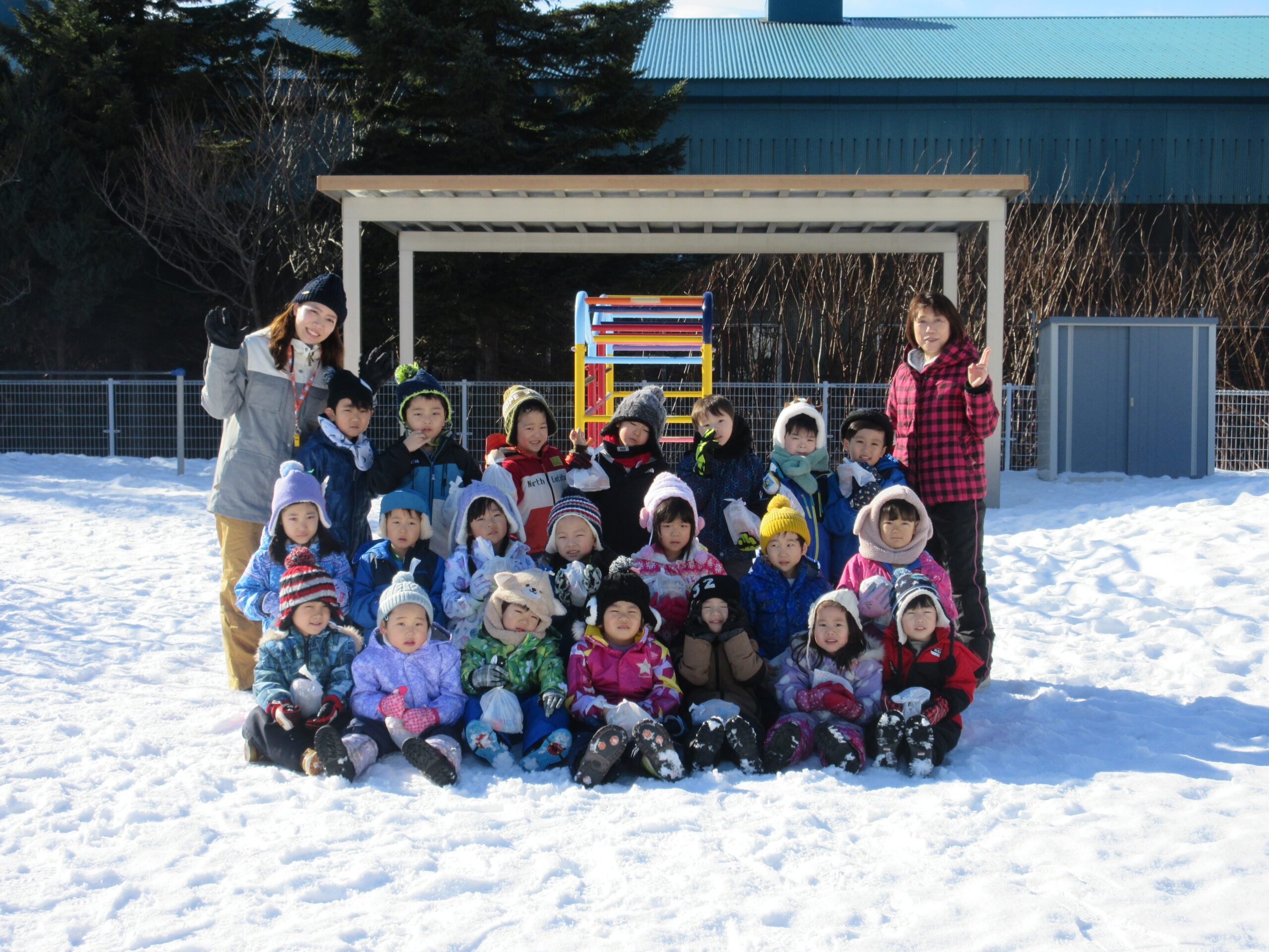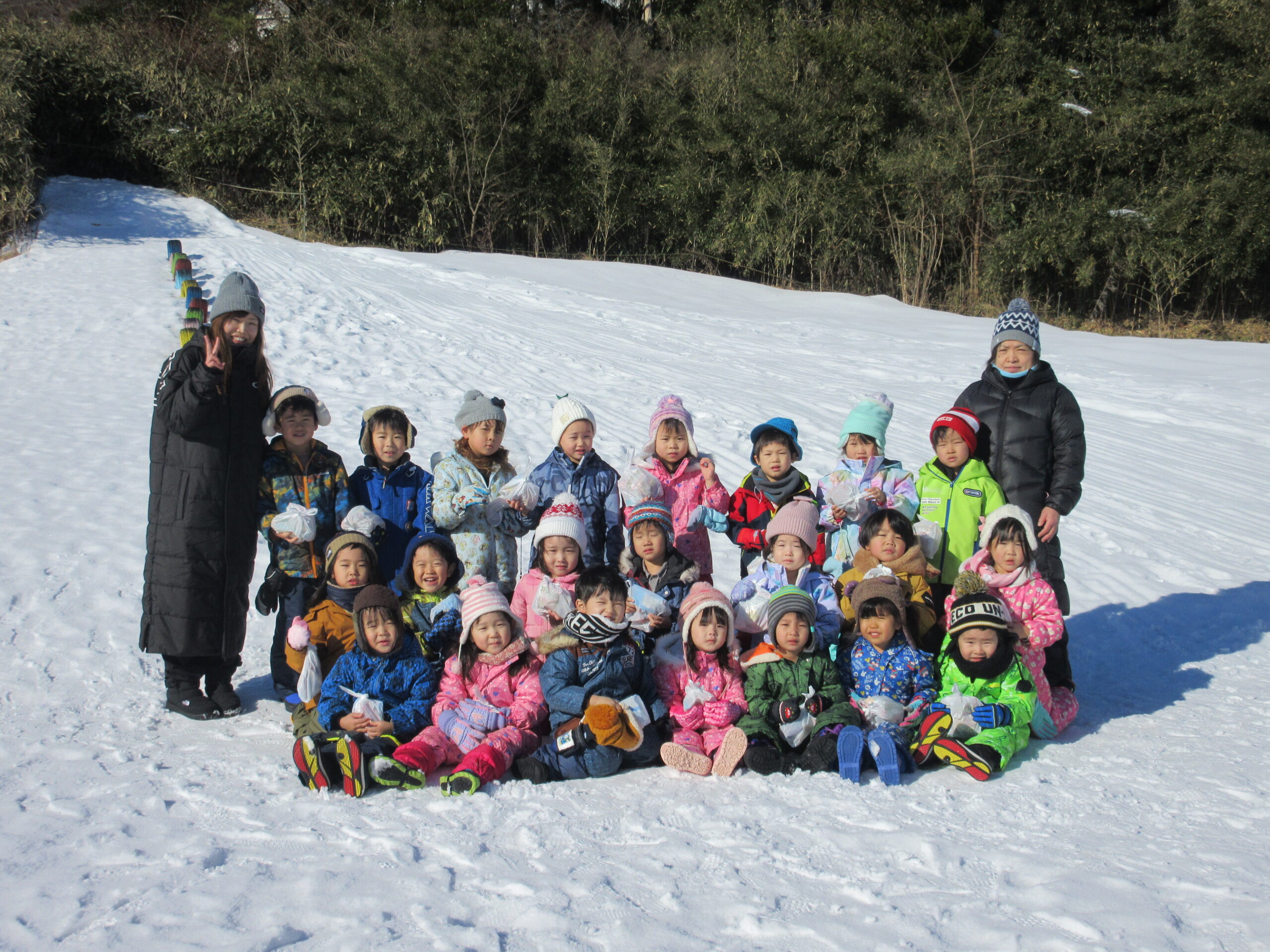 3学期が始まり早々の行事であるウィンタースポーツを園庭にて各学年毎で実施します。今日1月24日(月)は気持ちのよい雪晴れで無風状態の暖かさを感じる中、年中学年のウィンタースポーツを実施しました。年中学年は障害物競争に取り組み、ソリやトンネル、ボールや大小のフープを使いながら各クラスで競争しました。男の子が女の子を乗せてソリを引き、二人でボールを挟めて運ぶ姿が可愛らしく、かにさん歩きで気持ち急いでいる様子も伺えました。最後には宝探しをして楽しいウィンタースポーツを終了しました。