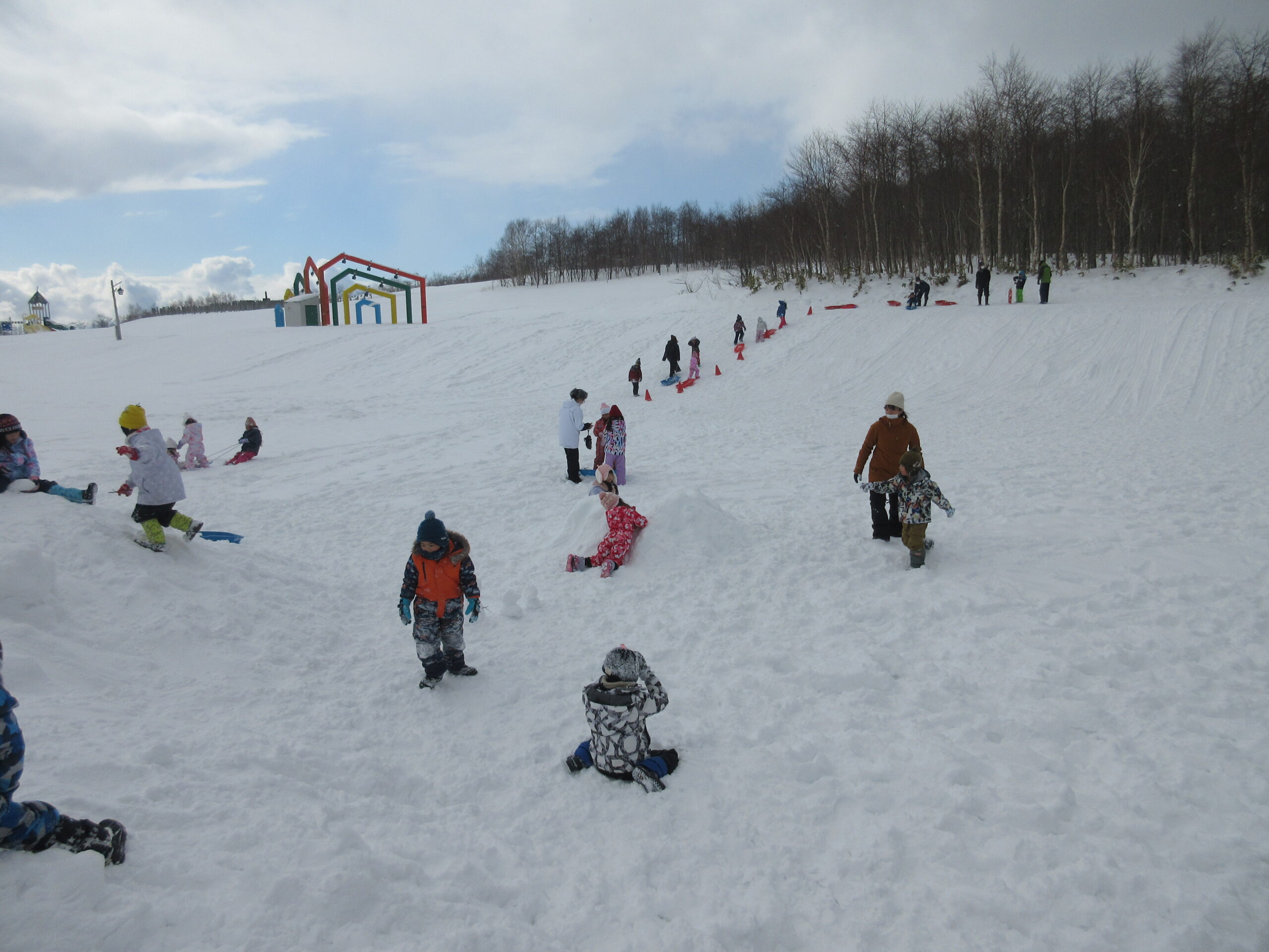 今日2月1日(火)はバスに乗り、だんパラへ雪遊びに行きました。天候も良く、過ごしやすい気温であったため、たっぷり1時間半程、見つけたかまくらの穴に入ったり、雪山に登ったり、尻滑りやそり滑りを楽しむ姿が見られました。また、降りたてのふかふかな雪に寝転び、気持ちよさそうにしている姿も見られていましたので、各クラス着替えをした子が数名おります。自分達で着脱や持ち帰りの準備をしっかりしてくれていましたので、確認をお願いします。今週は気温の低い日が続きますので、様子を見ながら幼稚園でも雪遊びを楽しみたいと思います。