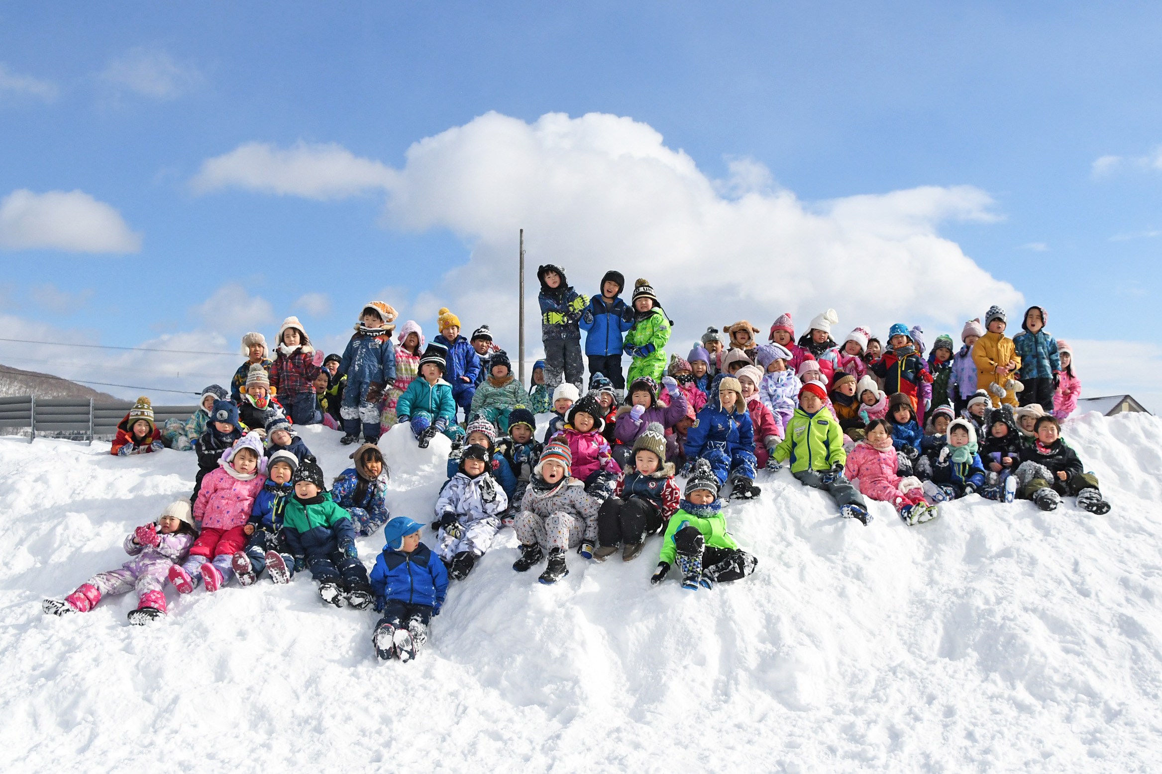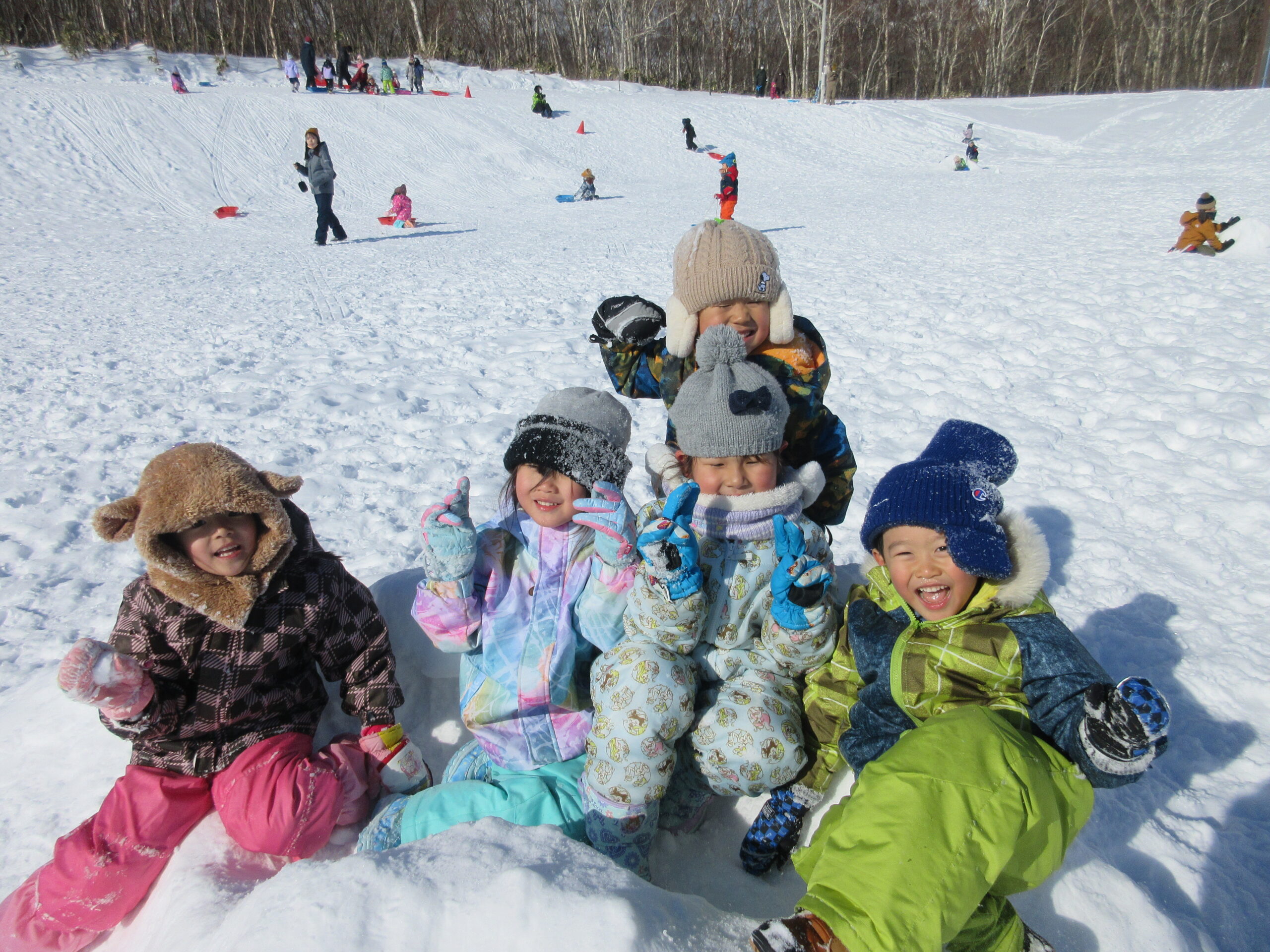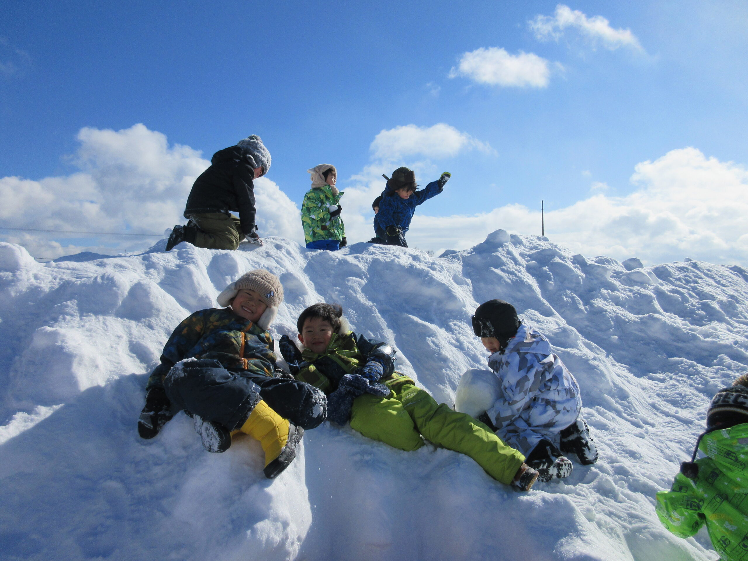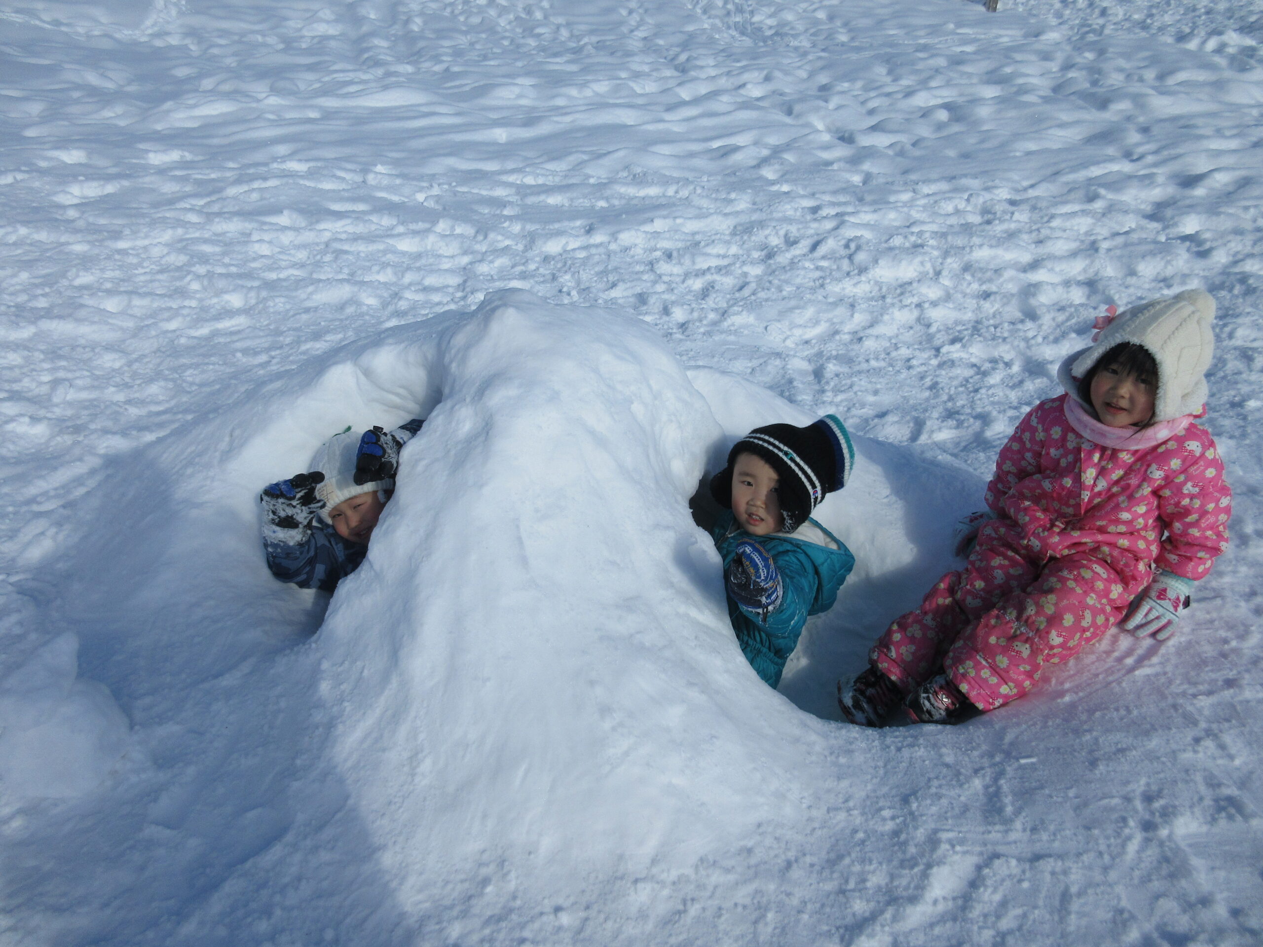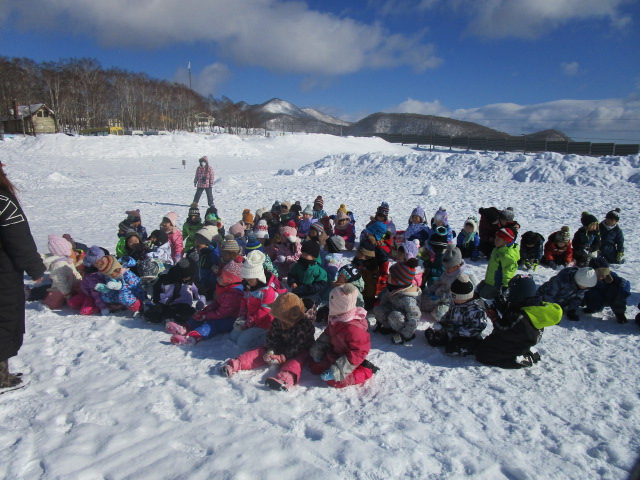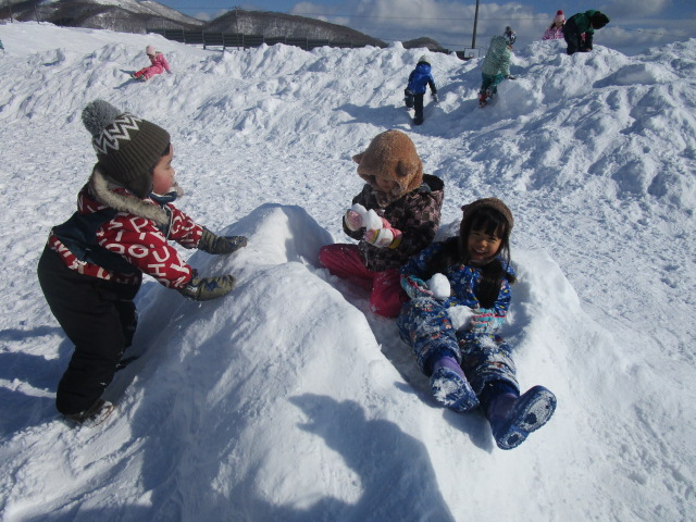 今日2月2日(水)年中学年はバスに乗って、だんパラへ行きました。天気も良く過ごしやすい気温だった為、2時間弱元気いっぱい遊びました。かまくらの中に入ったり、雪山に登ったり、そり滑りをしたり、それぞれが好きな遊びを見つけ楽しんでいました。濡れて着替えた子も居ますので、荷物のご確認をお願い致します。