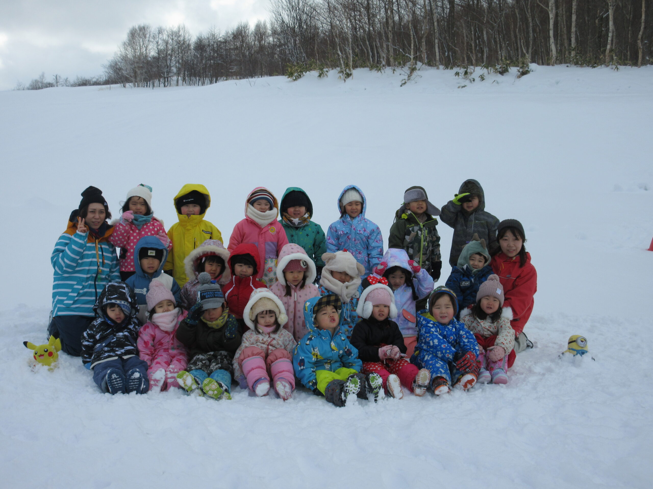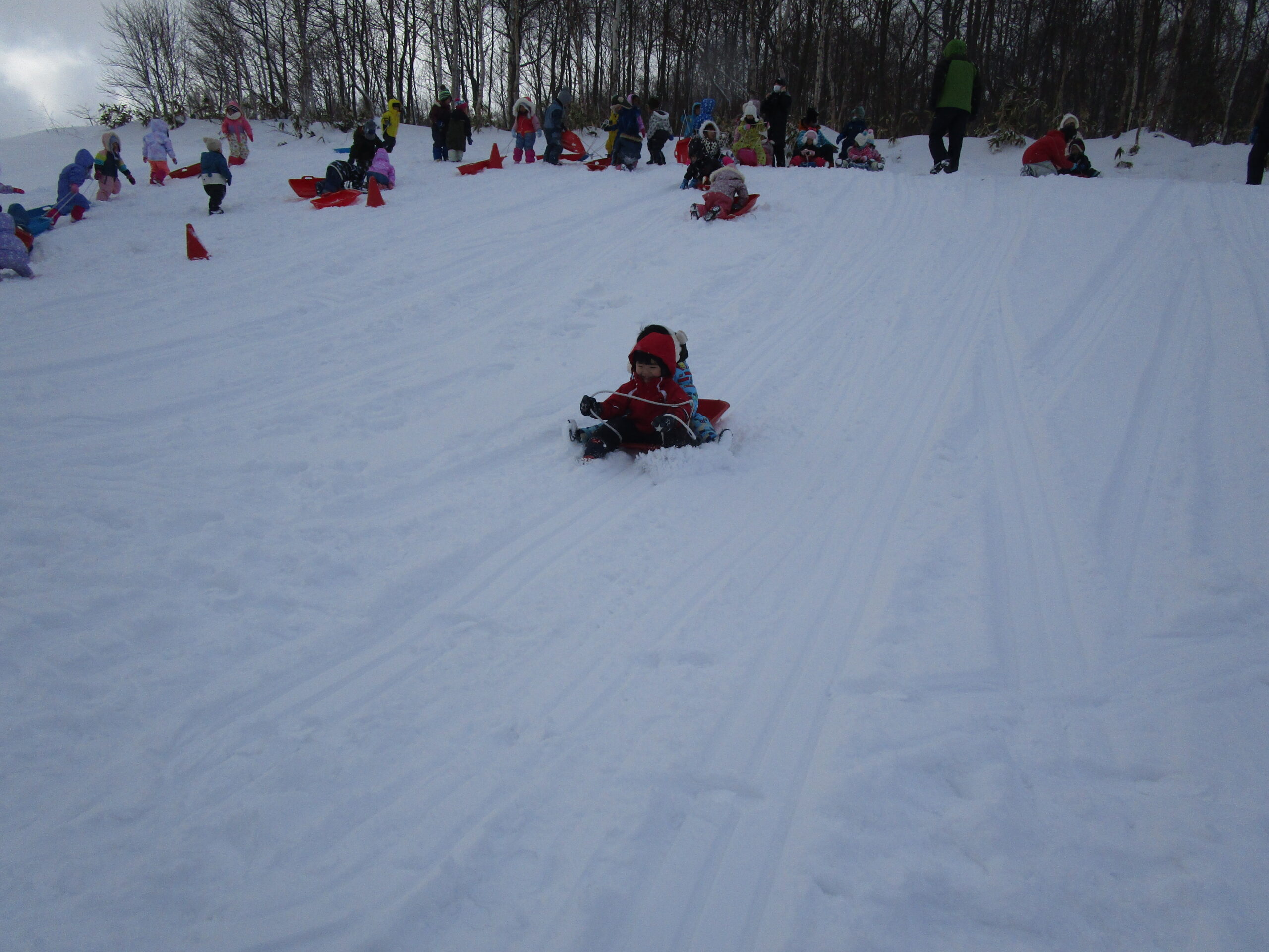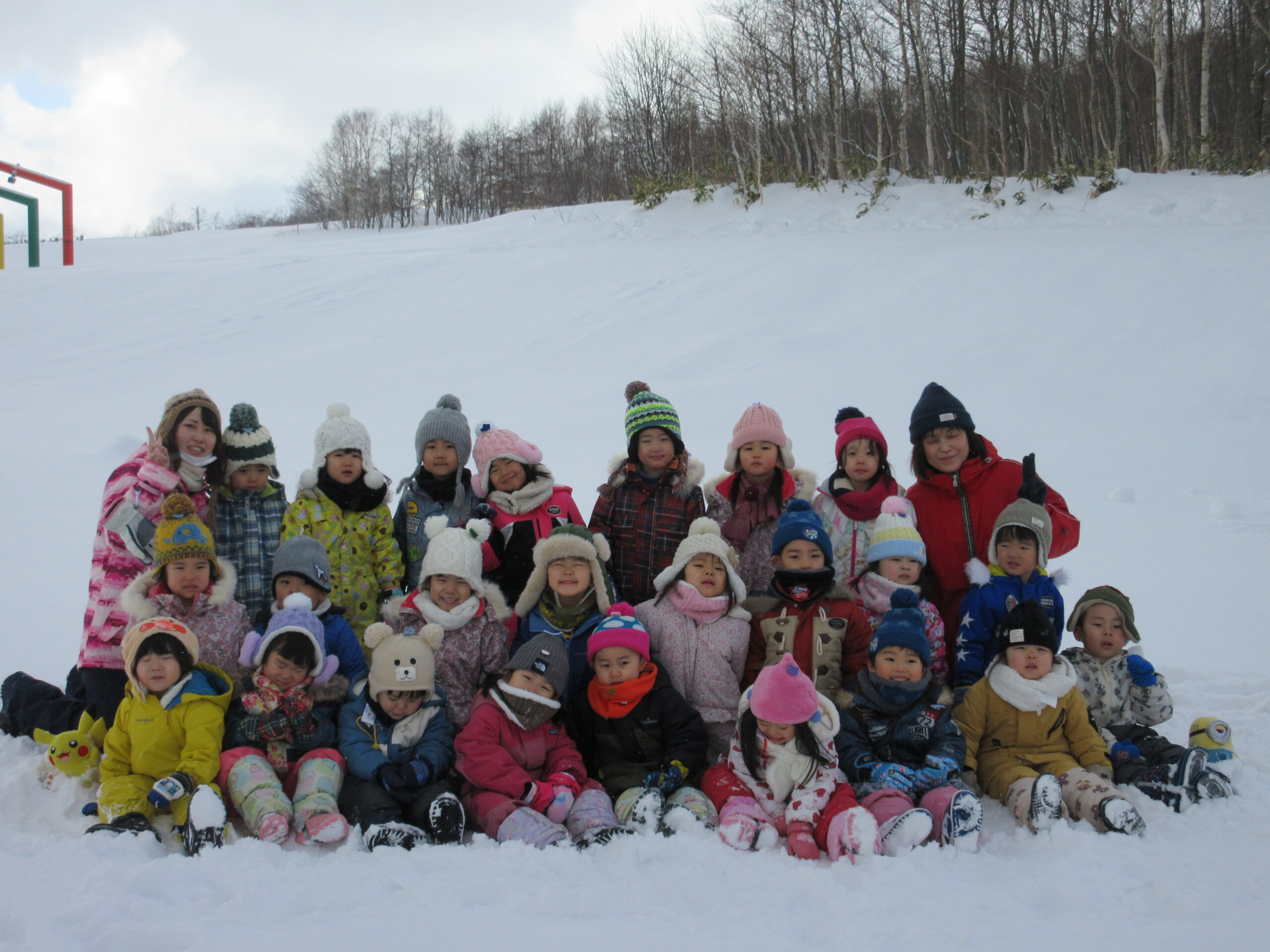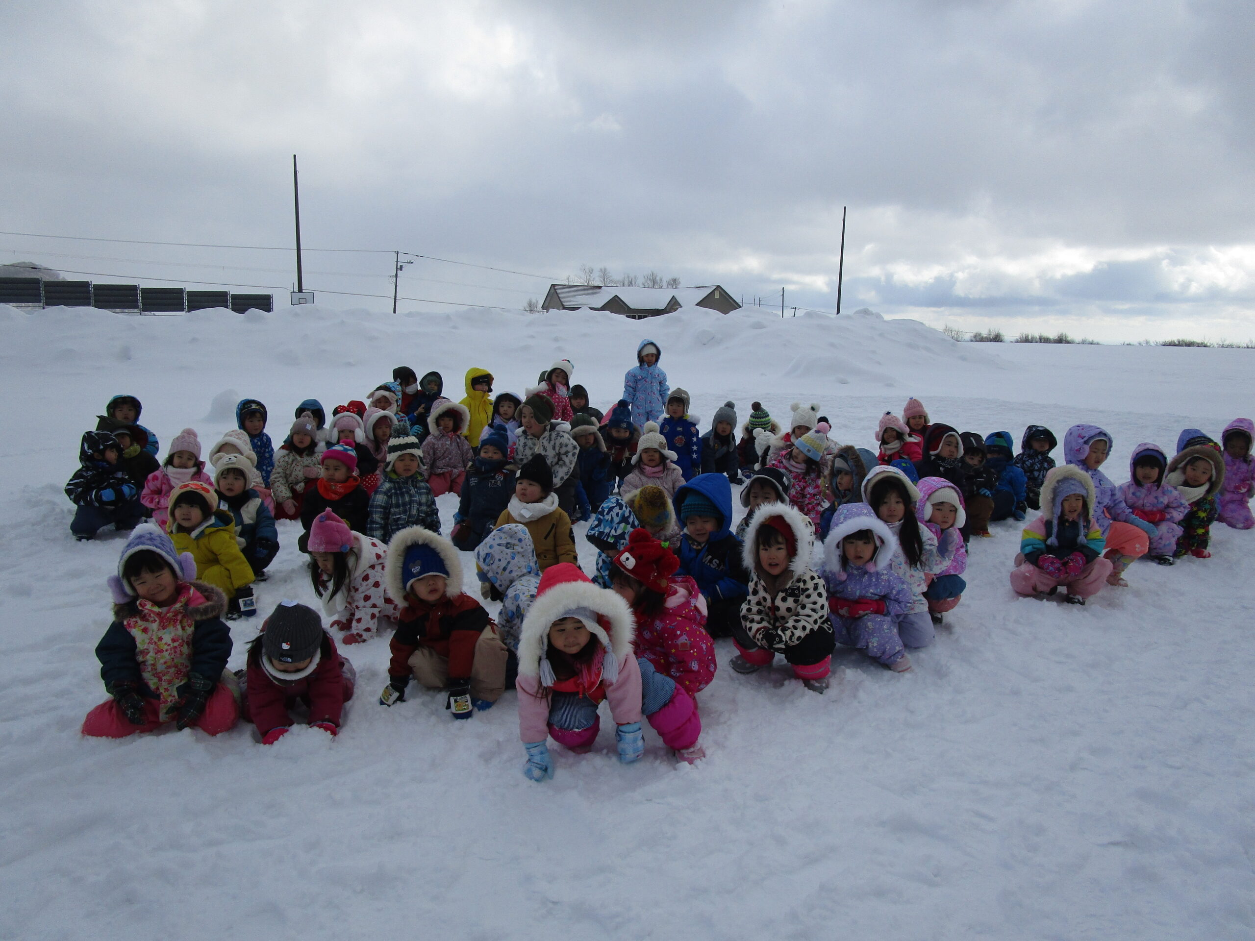 (113)令和3年度「年少組・だんパラ雪遊び」 2022年2月4日 園内ブログ 2月4日(金)年少学年はだんパラへ雪遊びをしに行ってきました。久しぶりのバスもお約束を守って乗ることができました。だんパラでは、短い時間でしたがソリ遊びをする子、雪山に登って遊ぶ子、雪を集めてお山を作る子など様々な遊びをして過ごしました。雪で濡れて着替えた子がいますので、ご確認お願いします。また、昨日の豆まきの後に鬼の絵も描きました。 今日の病気欠席者は、風邪1名、発熱2名、咳3名、鼻水2名、大事をとって2名です。