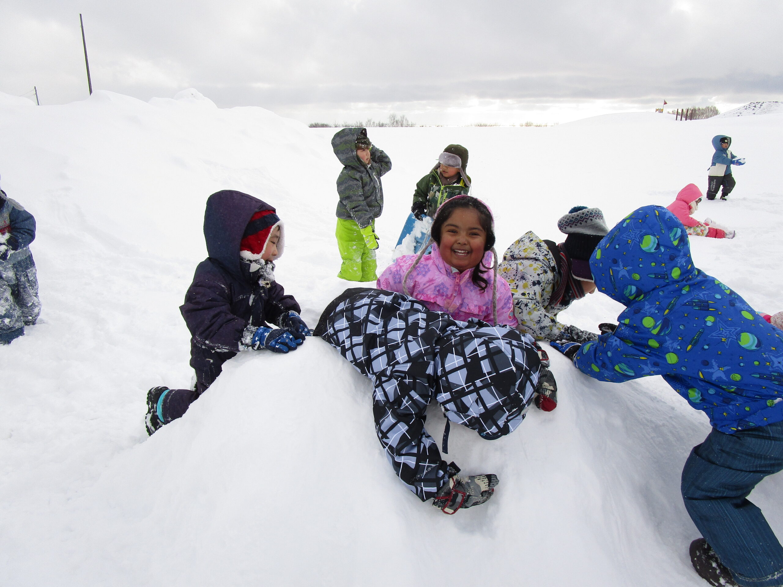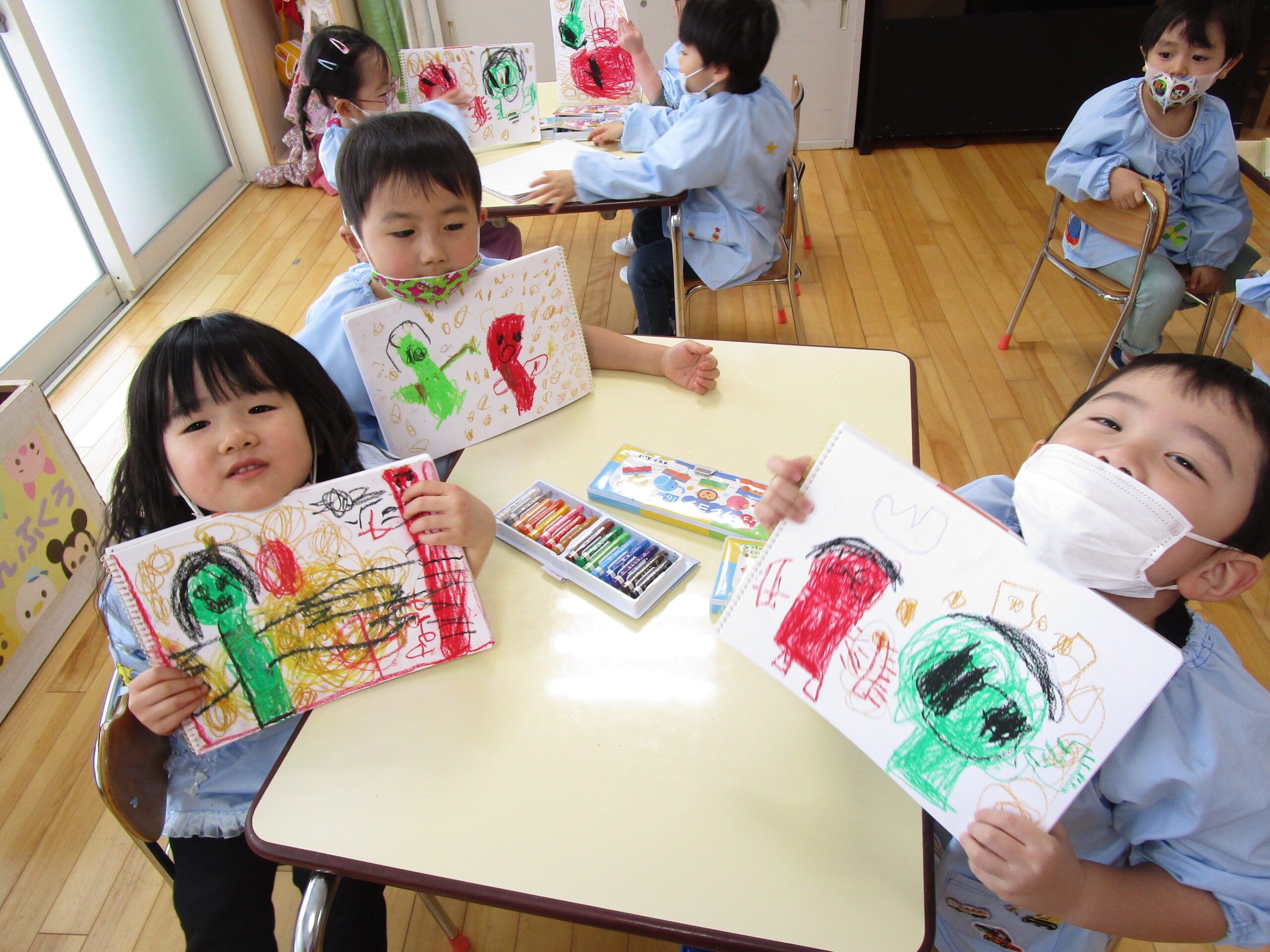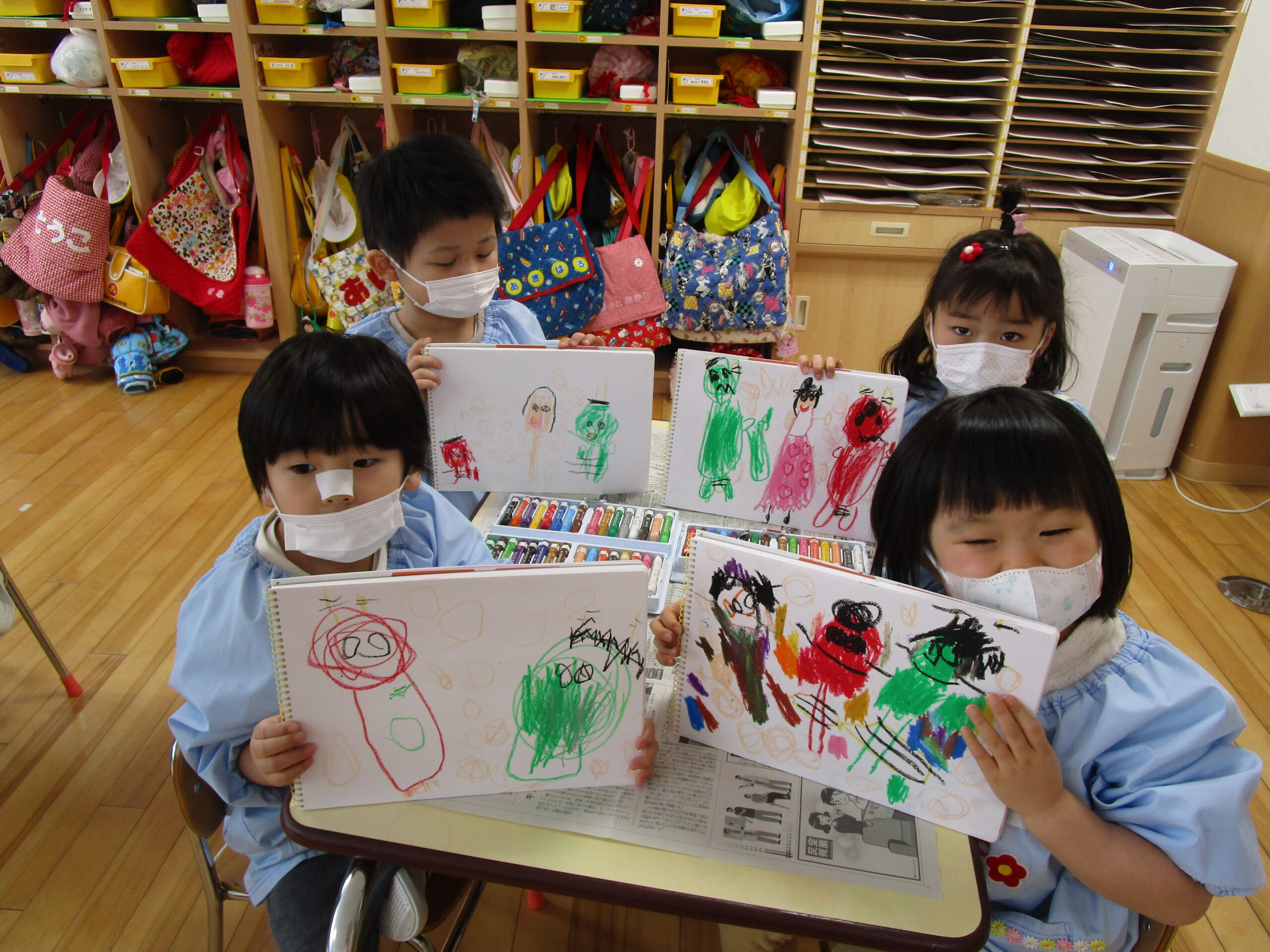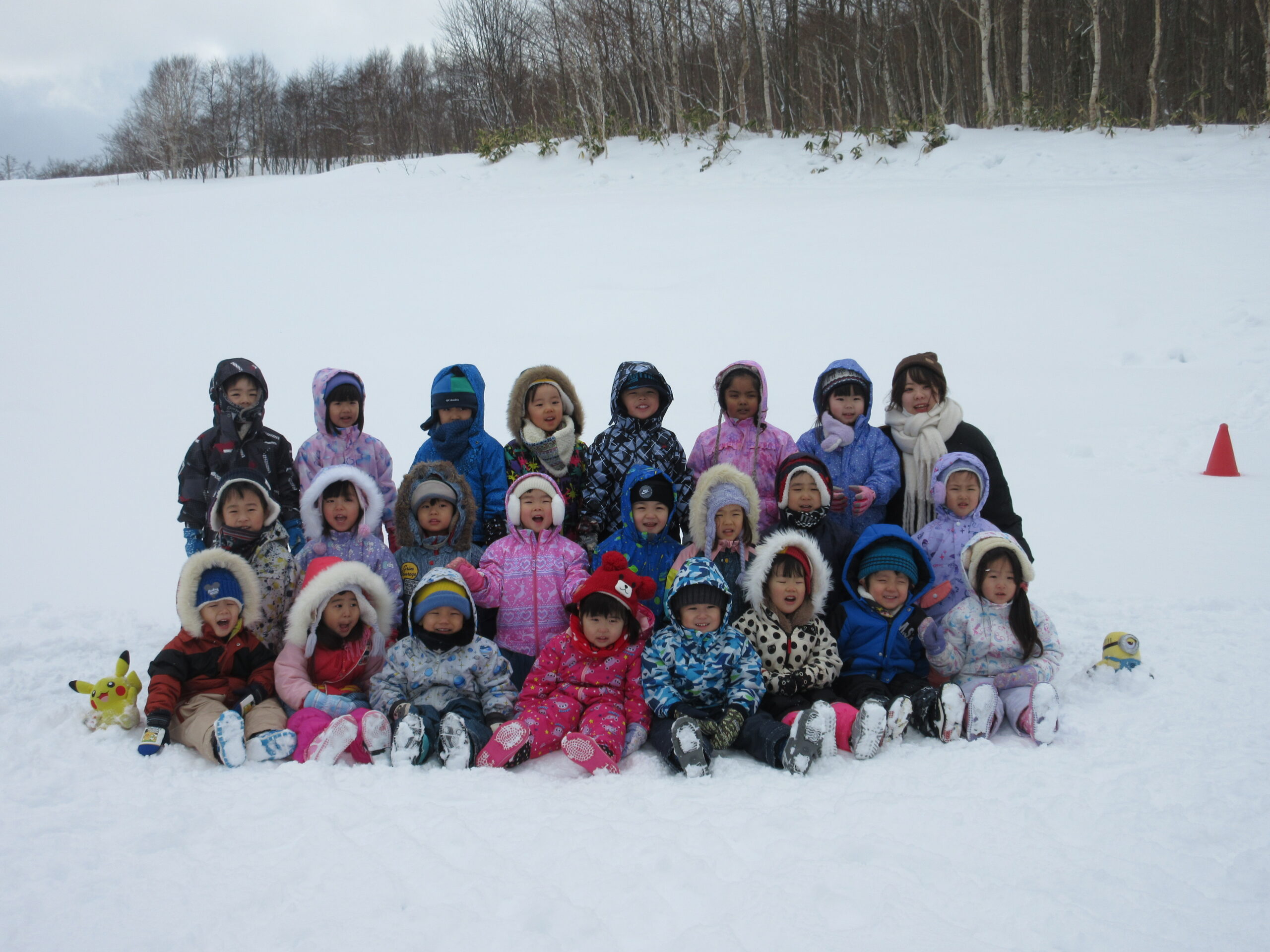 (113)令和3年度「年少組・だんパラ雪遊び」 2022年2月4日 園内ブログ 2月4日(金)年少学年はだんパラへ雪遊びをしに行ってきました。久しぶりのバスもお約束を守って乗ることができました。だんパラでは、短い時間でしたがソリ遊びをする子、雪山に登って遊ぶ子、雪を集めてお山を作る子など様々な遊びをして過ごしました。雪で濡れて着替えた子がいますので、ご確認お願いします。また、昨日の豆まきの後に鬼の絵も描きました。 今日の病気欠席者は、風邪1名、発熱2名、咳3名、鼻水2名、大事をとって2名です。