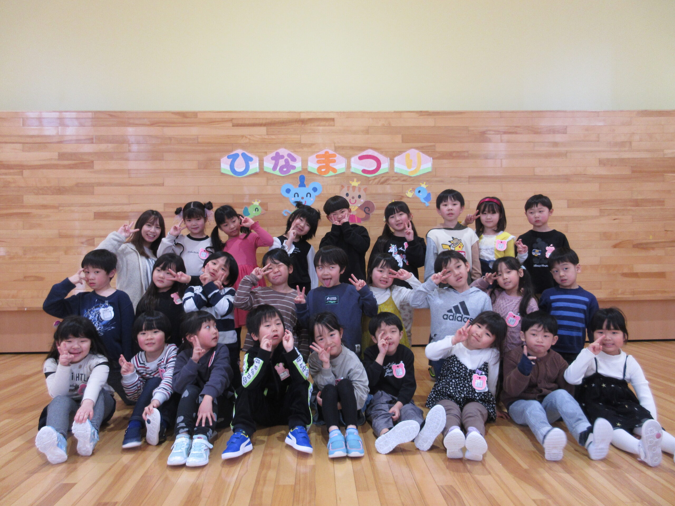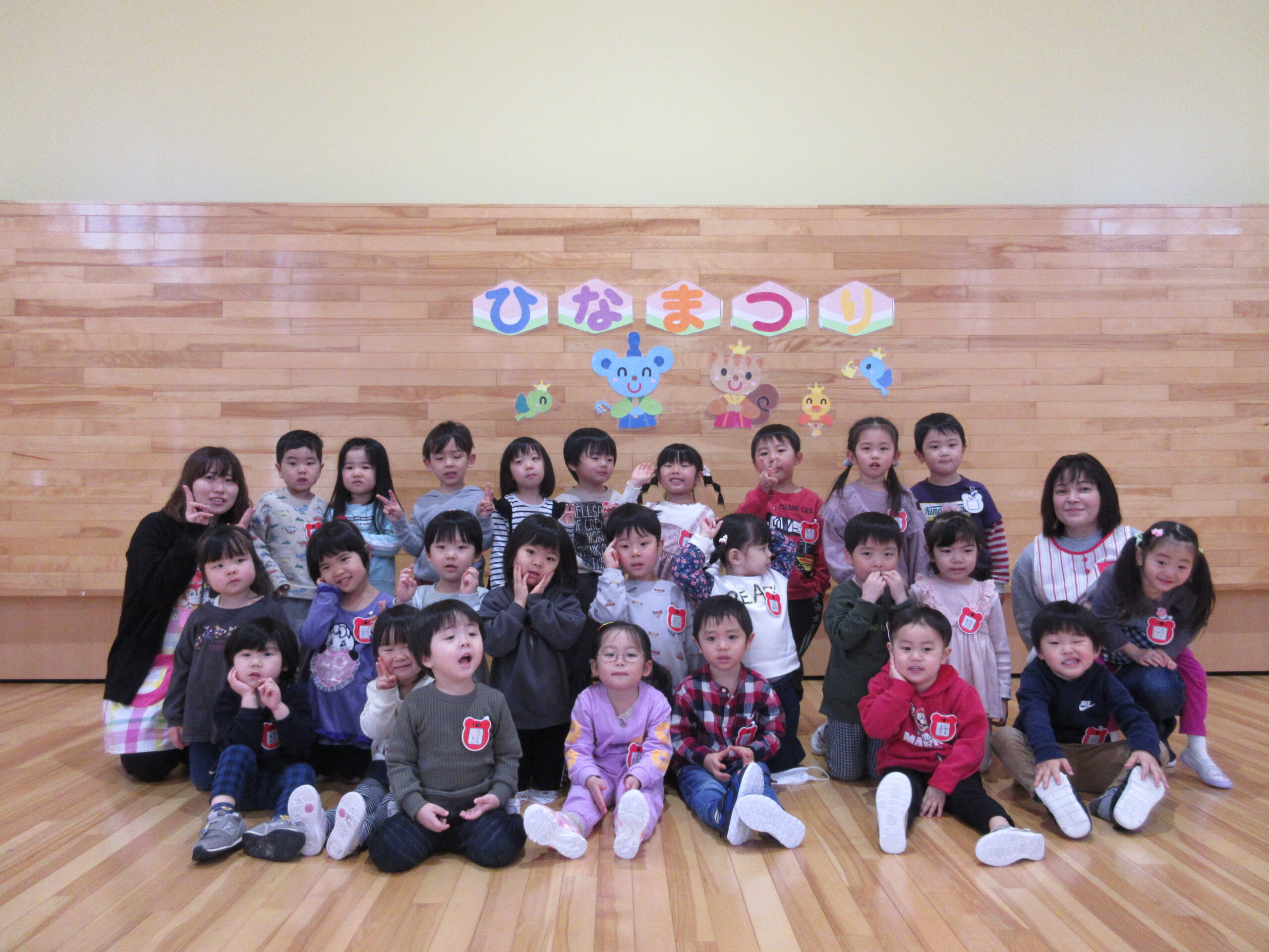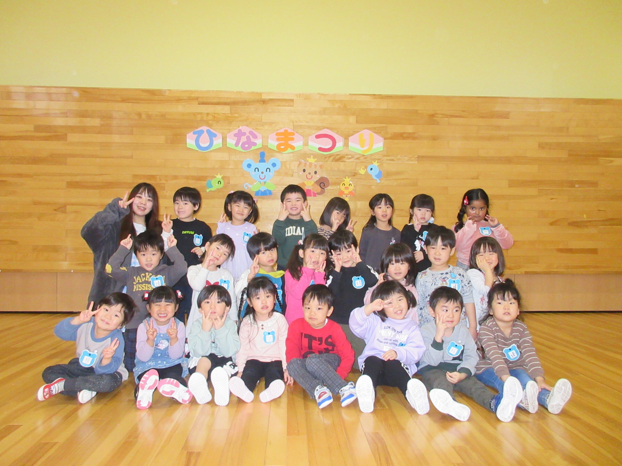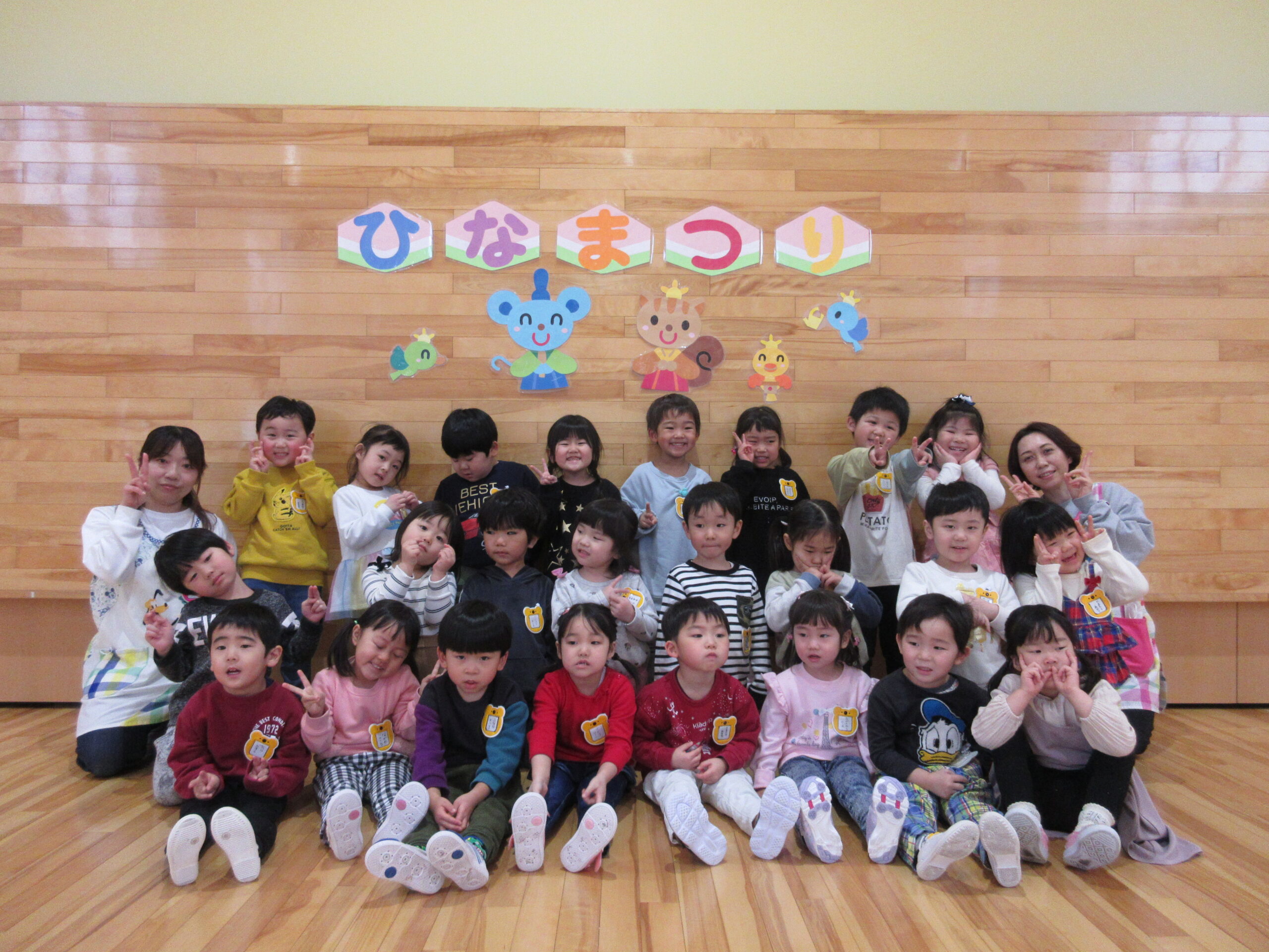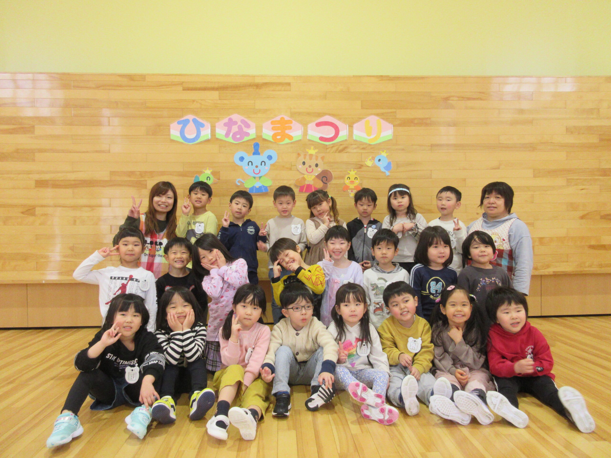 毎年恒例の「ひな祭りお楽しみ会」を3月3日(木)3部に分けて学年毎で実施しました。学年毎でお雛様の由来を先生から聞き、お雛様の歌で3人官女や5人囃子の人数集めゲームをしました。その後、グループでホールをスタートし目的のお部屋に行き、ひな祭りに飾る「菱餅」を探し、グループで見つけ出し、ひし餅を作り上げ、出来上がったら先生からケーキ券を貰えると云うゲームもしました。グループになったお友達は協力して完成させ「ケーキ券」を頂き満面の笑みでした。皆さん上手に作り上げることが出来ていましたね。