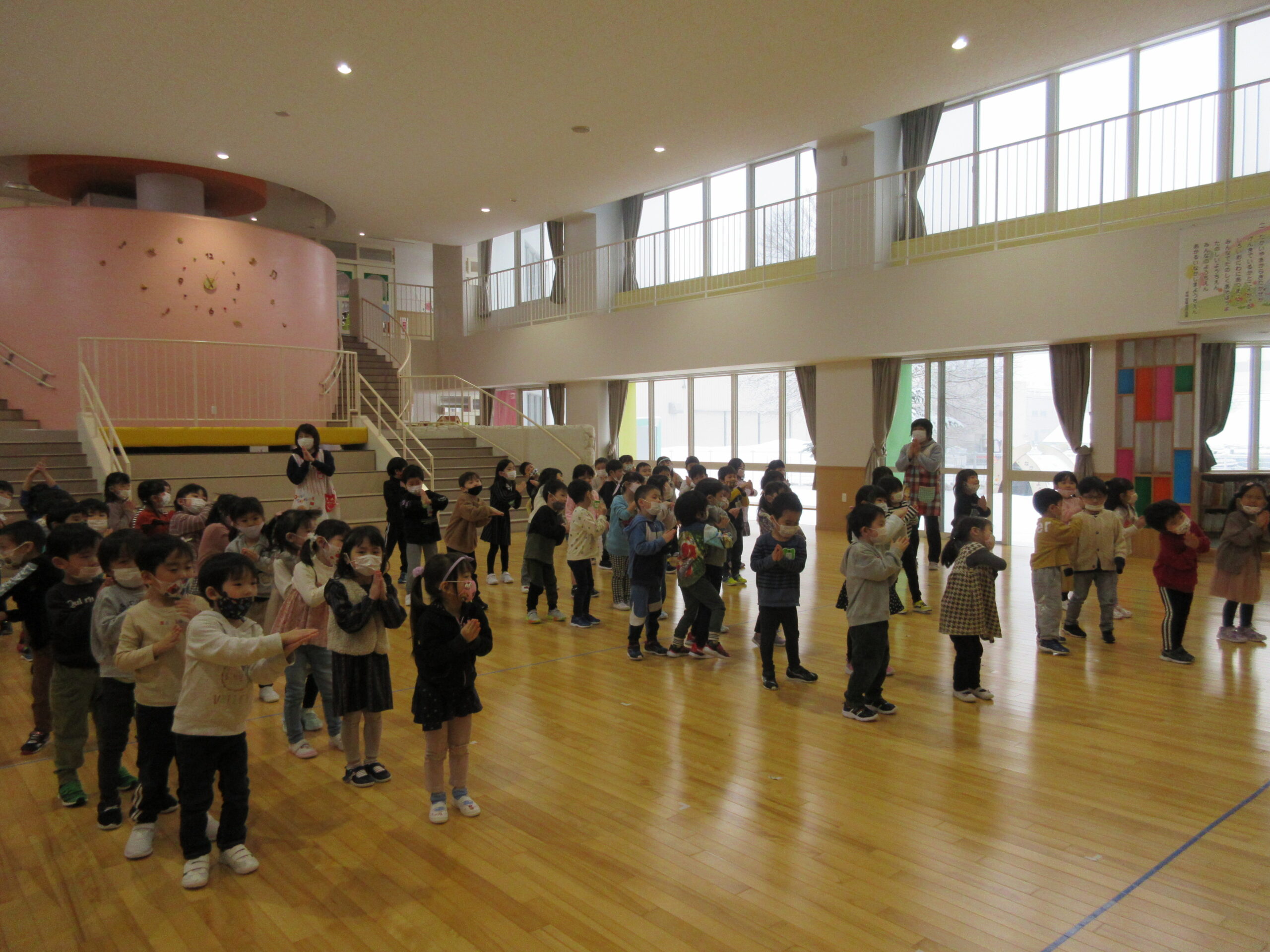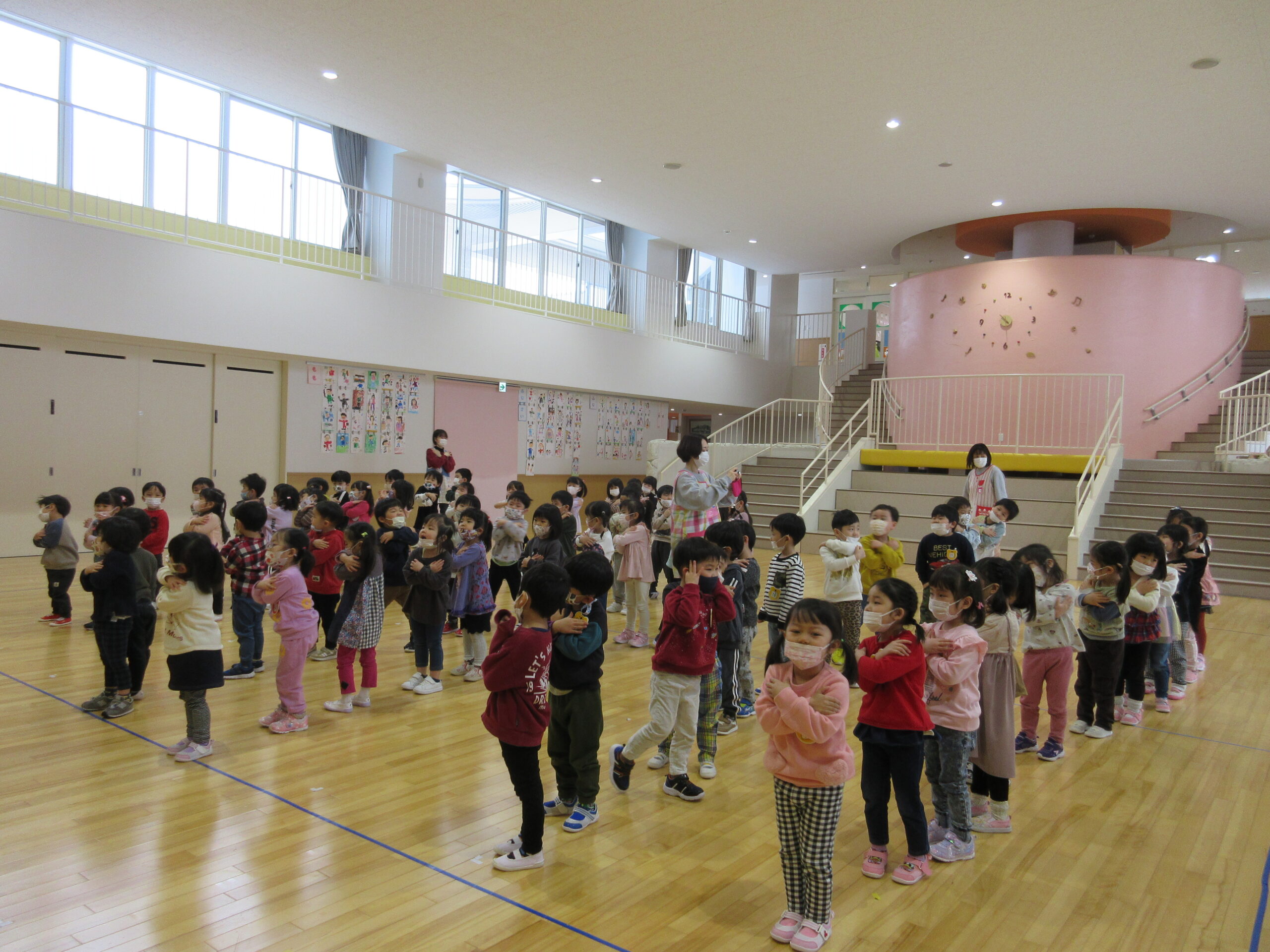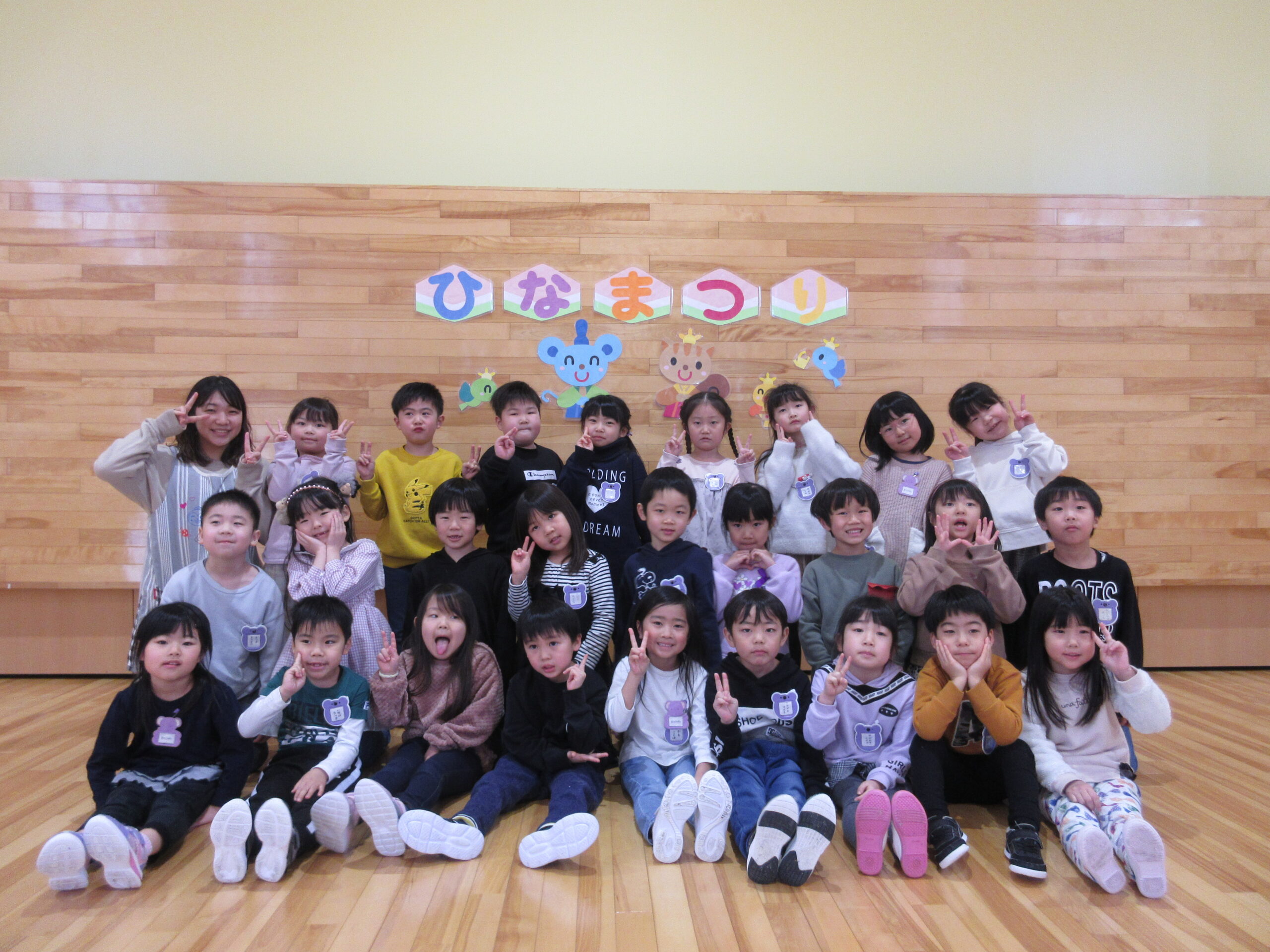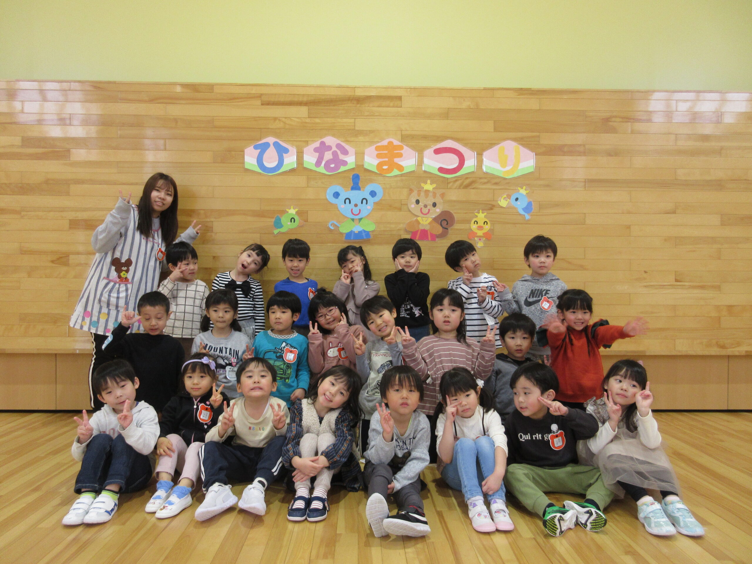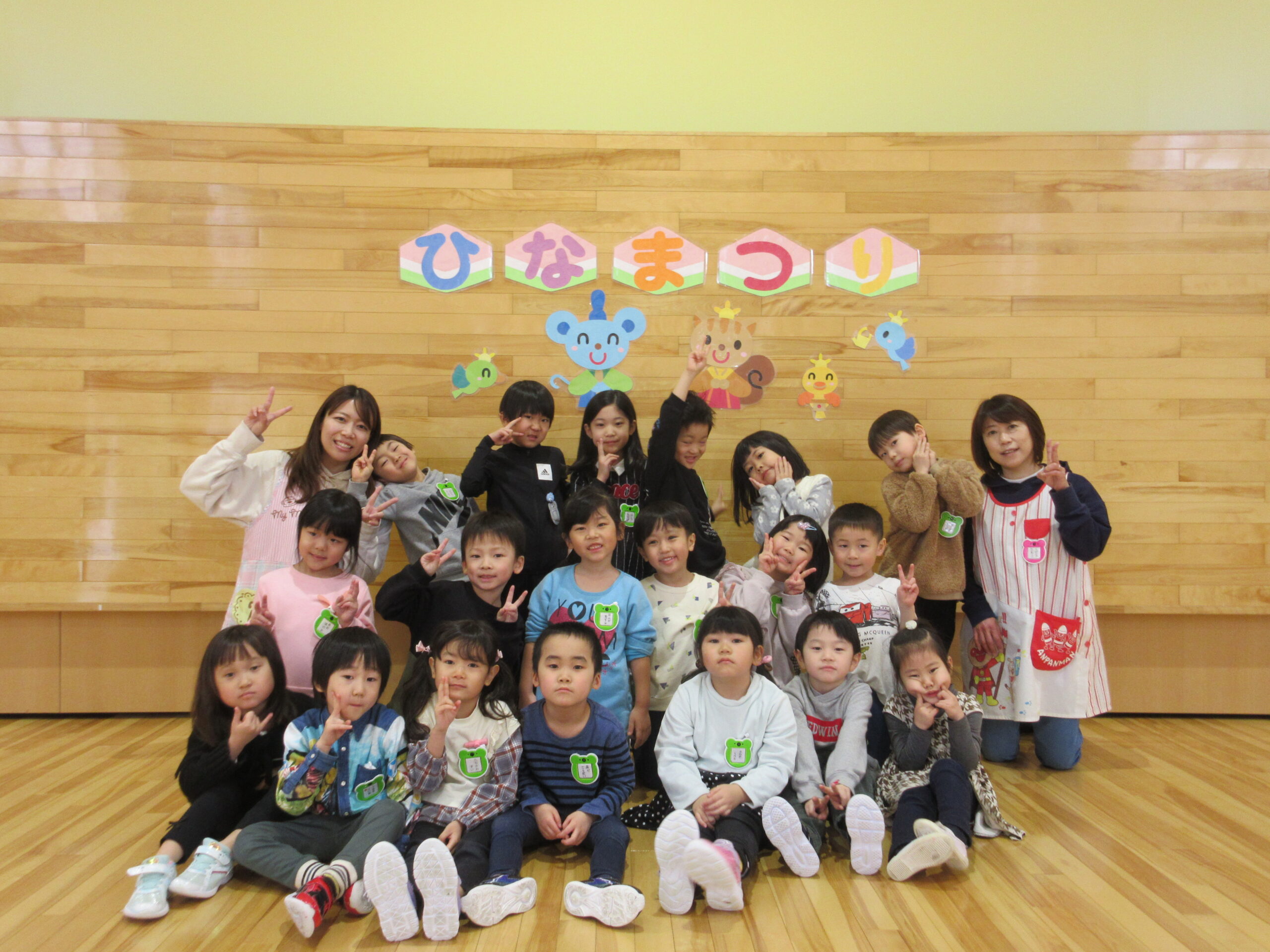 毎年恒例の「ひな祭りお楽しみ会」を3月3日(木)3部に分けて学年毎で実施しました。学年毎でお雛様の由来を先生から聞き、お雛様の歌で3人官女や5人囃子の人数集めゲームをしました。その後、グループでホールをスタートし目的のお部屋に行き、ひな祭りに飾る「菱餅」を探し、グループで見つけ出し、ひし餅を作り上げ、出来上がったら先生からケーキ券を貰えると云うゲームもしました。グループになったお友達は協力して完成させ「ケーキ券」を頂き満面の笑みでした。皆さん上手に作り上げることが出来ていましたね。