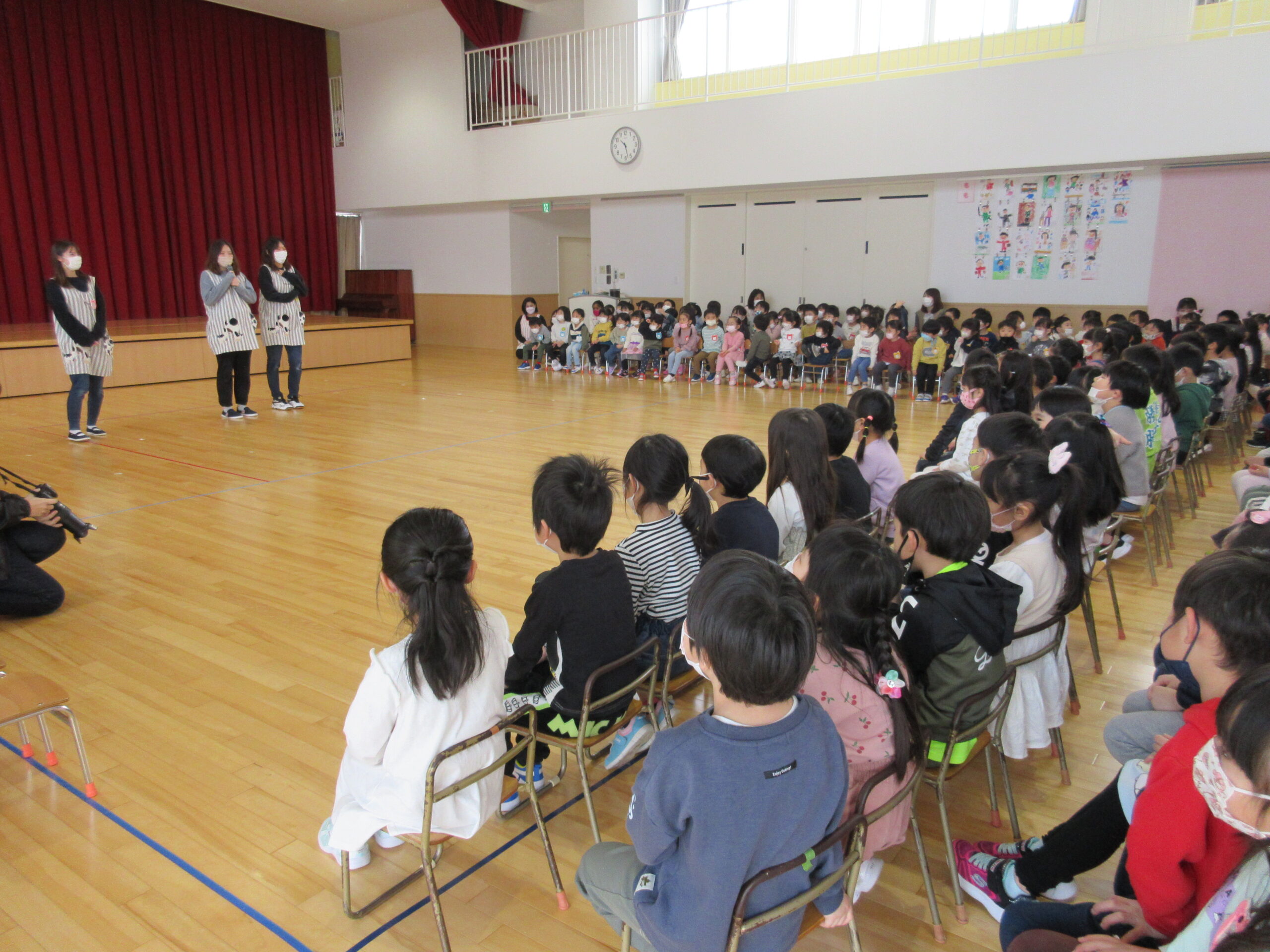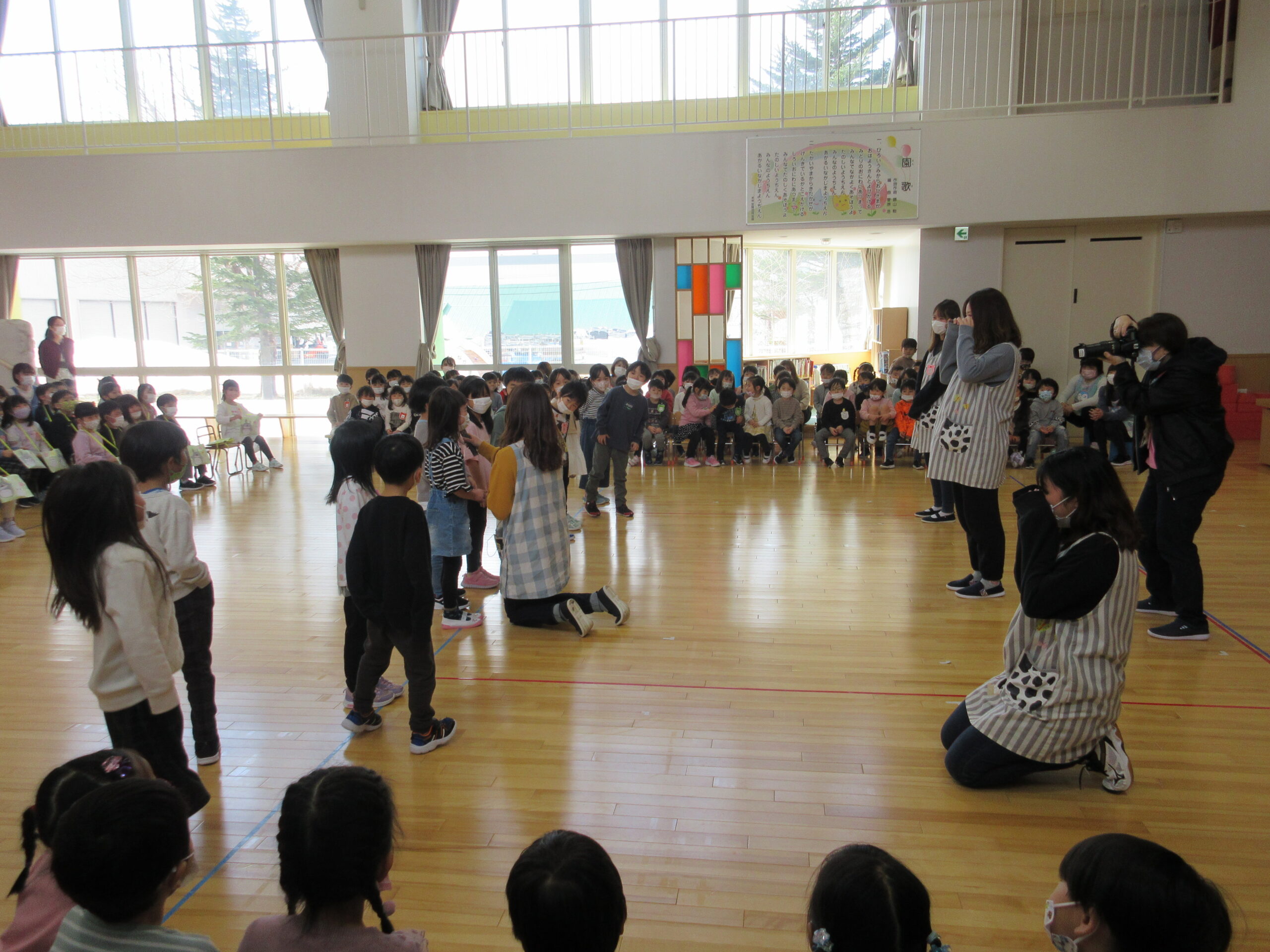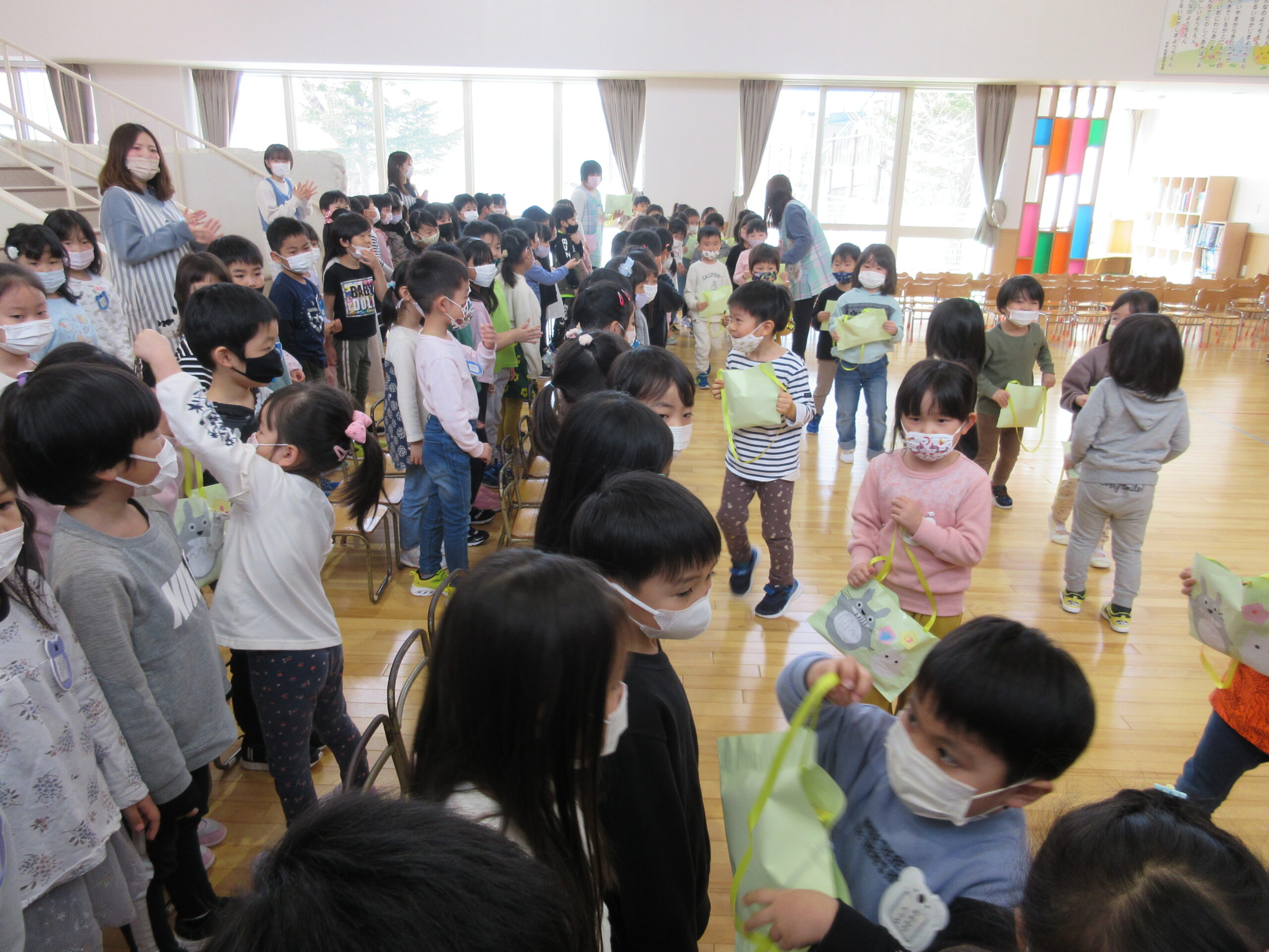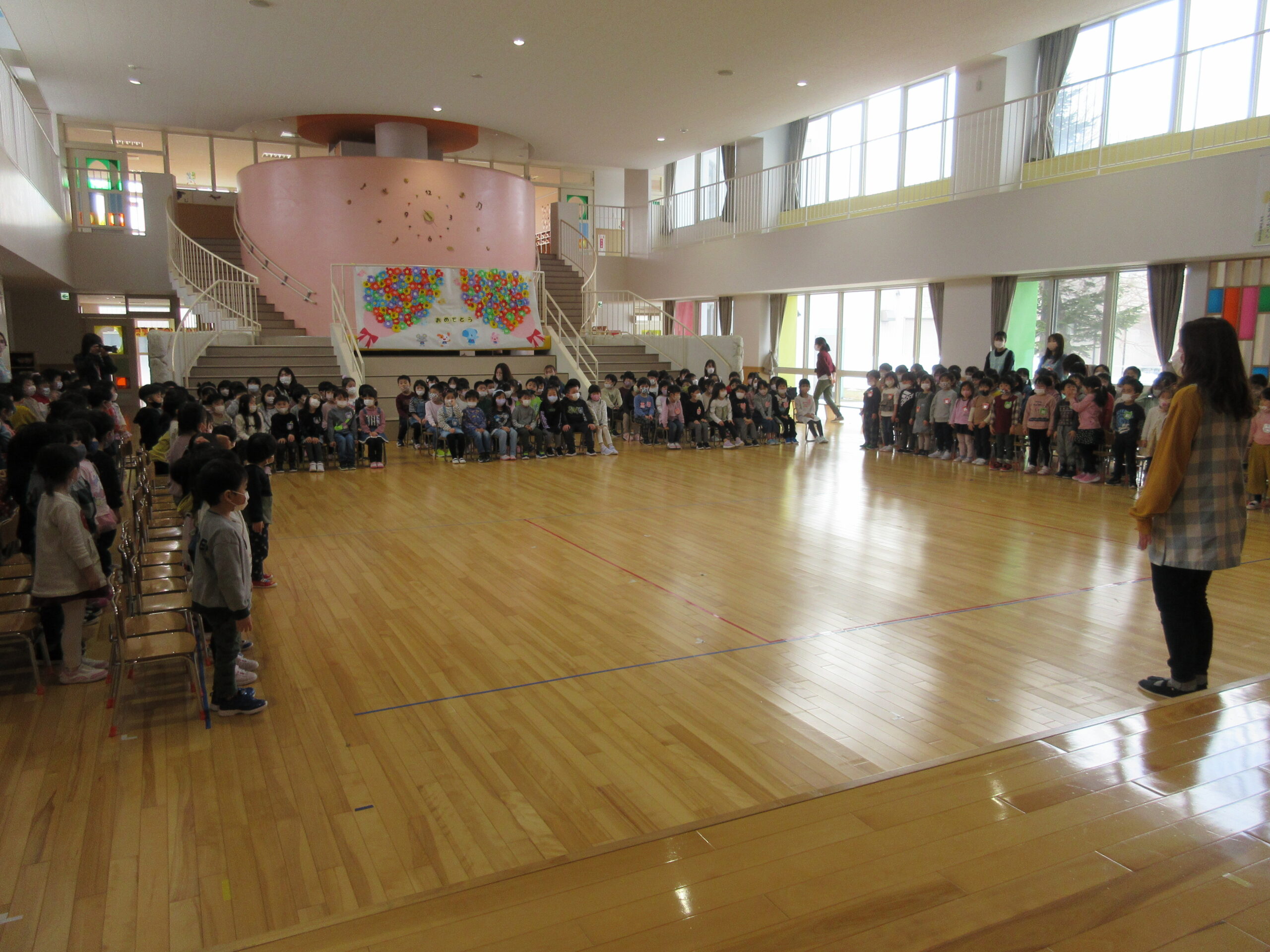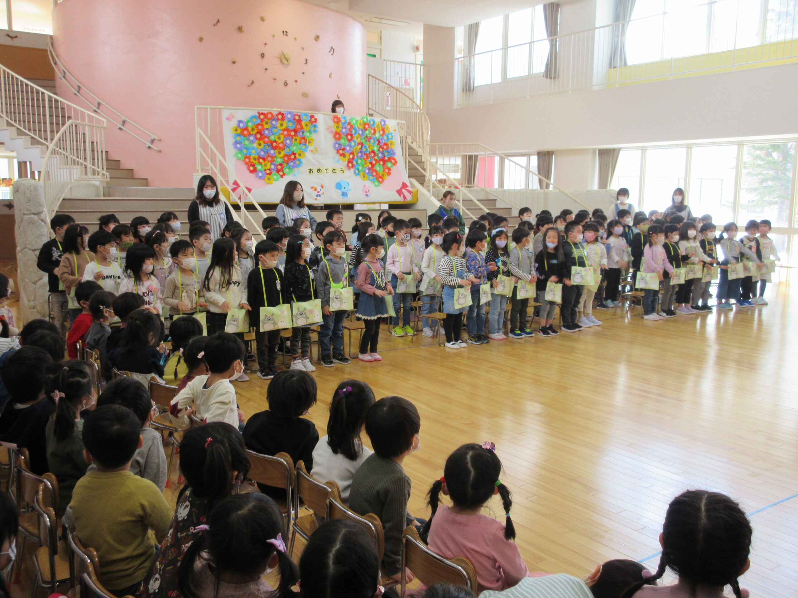 卒園式までカウントダウンが始まっていますが、送り出す側として複雑な心境ですね。小学一年生になるお祝いの気持ちもありますが卒園してしまう寂しい気持ちも強く…そう思いながら今日3月8日(火)はホールにてお別れ会を行いました。年少、年中からの手話での挨拶からスタートし、手作りプレゼントを年長のお兄さん、お姉さん一人一人に感謝の気持ちを込めて渡しました。年長さんに喜んでもらえて嬉しそうな年少、年中さんでした。また、担任の先生にも年長代表から挨拶があり目頭が熱くなる一面もありました。最後には年長さんからのお礼の手話挨拶があり「お別れ会」が終了となりました。