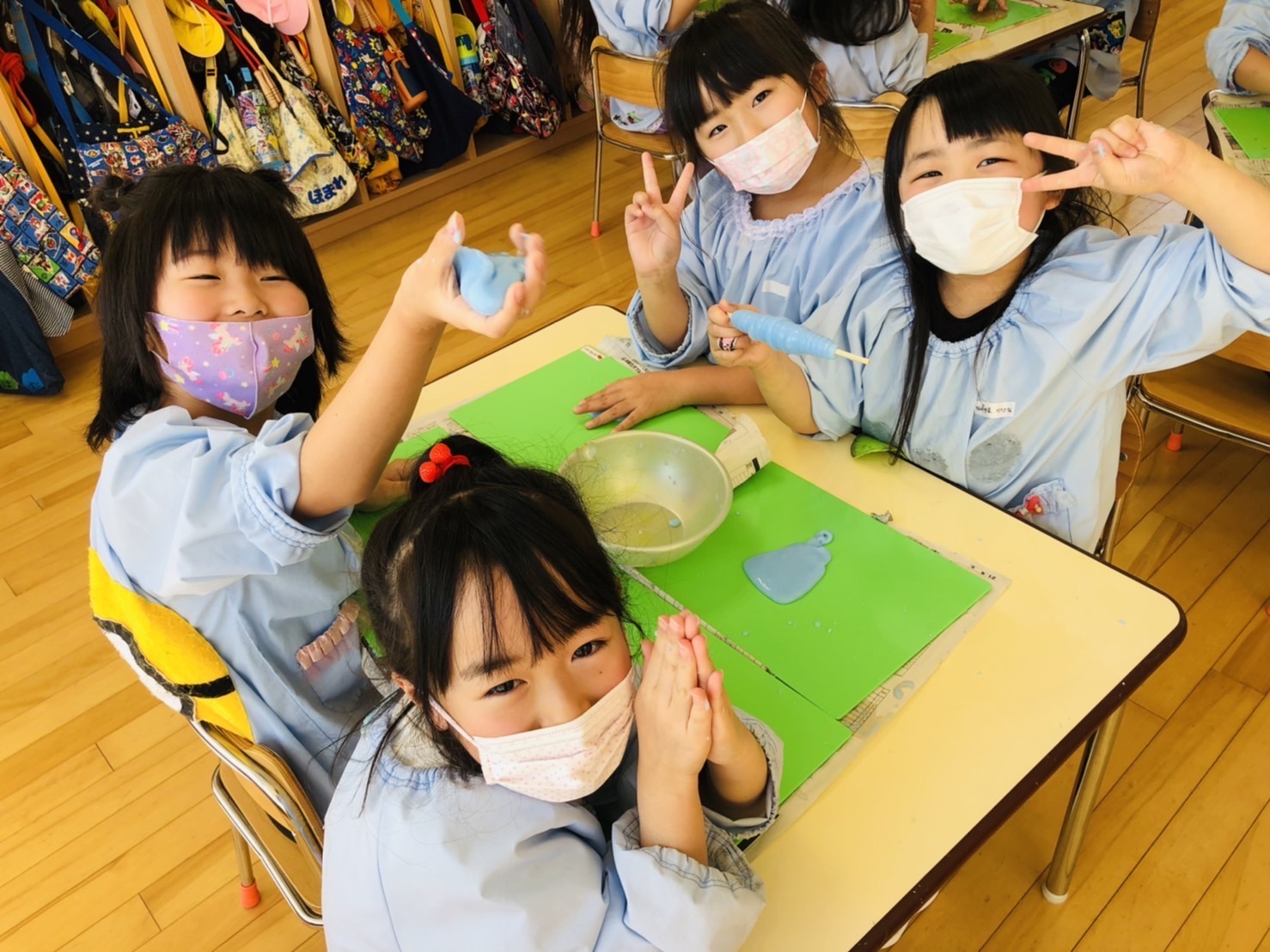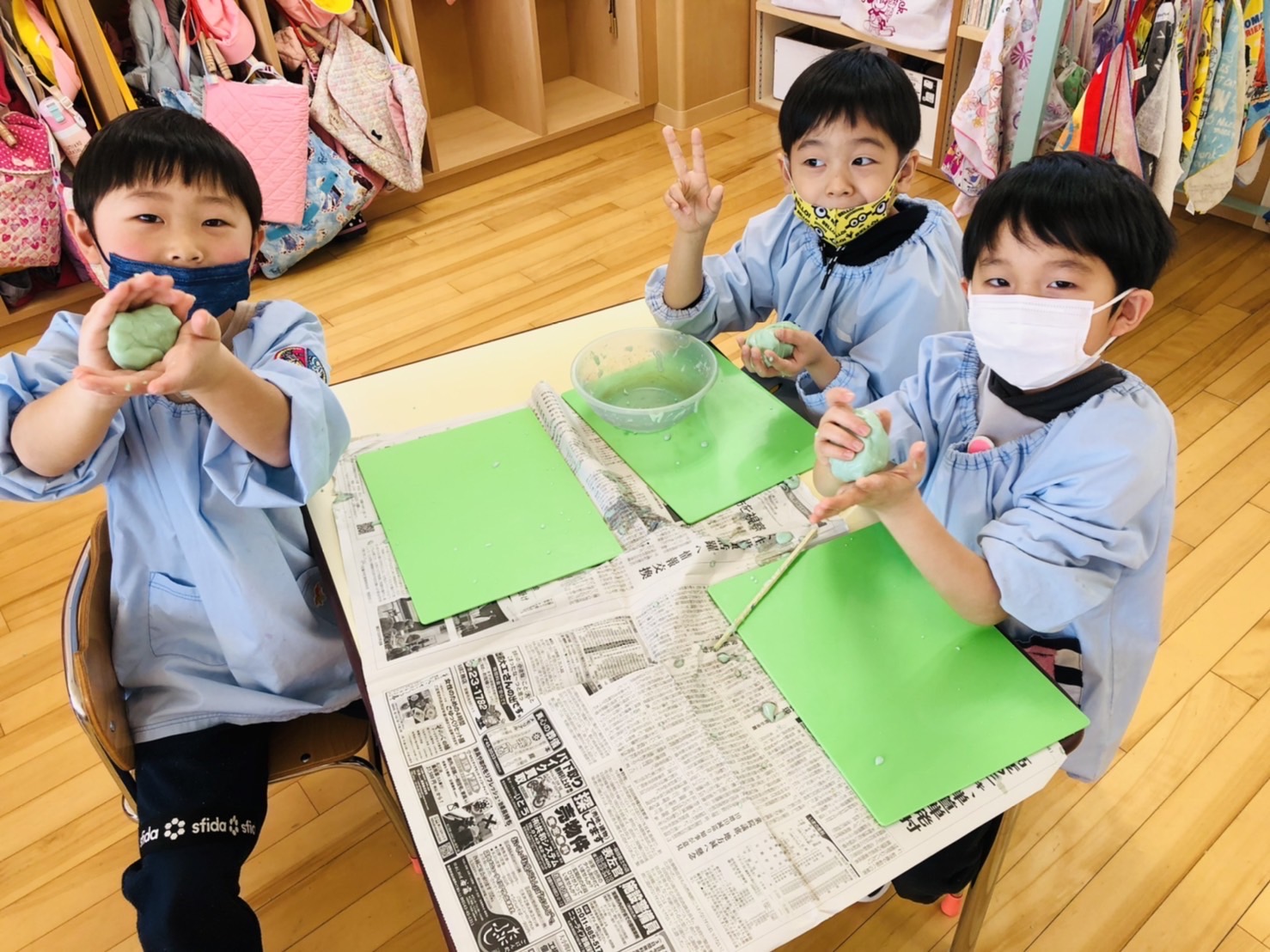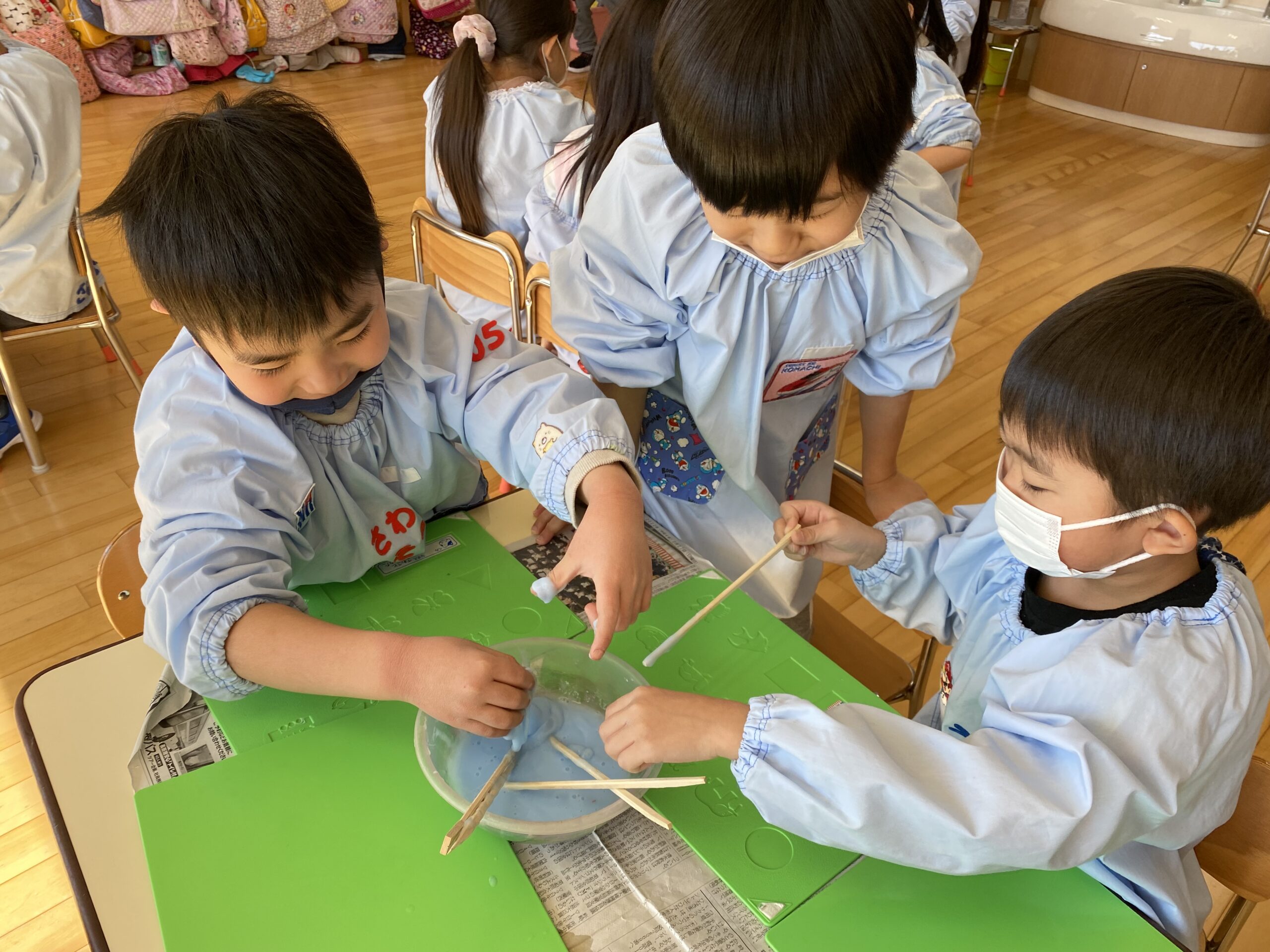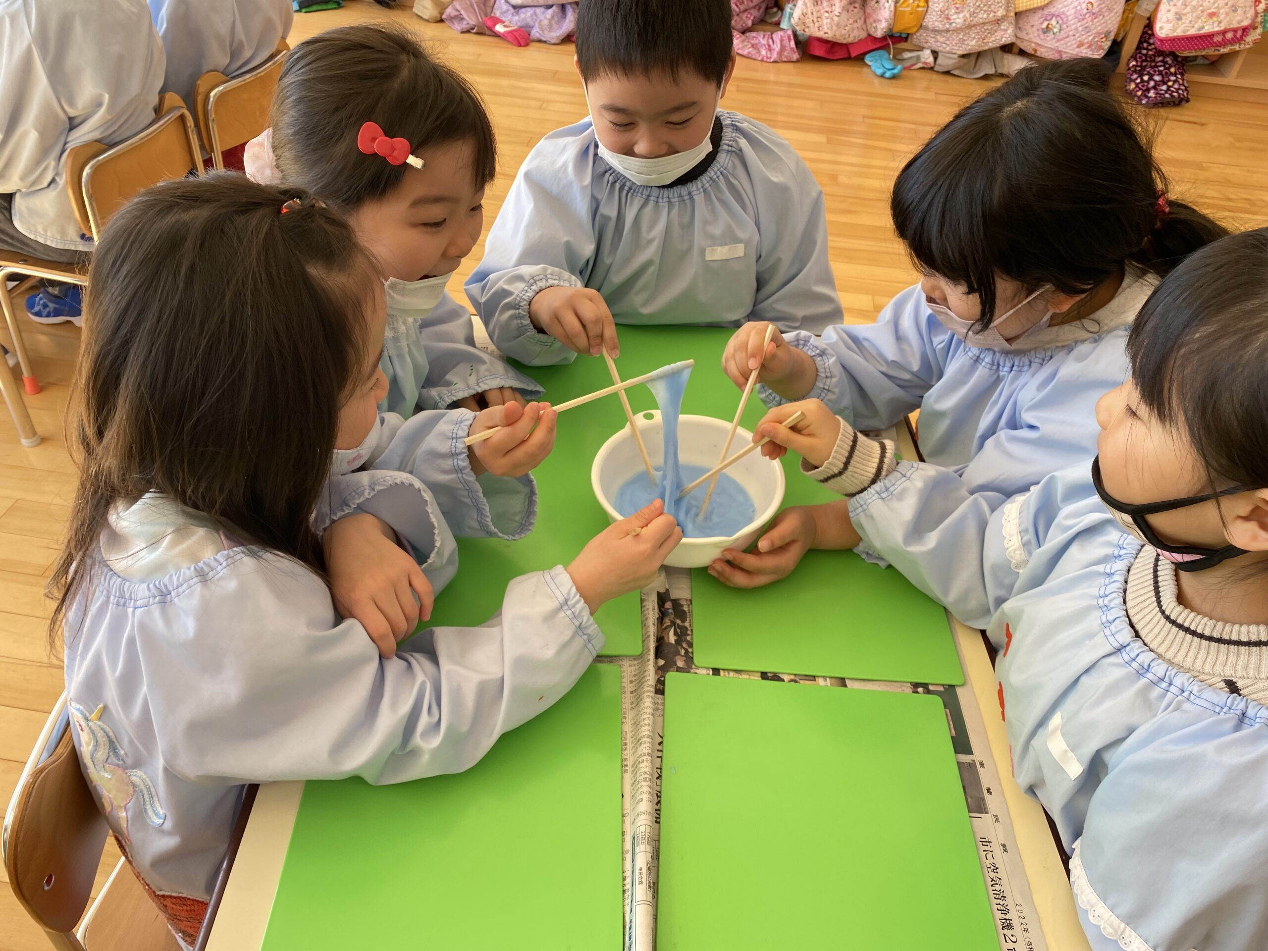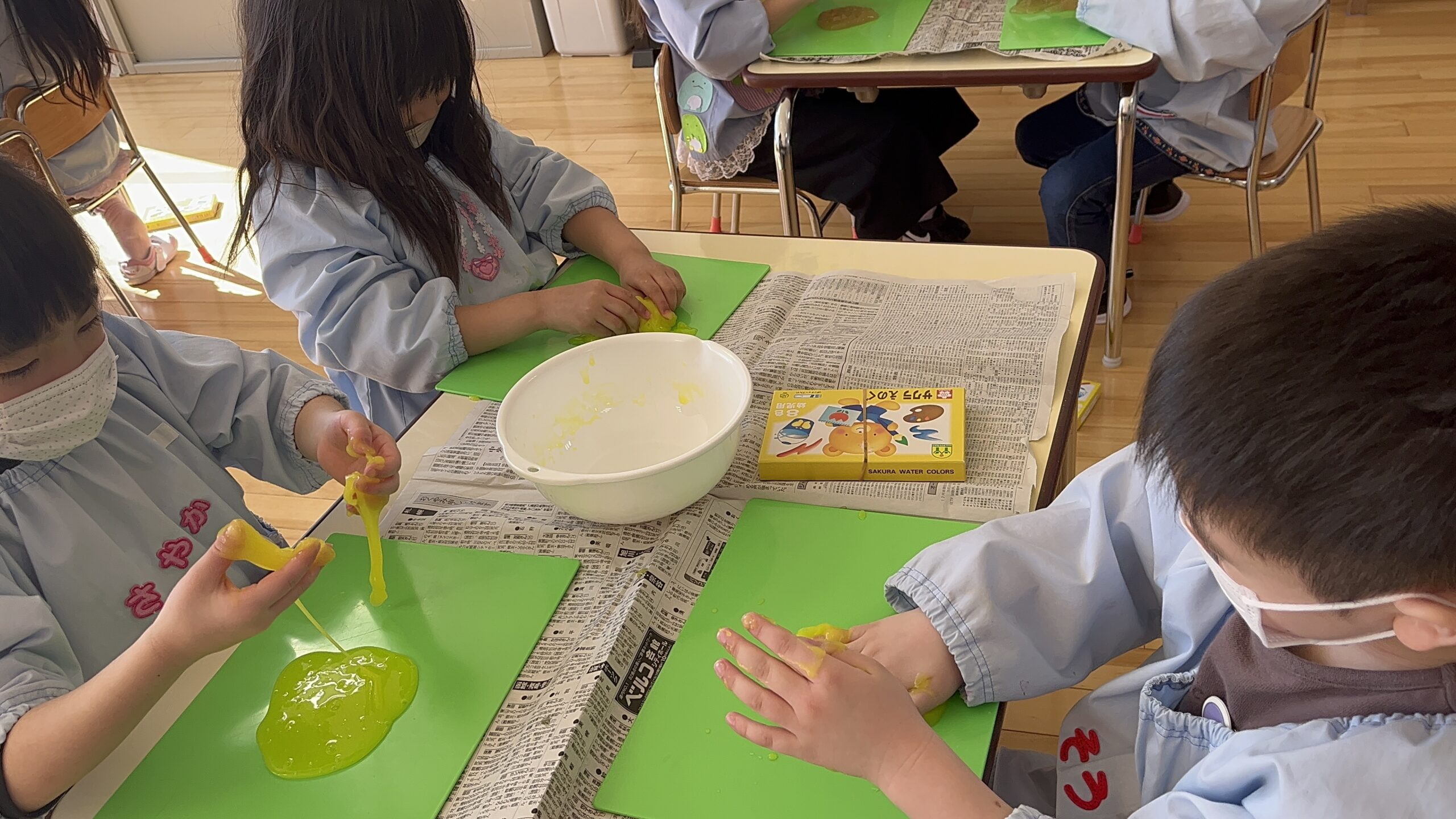 今日3月4日(金)年長学年はスライム作りを行いました。グループごとに相談して好きな色を絵具で作り、一つ一つの工程にドキドキしながら取り組んでいました。材料を混ぜて少しずつ固まっていく様子を見て、「わぁー!」「すごーい!」と驚いたり、「先生見てー!」とそれぞれの遊び方を披露してくれたりと、スライムの不思議な感触を存分に楽しむことができていました。「おうちでもやりたいから作り方教えて!」との声も多かったので是非ご家庭でもスライム作りに挑戦し、楽しんでみてくださいね♪