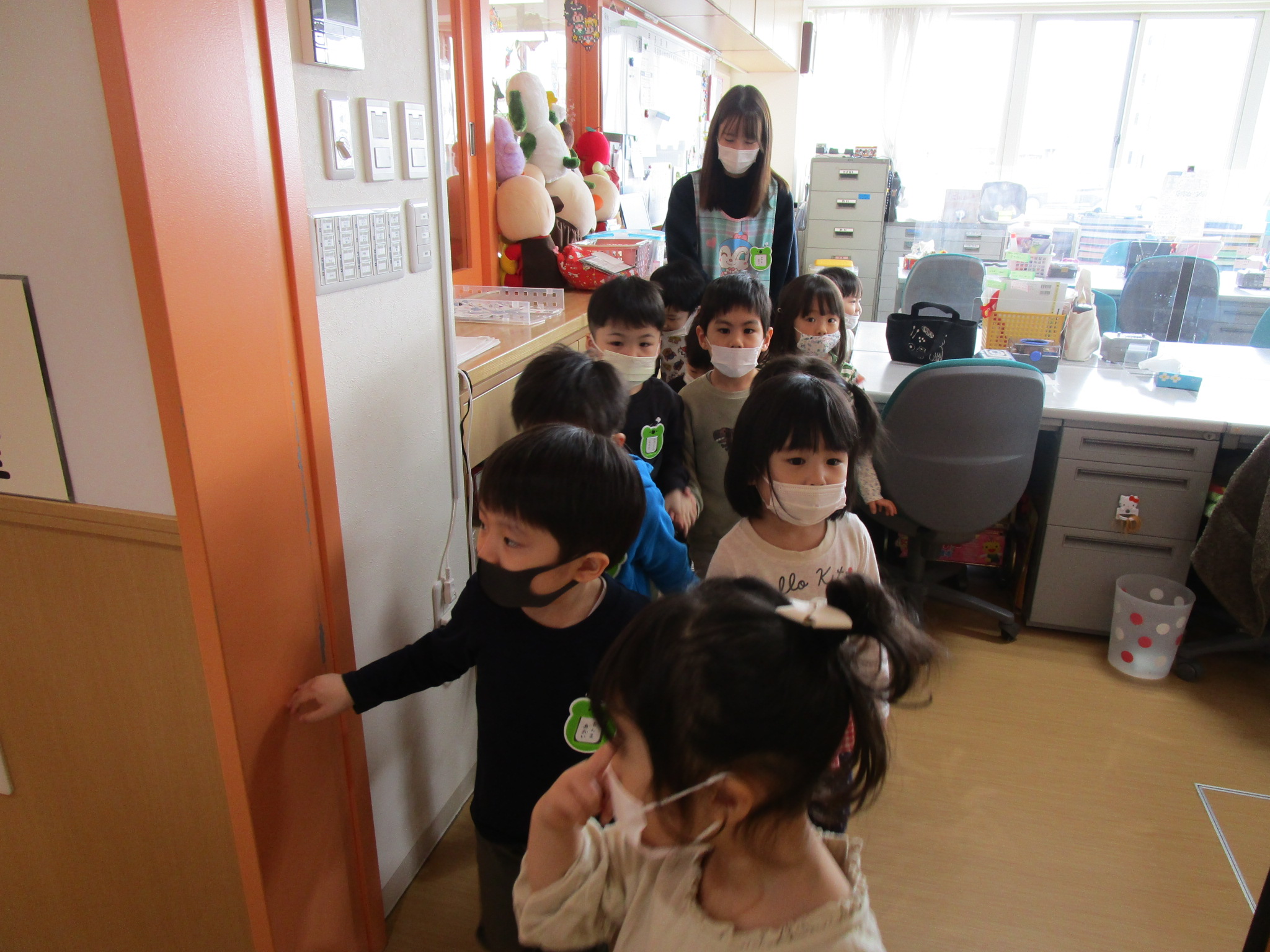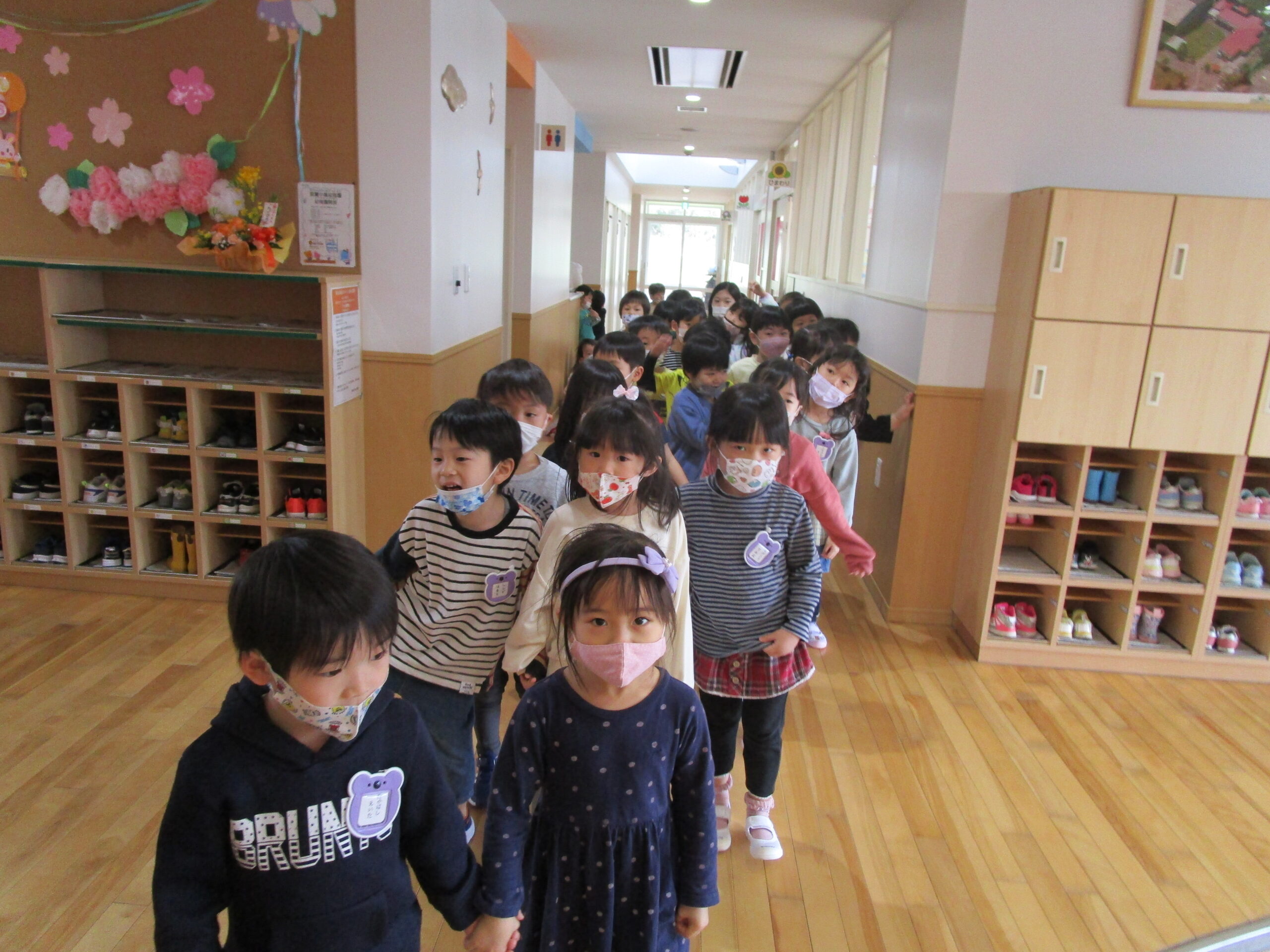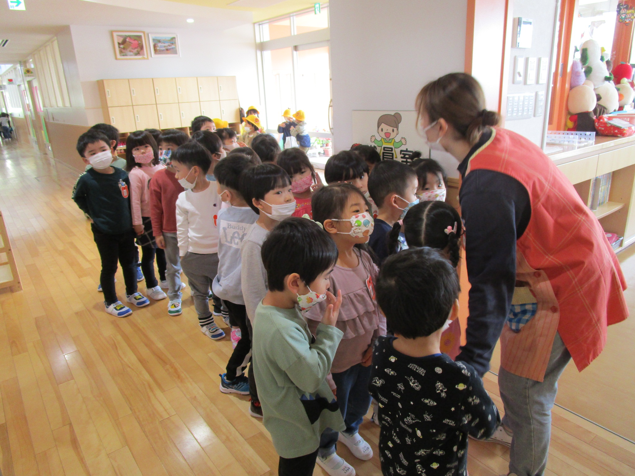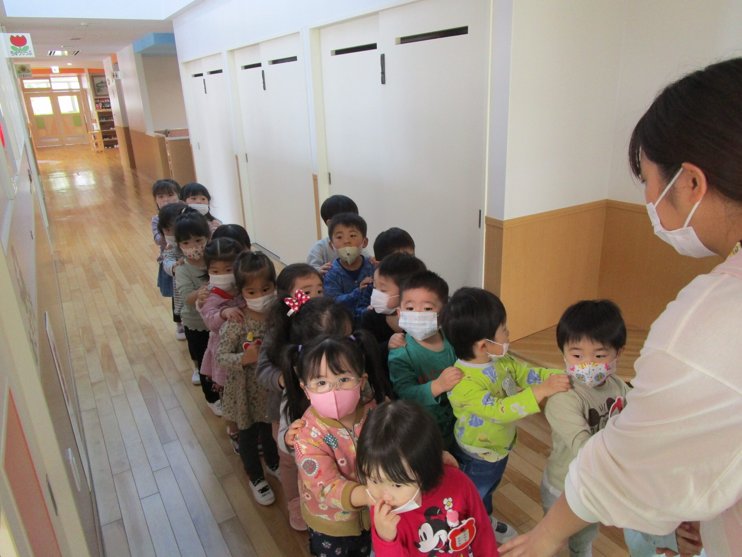 (4)令和4年度「園内見学」 2022年4月21日 園内ブログ 年長4月13日(水)年中4月14日(木)年少4月21日(木)各学年で園内見学を行いました。各お部屋の先生やお約束事を確認しました。職員室では理事長先生・園長先生・事務の先生にも元気にご挨拶できました。上手に並んで歩くことができ、幼稚園内をお散歩でき楽しむ様子が見られました。 今日の病気欠席者は、風邪5名、咳2名、鼻水7名、腹痛・下痢1名、大事をとって3名です。