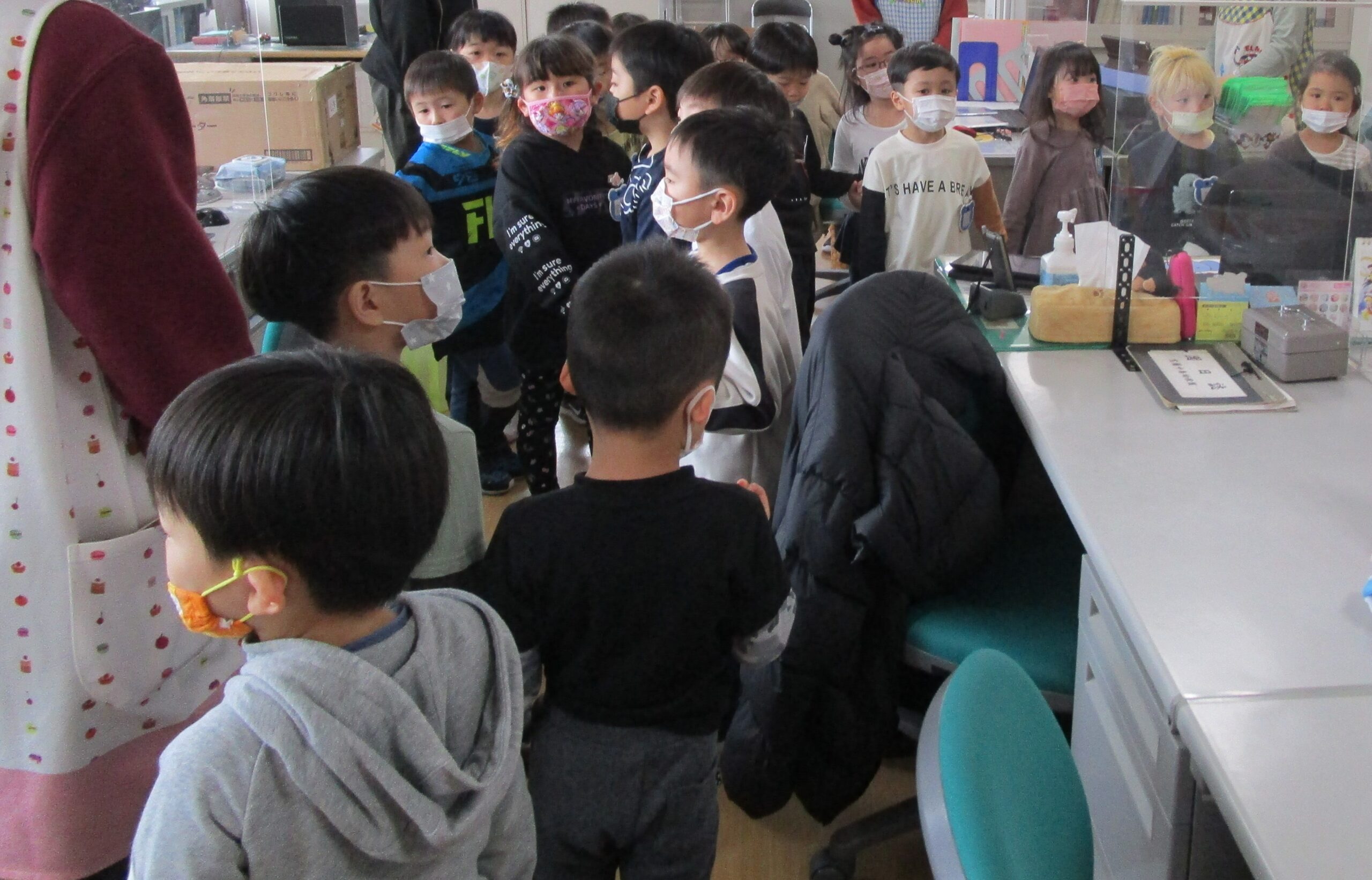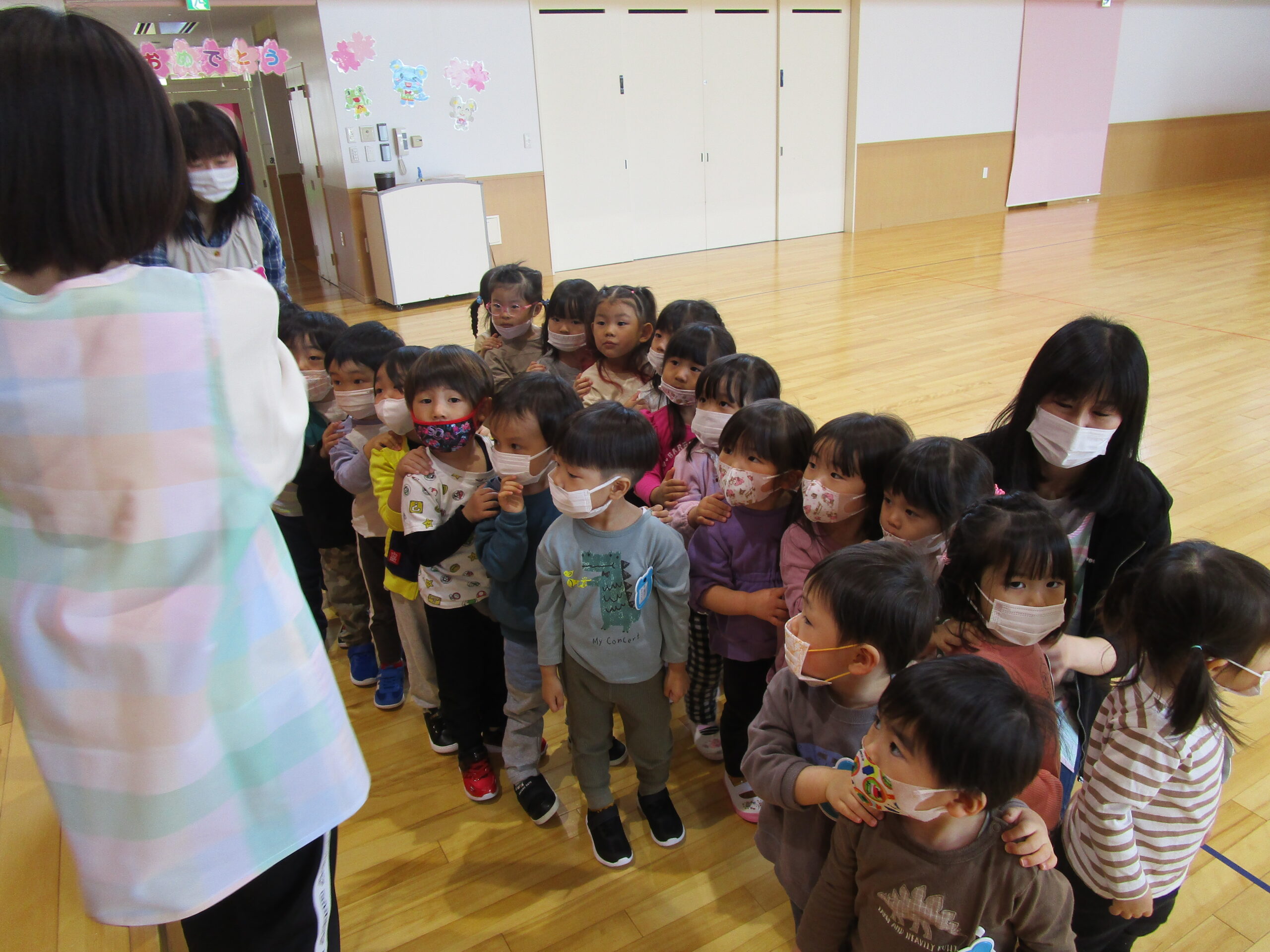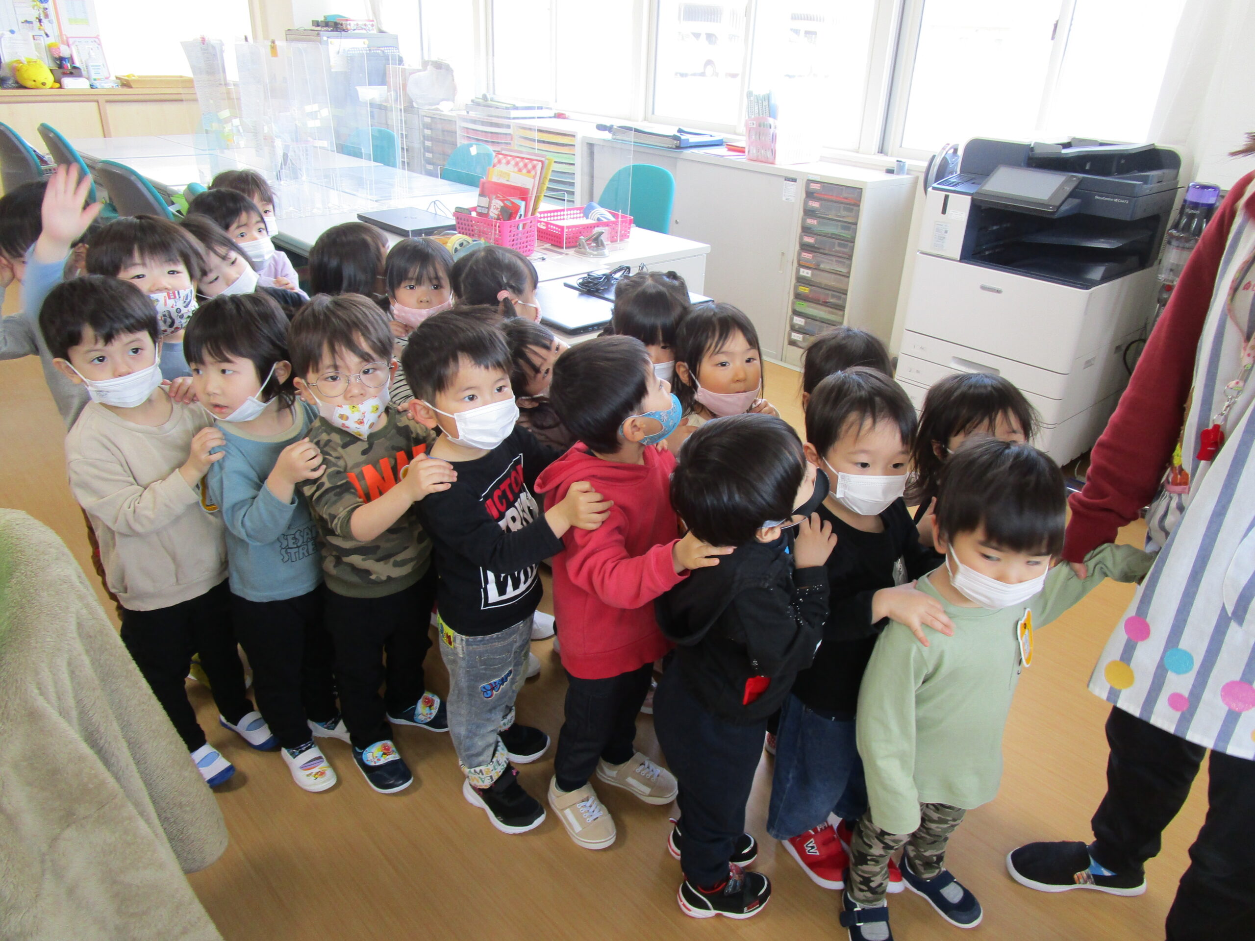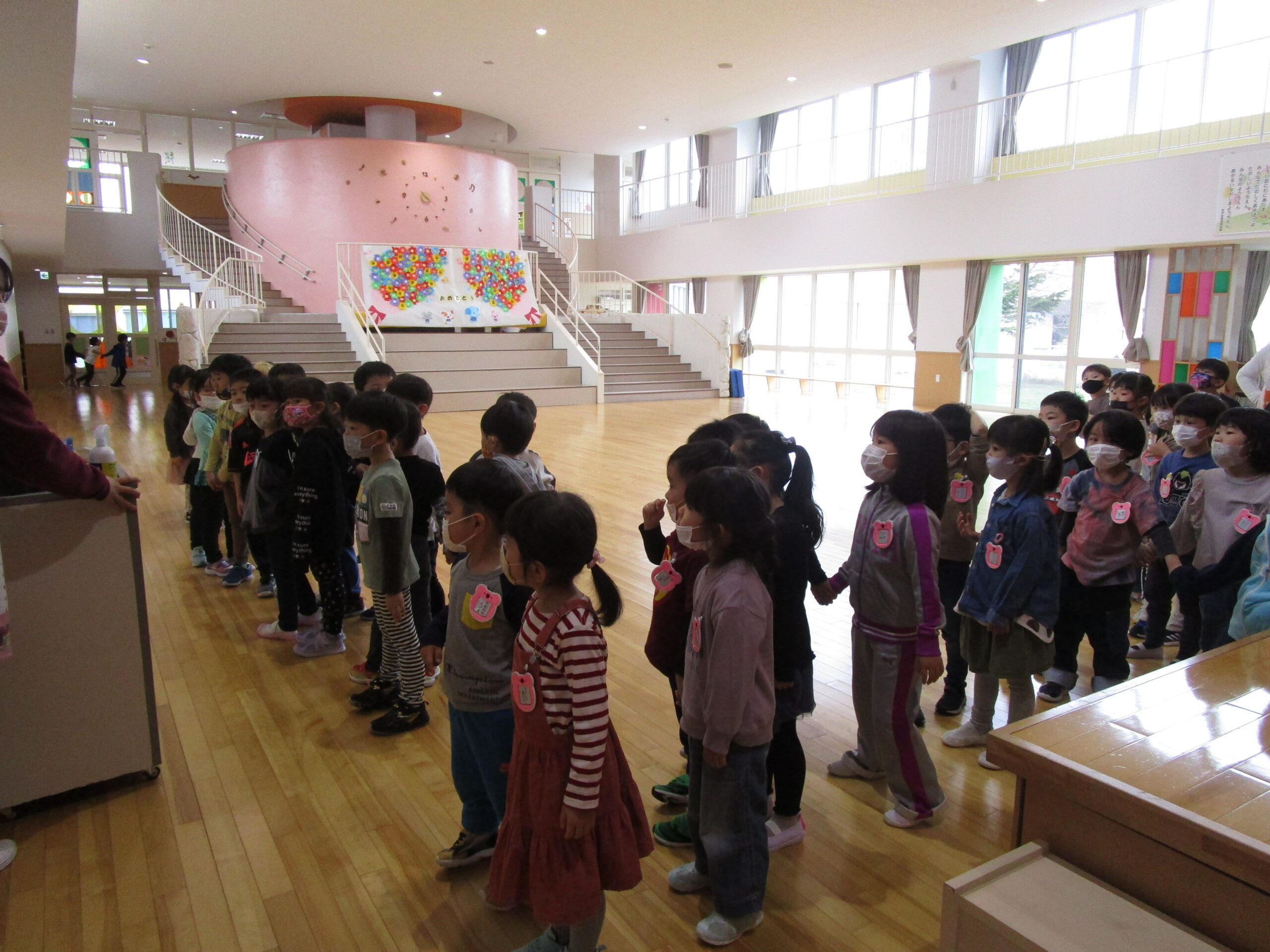 (4)令和4年度「園内見学」 2022年4月21日 園内ブログ 年長4月13日(水)年中4月14日(木)年少4月21日(木)各学年で園内見学を行いました。各お部屋の先生やお約束事を確認しました。職員室では理事長先生・園長先生・事務の先生にも元気にご挨拶できました。上手に並んで歩くことができ、幼稚園内をお散歩でき楽しむ様子が見られました。 今日の病気欠席者は、風邪5名、咳2名、鼻水7名、腹痛・下痢1名、大事をとって3名です。