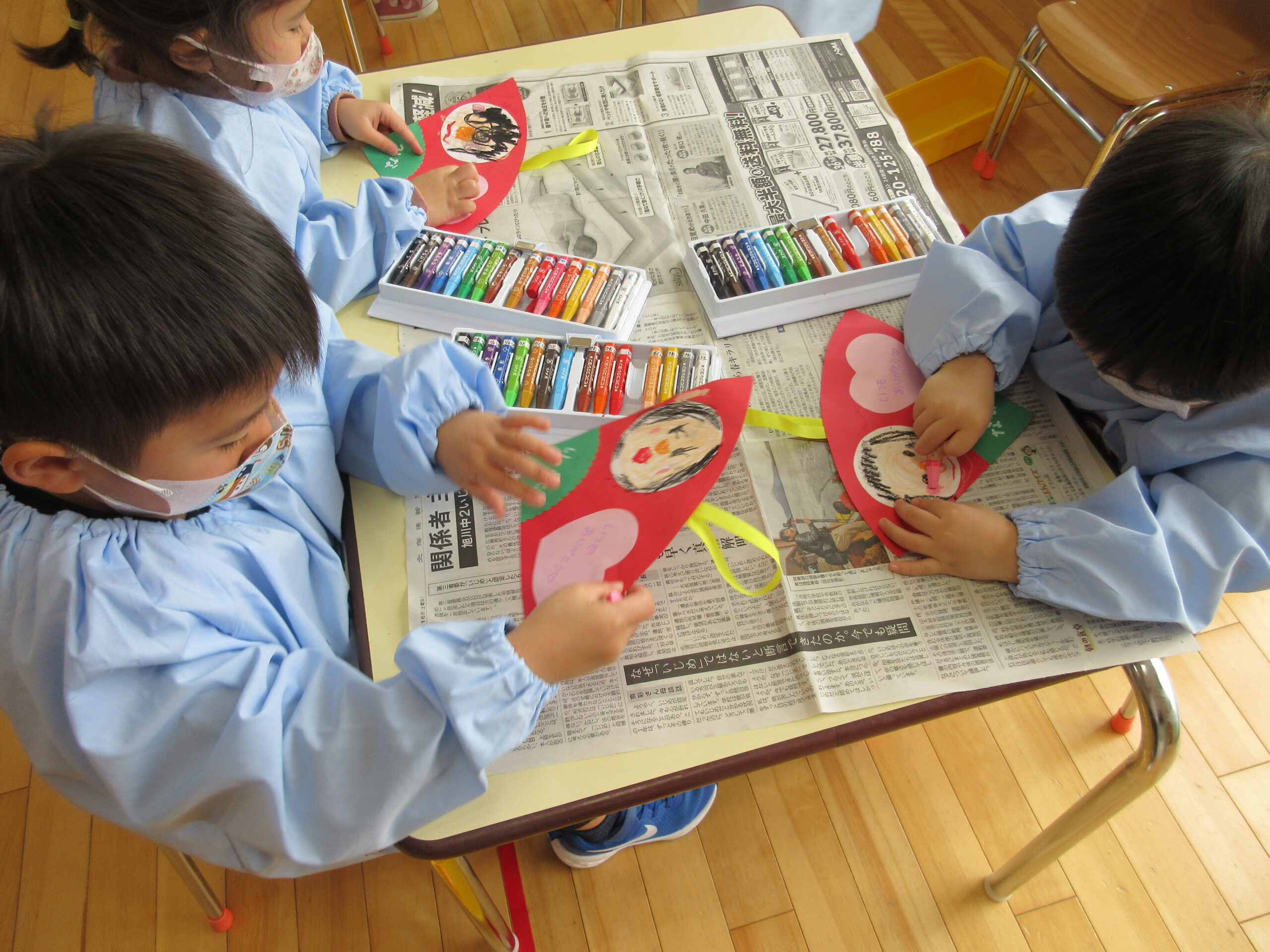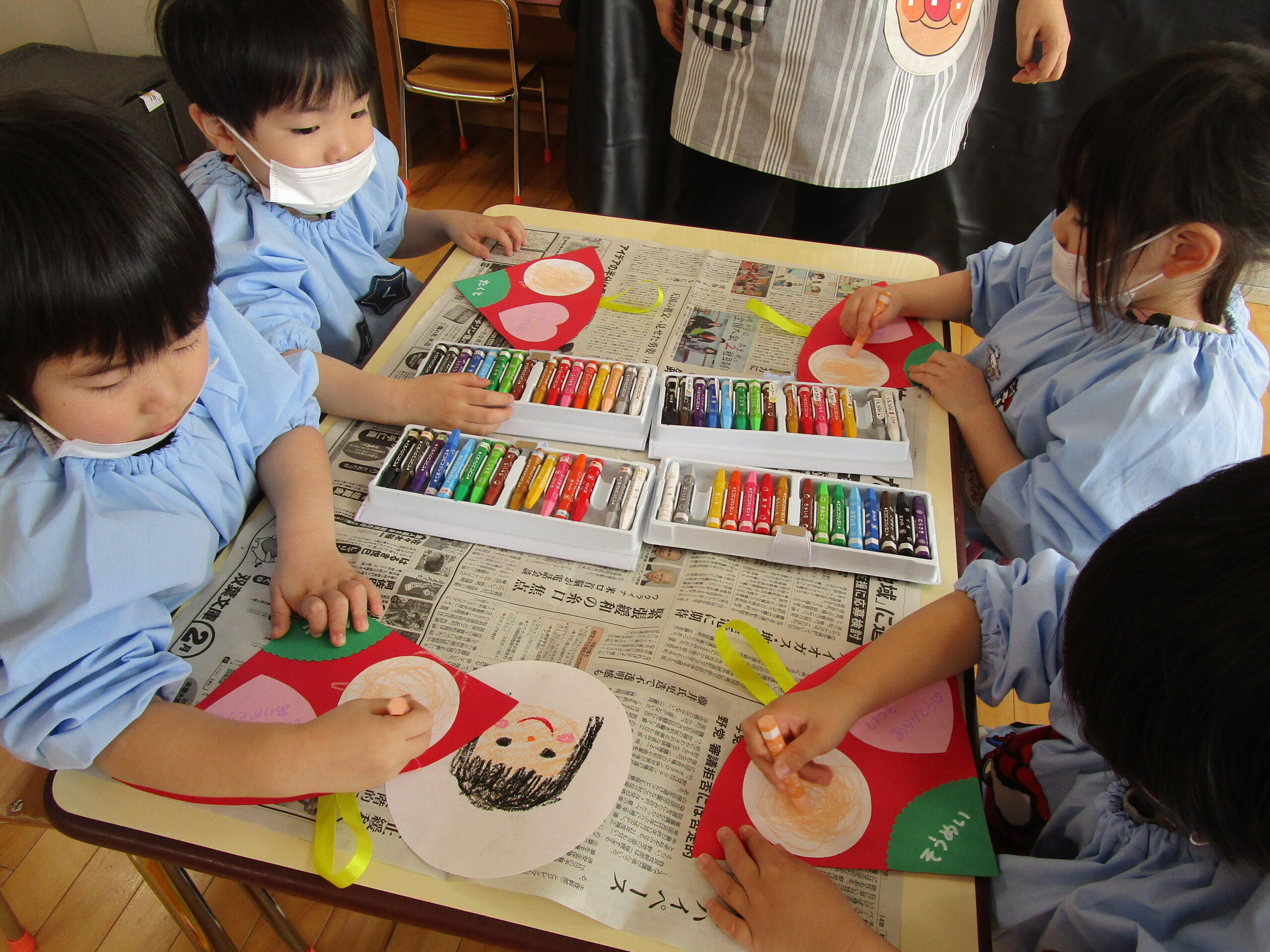 また、今日は母の日製作を行い、お母さんの顔を描きました。前回のお約束を守って上手に行うことが出来ていました。先週から午後保育が始まり、お弁当では完食したお弁当箱をみて満足そうにする姿が見られたり、給食でも「美味しい~!」と食べ進める姿も見られていますので、今後も無理をせずに取り組んでいきたいと思います。