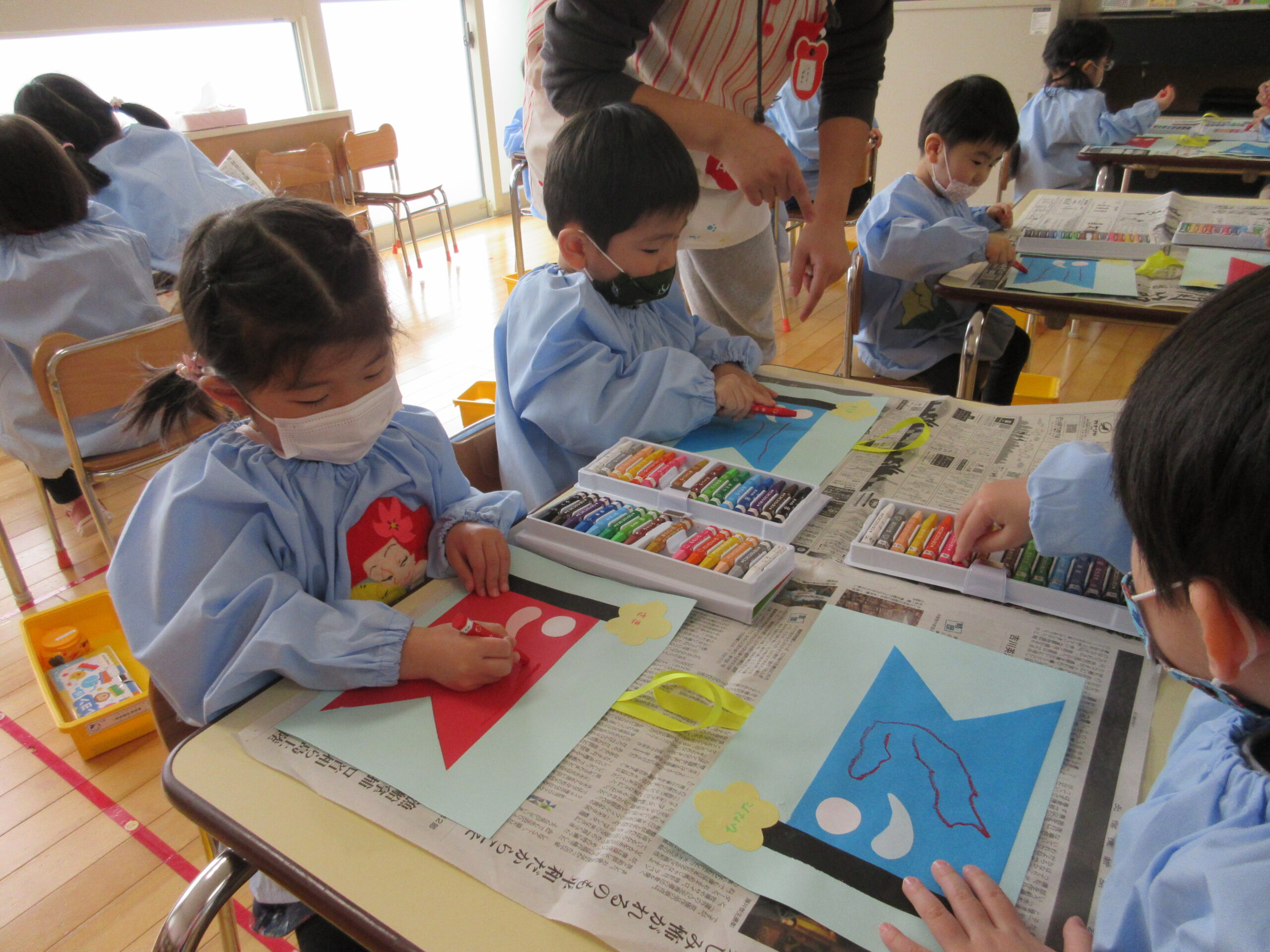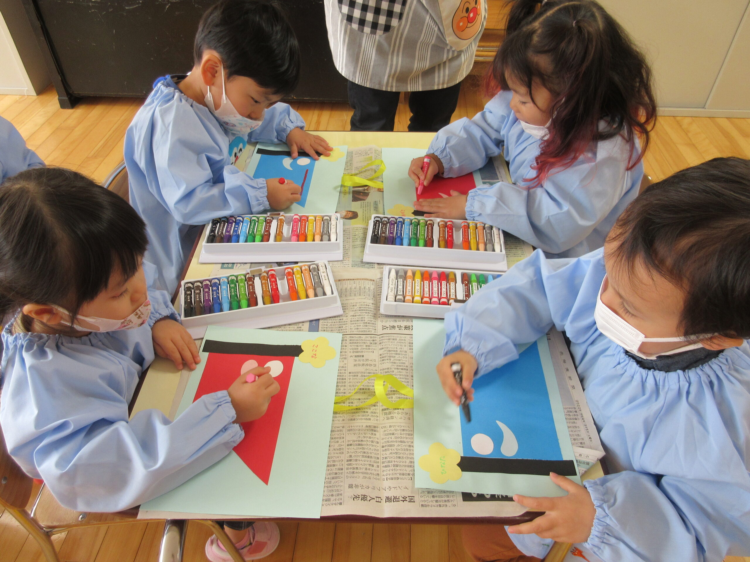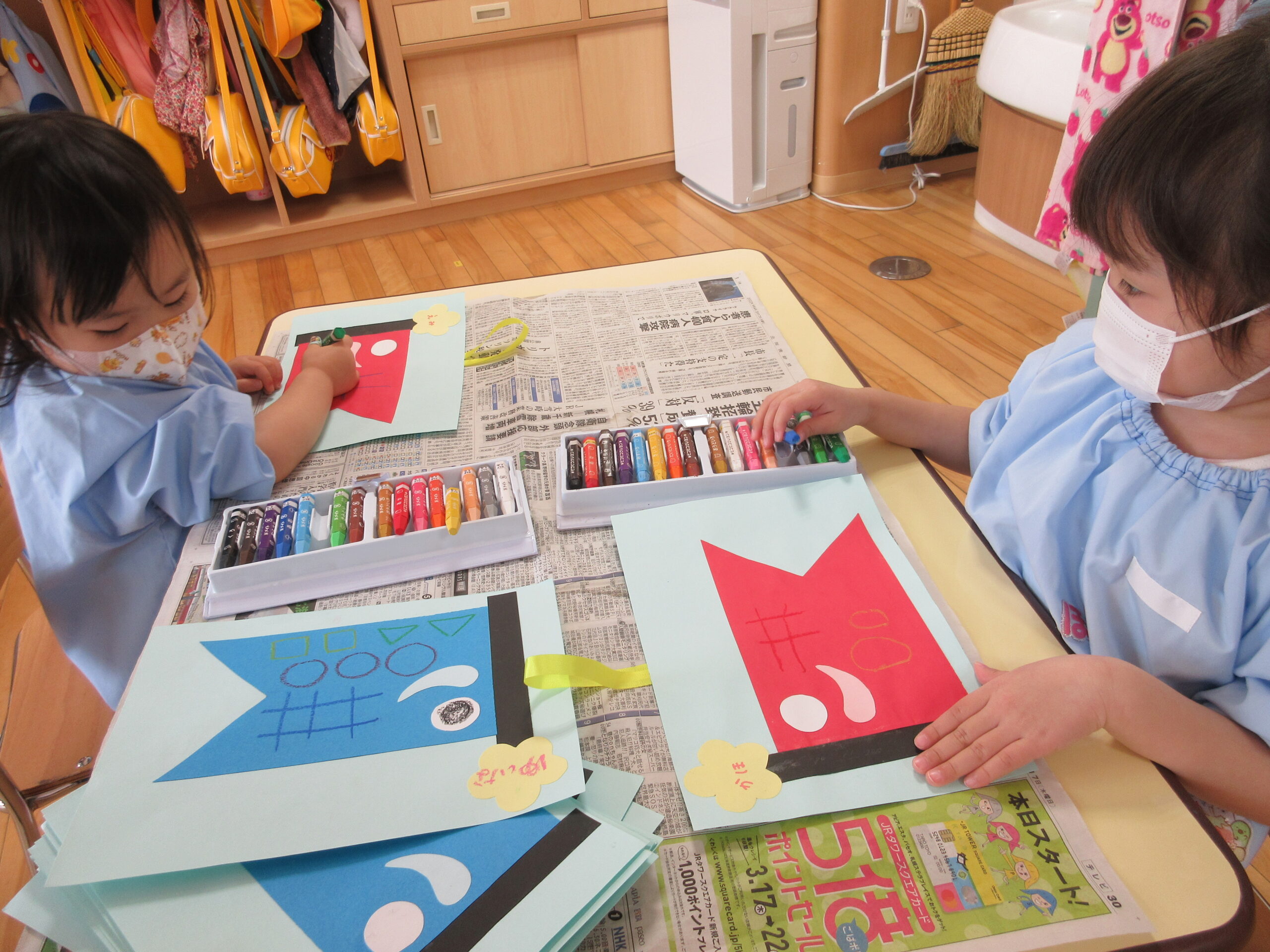 4月22日(金)は、子どもの日製作を行いました。初めての製作で、クレヨンの使い方や色を確認し、線・丸・三角・四角などの形を描き、こいのぼりを作りました。本日持ち帰っていますので、ご家庭でご覧になって下さい♪