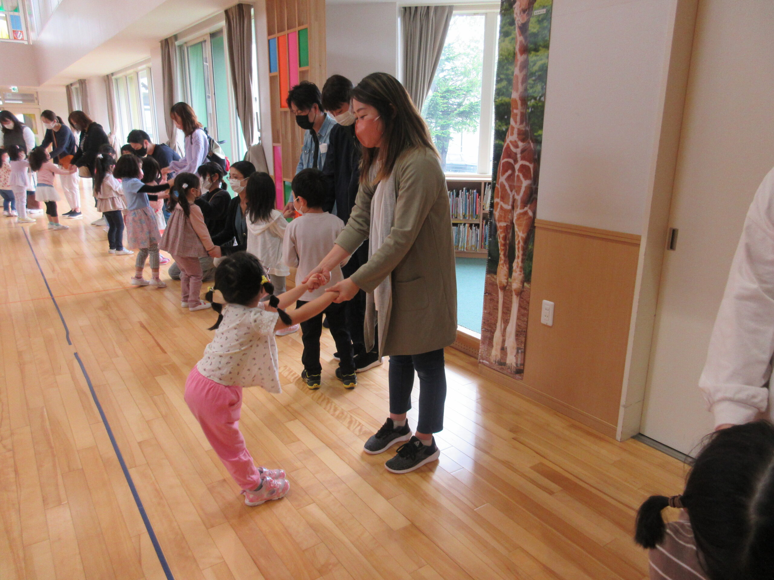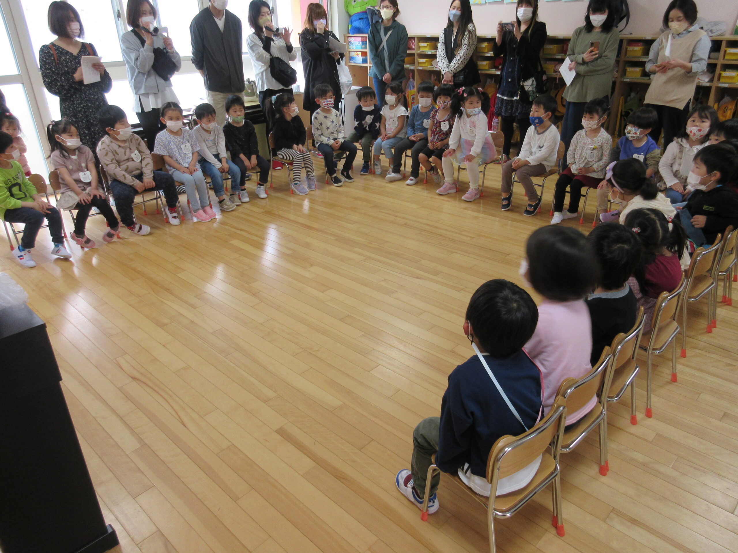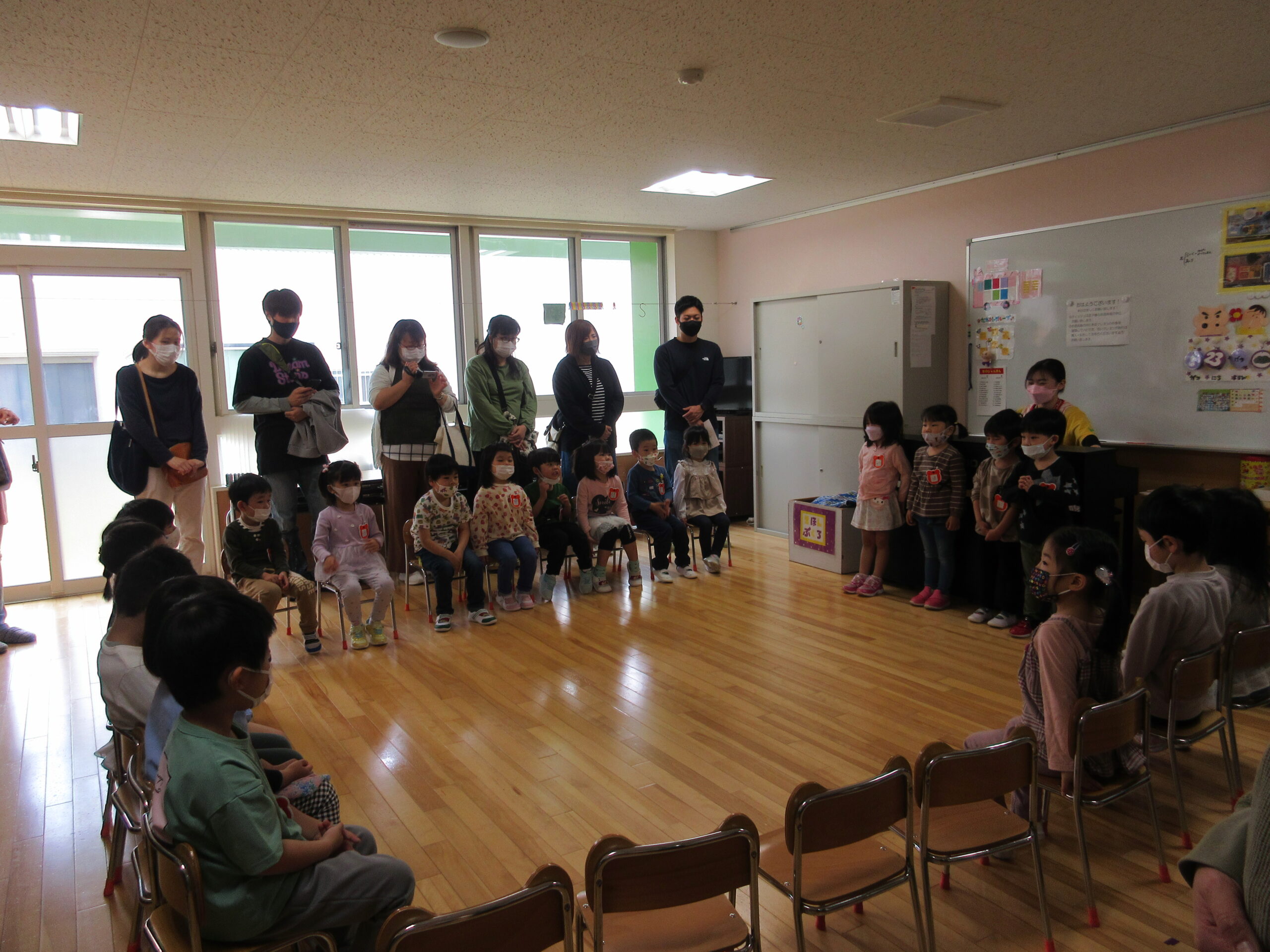 延期しておりました参観日を本日よりクラス毎でスタートしました。今日5月23日(月)は年中学年の参観日でした。親子登降園で子ども達は嬉しそうに登園していました。ホールでは「よろしくね!・かして、かして」の曲に合わせて親子触れ合い遊びや仲間あつめゲームを親子で楽しみました。ゲームのなかでは保護者の方への質問もあり、笑い声が上がる場面もありました。短い時間ではありましたが親子で笑顔溢れる時間を過ごせて感謝しています。保護者の皆様、御協力有難うございました。