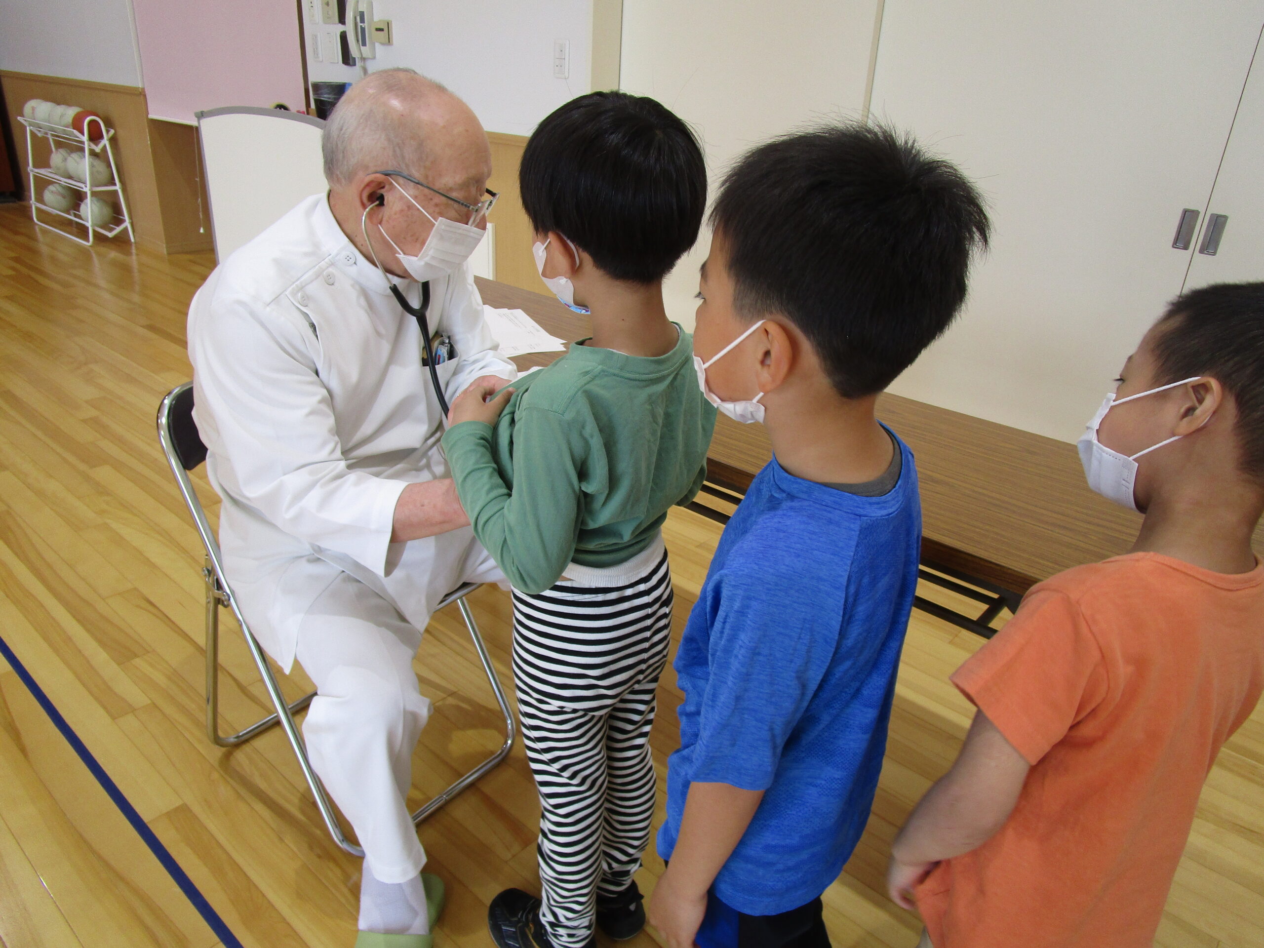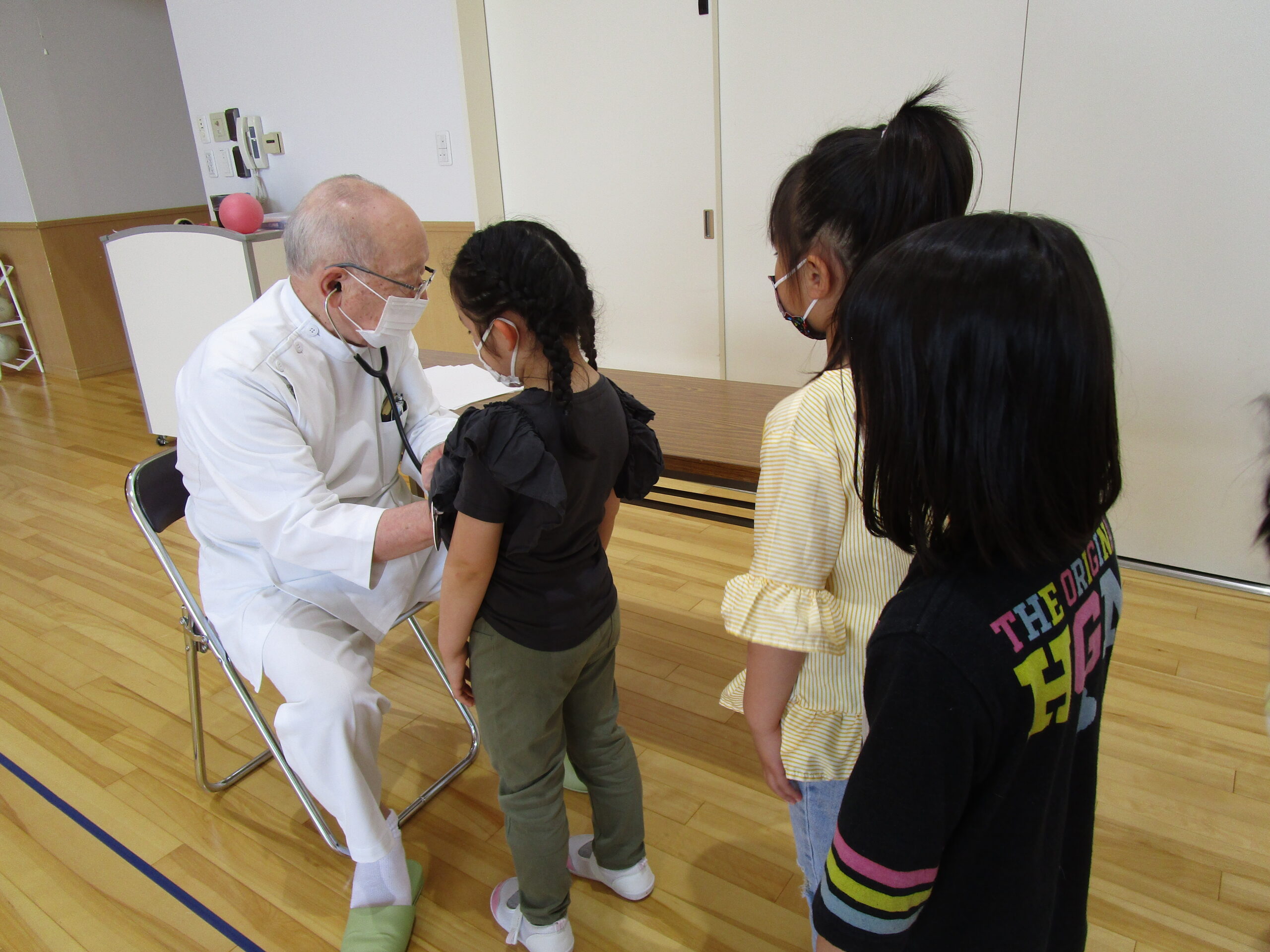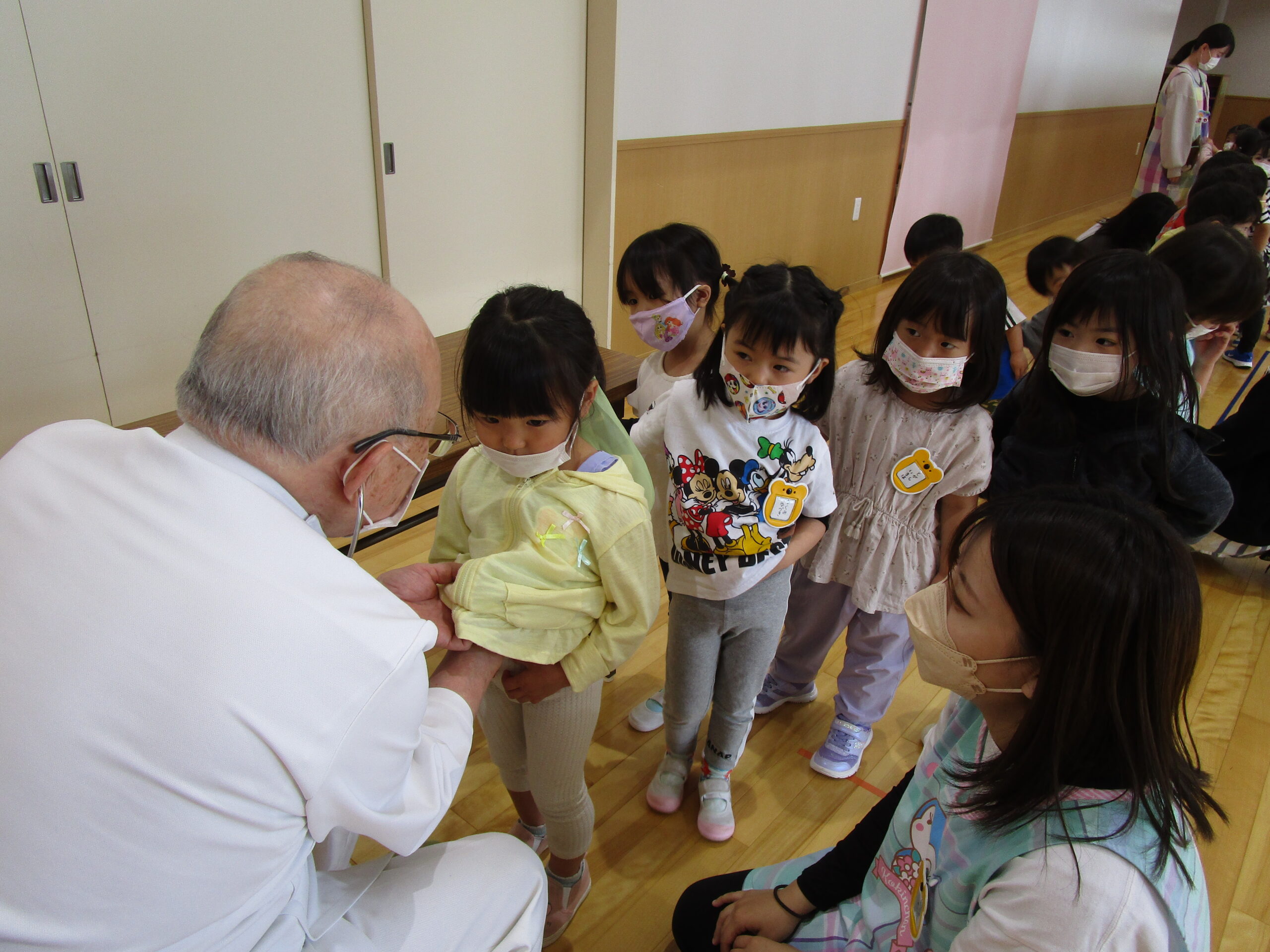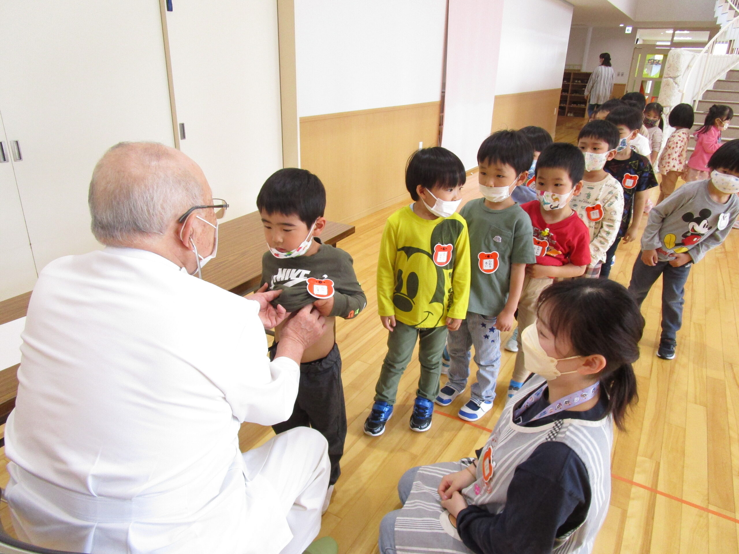 (23)令和4年度「内科検診」 2022年6月14日 園内ブログ 本日6月14日(火)12時よりクラス毎で内科検診が行われました。上半身の衣服を持ち上げて先生から聴診器を当てられても静かに診て頂くことができました。歯科検診同様、始めと終わりの挨拶も忘れずに出来ていましたね。診察して頂く姿勢がとても上手でした。本庄先生ありがとうございました。 今日の病気欠席者は、風邪1名、鼻水1名、咳1名、嘔吐3名、腹痛・下痢1名、体調不良1名、大事をとって1名です。