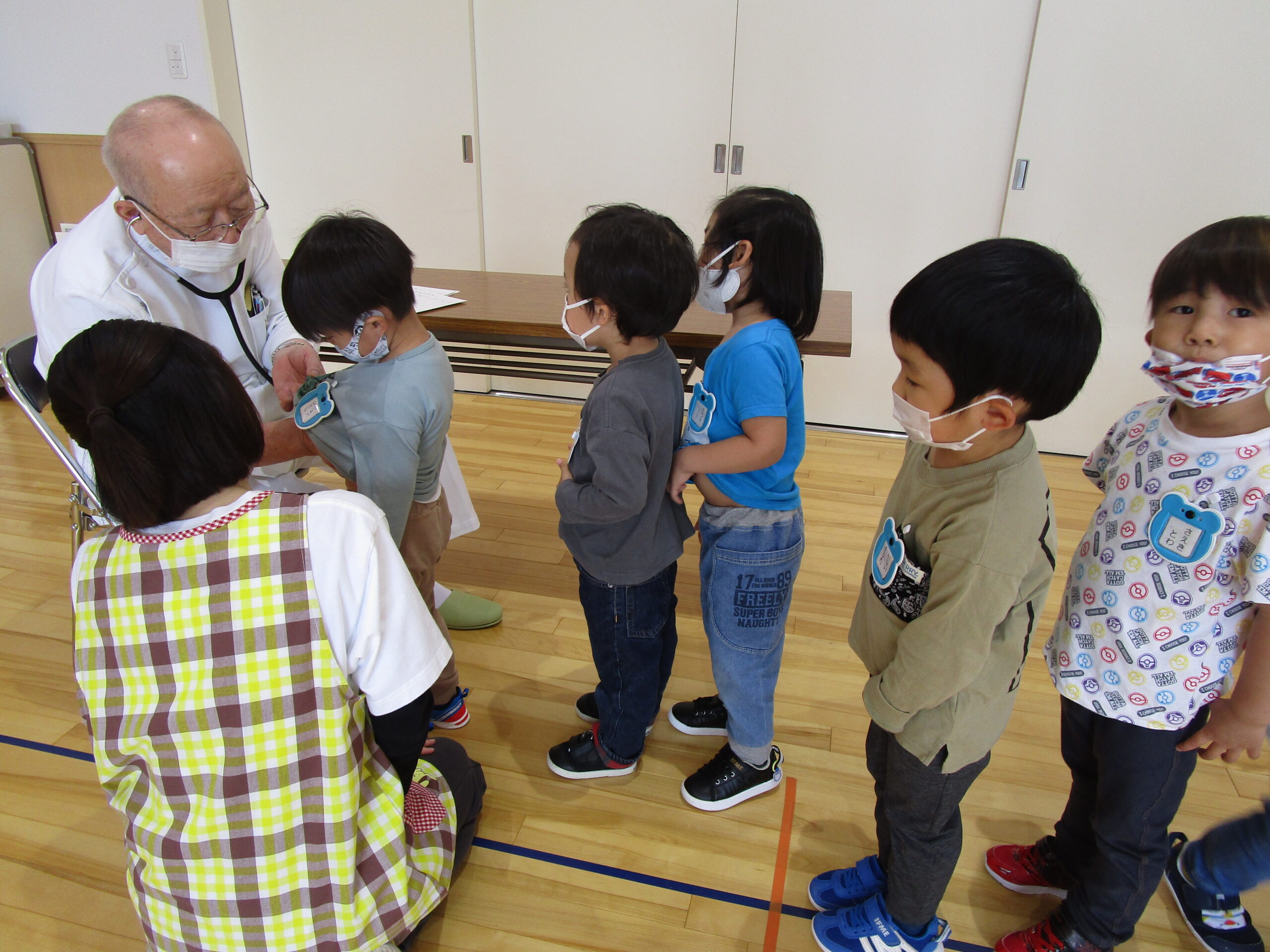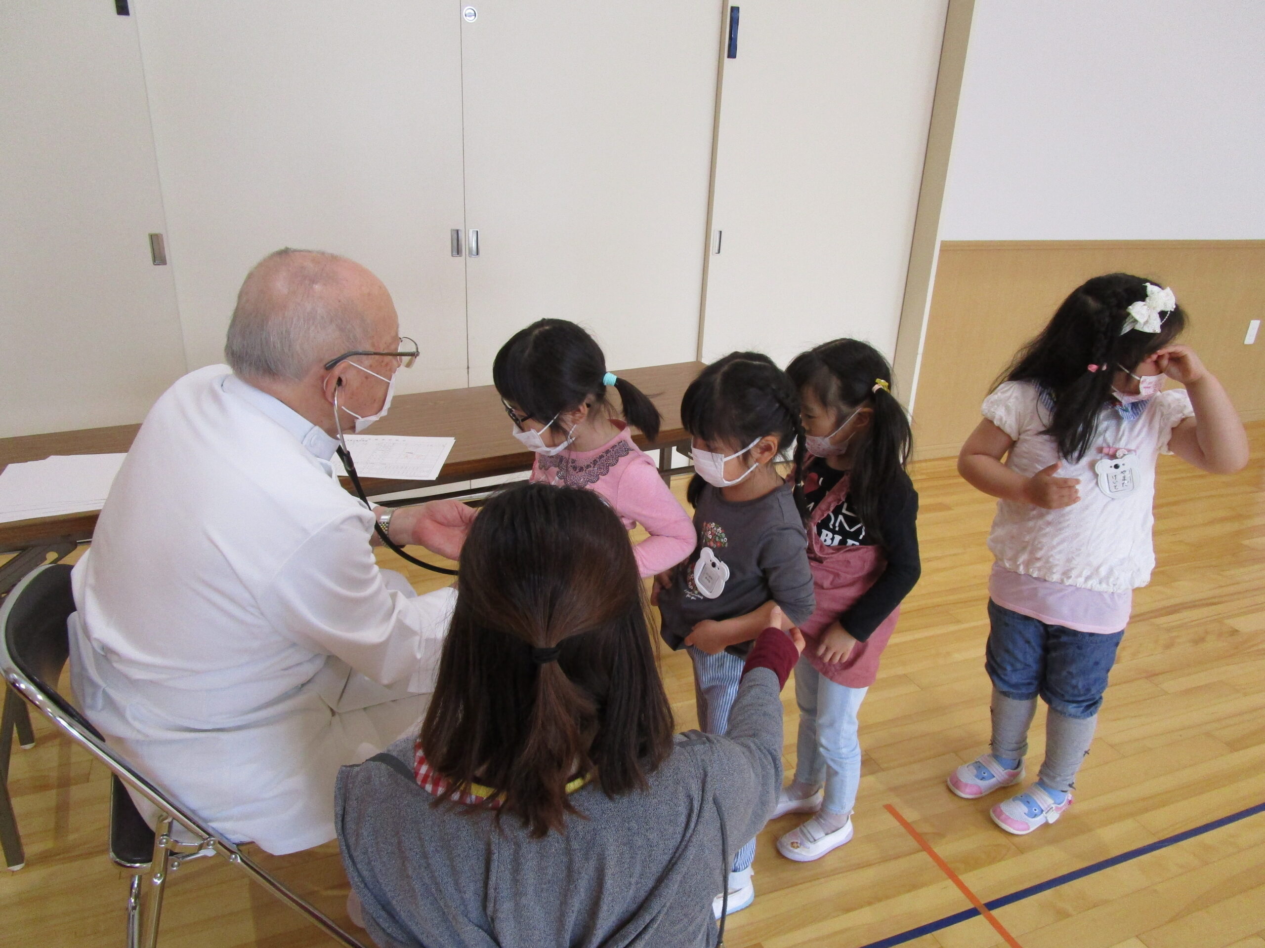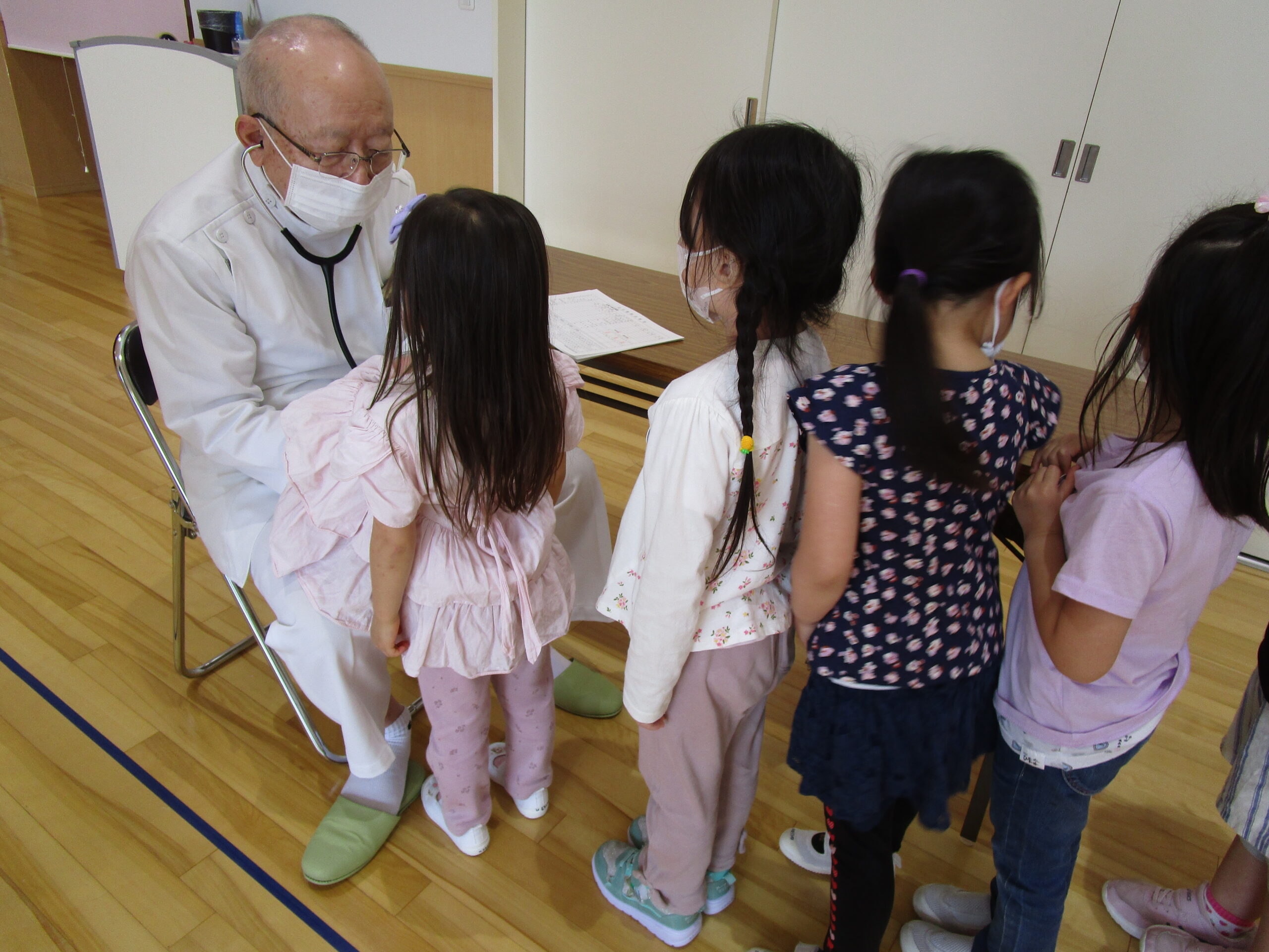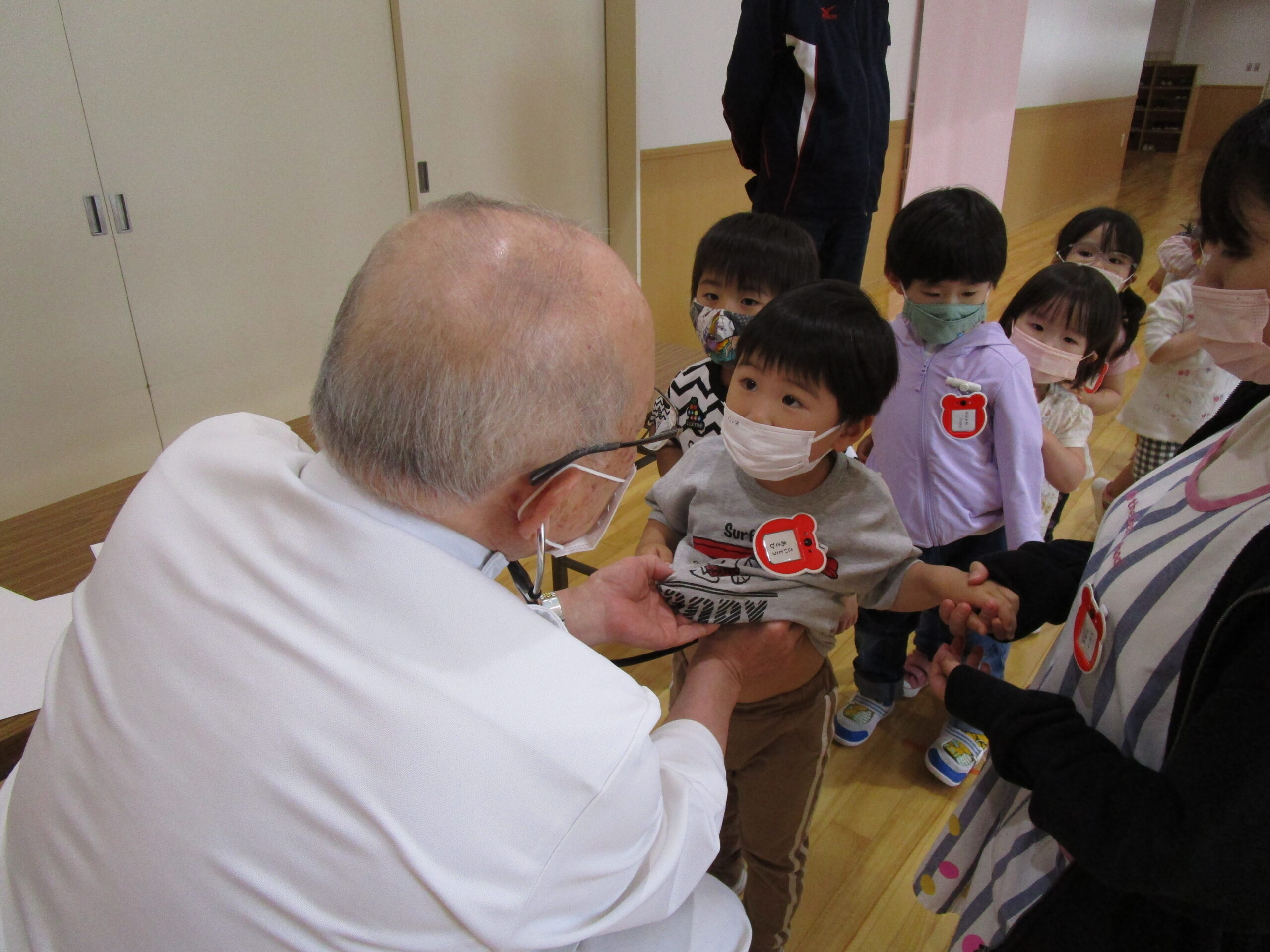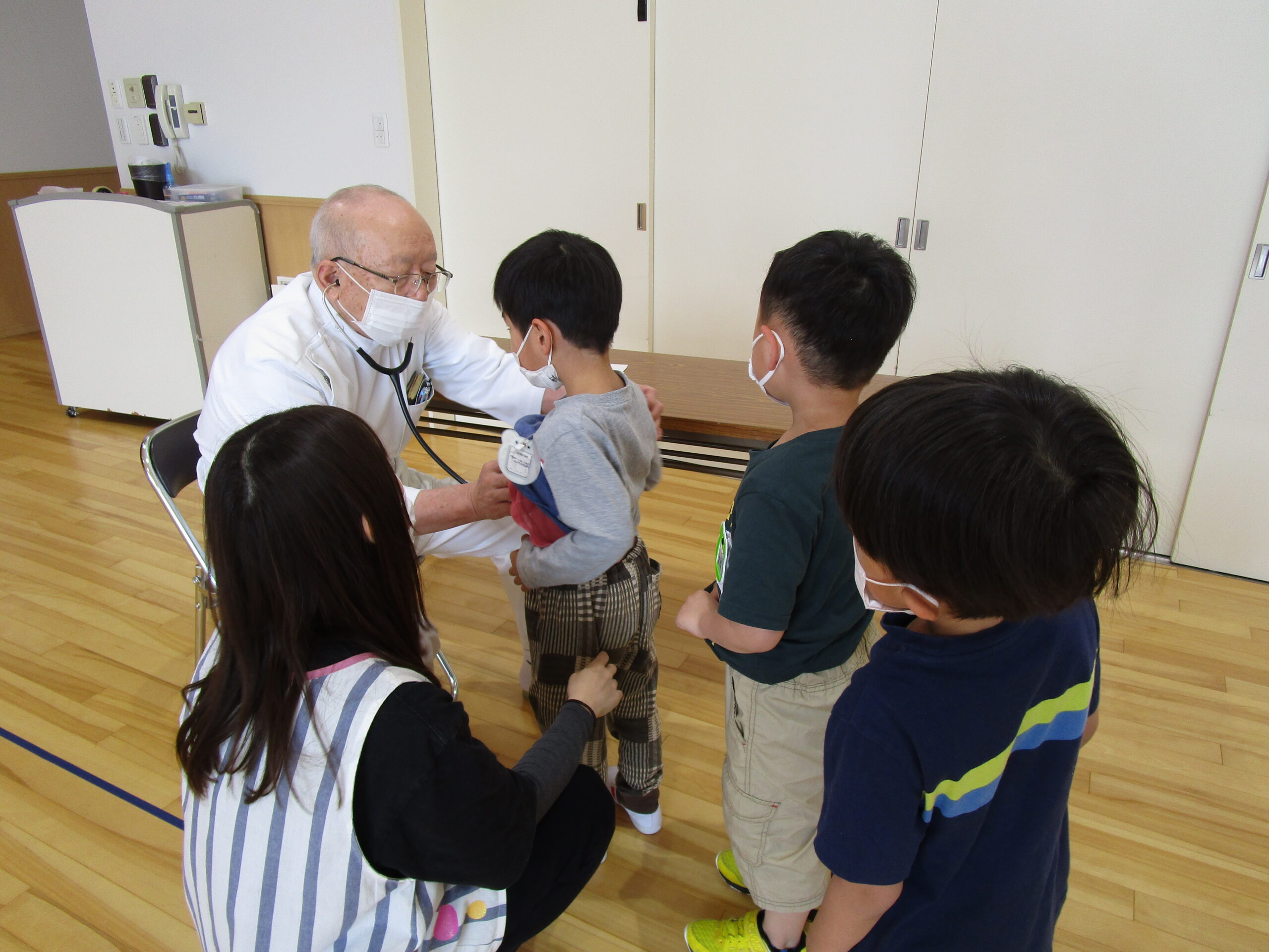 (23)令和4年度「内科検診」 2022年6月14日 園内ブログ 本日6月14日(火)12時よりクラス毎で内科検診が行われました。上半身の衣服を持ち上げて先生から聴診器を当てられても静かに診て頂くことができました。歯科検診同様、始めと終わりの挨拶も忘れずに出来ていましたね。診察して頂く姿勢がとても上手でした。本庄先生ありがとうございました。 今日の病気欠席者は、風邪1名、鼻水1名、咳1名、嘔吐3名、腹痛・下痢1名、体調不良1名、大事をとって1名です。