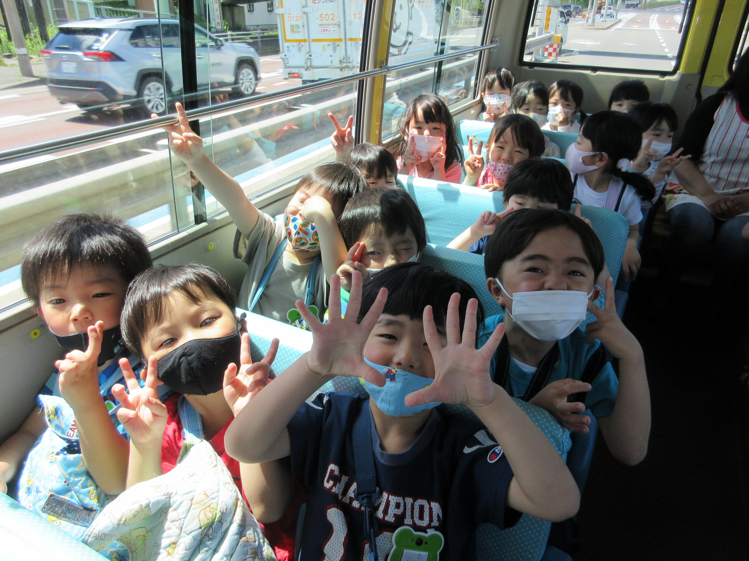 (25)令和4年度「年中学年バス遠足」 2022年6月17日 園内ブログ 今日6月17日(月)は年中学年のバス遠足でした。年少同様、白老のナチュの森まで出掛けました。行きのバスの中ではルンルン、生き生きとした表情でしたが帰りのバスでは少々口数も少なく疲れきった表情でした。疲れきった表情の中にも大満足の様子が窺われました。現地では、遊具でお友達と一緒に体を動かし笑顔一杯、気持ちよさそうなお顔を沢山見ることができました。お昼もみんなモリモリ食べて楽しい一日を過ごすことが出来ました。 今日の病気欠席者は、嘔吐1名、腹痛・下痢2名、大事をとって3名です。
