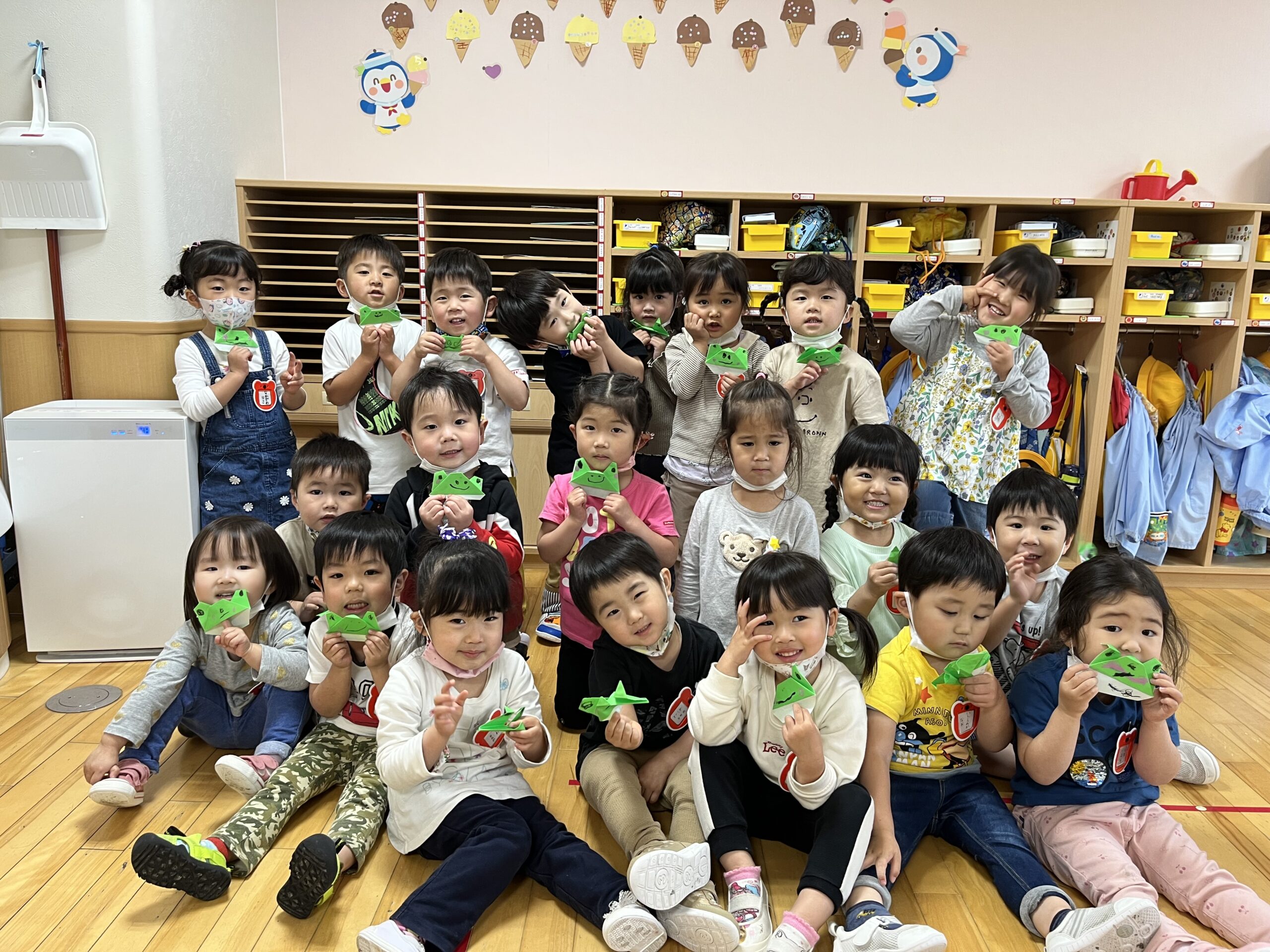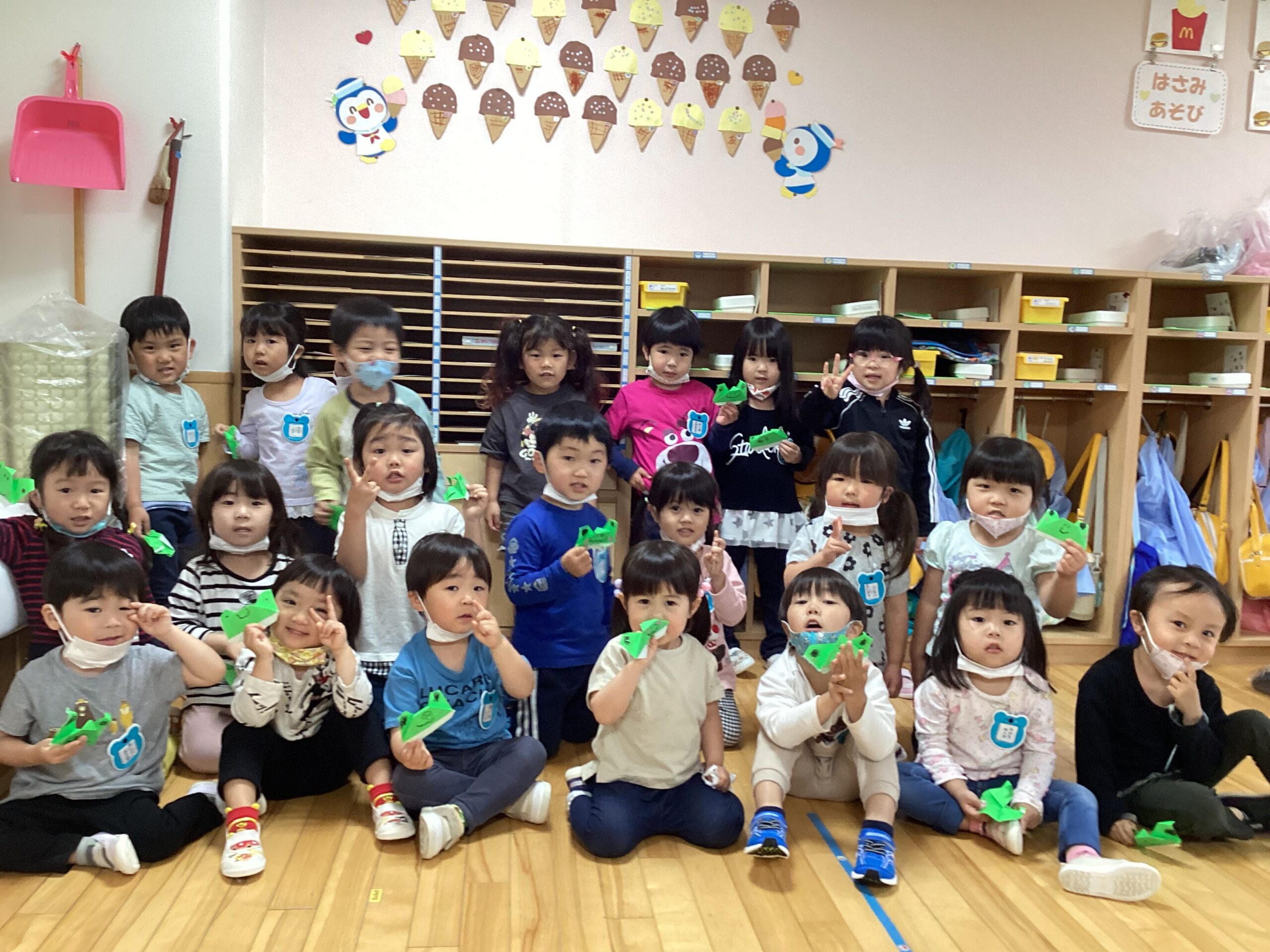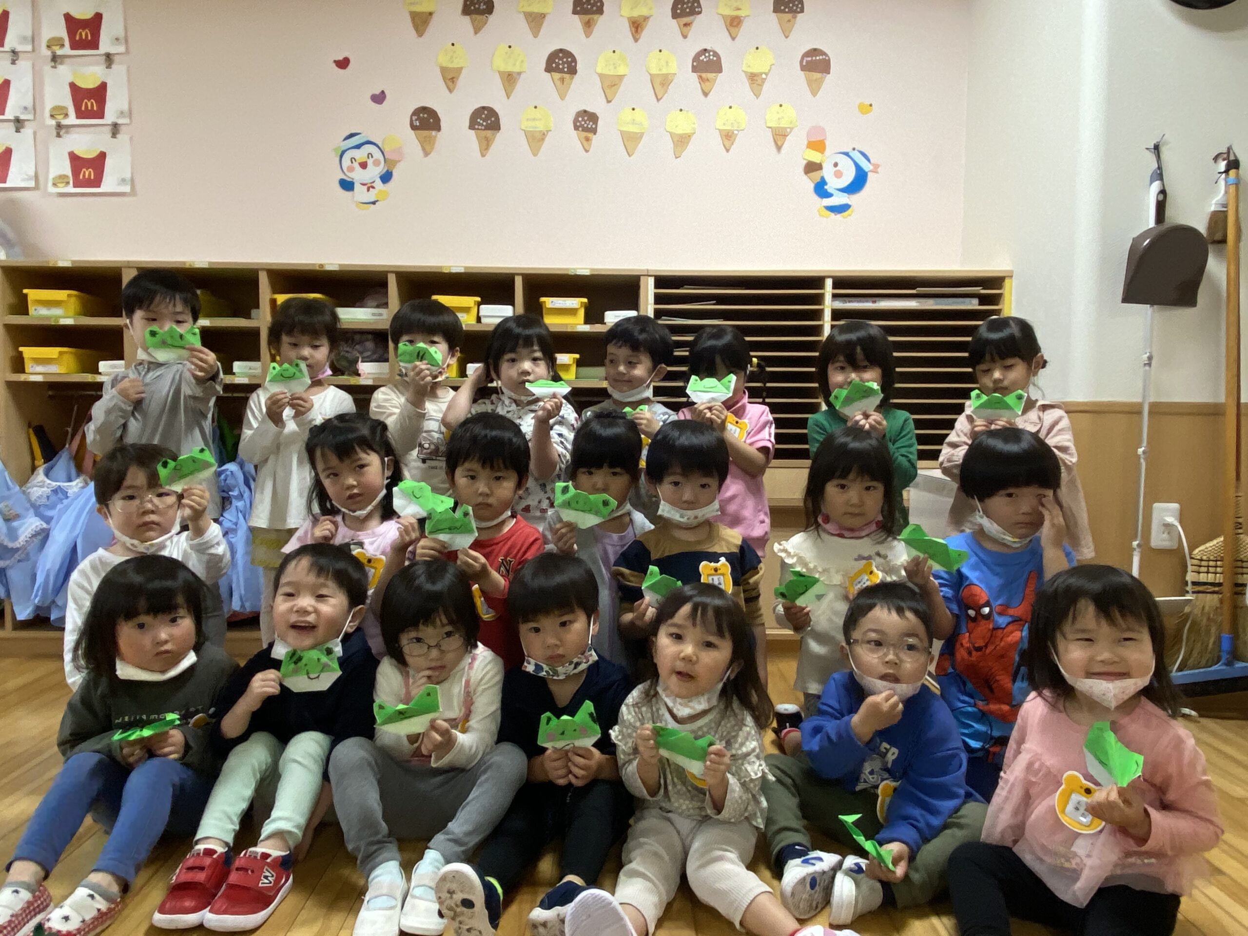 今日24日(金)は折り紙製作で、かえるを作りました。折り方が難しい部分もありましたが完成したカエルを見て満足そうにする姿が見られていました。本日持ち帰っていますので、ご覧になって下さい♪