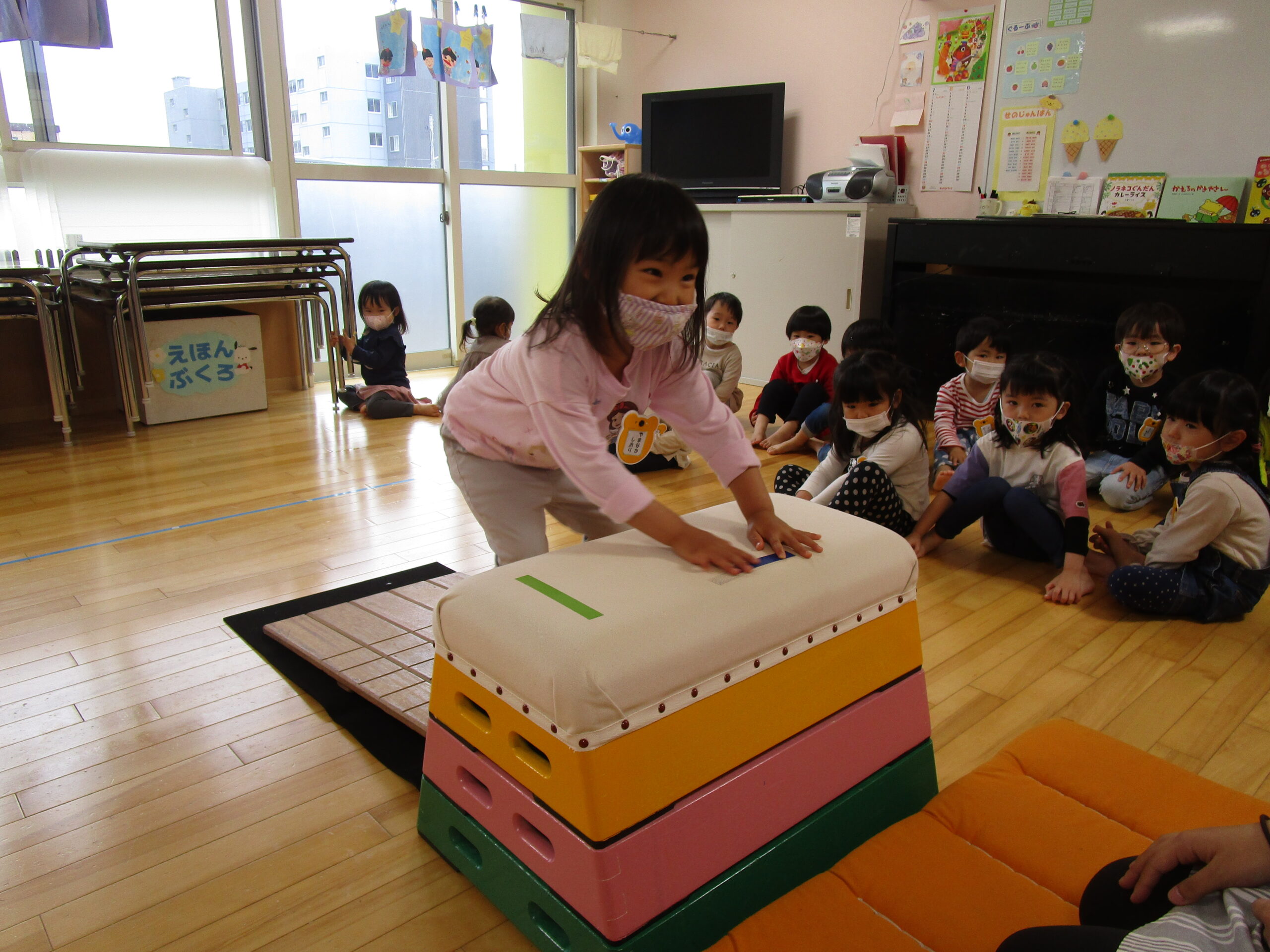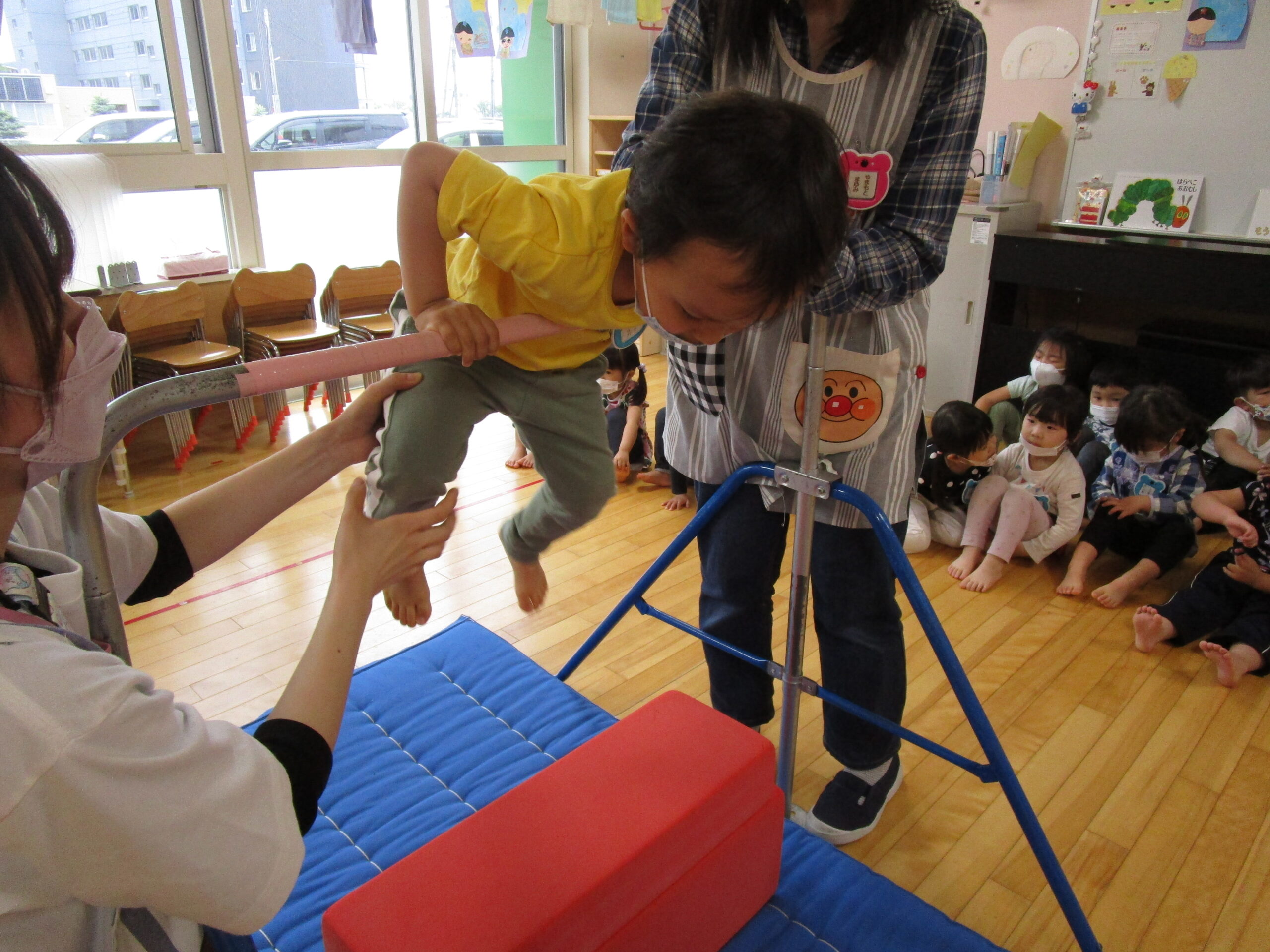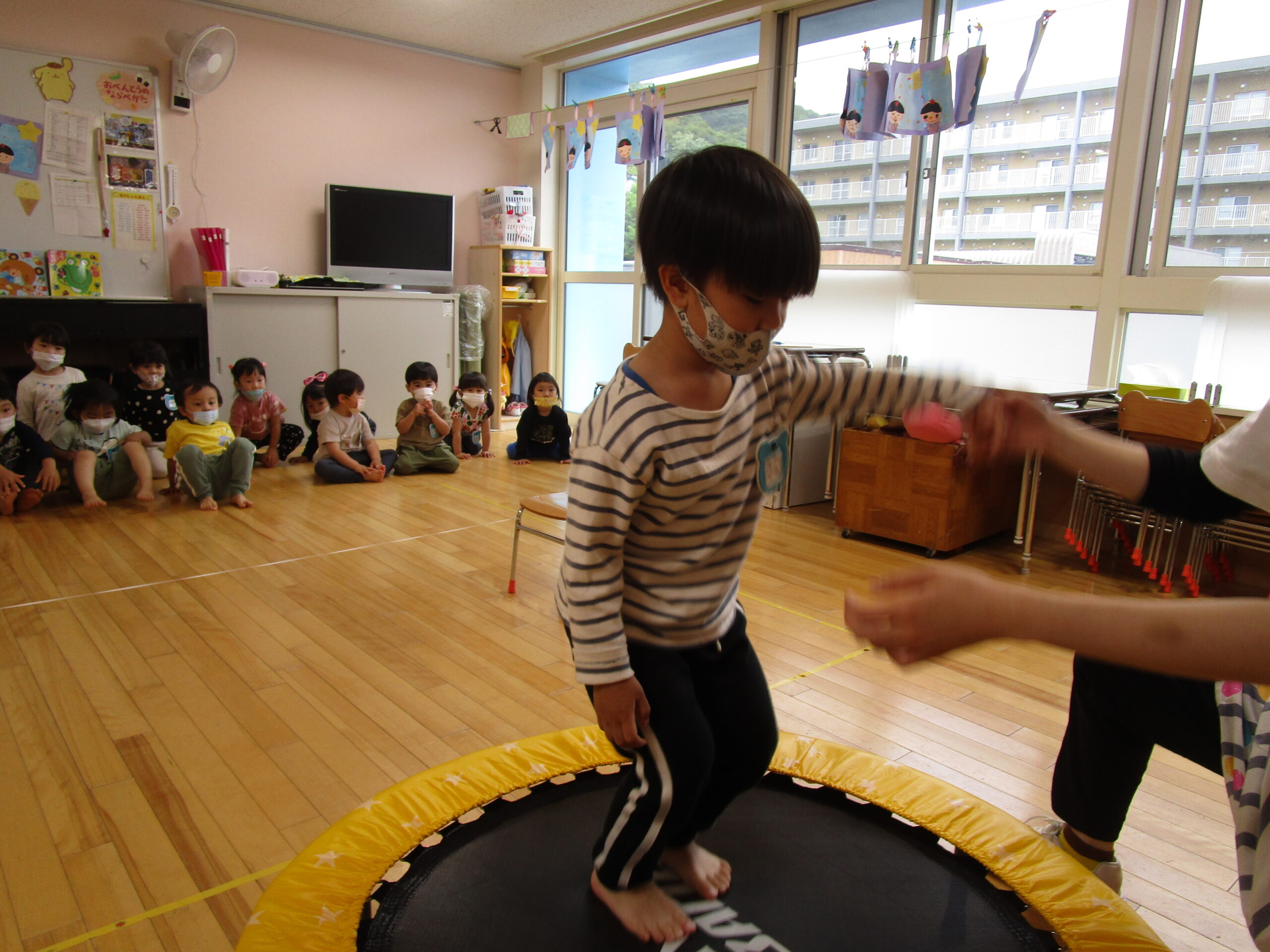年少学年は、6月23日(木)にお部屋で運動遊び、24日(金)に折り紙製作を行いました。