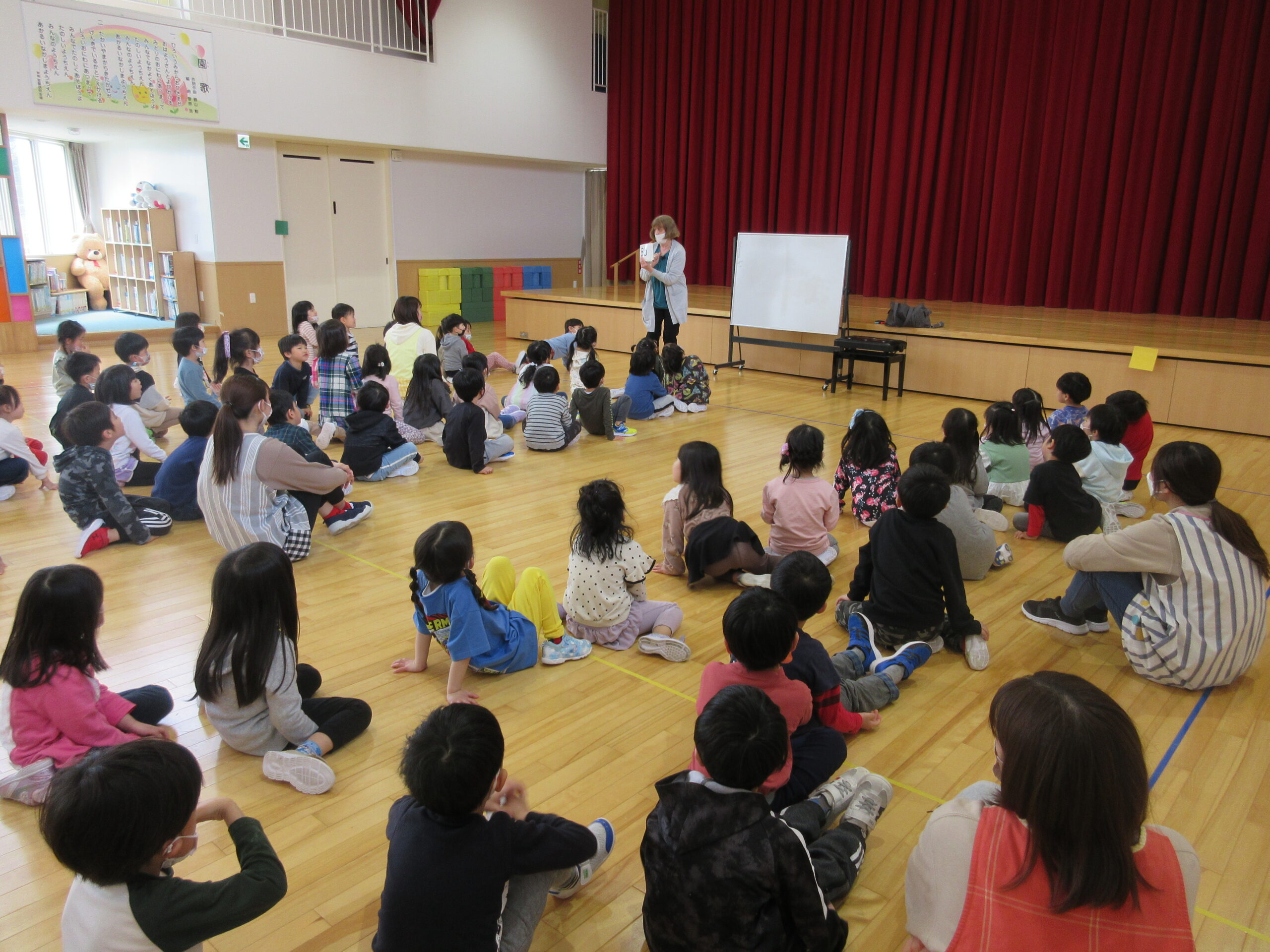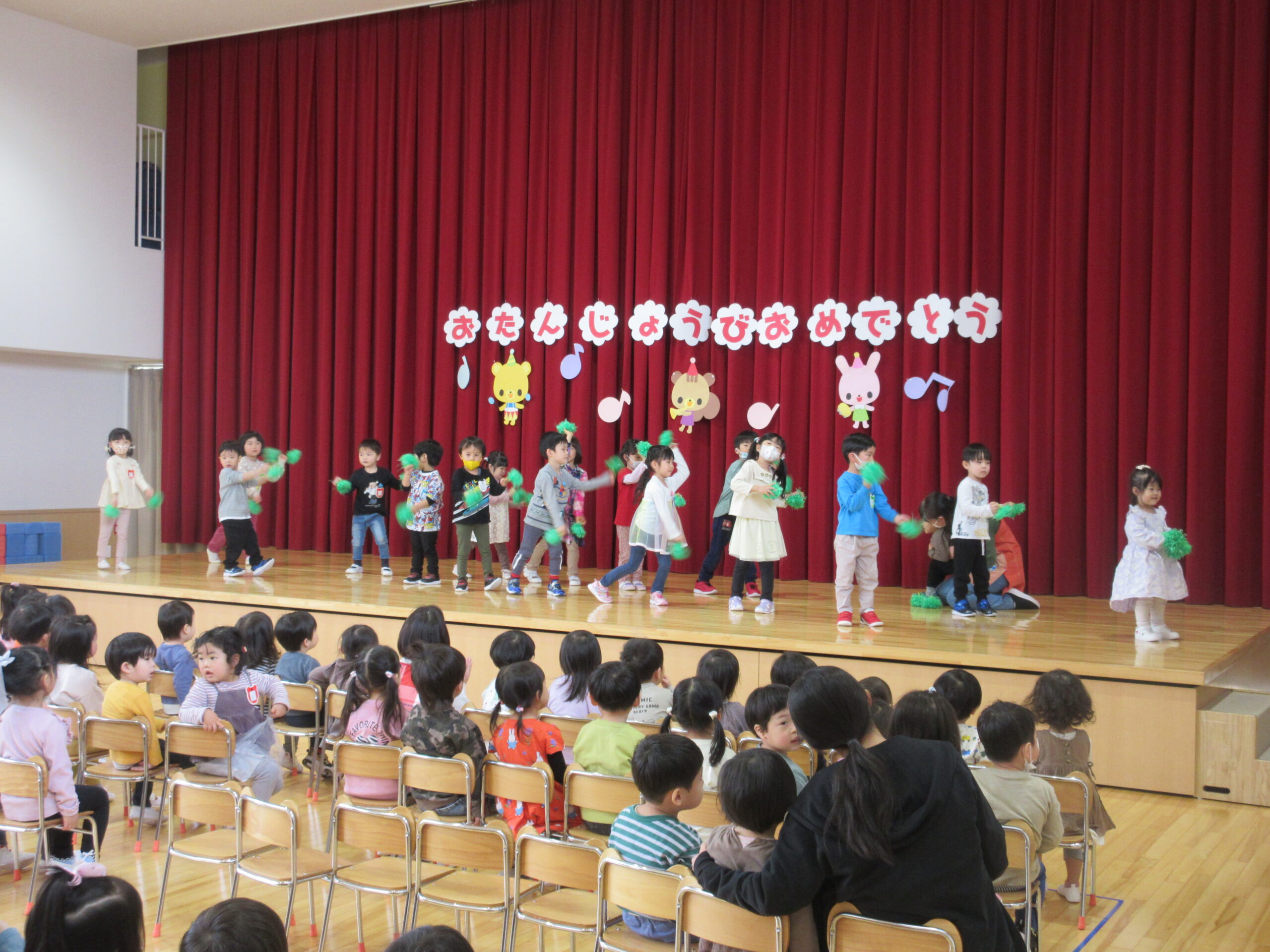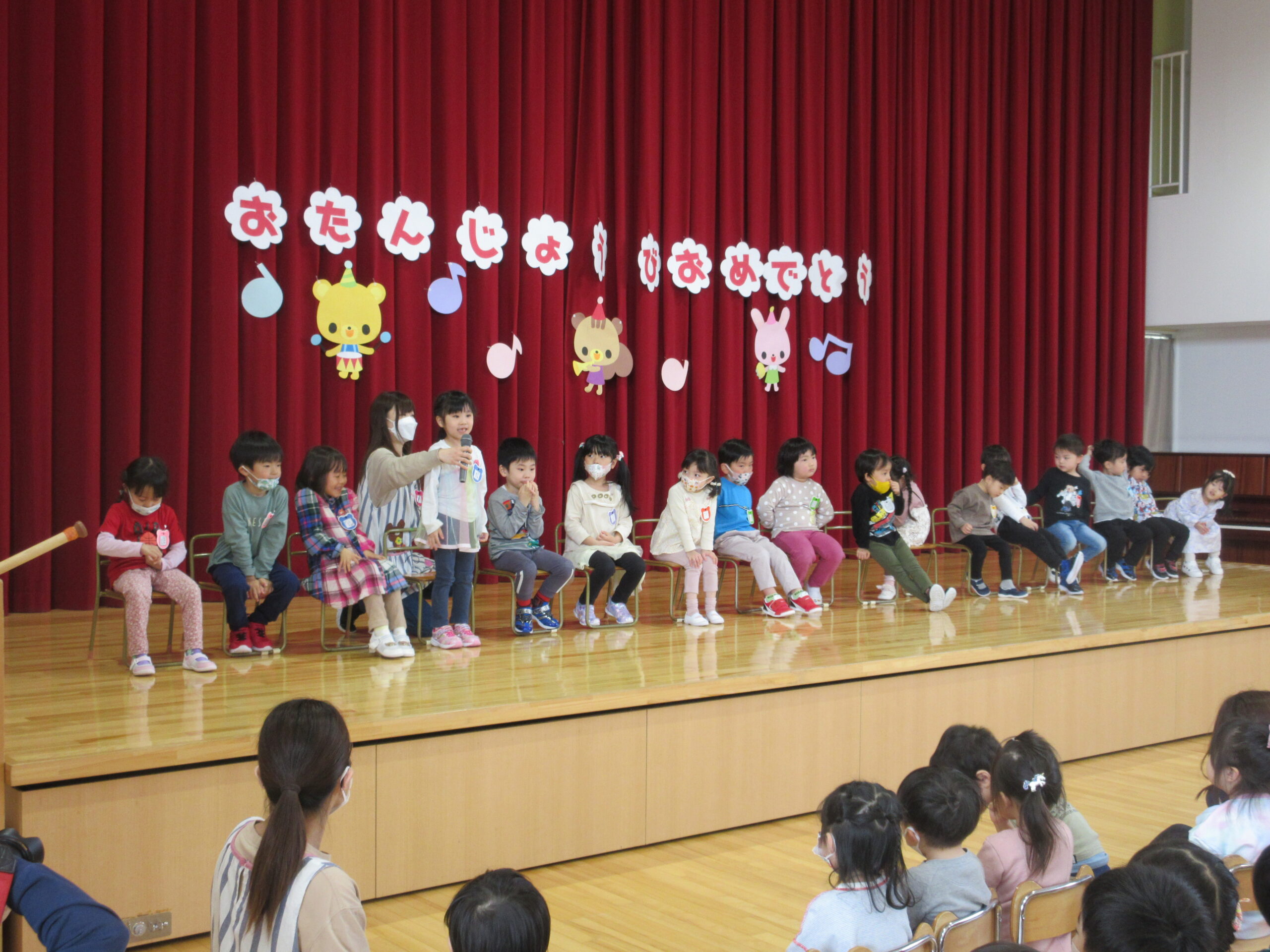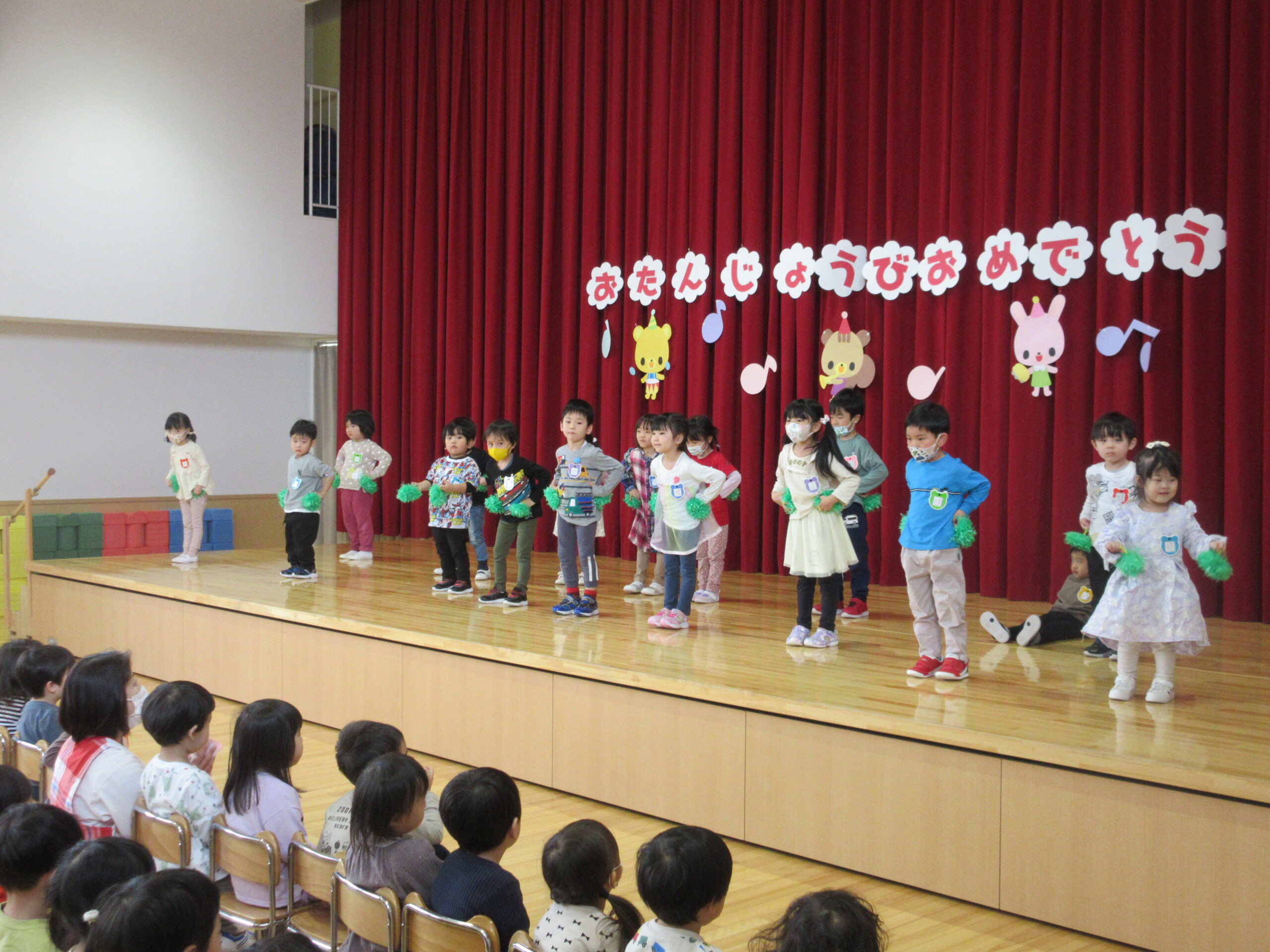今年度が始まり一番はやいお誕生会!今日4月28日(金)に行いました。今年度よりお誕生会は園歌やお祝いの歌、月の歌をうたい、コロナ前の誕生会のスタイルになりました。17名の4月生まれのお友だちは年長さんから自己紹介を行い、ポンポンを持って元気一杯の遊戯披露が出来ていました。その後、みんなで大きい画面で五味太郎さんのDVDを見て楽しみました。
