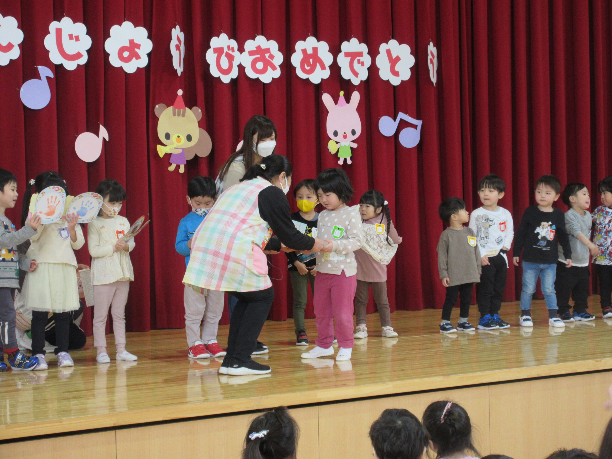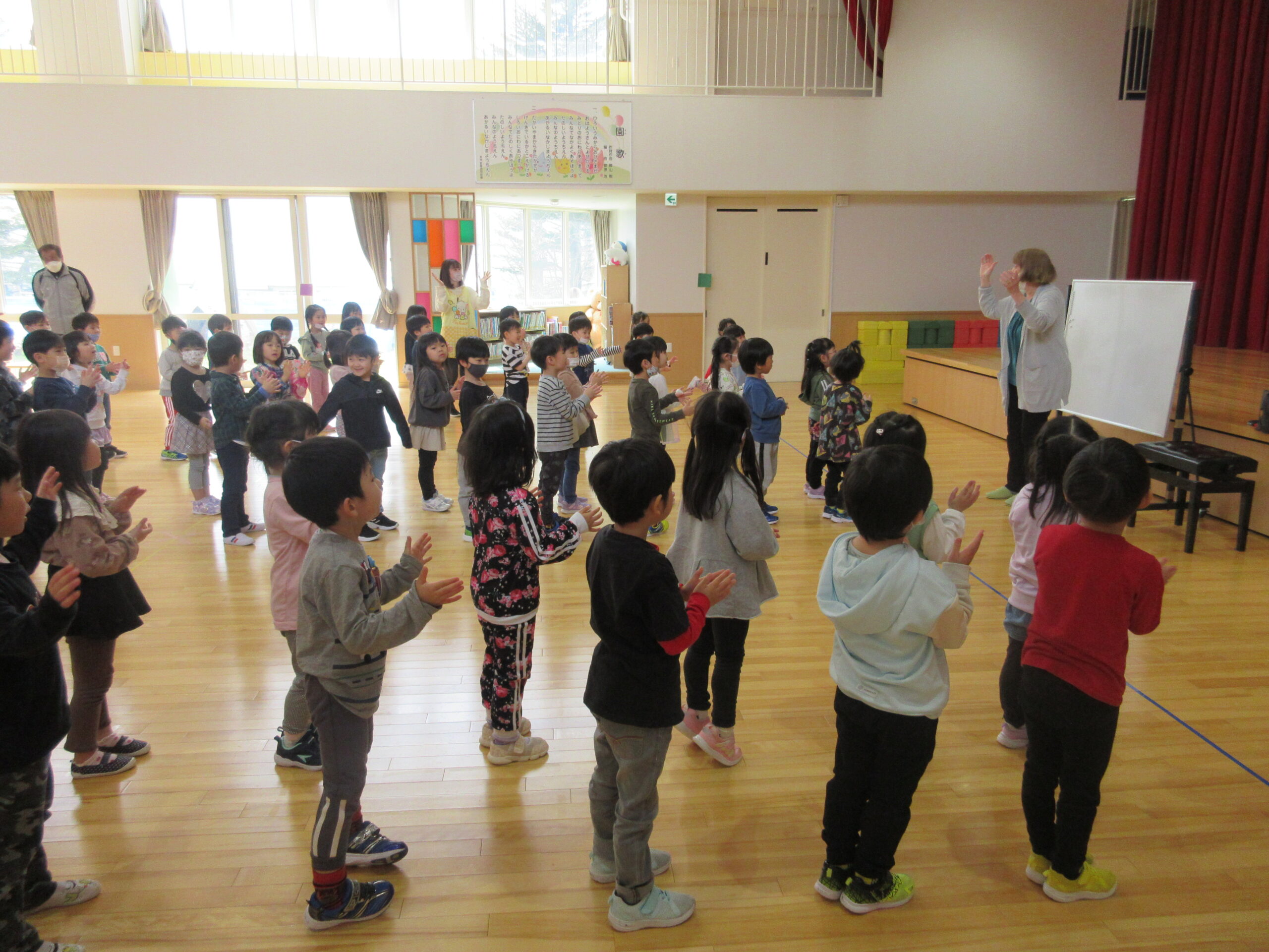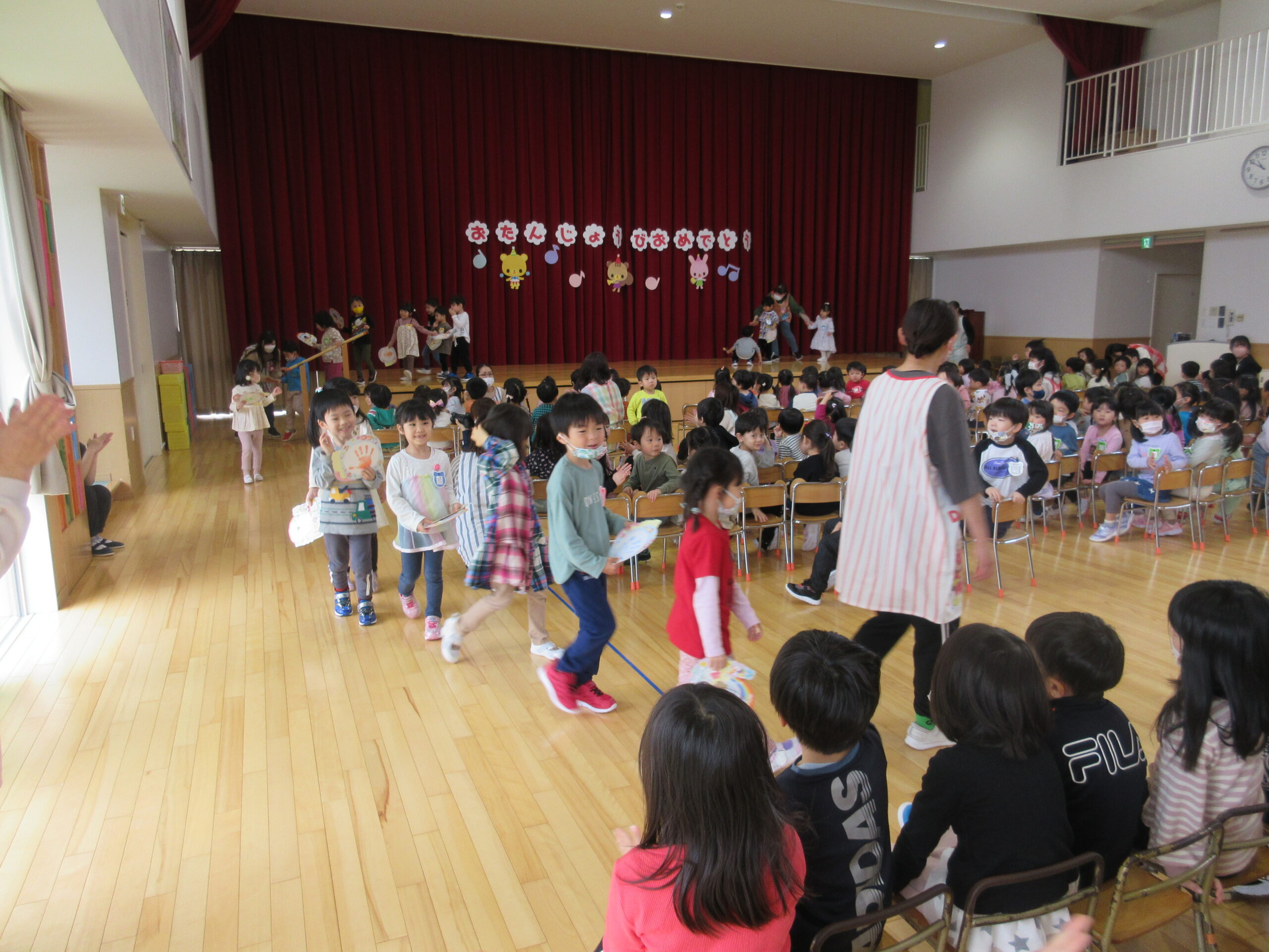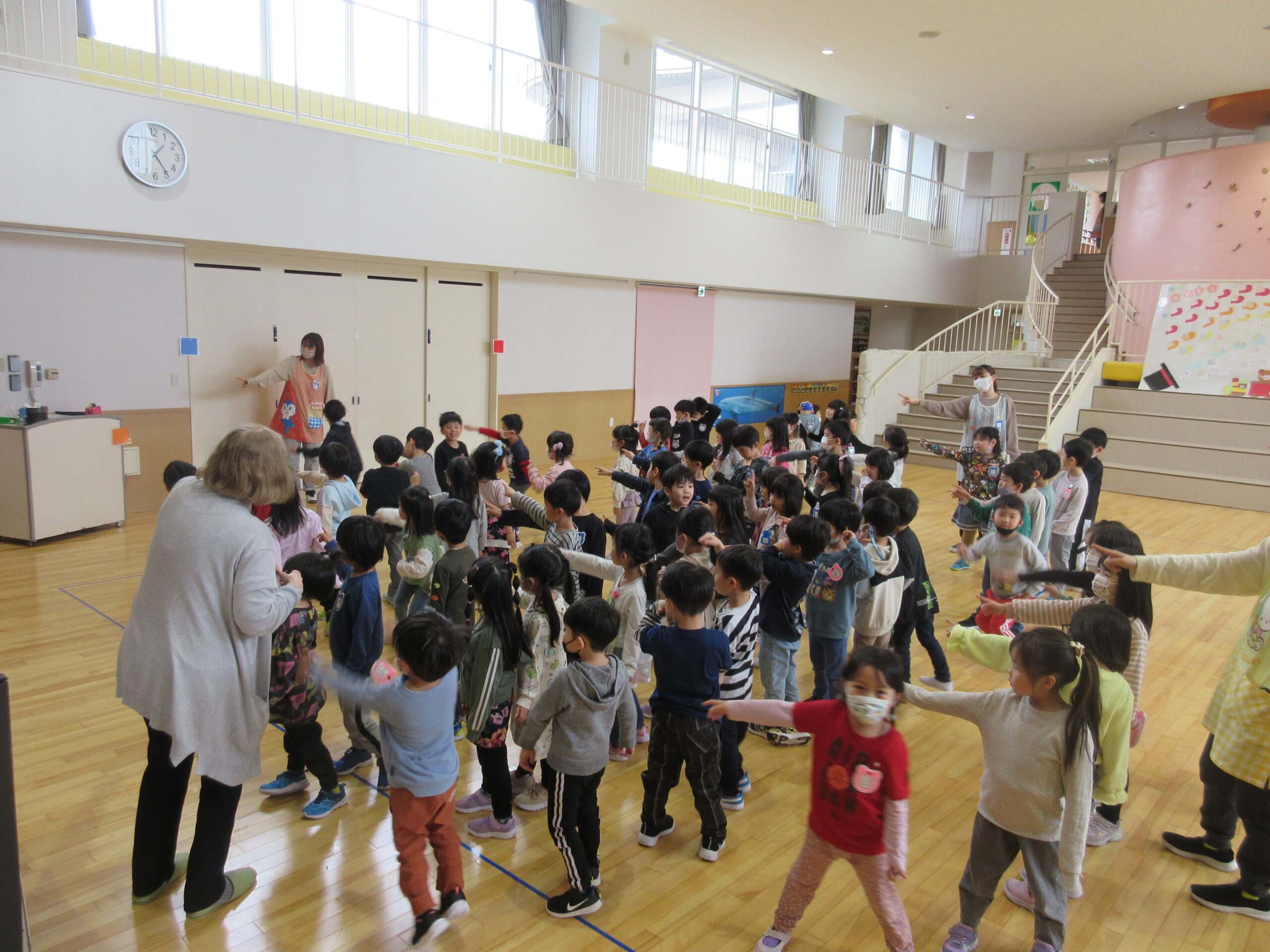 今年度が始まり一番はやいお誕生会!今日4月28日(金)に行いました。今年度よりお誕生会は園歌やお祝いの歌、月の歌をうたい、コロナ前の誕生会のスタイルになりました。17名の4月生まれのお友だちは年長さんから自己紹介を行い、ポンポンを持って元気一杯の遊戯披露が出来ていました。その後、みんなで大きい画面で五味太郎さんのDVDを見て楽しみました。