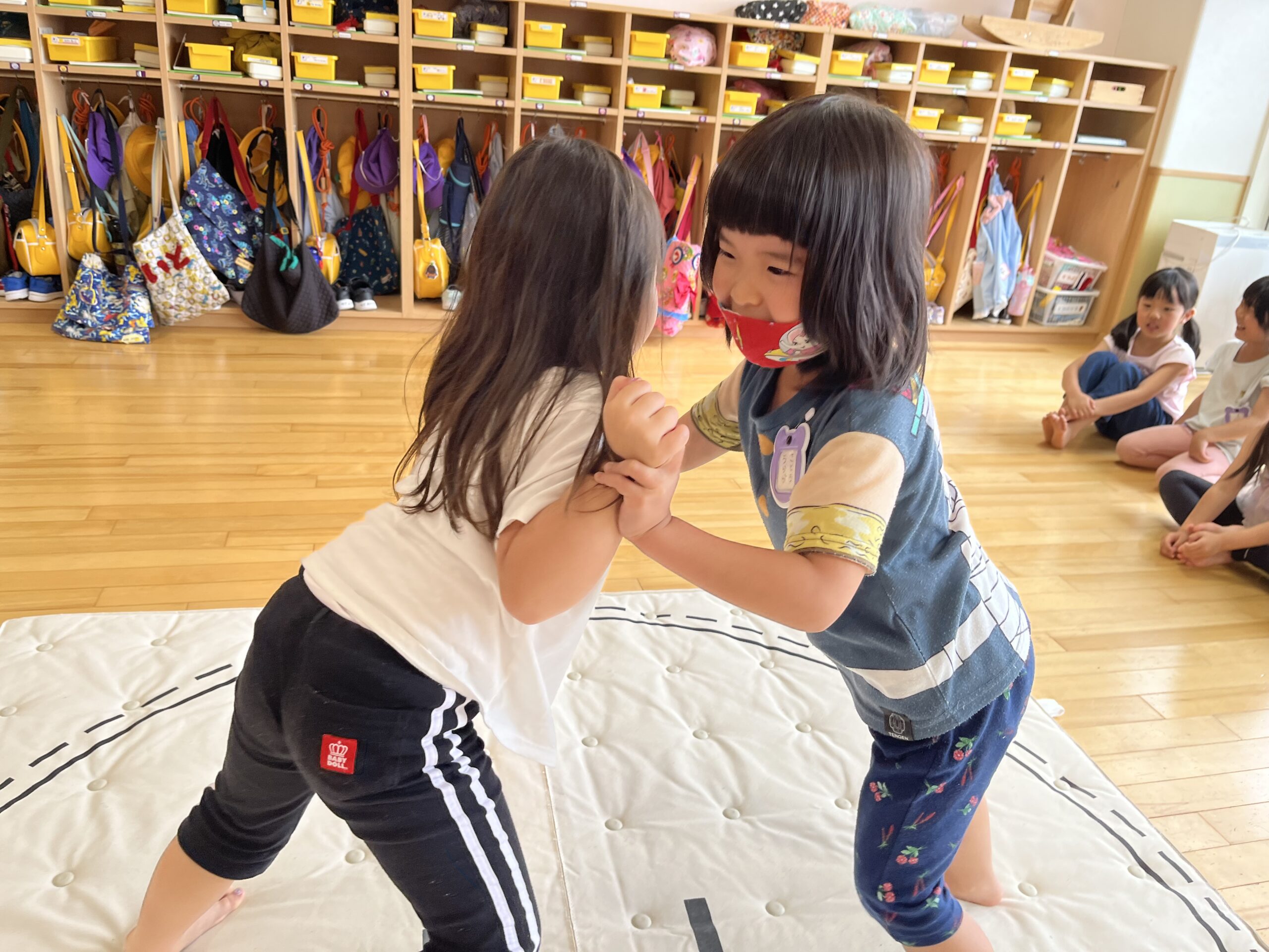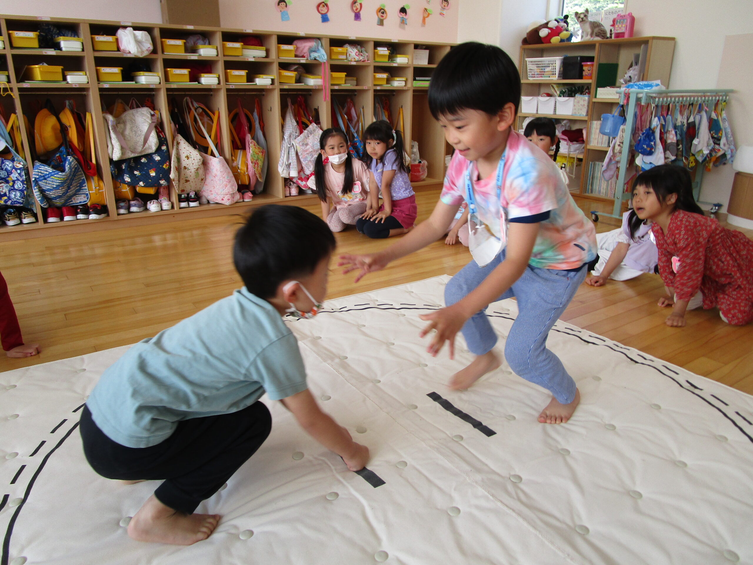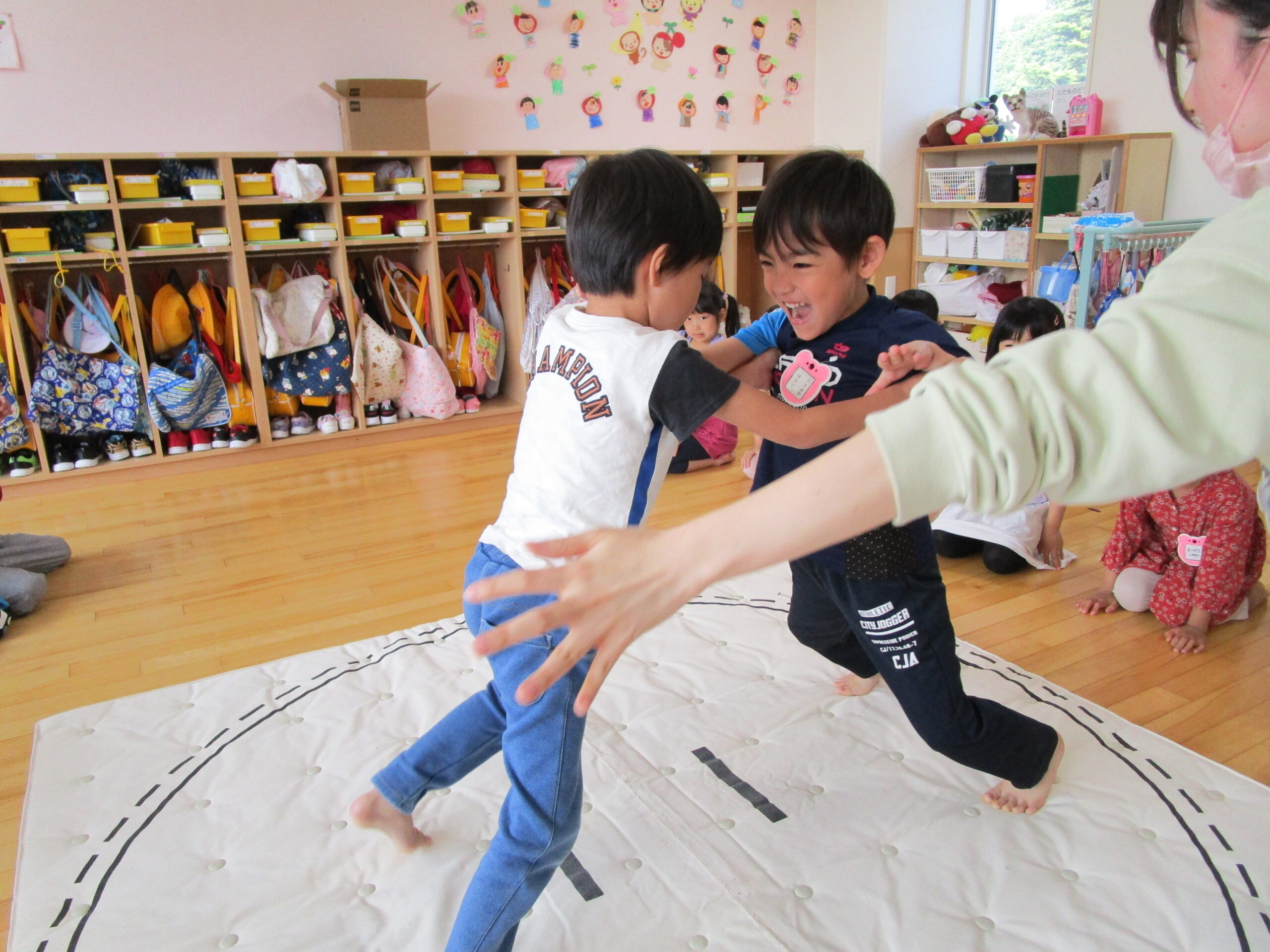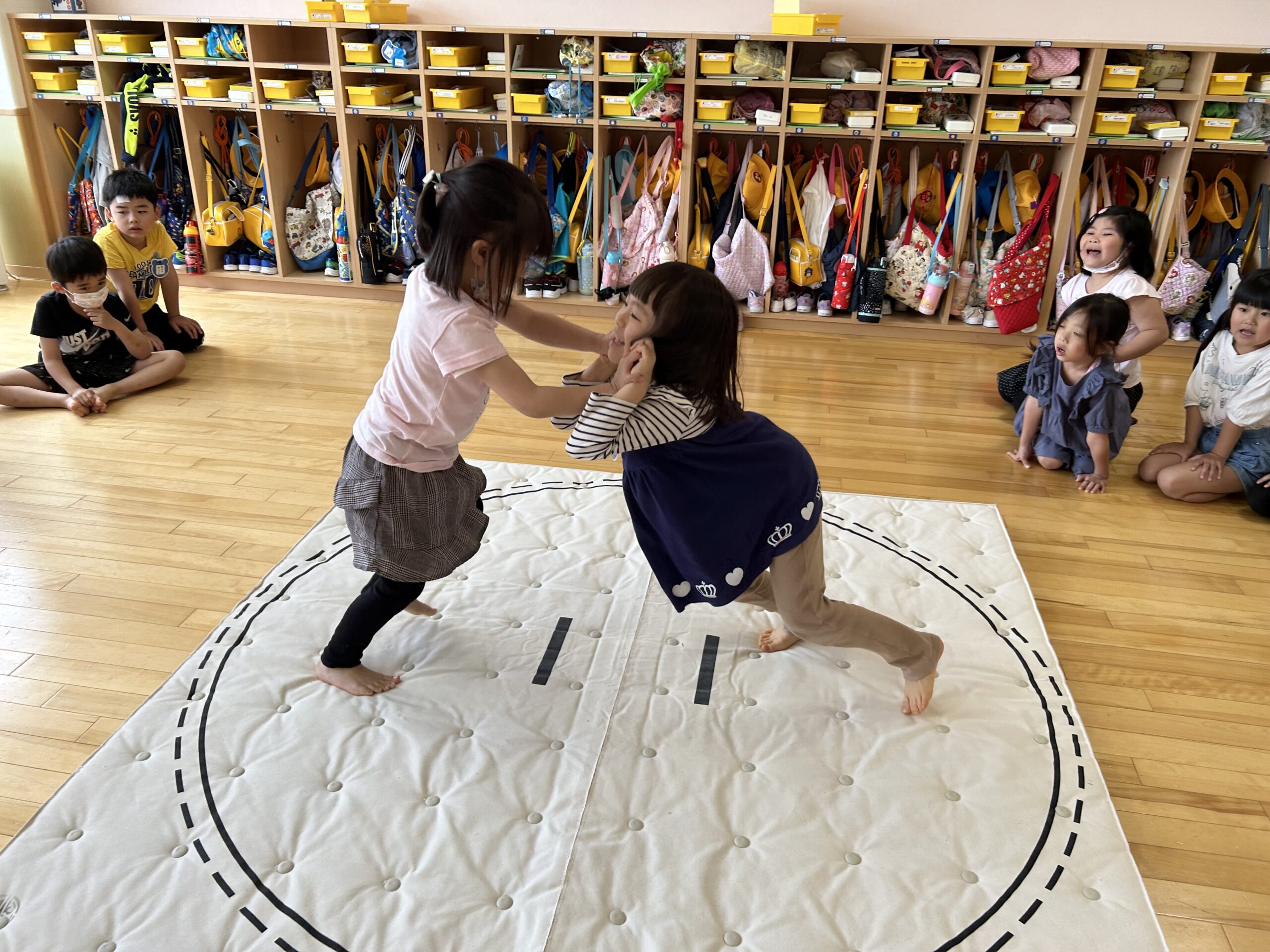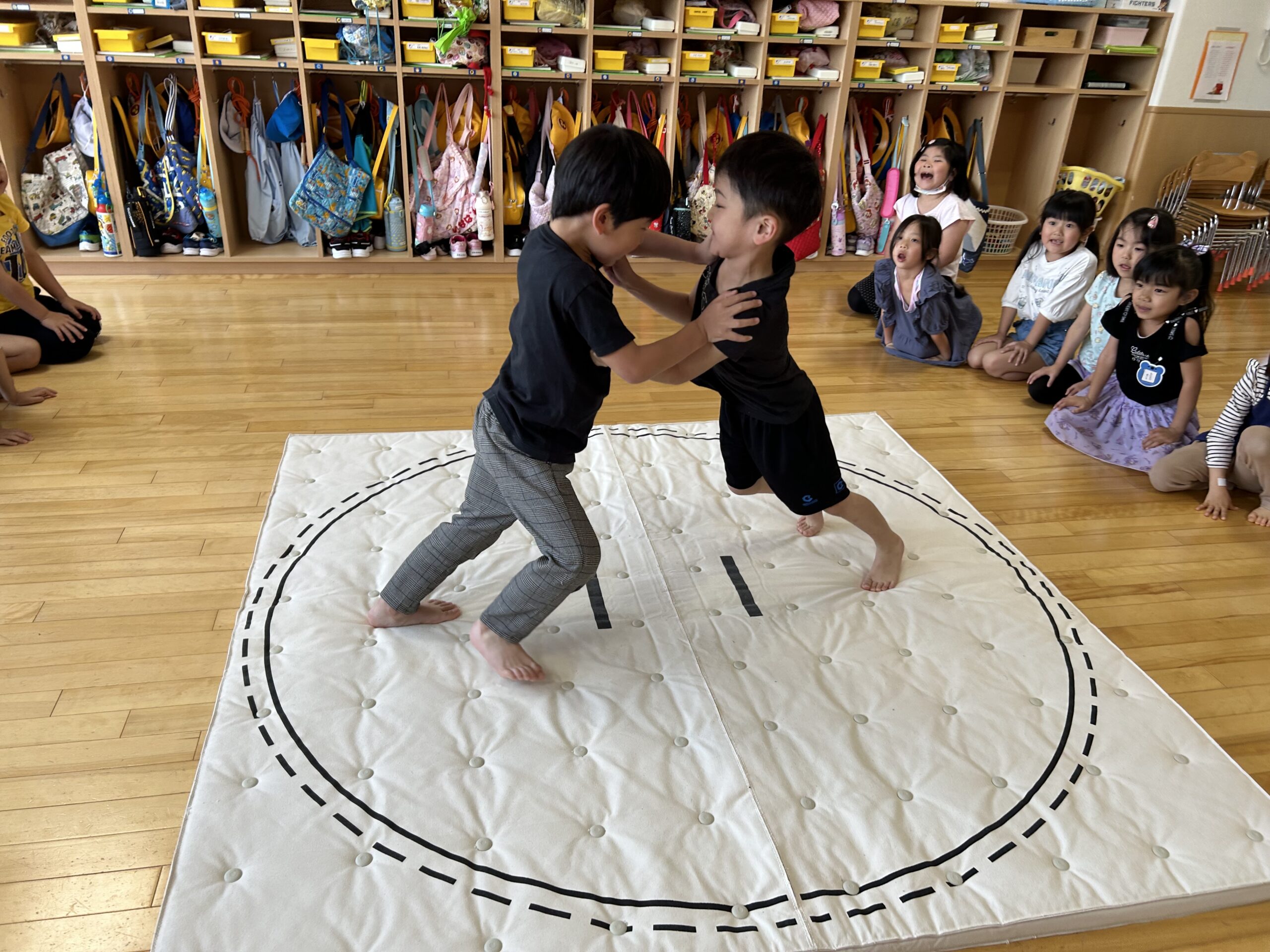 また、本日はお部屋でおすもう大会を行いました。年長さんになって初めてのおすもう大会のため、緊張しているお友達や意気込んでいるお友達がいました。負けてしまい悔し涙を流すお友達もいましたが、優しい言葉を掛けたりと励まし合う姿も多く見られていました。次回のおすもう大会に向けて、ご飯をいっぱい食べて力をつけ、良い結果を出せるように頑張ってほしいと思います。