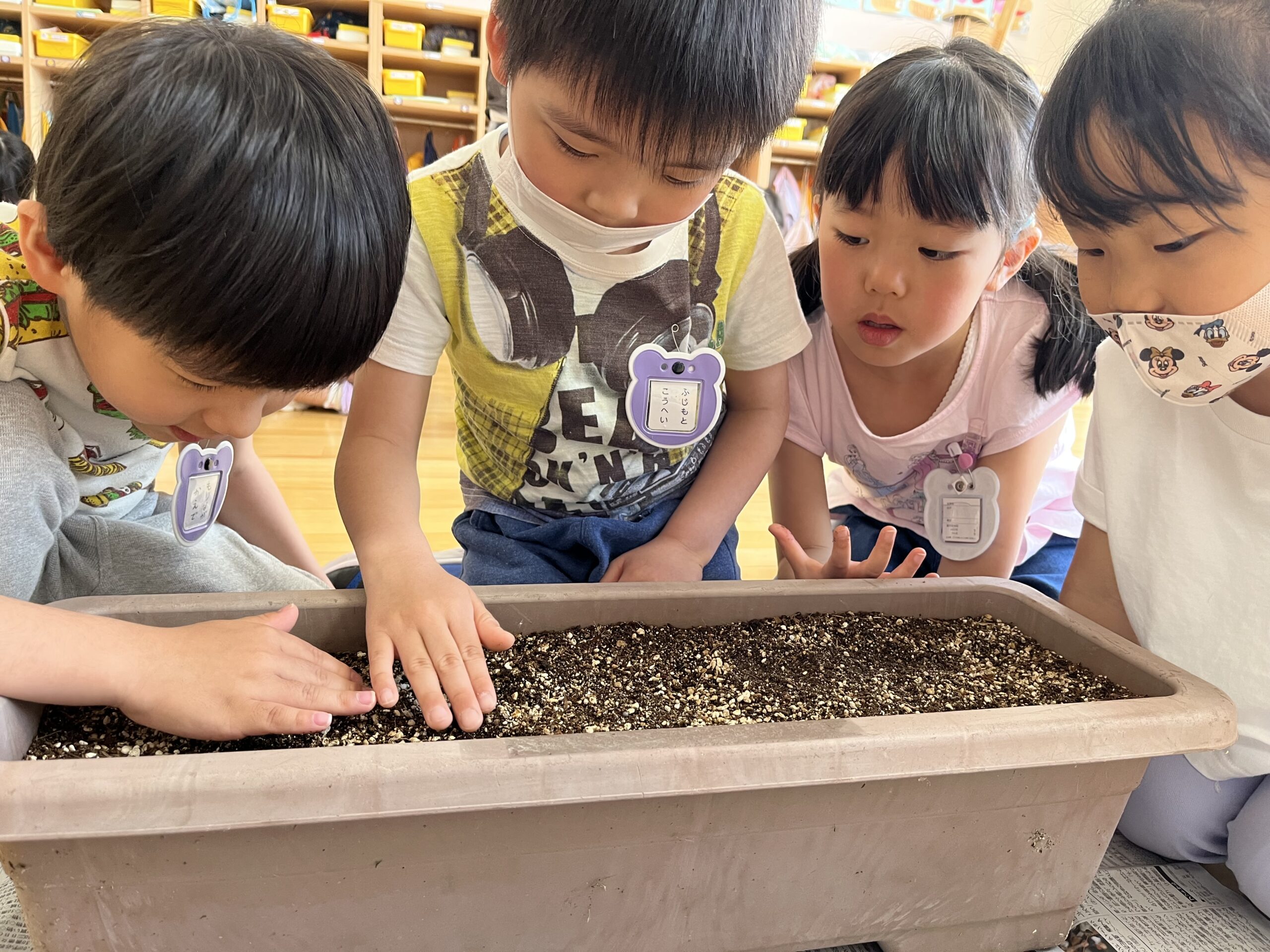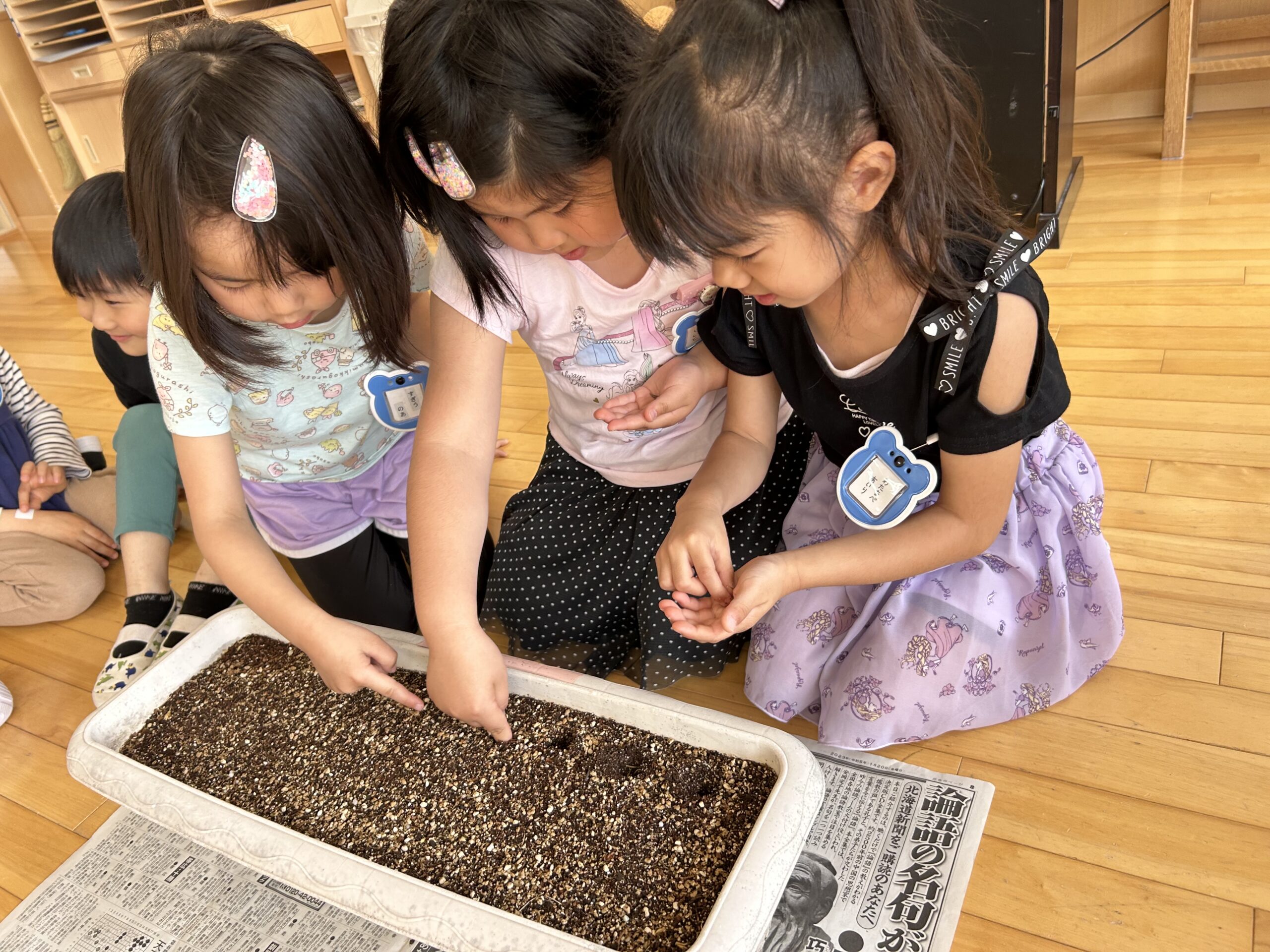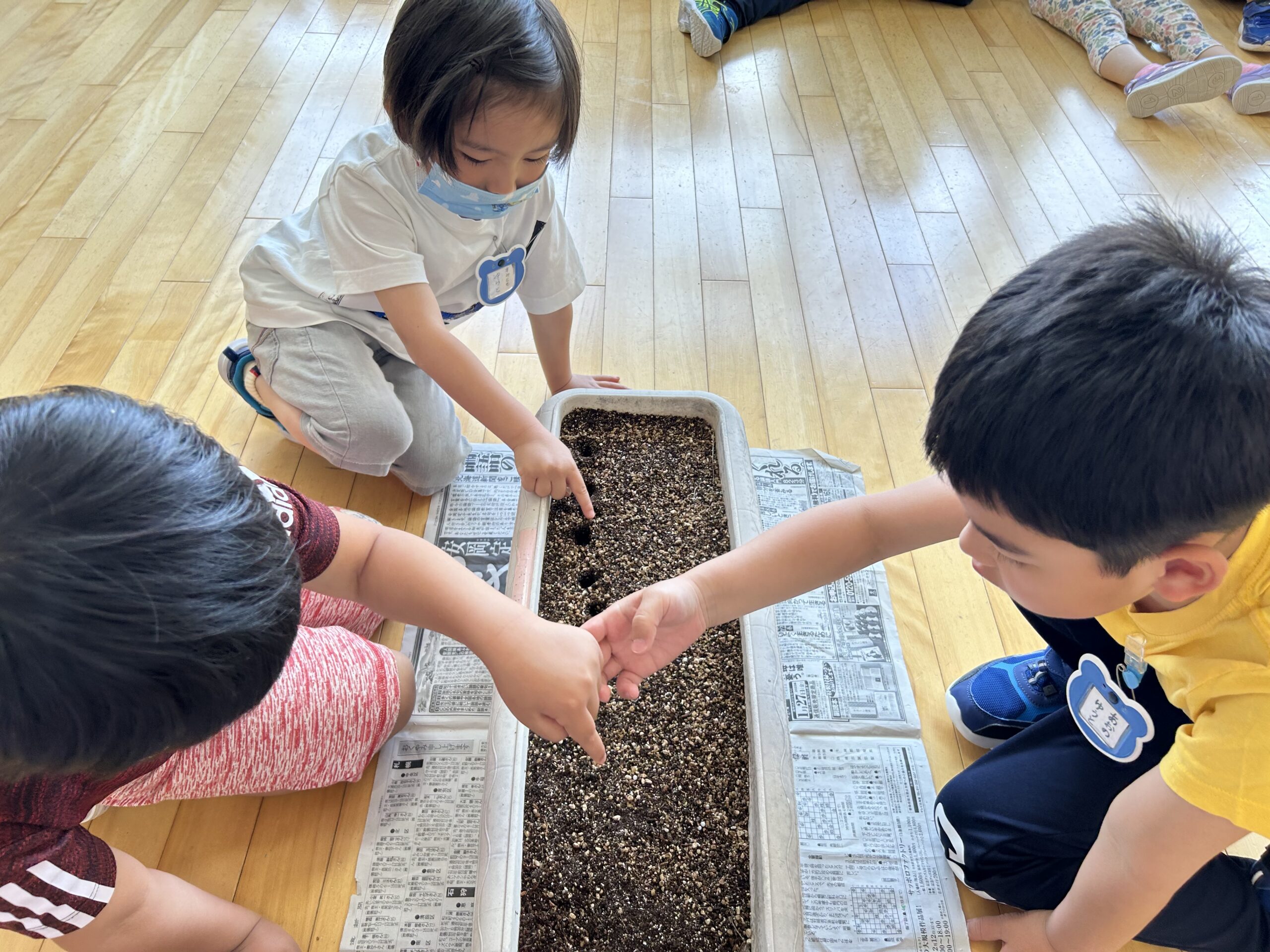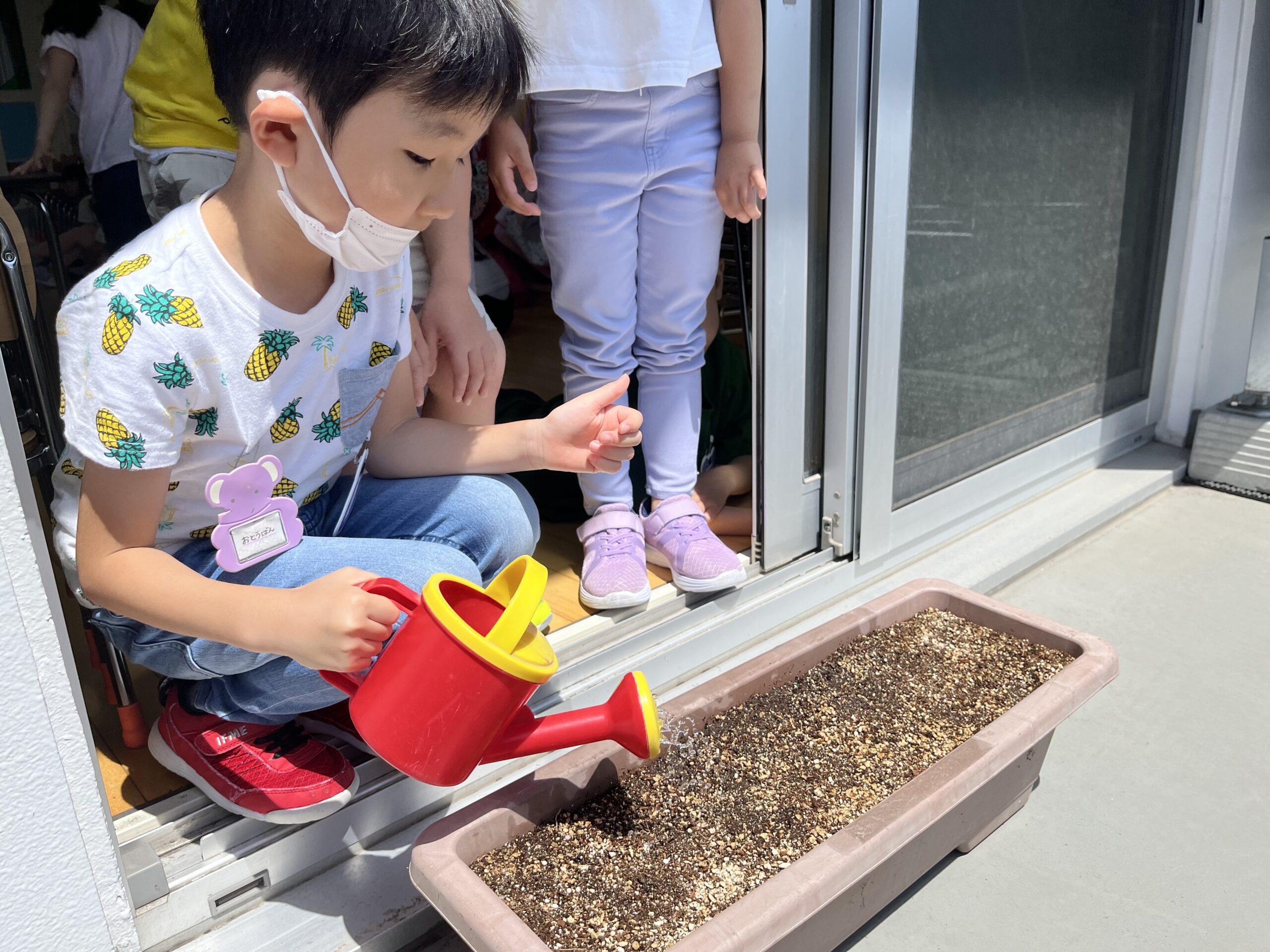 本日6月5日(月)にクラスのプランターにコスモスの種を植えました。女の子が穴を開けて種を入れ、男の子には優しく土をかけてもらいました。植えた後にクラスのみんなで「大きくな~れ」のおまじないをかけました。「何色のお花が咲くのかな」「早くきれいなお花が咲いてほしいな」などの声が上がり、ワクワクしている様子が見られました。お当番さんにお水をあげてもらい、成長を見守っていきたいと思います!
