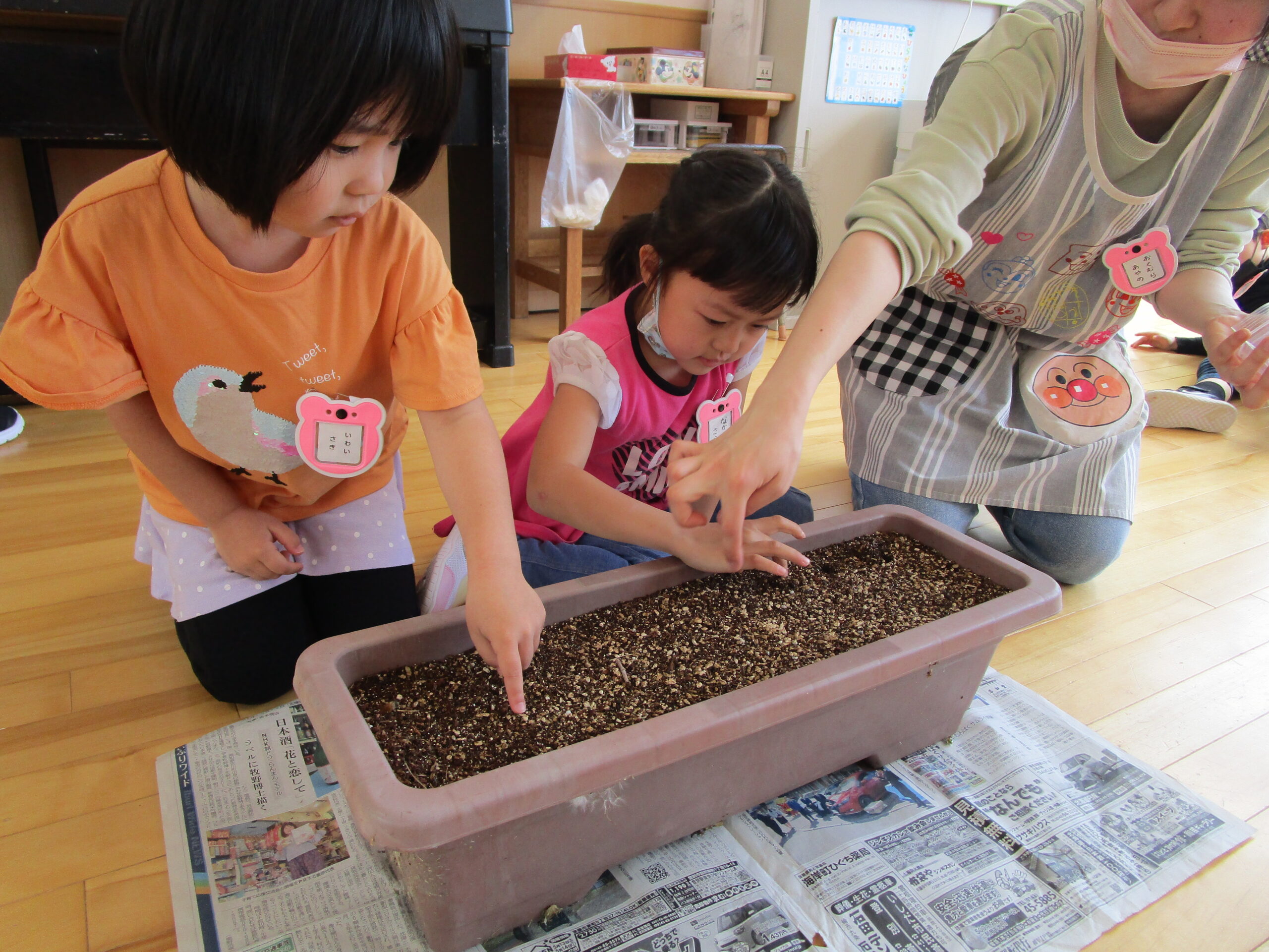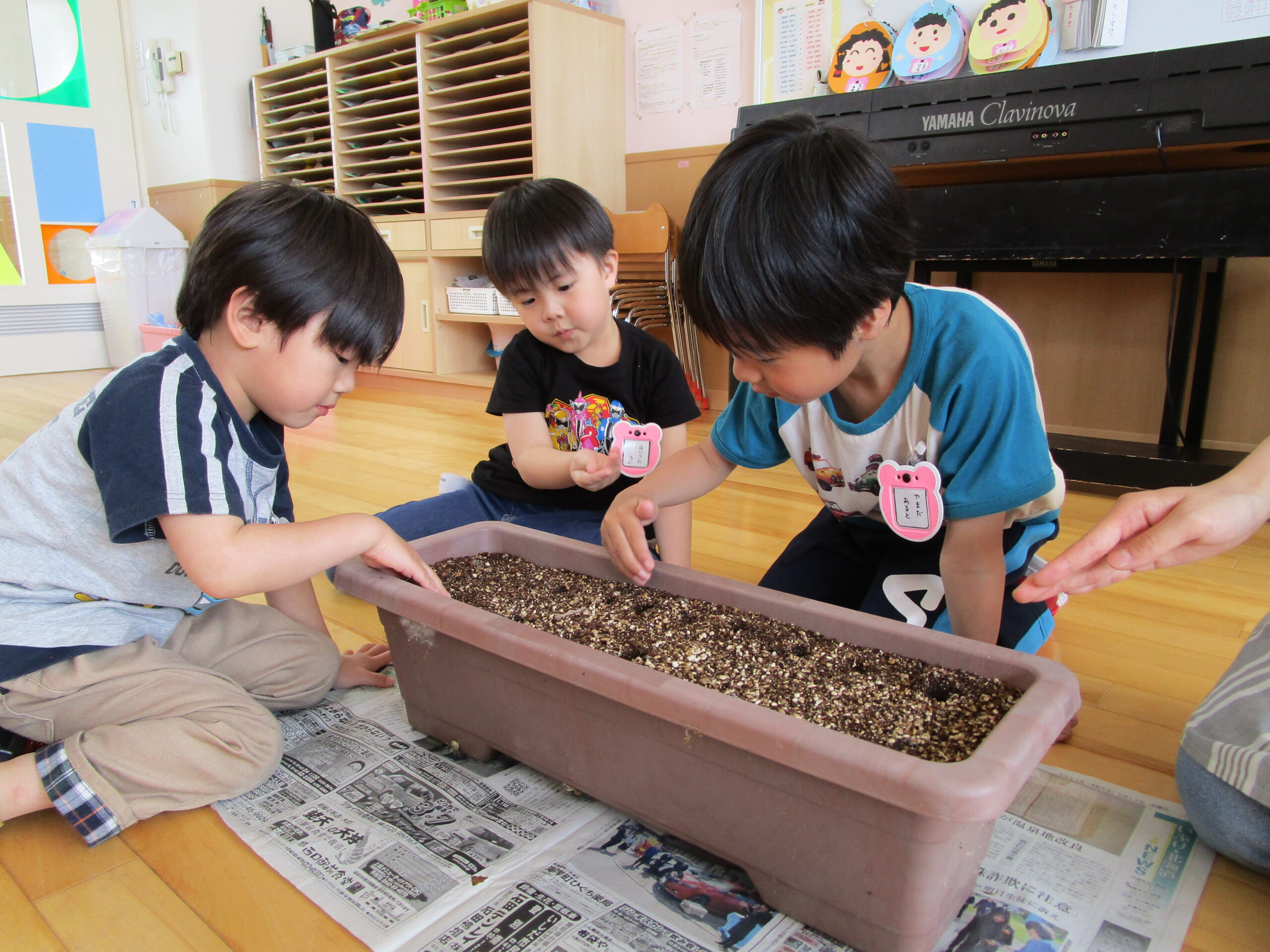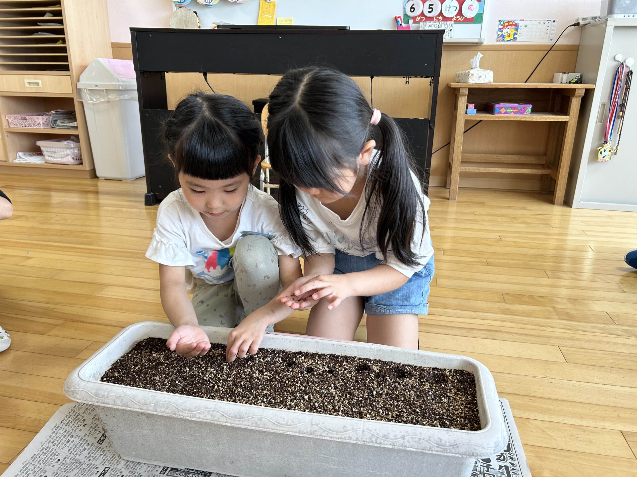 本日6月5日(月)にクラスのプランターにコスモスの種を植えました。女の子が穴を開けて種を入れ、男の子には優しく土をかけてもらいました。植えた後にクラスのみんなで「大きくな~れ」のおまじないをかけました。「何色のお花が咲くのかな」「早くきれいなお花が咲いてほしいな」などの声が上がり、ワクワクしている様子が見られました。お当番さんにお水をあげてもらい、成長を見守っていきたいと思います!