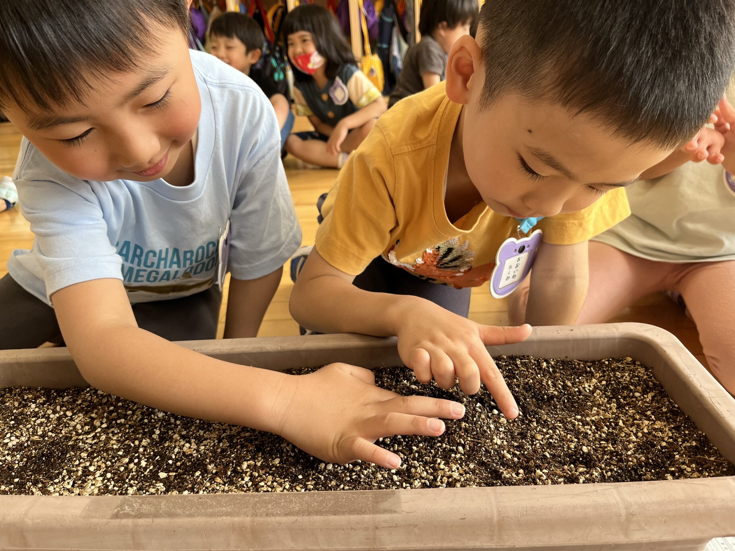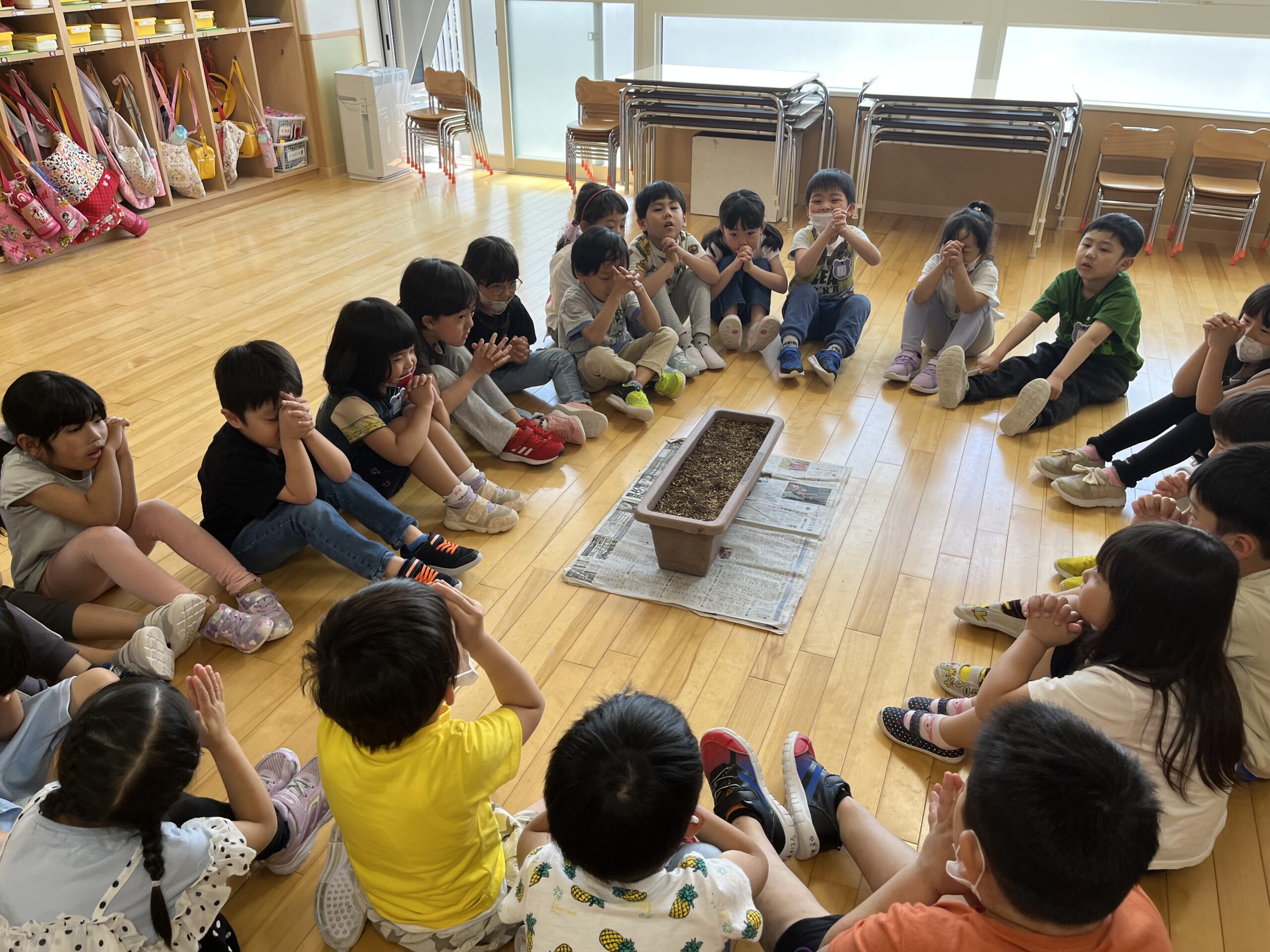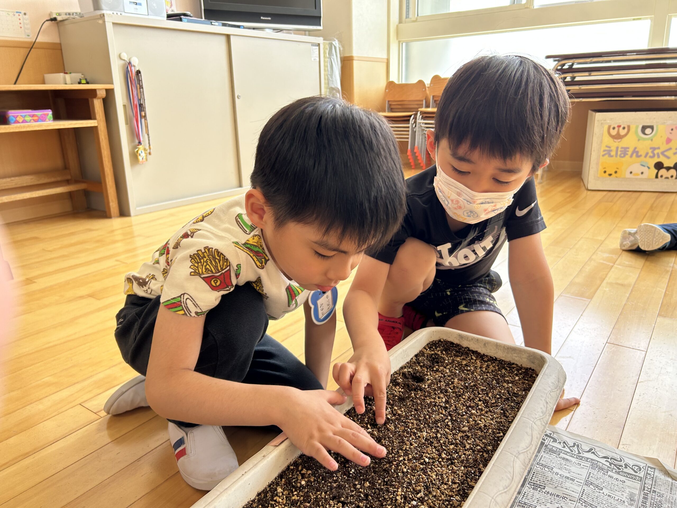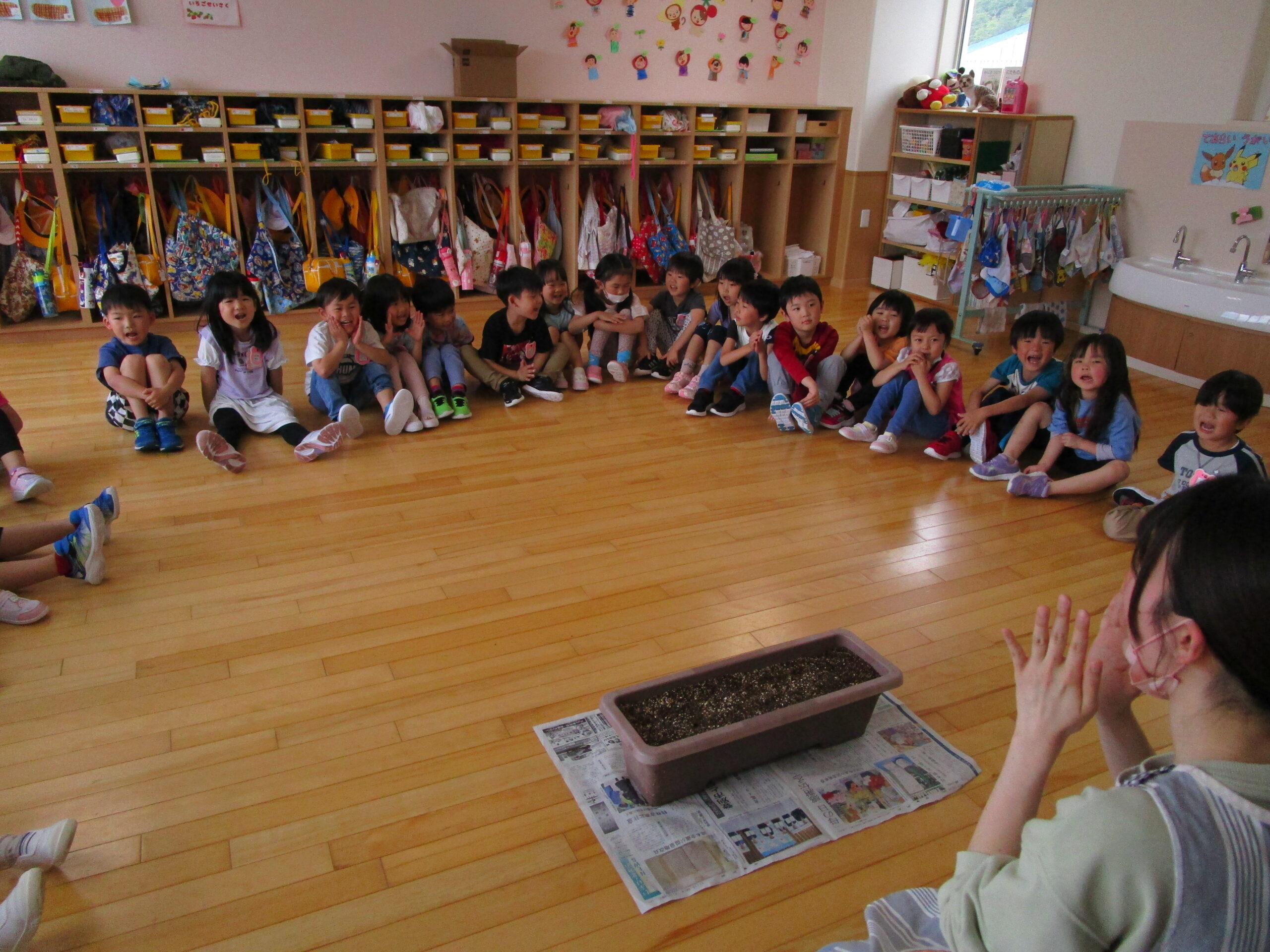 本日6月5日(月)にクラスのプランターにコスモスの種を植えました。女の子が穴を開けて種を入れ、男の子には優しく土をかけてもらいました。植えた後にクラスのみんなで「大きくな~れ」のおまじないをかけました。「何色のお花が咲くのかな」「早くきれいなお花が咲いてほしいな」などの声が上がり、ワクワクしている様子が見られました。お当番さんにお水をあげてもらい、成長を見守っていきたいと思います!