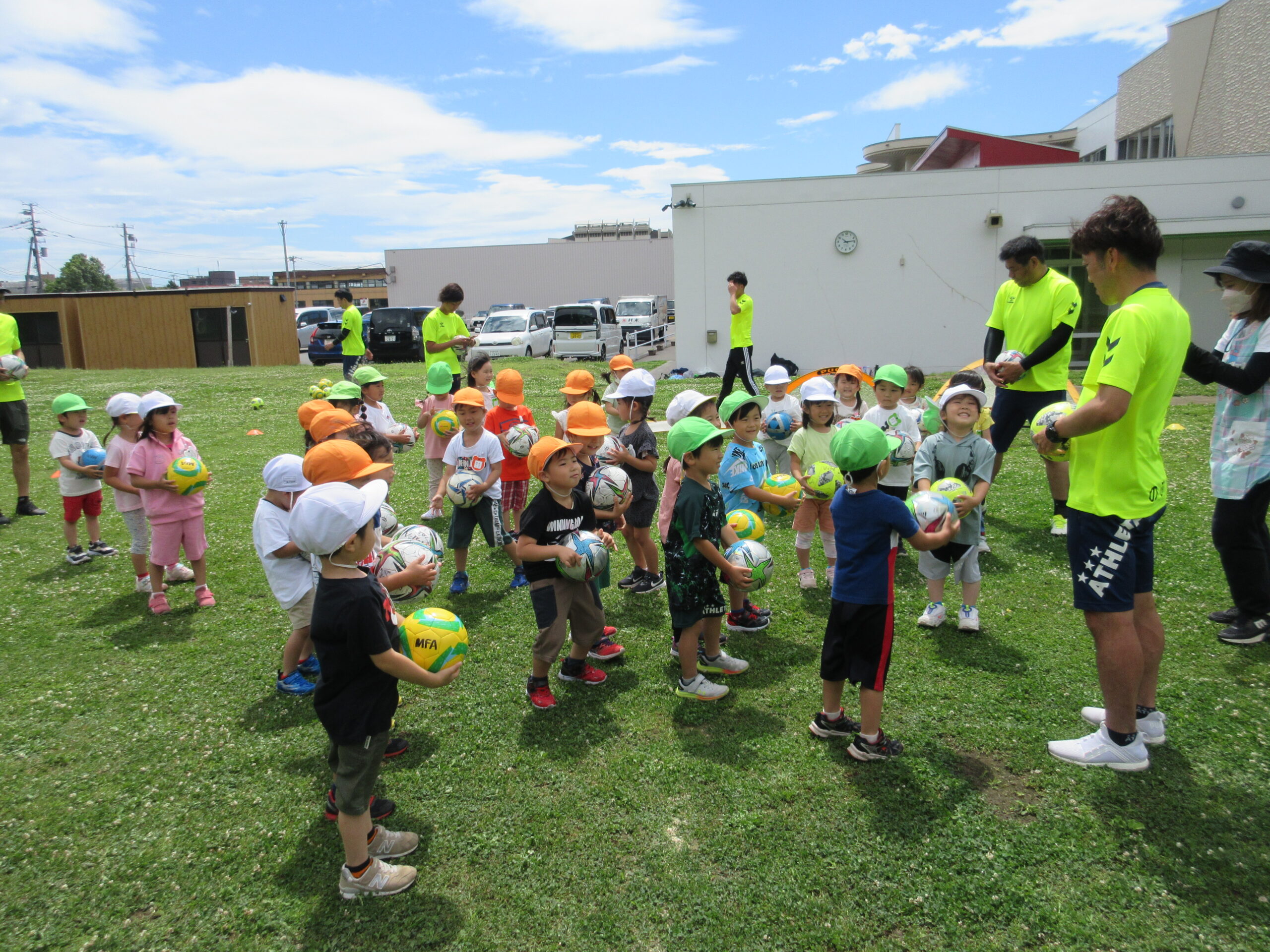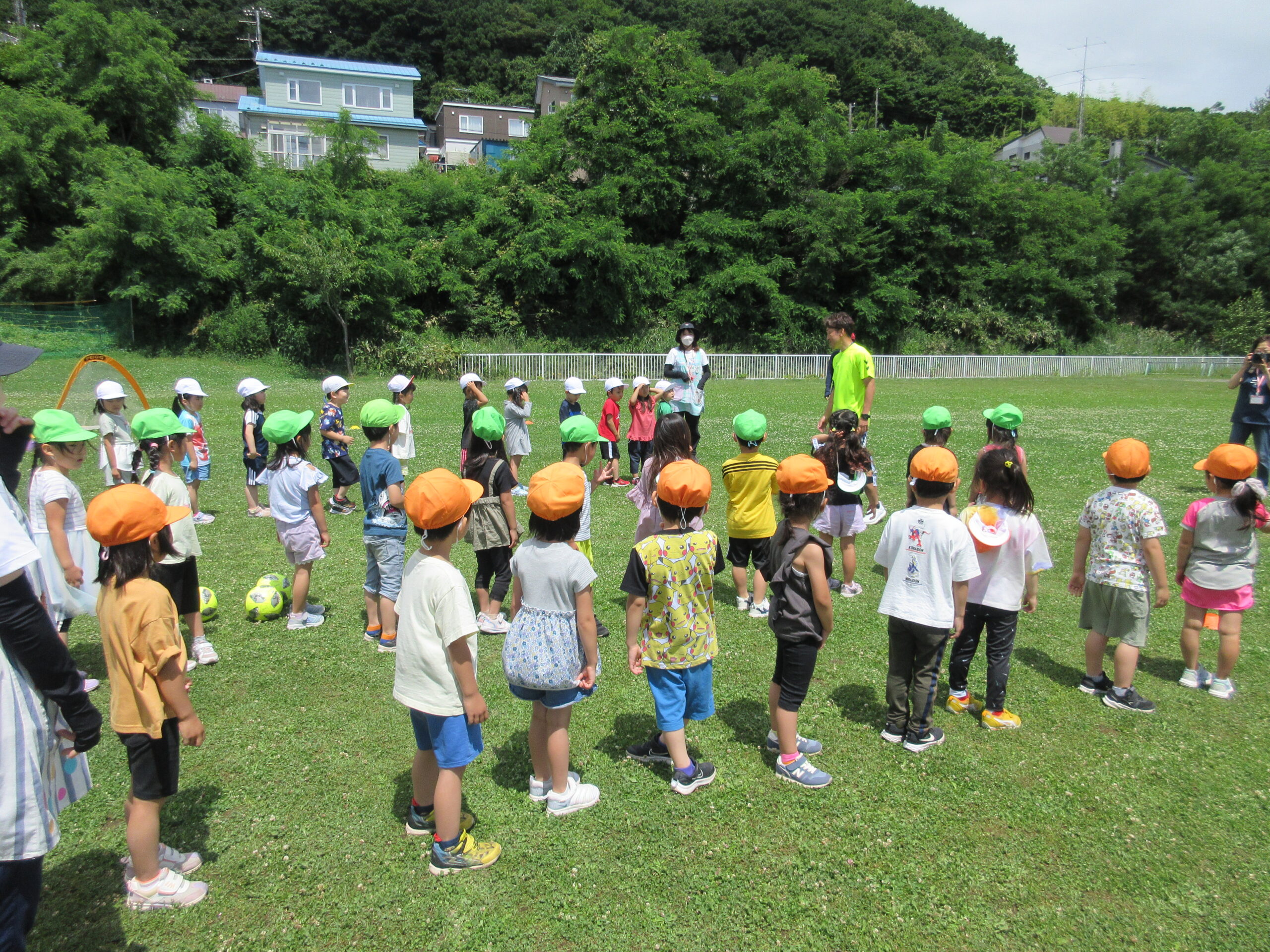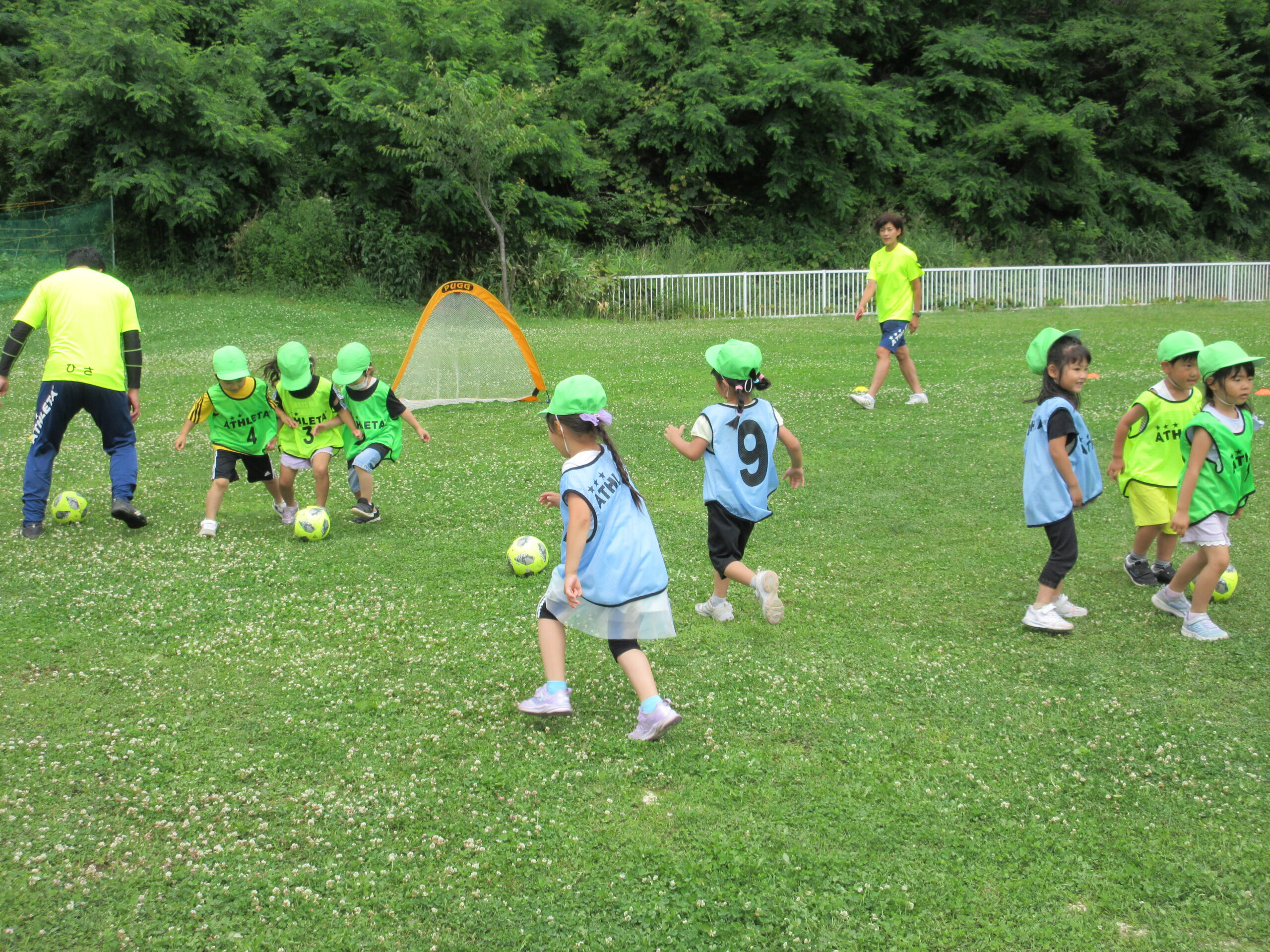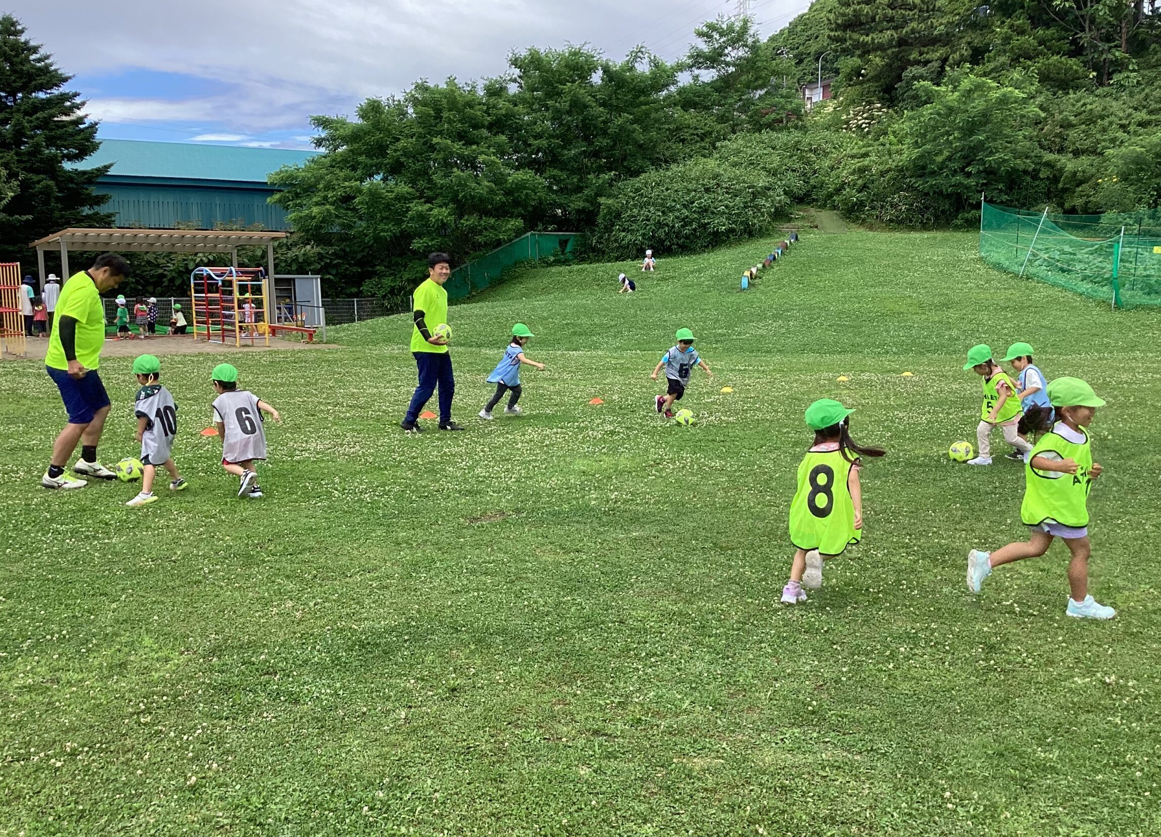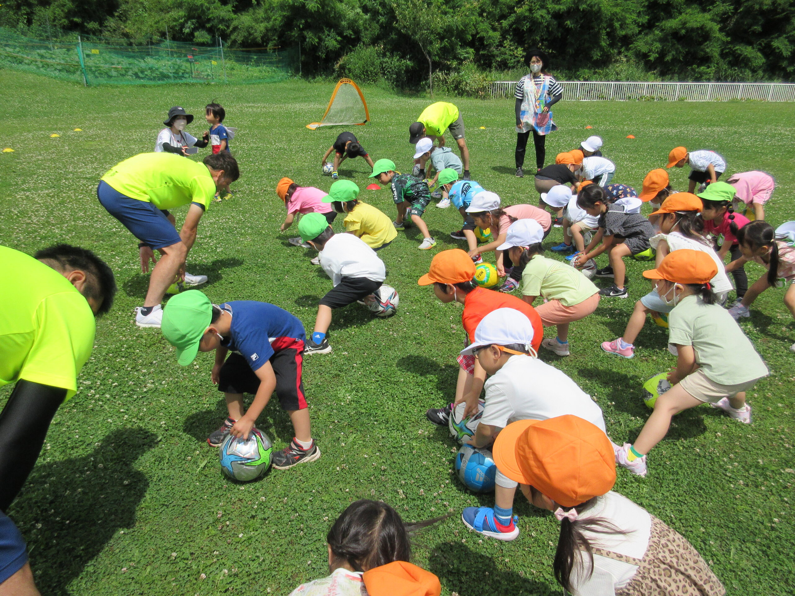 (42)令和5年度「年中学年 サッカー巡回指導」 2023年7月13日 園内ブログ 年長学年に続き7月13日(木)晴天に恵まれた日に年中学年のサッカー学習がありました。年長学年同様2部構成にて執り行われました。身体を楽しんで動かすことに子ども達は積極的に行っていました。キックをしたり足でボールを運んだり少しずつボールに慣れる姿が見られました。「サッカーって手を使うとだめなんだ💡たのしいね!」と学んだ一日でした。 今日の病気欠席者は、風邪3名、咳3名、発熱6名、大事をとって6名です。 ⚽前半チーム⚽ ⚽後半チーム⚽