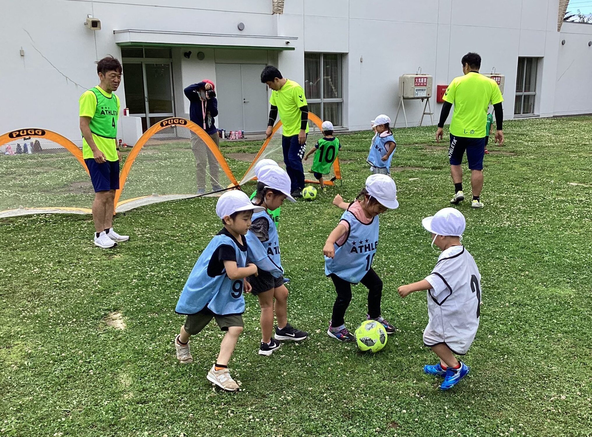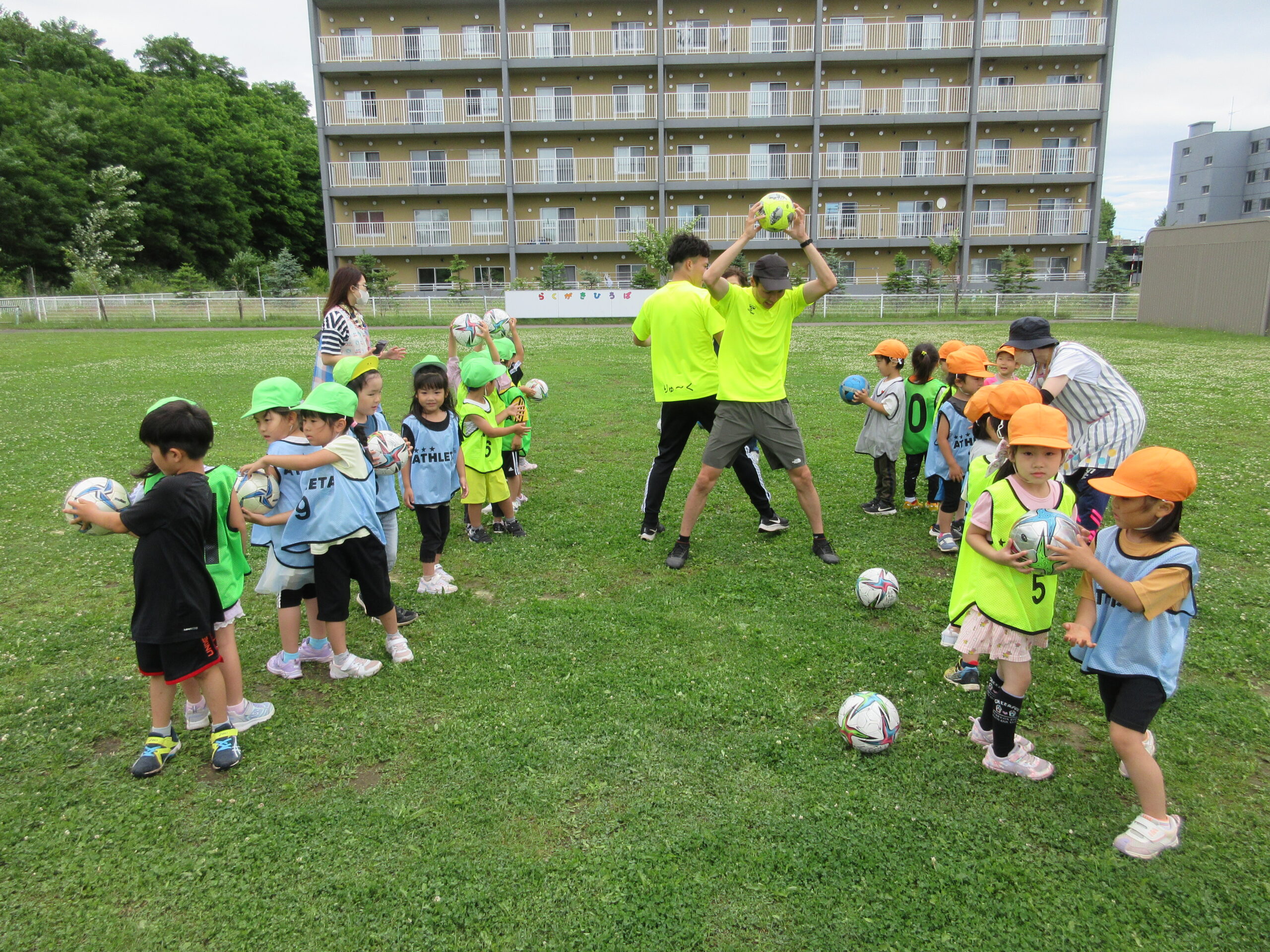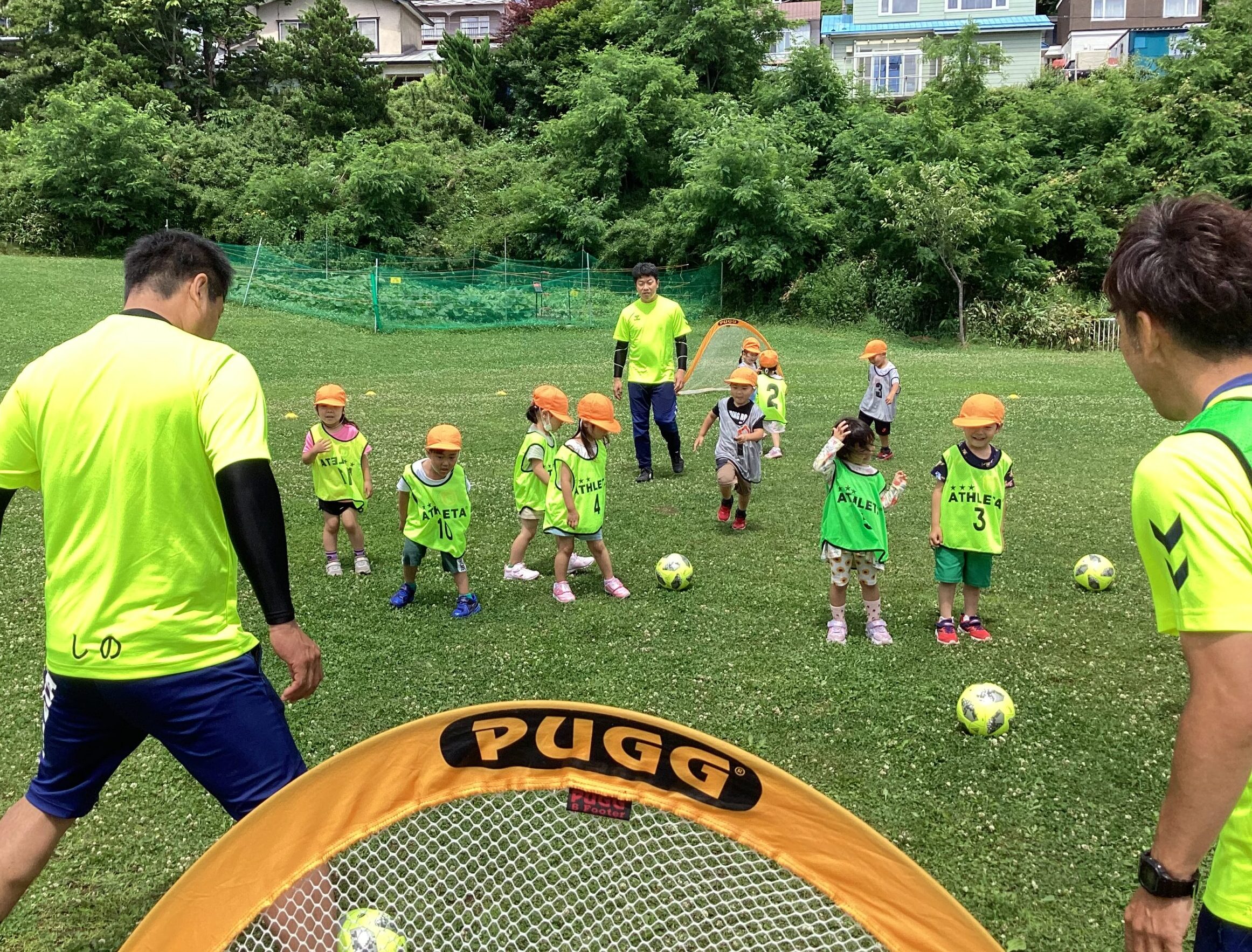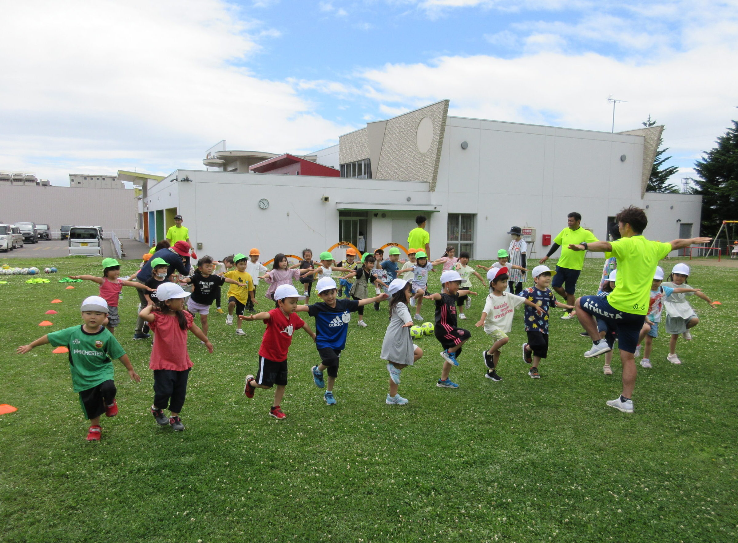 (42)令和5年度「年中学年 サッカー巡回指導」 2023年7月13日 園内ブログ 年長学年に続き7月13日(木)晴天に恵まれた日に年中学年のサッカー学習がありました。年長学年同様2部構成にて執り行われました。身体を楽しんで動かすことに子ども達は積極的に行っていました。キックをしたり足でボールを運んだり少しずつボールに慣れる姿が見られました。「サッカーって手を使うとだめなんだ💡たのしいね!」と学んだ一日でした。 今日の病気欠席者は、風邪3名、咳3名、発熱6名、大事をとって6名です。 ⚽前半チーム⚽ ⚽後半チーム⚽