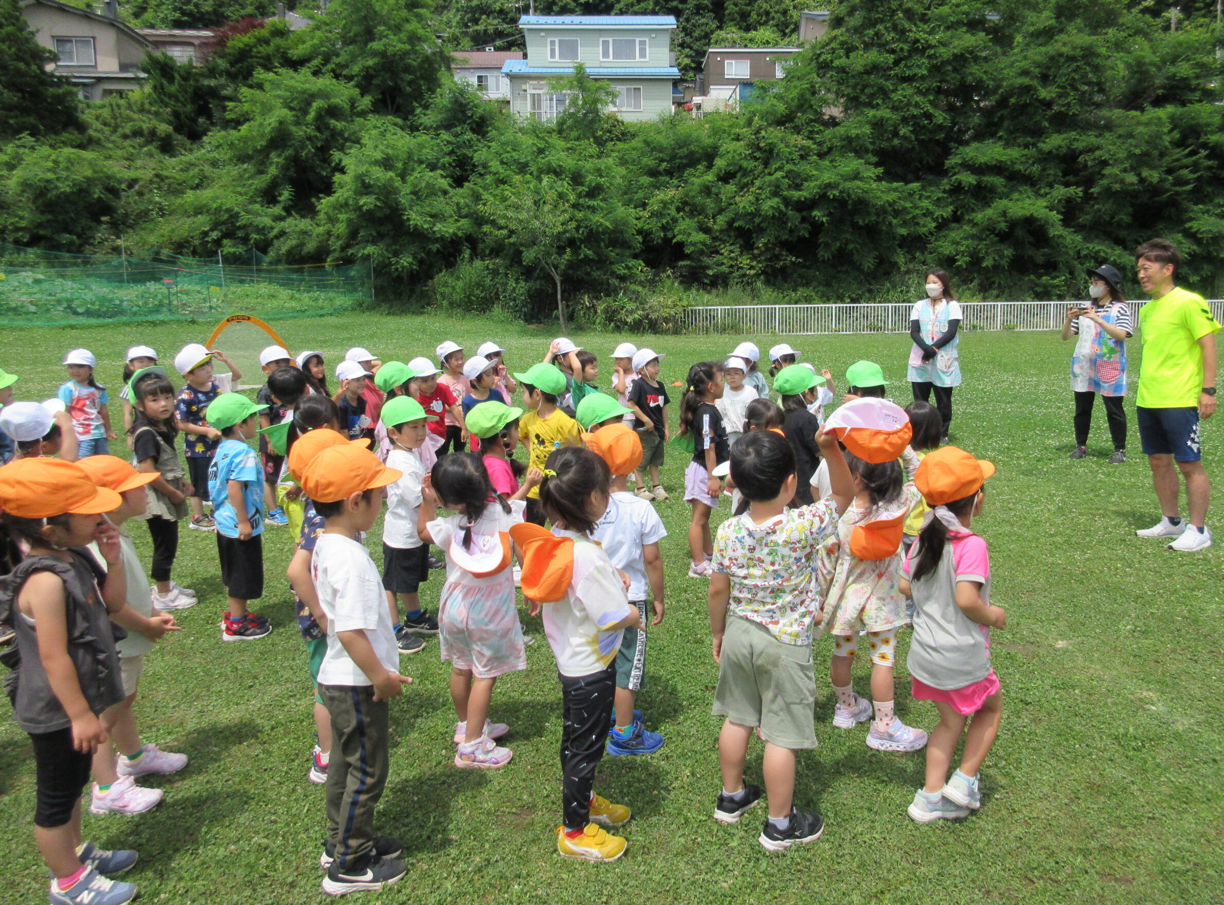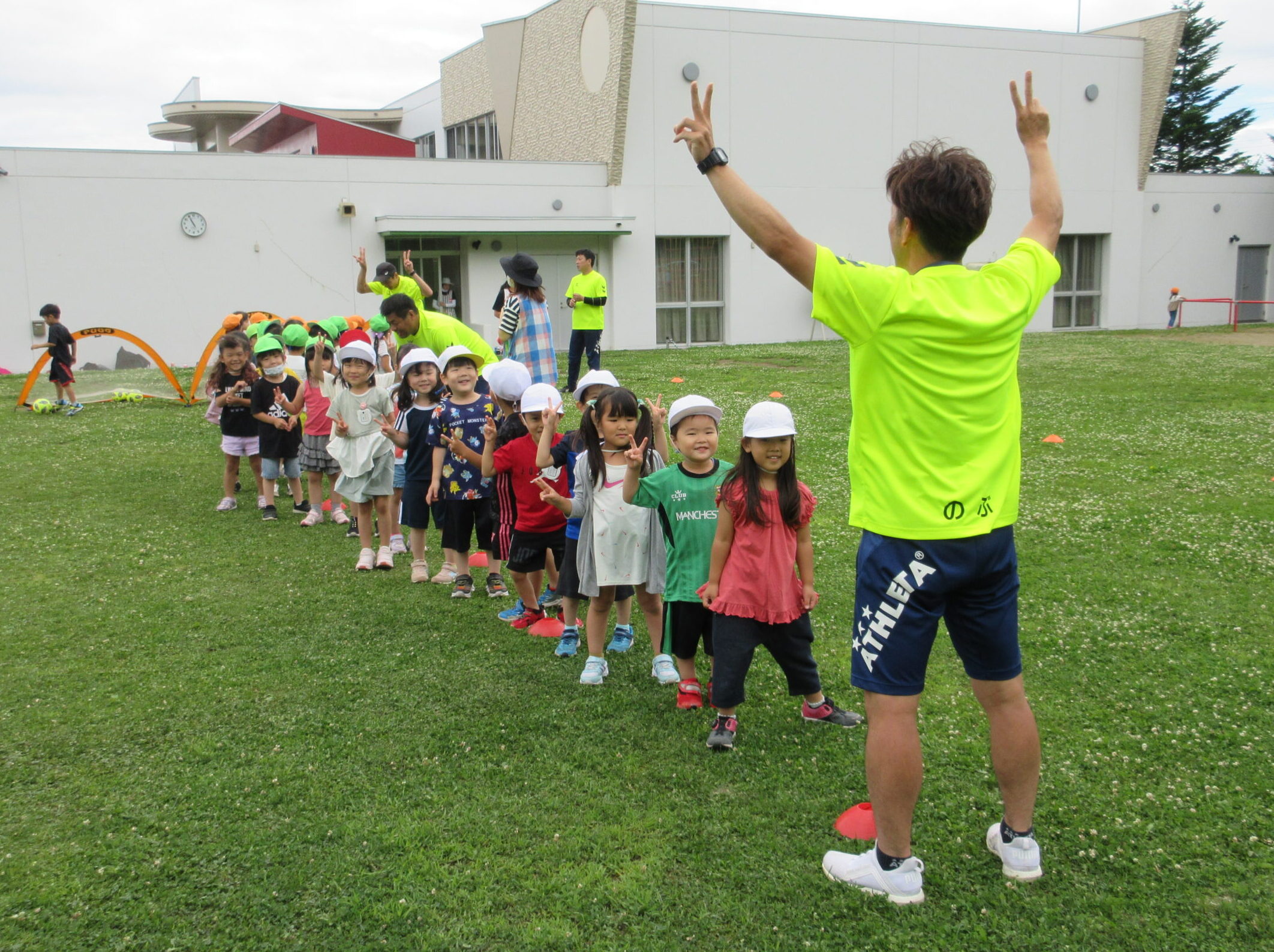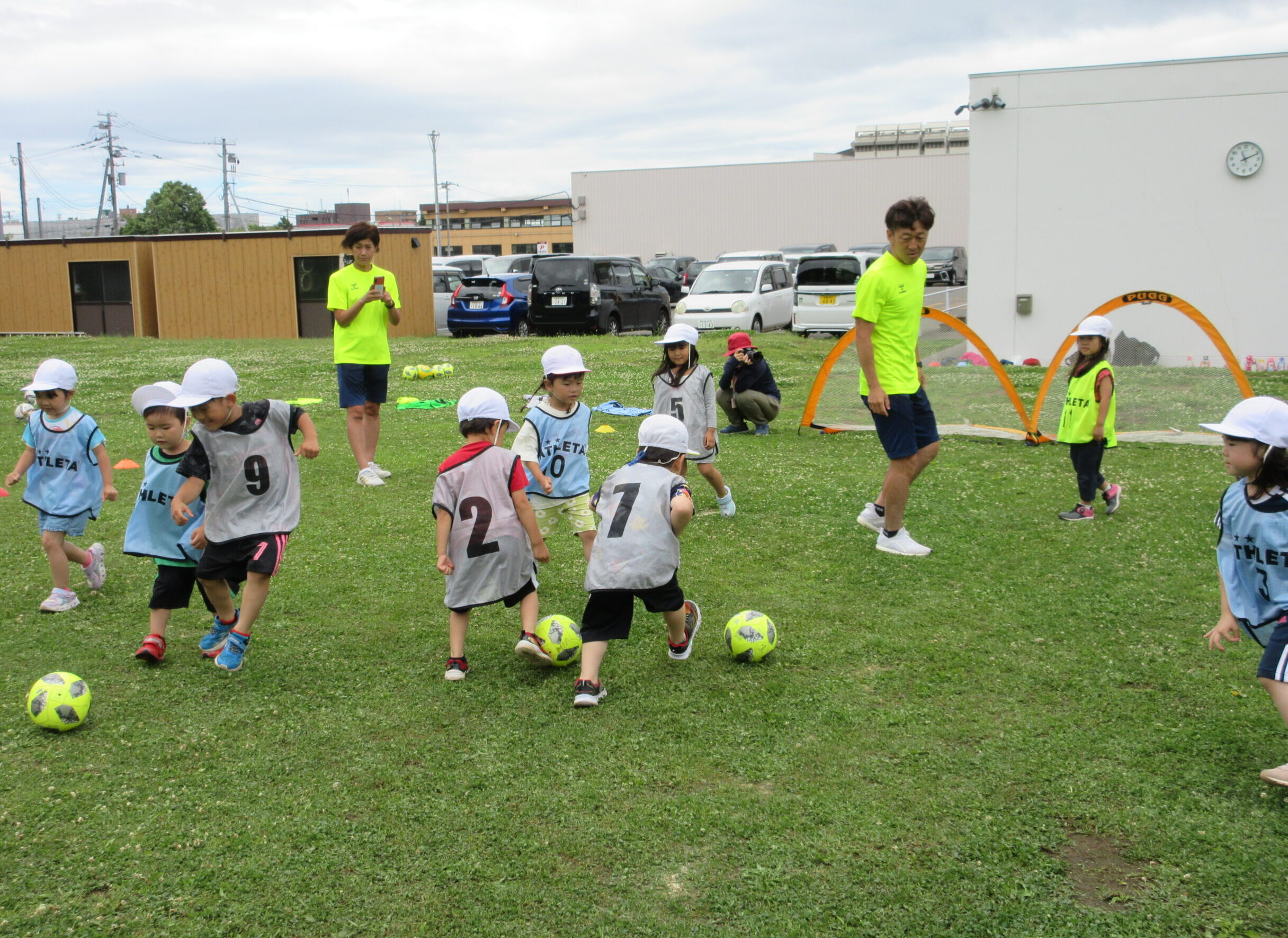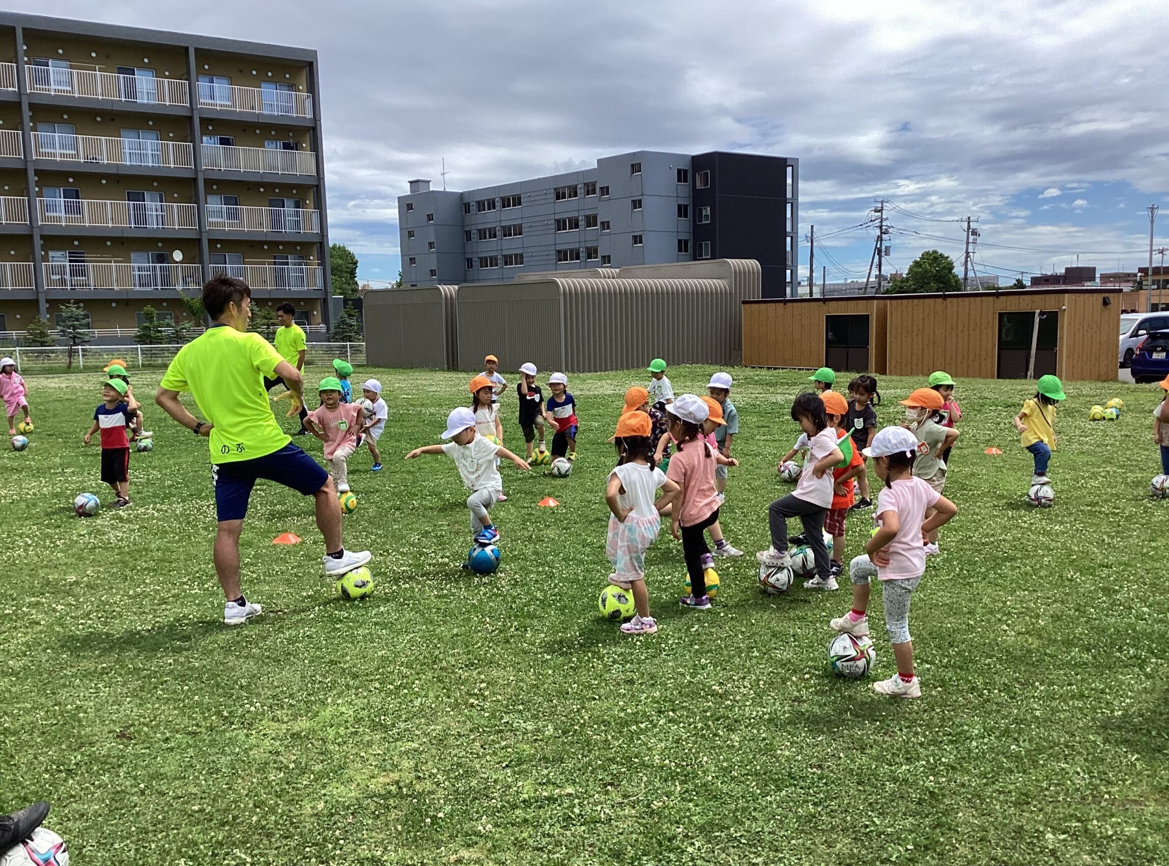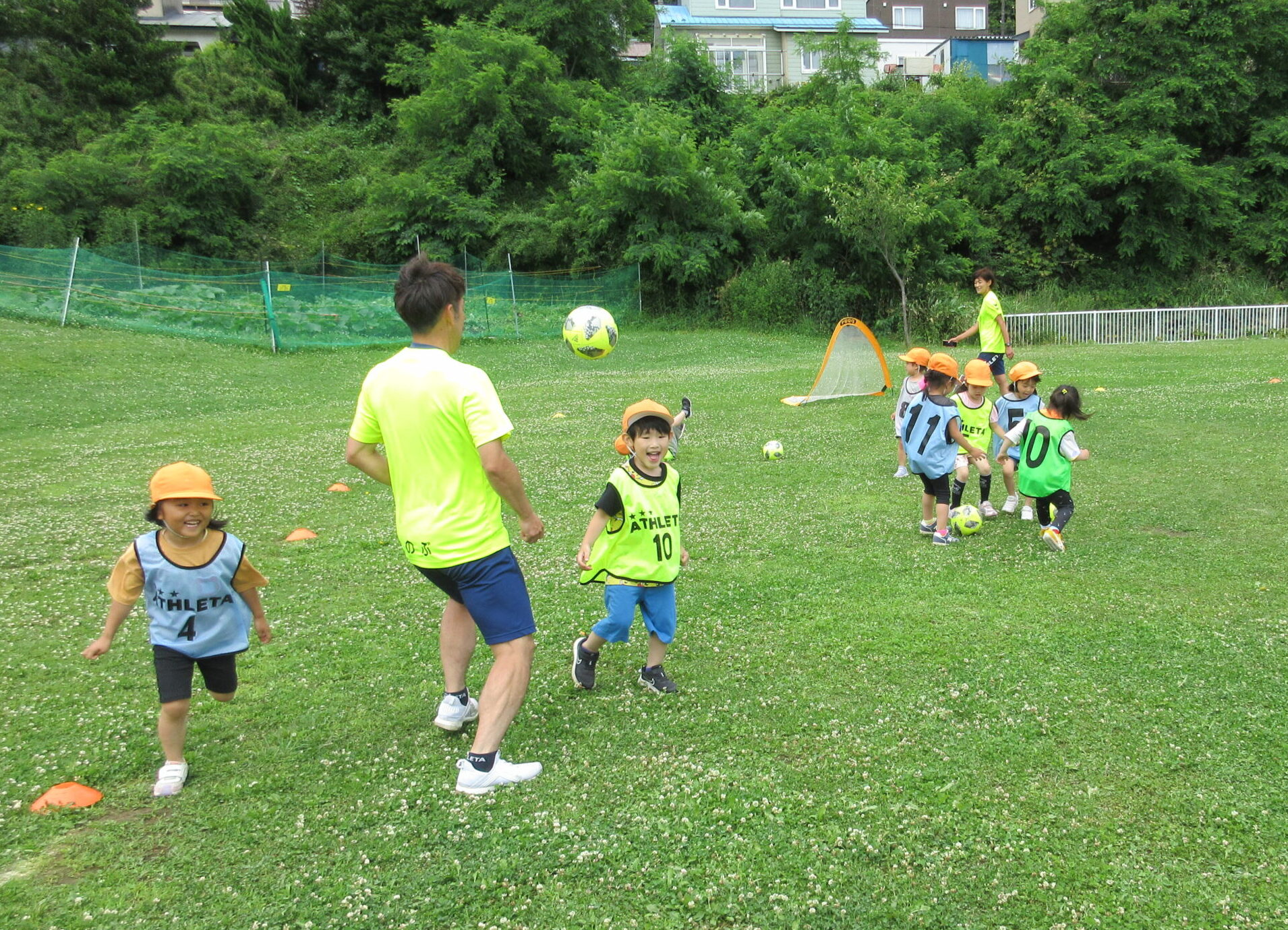 (42)令和5年度「年中学年 サッカー巡回指導」 2023年7月13日 園内ブログ 年長学年に続き7月13日(木)晴天に恵まれた日に年中学年のサッカー学習がありました。年長学年同様2部構成にて執り行われました。身体を楽しんで動かすことに子ども達は積極的に行っていました。キックをしたり足でボールを運んだり少しずつボールに慣れる姿が見られました。「サッカーって手を使うとだめなんだ💡たのしいね!」と学んだ一日でした。 今日の病気欠席者は、風邪3名、咳3名、発熱6名、大事をとって6名です。 ⚽前半チーム⚽ ⚽後半チーム⚽