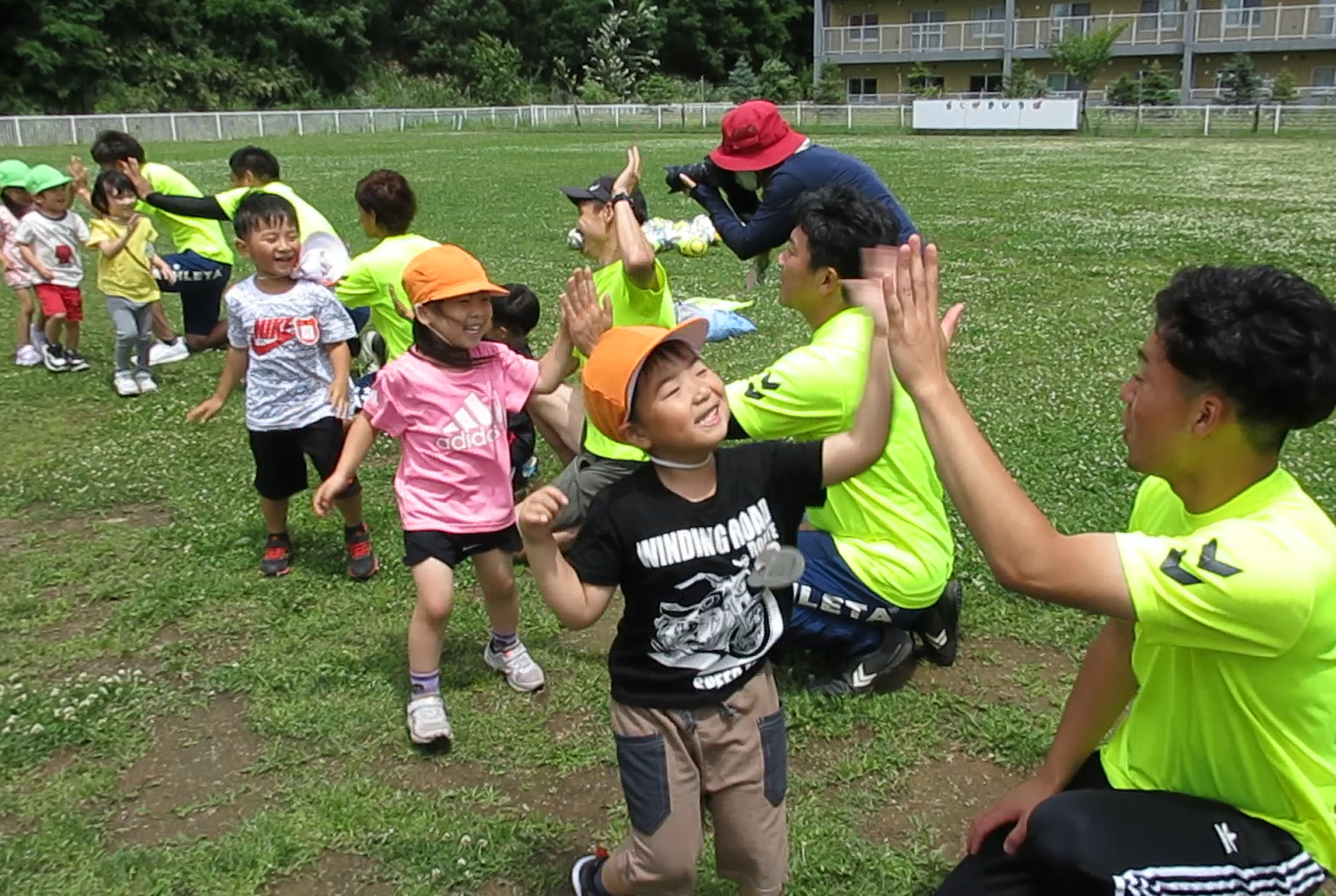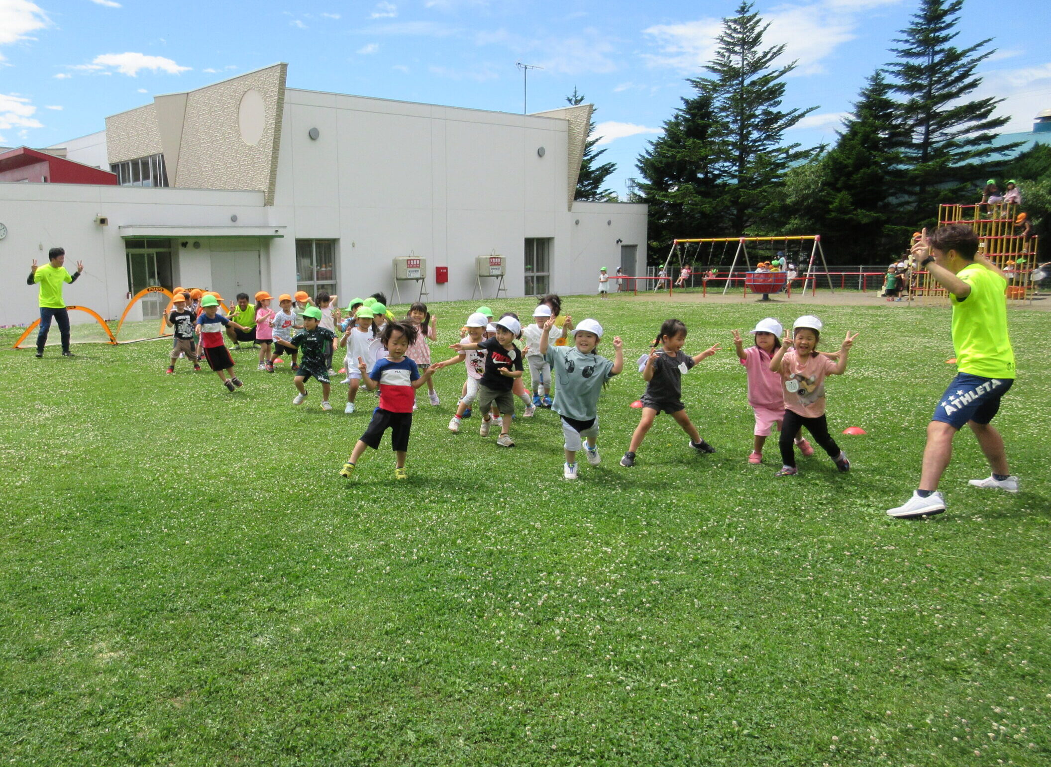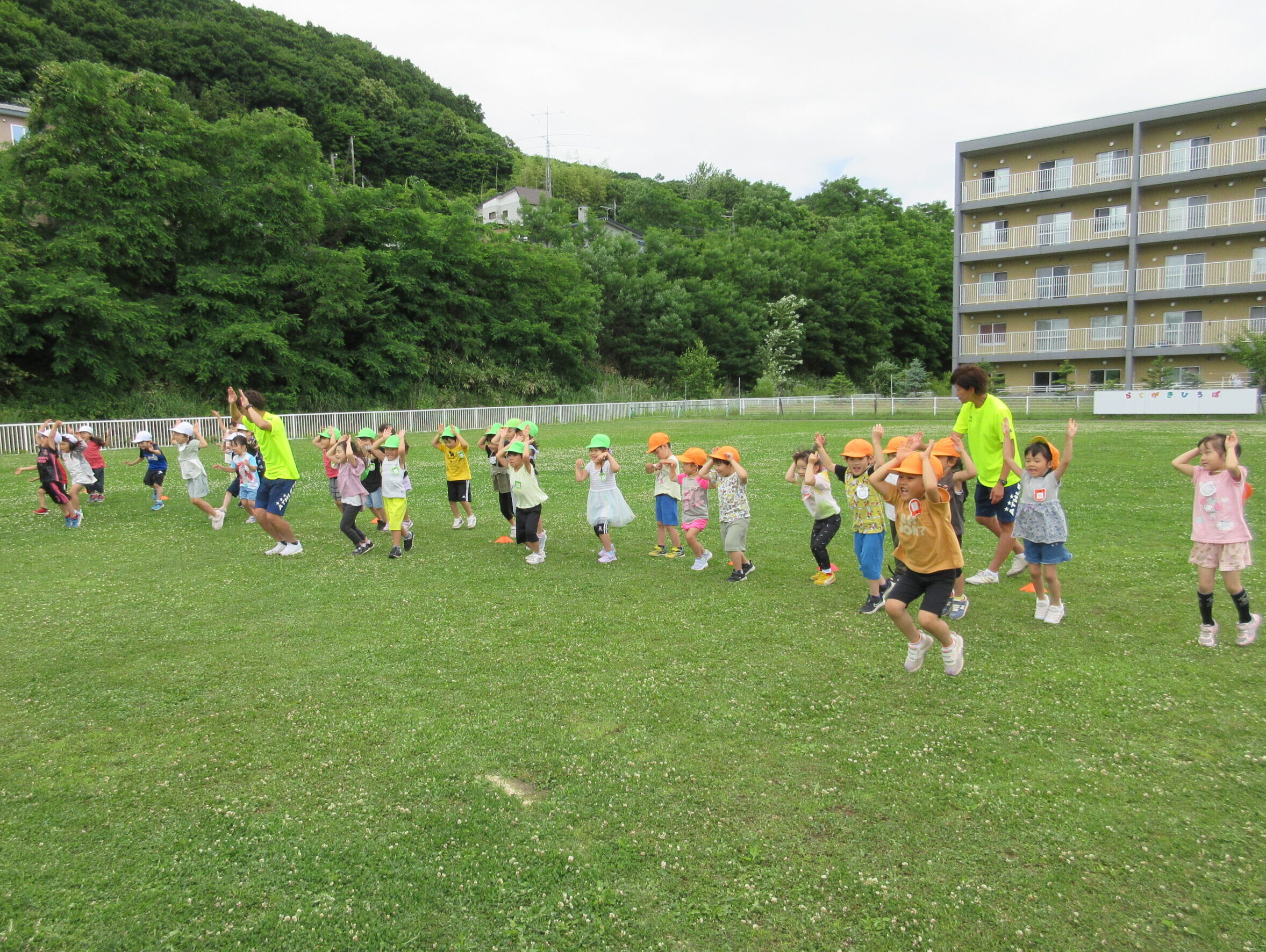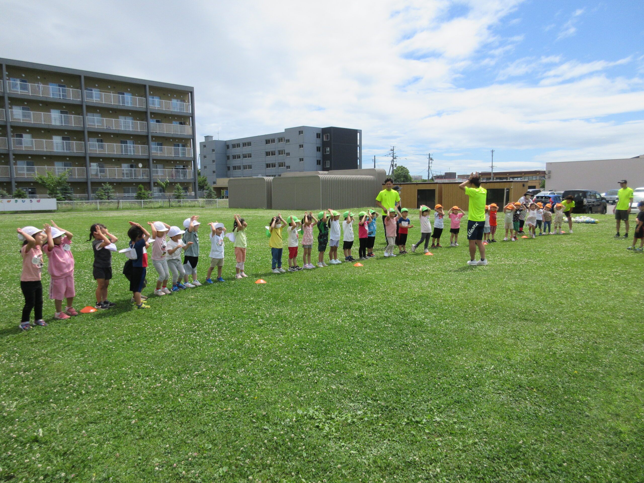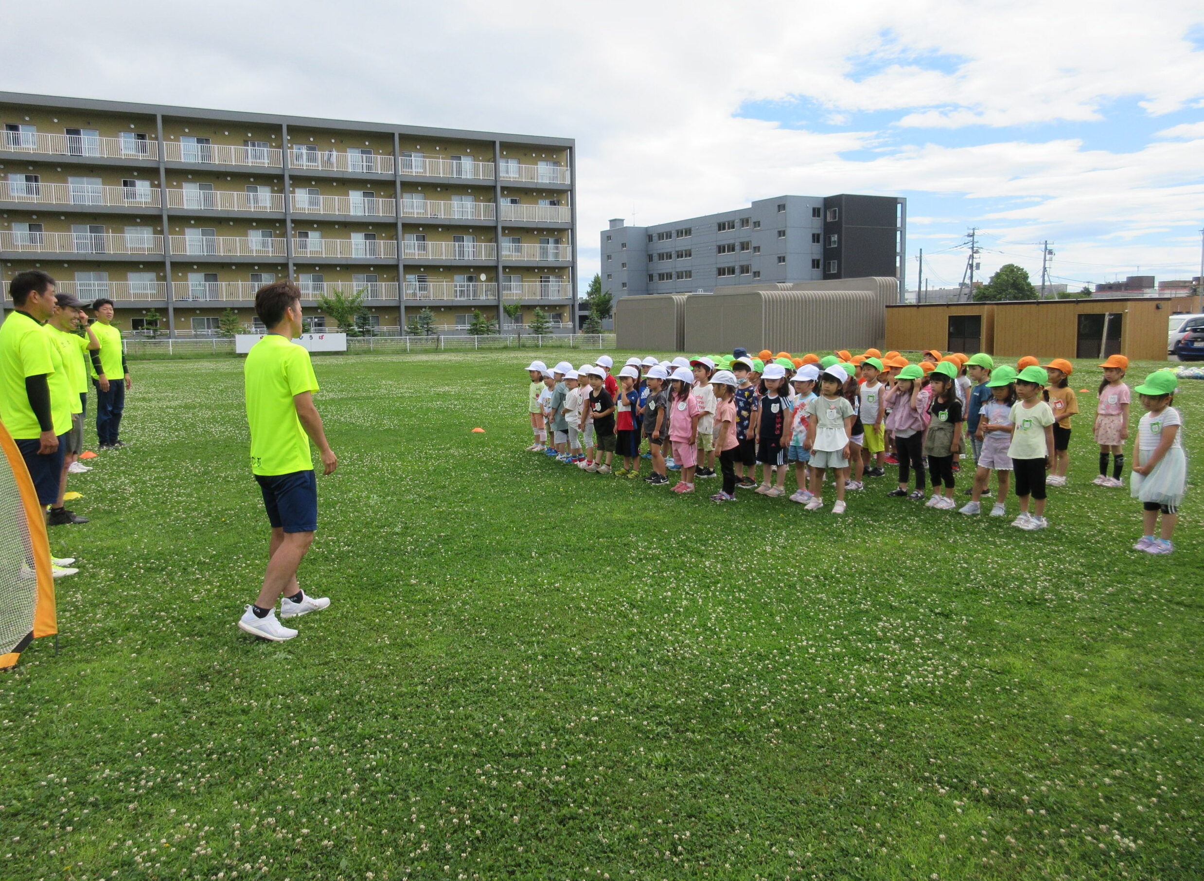 (42)令和5年度「年中学年 サッカー巡回指導」 2023年7月13日 園内ブログ 年長学年に続き7月13日(木)晴天に恵まれた日に年中学年のサッカー学習がありました。年長学年同様2部構成にて執り行われました。身体を楽しんで動かすことに子ども達は積極的に行っていました。キックをしたり足でボールを運んだり少しずつボールに慣れる姿が見られました。「サッカーって手を使うとだめなんだ💡たのしいね!」と学んだ一日でした。 今日の病気欠席者は、風邪3名、咳3名、発熱6名、大事をとって6名です。 ⚽前半チーム⚽ ⚽後半チーム⚽