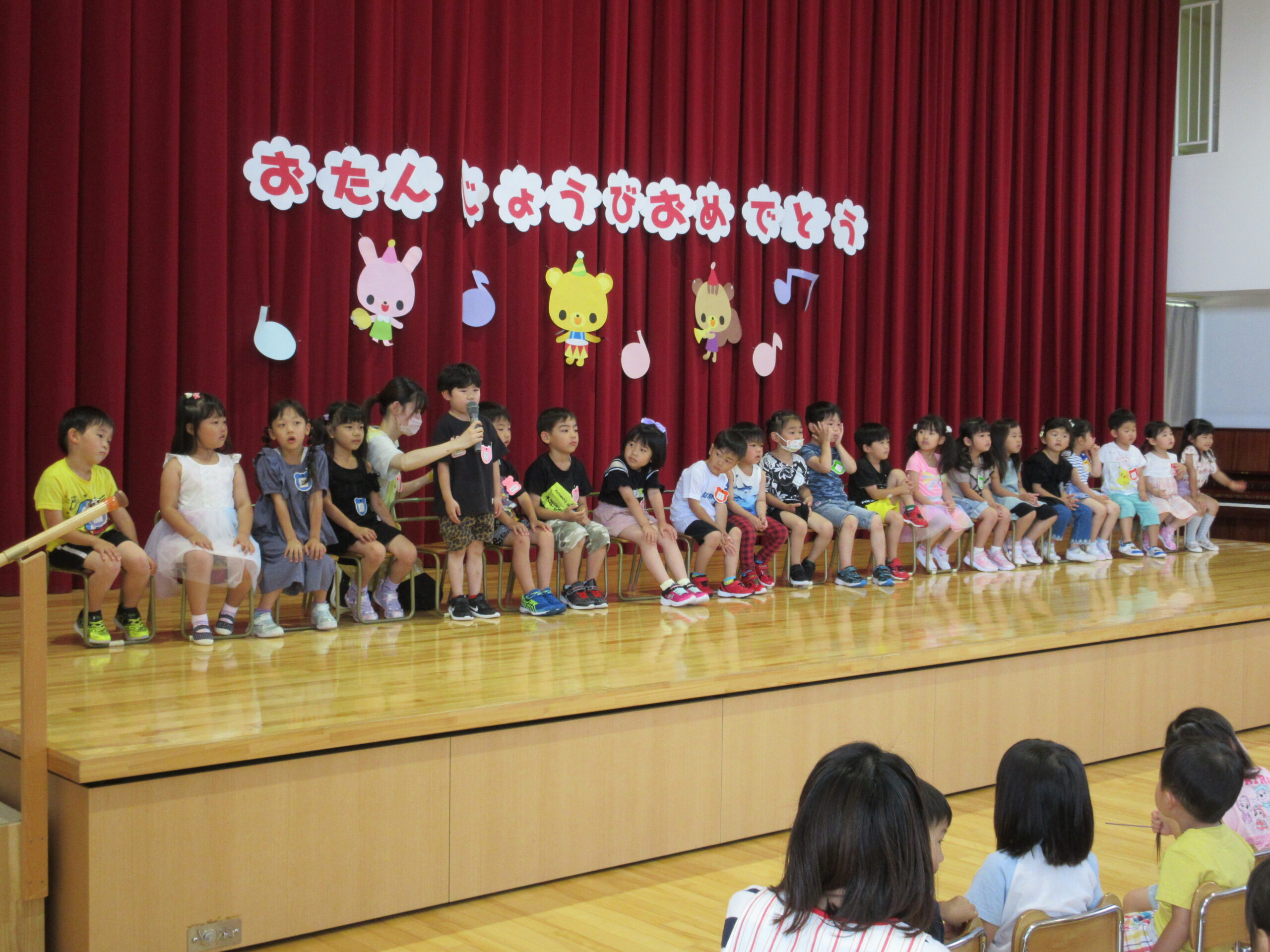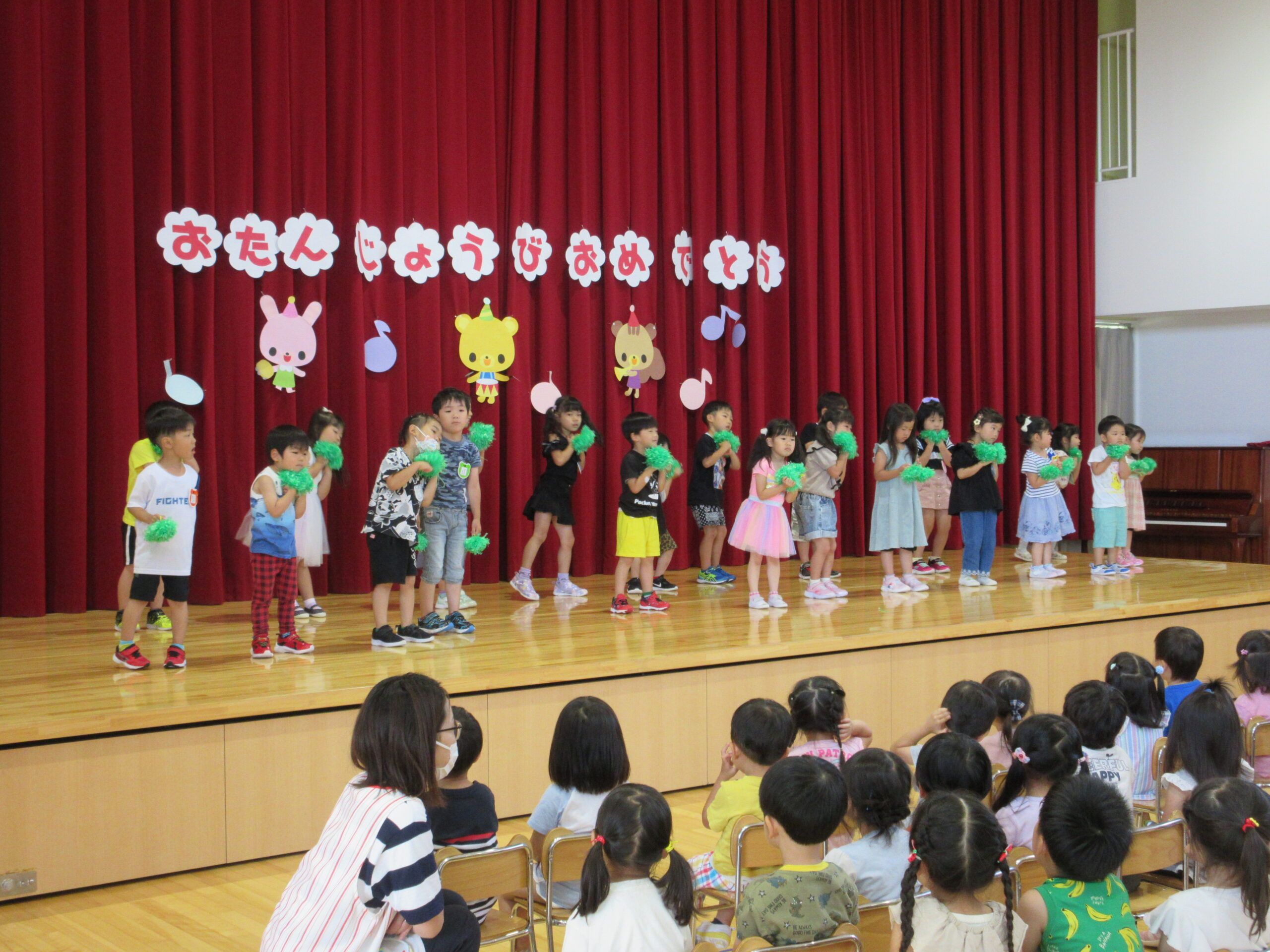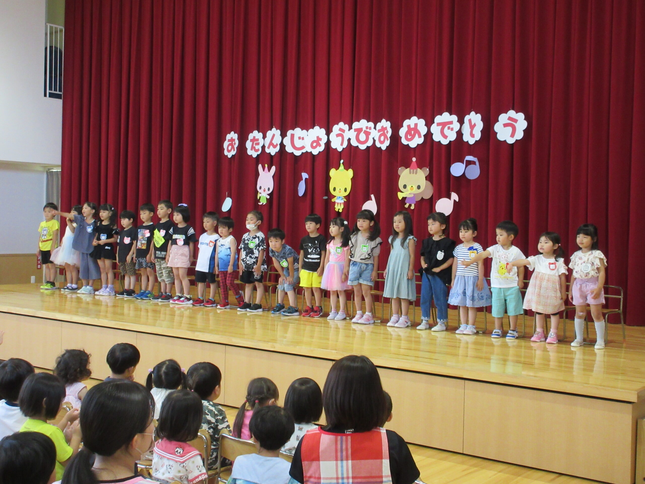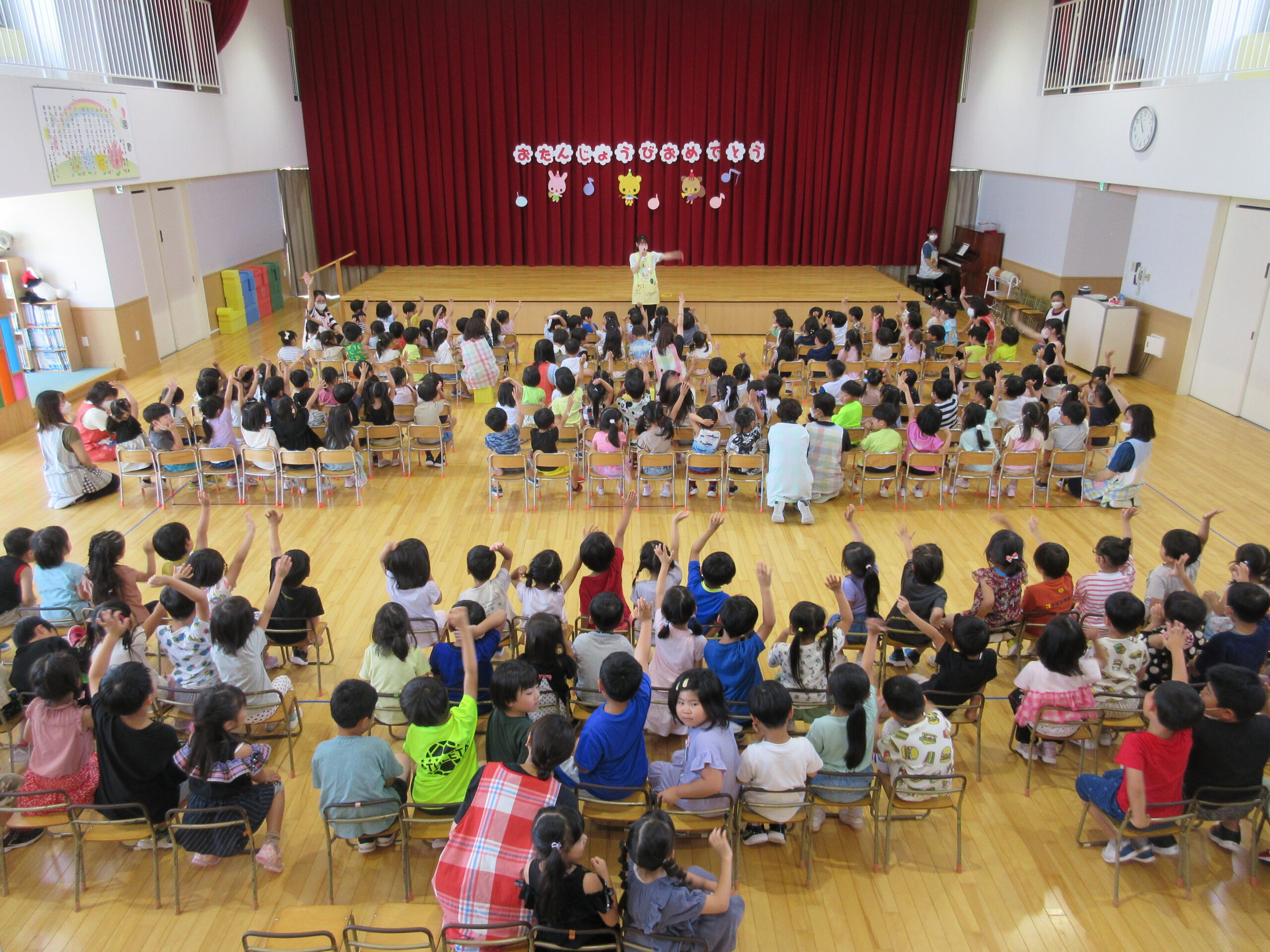 一学期も残すところ二日となりました。今日7月14日(金)は7月生まれのお誕生会でした。「ウキウキ☆ゆめいろハート」の踊りをポンポンを持って前後入れ替えをして楽しんで披露することが出来ていました。21名の誕生児とお祝いするお友だちは特別な時間を過ごすことができました。園長先生のマジックはいかがでしたか?お水がきえましたね~!そして誕生会後は「なぞなぞ」クイズ。手を挙げて積極的に参加することができ歌も交えて楽しんでいました。
