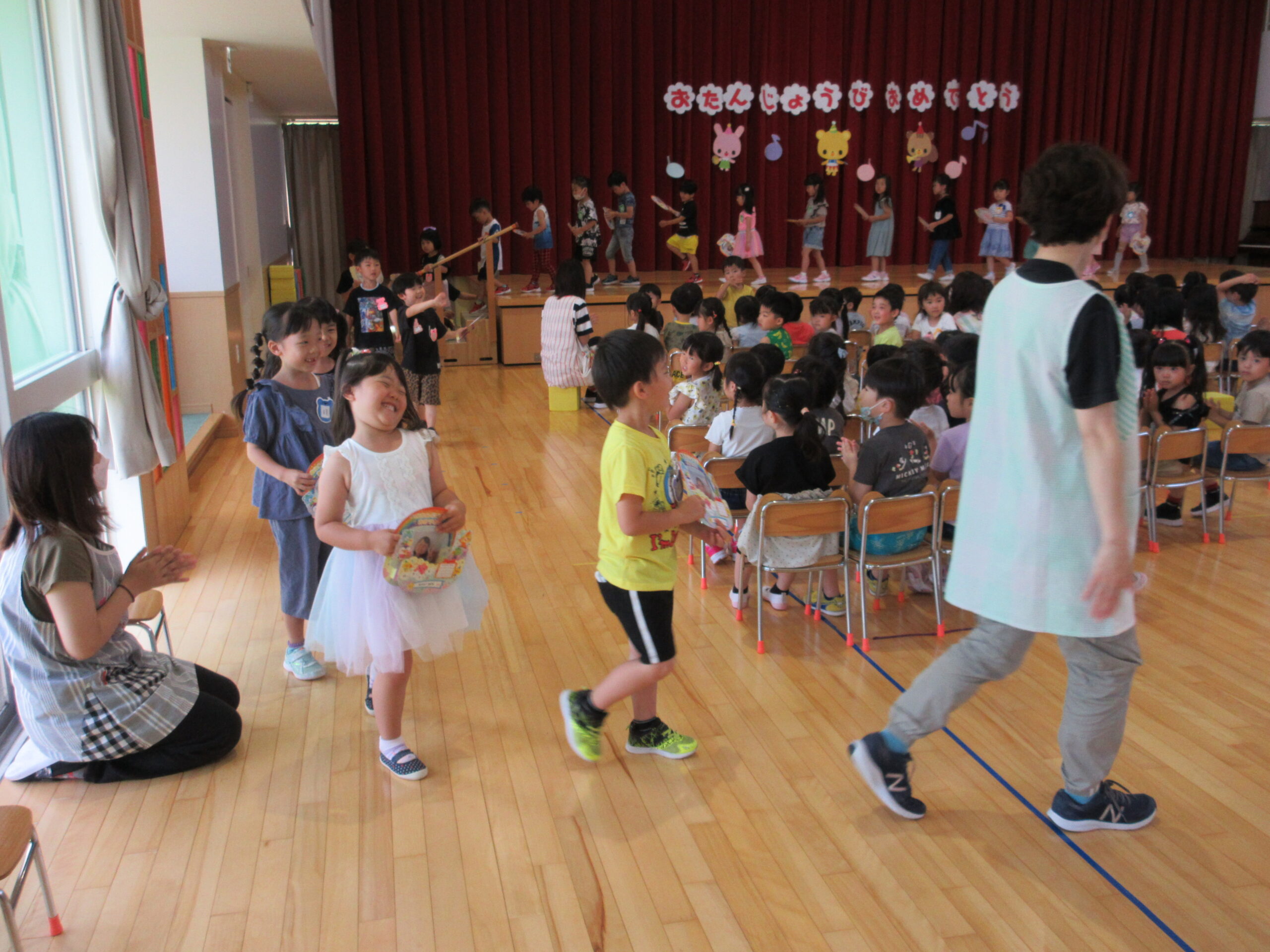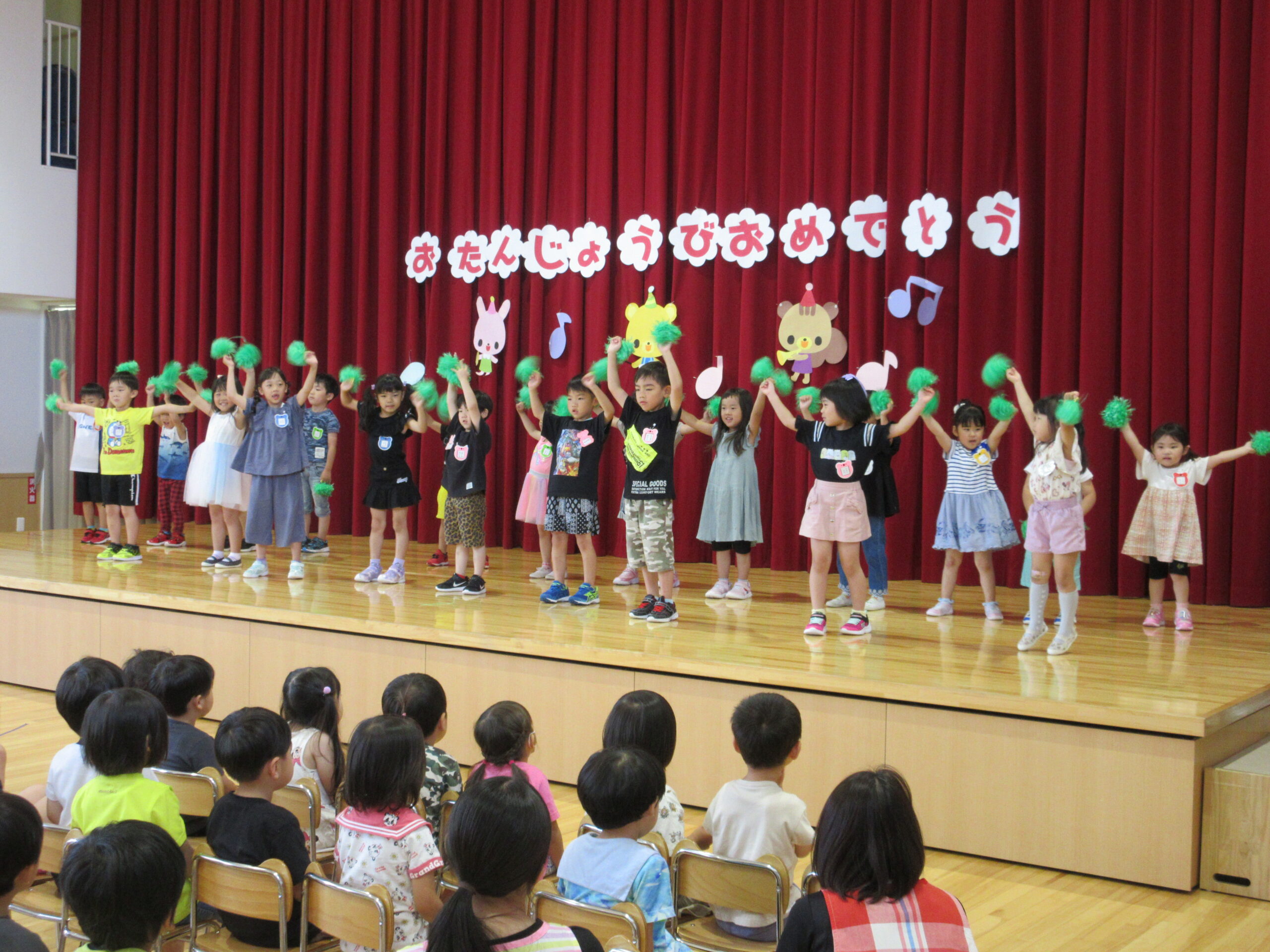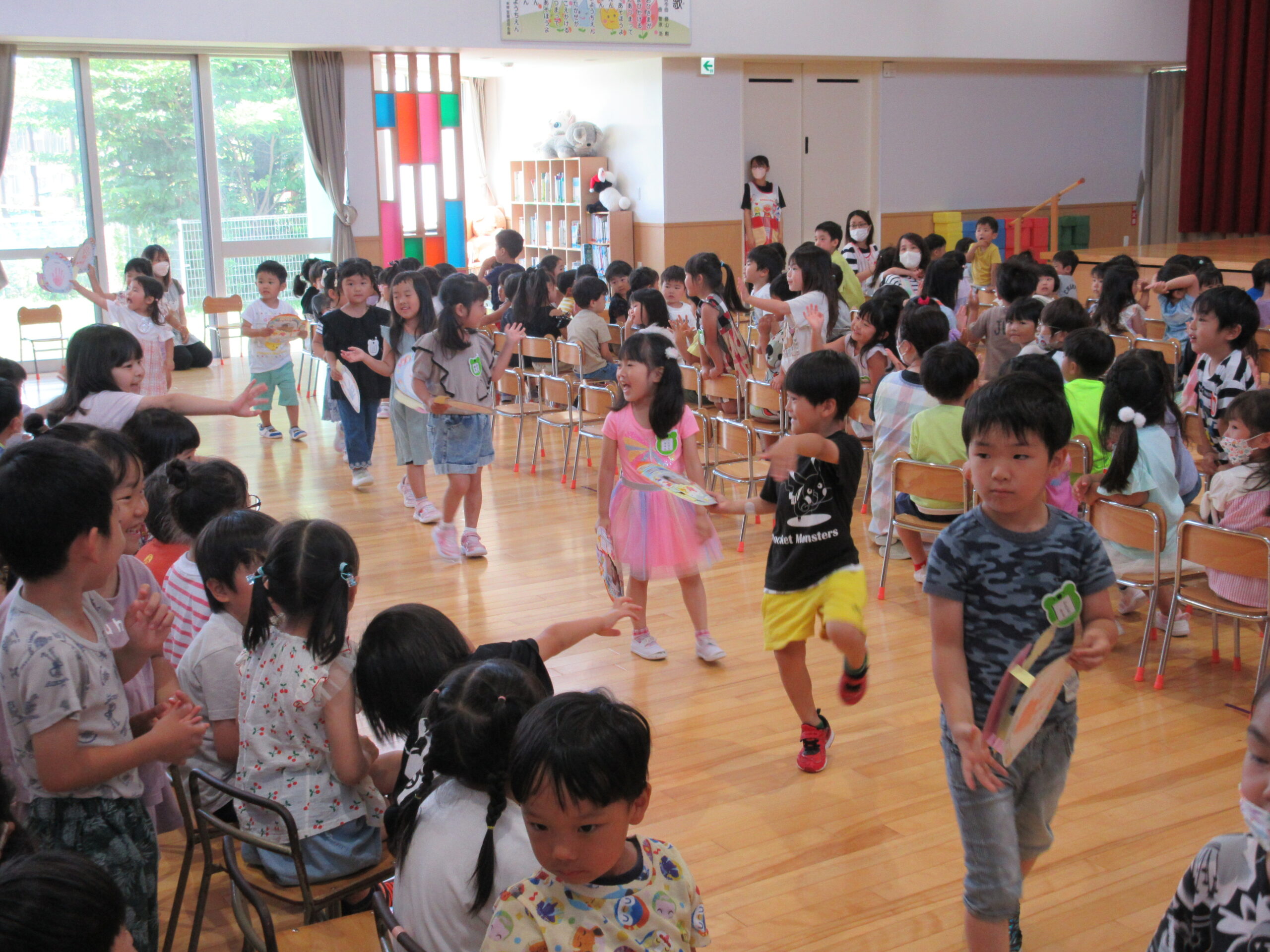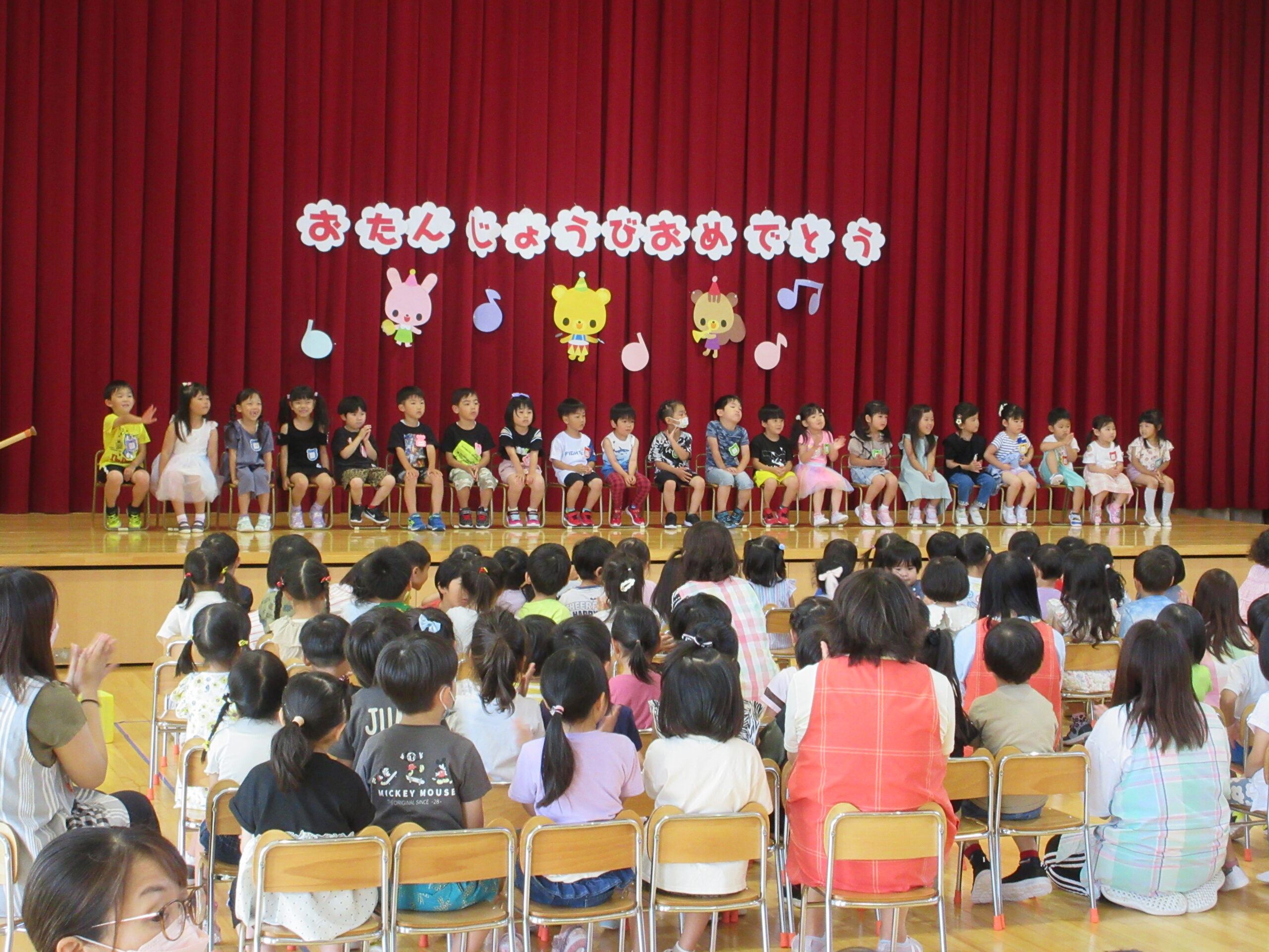一学期も残すところ二日となりました。今日7月14日(金)は7月生まれのお誕生会でした。「ウキウキ☆ゆめいろハート」の踊りをポンポンを持って前後入れ替えをして楽しんで披露することが出来ていました。21名の誕生児とお祝いするお友だちは特別な時間を過ごすことができました。園長先生のマジックはいかがでしたか?お水がきえましたね~!そして誕生会後は「なぞなぞ」クイズ。手を挙げて積極的に参加することができ歌も交えて楽しんでいました。