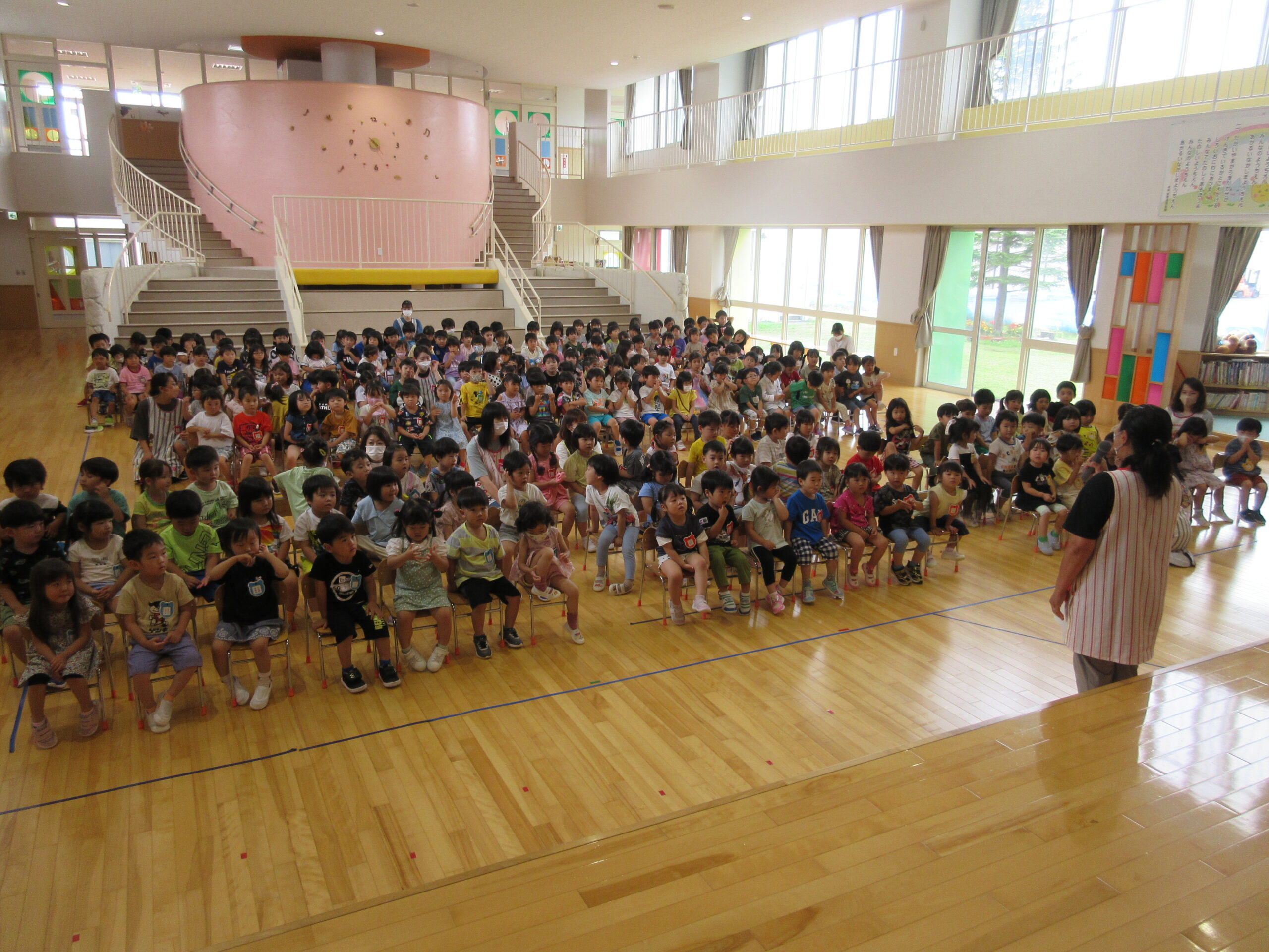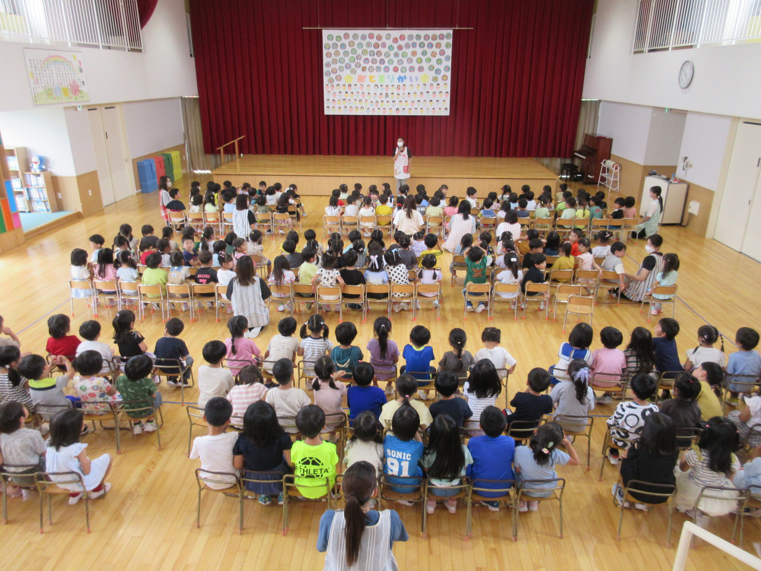 (45)令和5年度「1学期終業式」 2023年7月19日 園内ブログ 今日7月19日(水)で一学期が終了することを子ども達も把握しながら、ホールにて終業式を行いました。入園、進級してから何事にも挑戦して取り組んできた子ども達。頑張ってきた子ども達を誉めました。それぞれが自信に繋がり、そして笑顔がたくさん増えました。式の最後には先生方から手話でのお話がありました。夏休み中も、いろいろなことに挑戦して規則正しい生活を心掛けて下さい。そして2学期また元気に会いましょう!待ってますね! 今日の病気欠席は、風邪4名、咳4名、発熱7名、大事をとって4名、体調不良4名です。