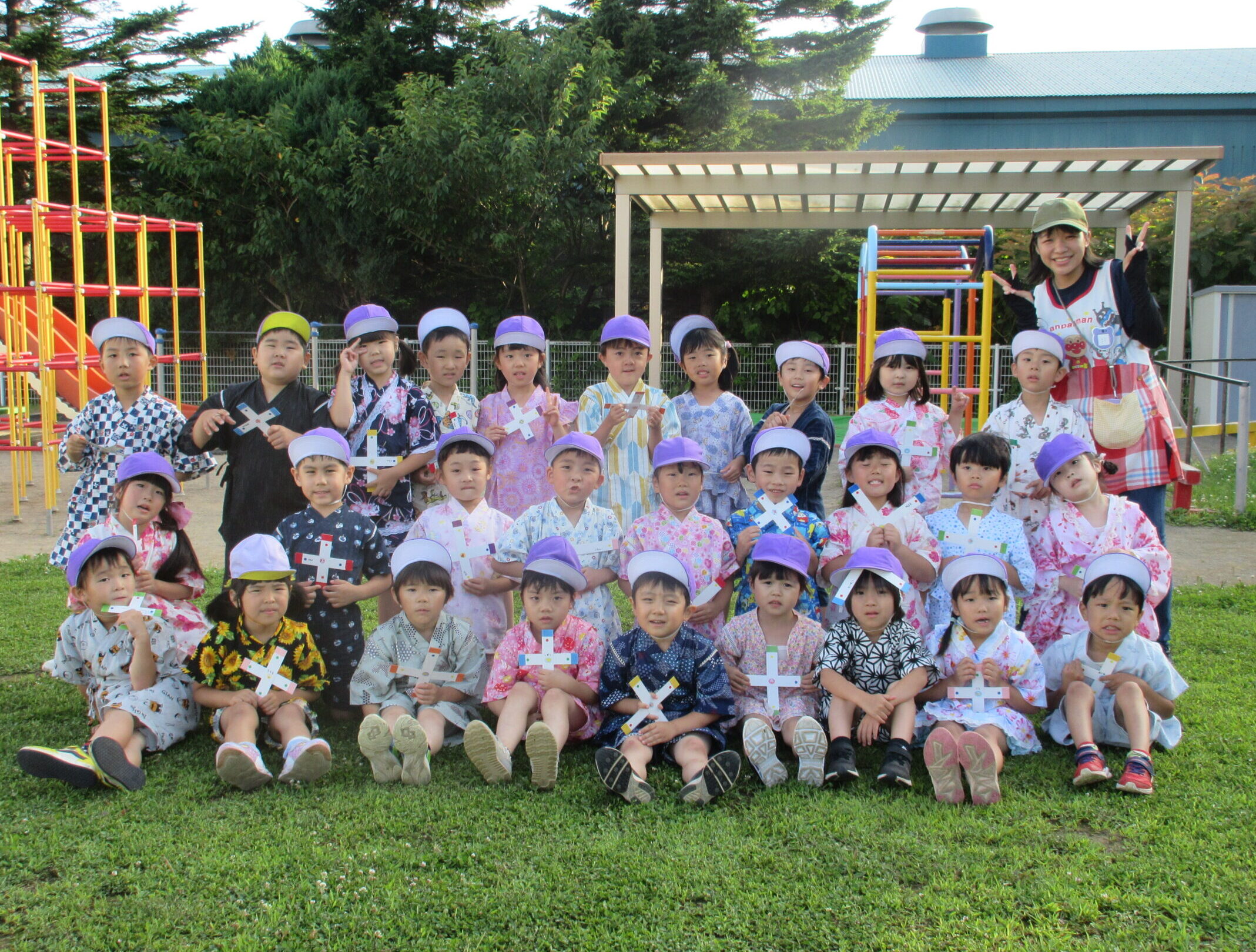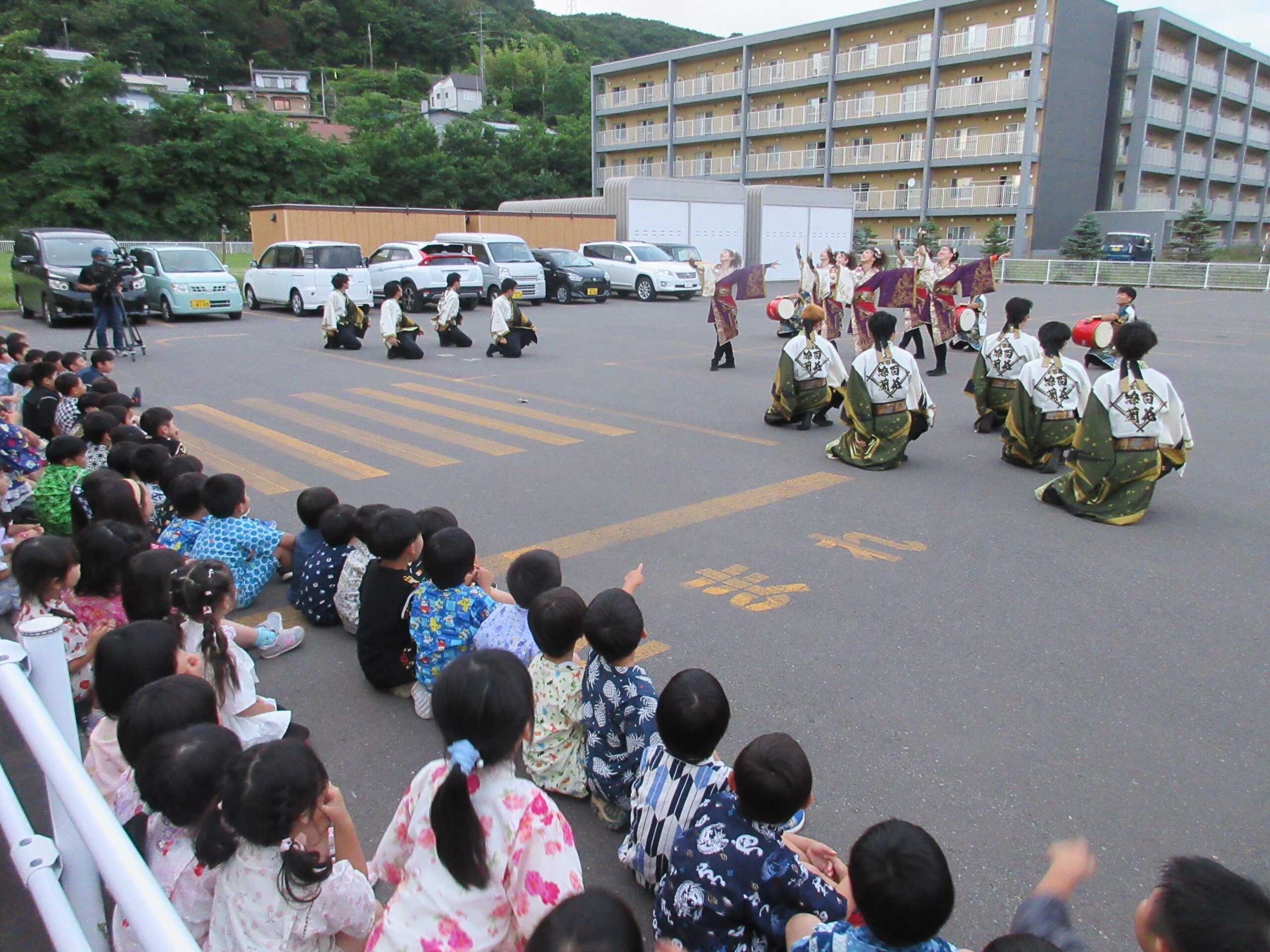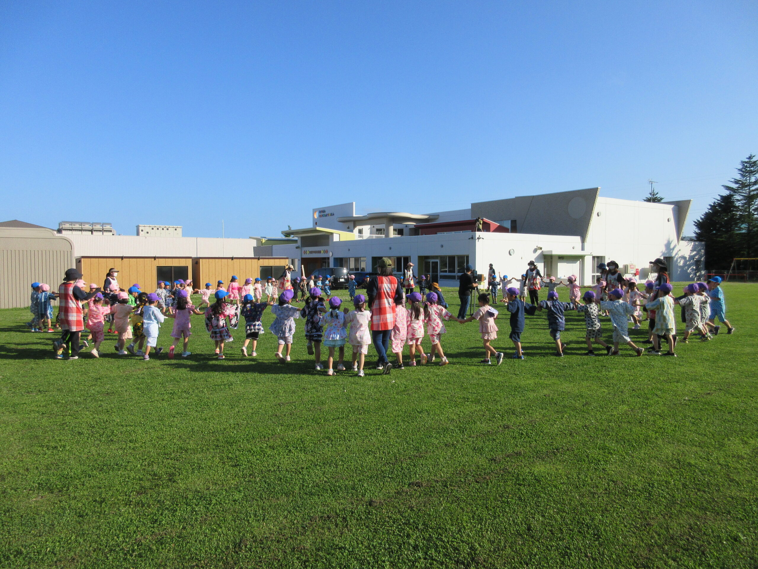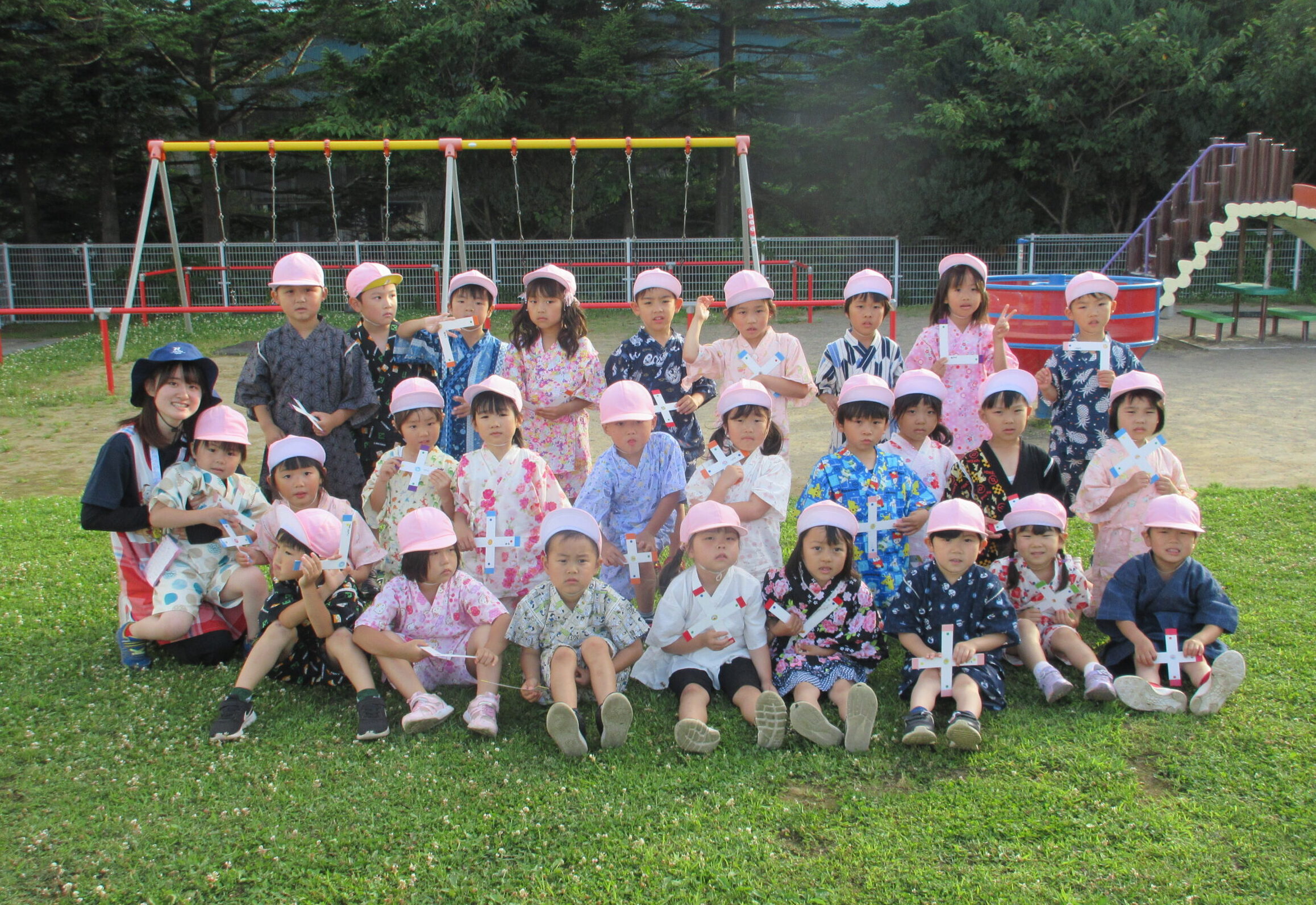 (48)令和5年度「年長学年 お泊まり会1日目」 2023年7月20日 園内ブログ 今年度より年長学年のお泊まり会を開始しました。1日目、7月20日は天候に恵まれ子ども達は楽しい時間を過ごすことができました。お泊まりセットを持参して夕方よりお家の方と登園し、園庭にてゲームやフォークダンスで体を目いっぱい動かしました。また昨年同様、室蘭百花繚蘭の方々が来園し「よさこい」で大盛り上がり!!子ども達は大喜びで「よさこい」に参加していました。夜は花火大会。夜空を見上げながら「うゎー!きれい!」と歓声が上がり、盛り沢山な内容に大満足。夕食のカレー美味しかったですね🍛