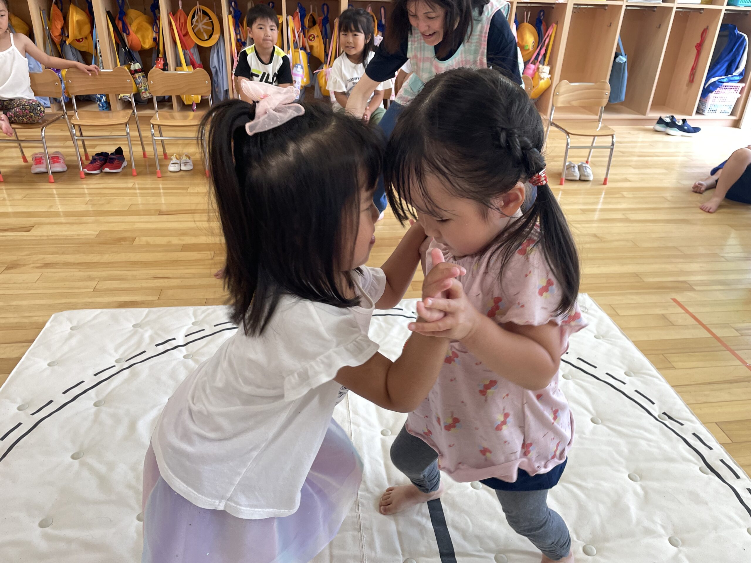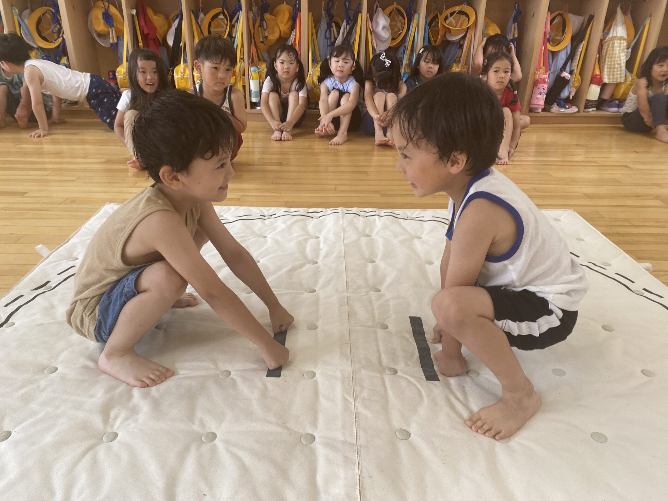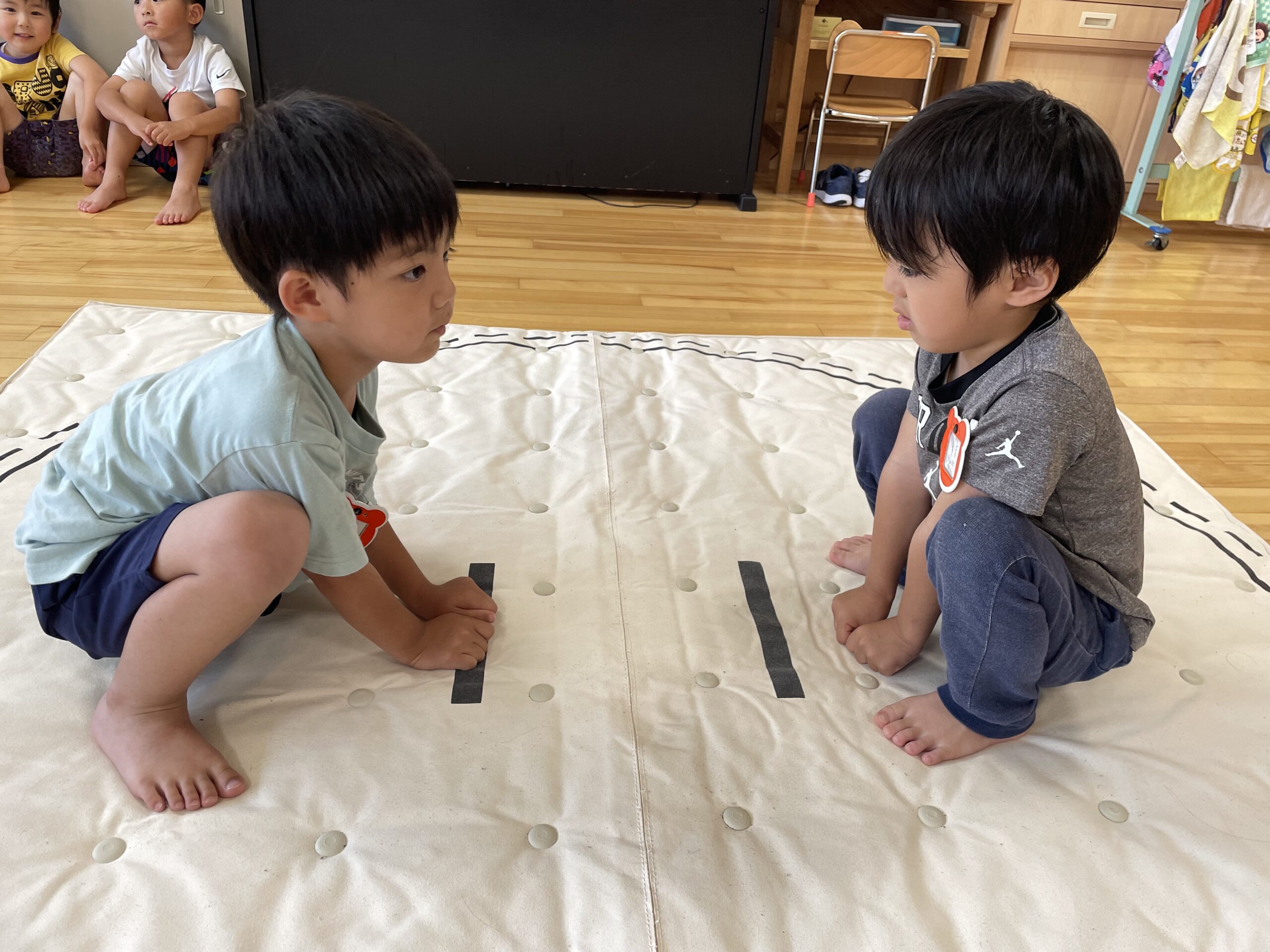 (35)令和5年度「年中学年 お相撲大会」 2023年7月10日 園内ブログ 本日7月10日(月)は各クラス毎にお部屋でおすもう大会を行いました。年中さんになって初めてのおすもう大会だった為、朝から緊張している子や気合十分な子それぞれでしたが、最後まで粘り強く頑張る姿が見られていました。悔し涙を流すお友だちも居ましたが気持ちを切り替え、2学期の大会に向けて意気込む様子が見られていたので、次回のおすもう大会でも頑張って欲しいと思います!!
