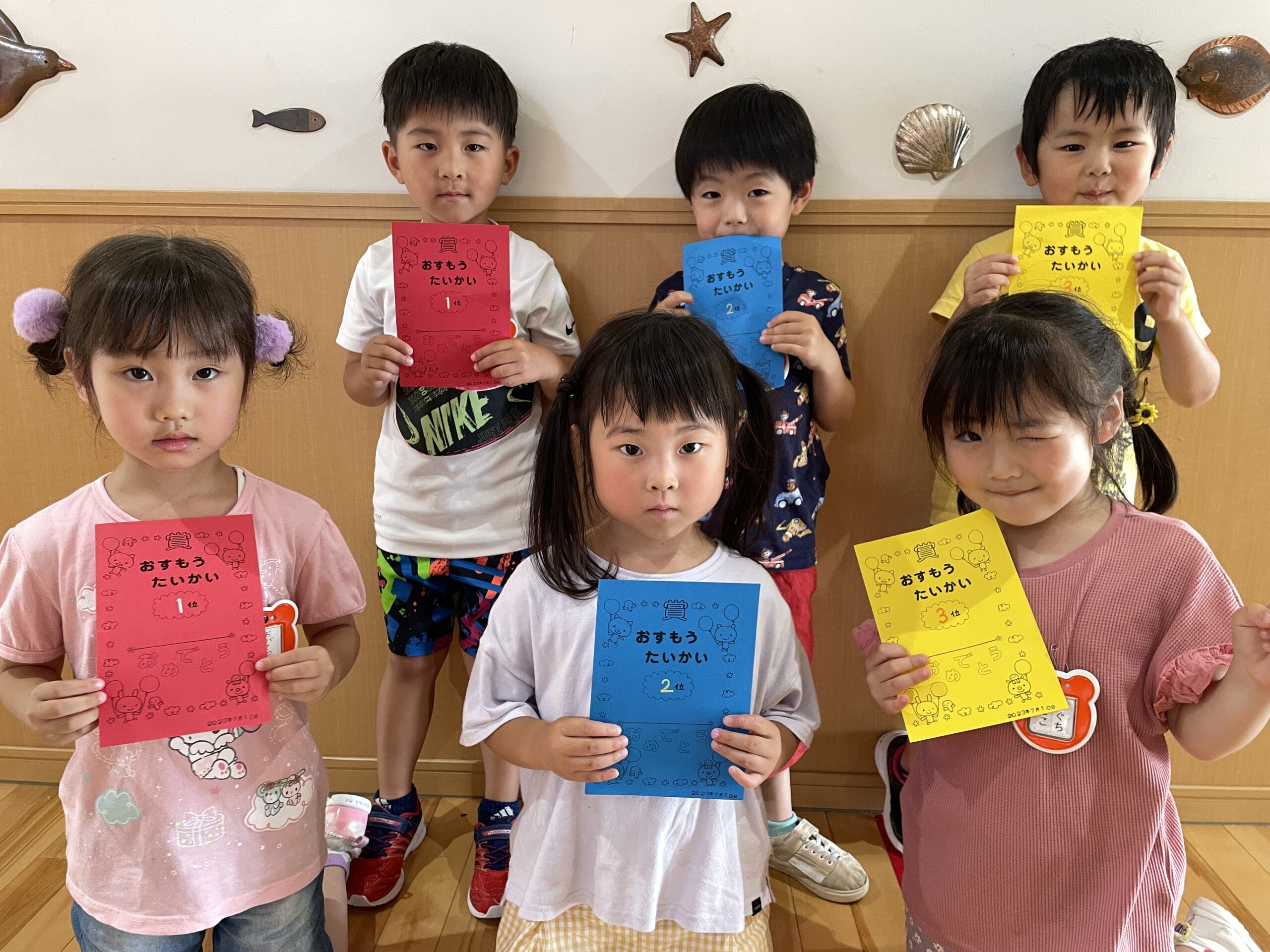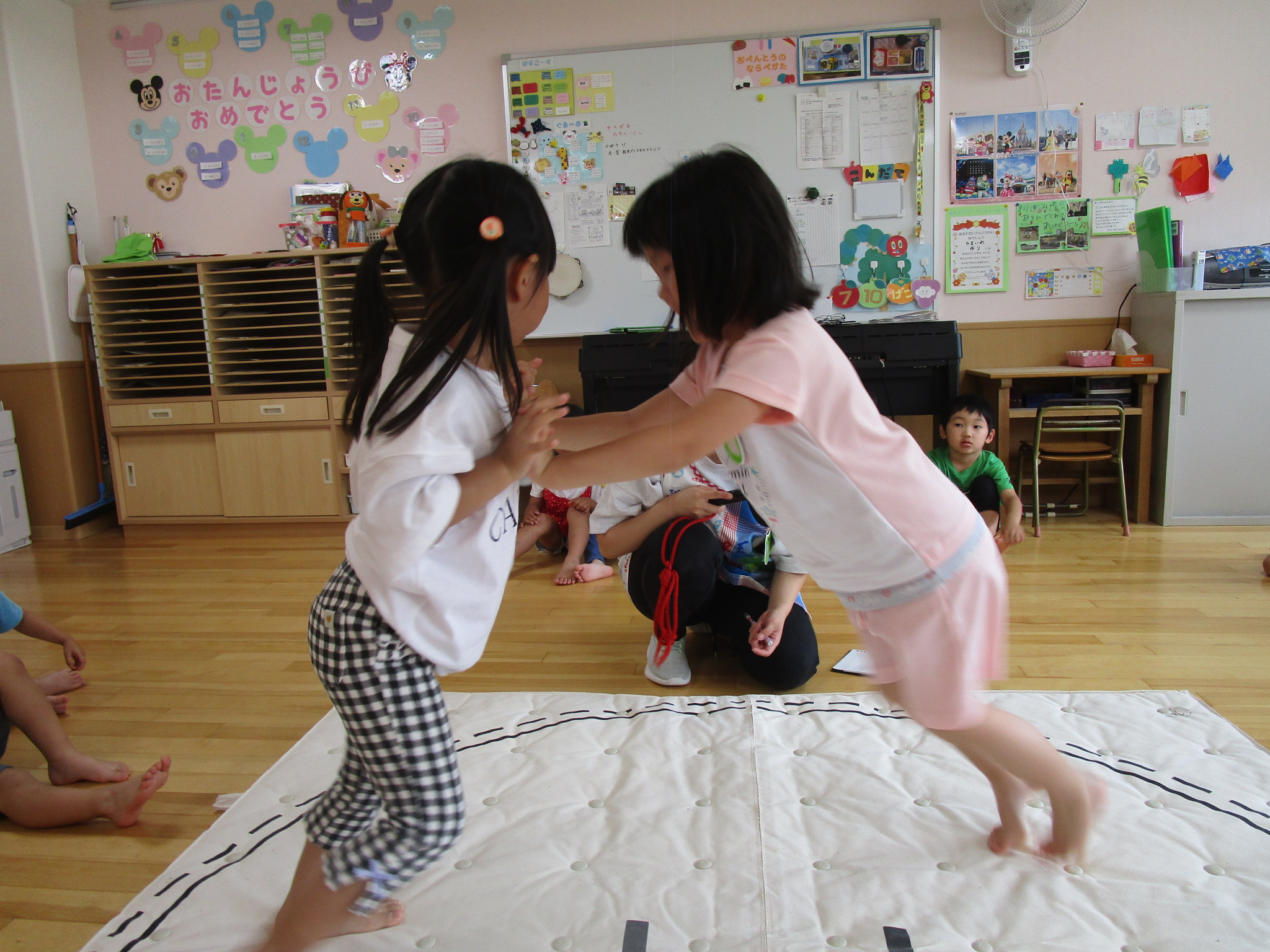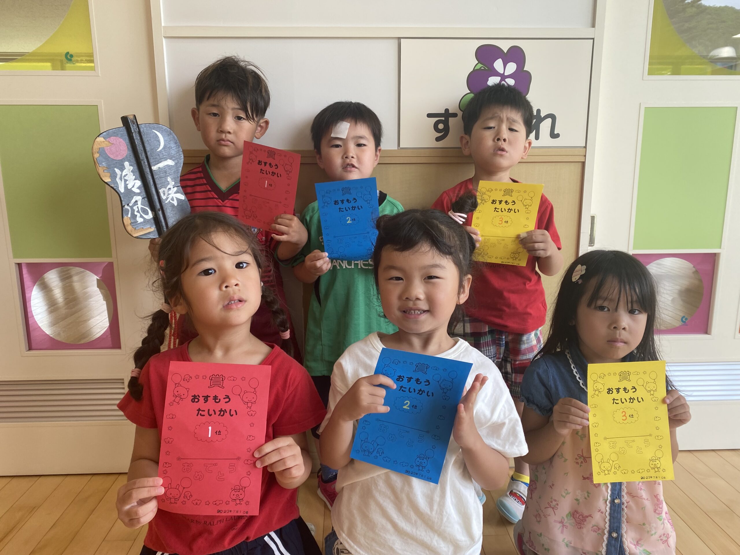 (35)令和5年度「年中学年 お相撲大会」 2023年7月10日 園内ブログ 本日7月10日(月)は各クラス毎にお部屋でおすもう大会を行いました。年中さんになって初めてのおすもう大会だった為、朝から緊張している子や気合十分な子それぞれでしたが、最後まで粘り強く頑張る姿が見られていました。悔し涙を流すお友だちも居ましたが気持ちを切り替え、2学期の大会に向けて意気込む様子が見られていたので、次回のおすもう大会でも頑張って欲しいと思います!!