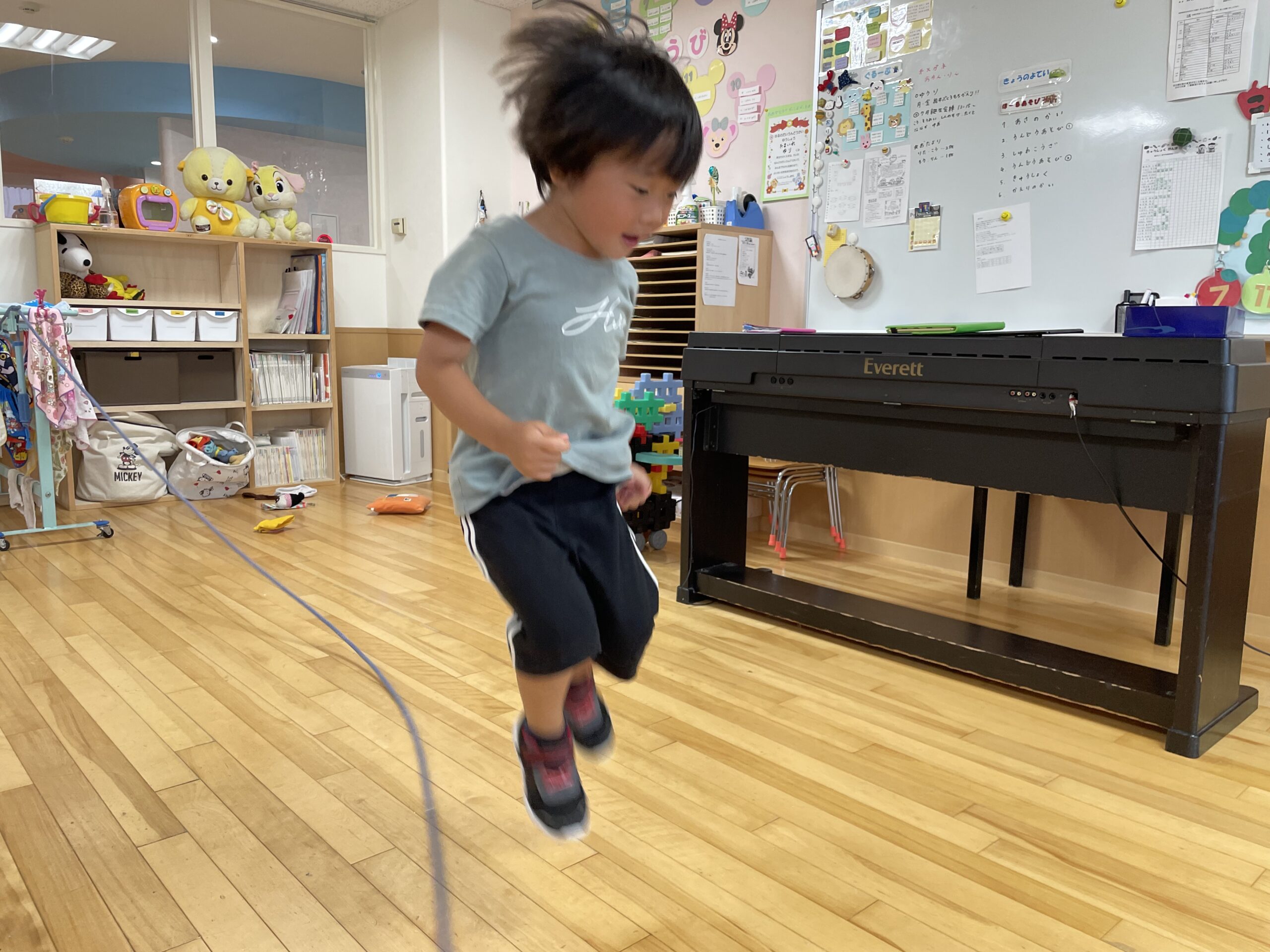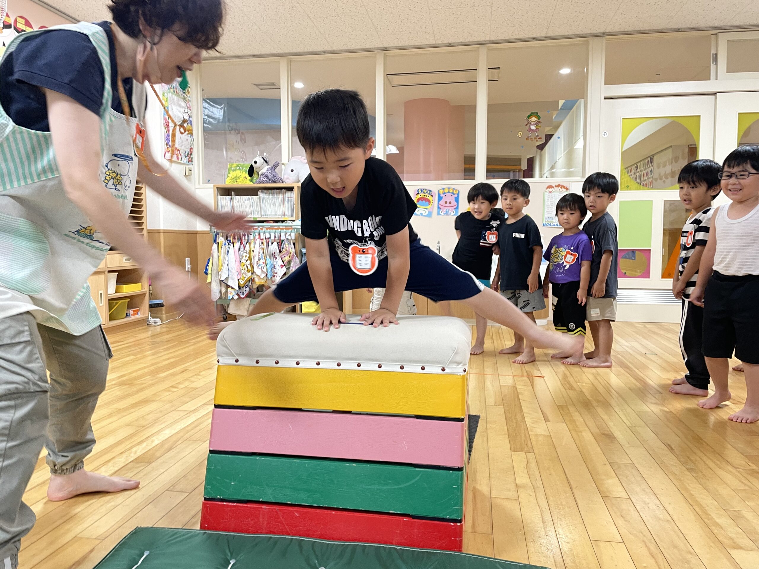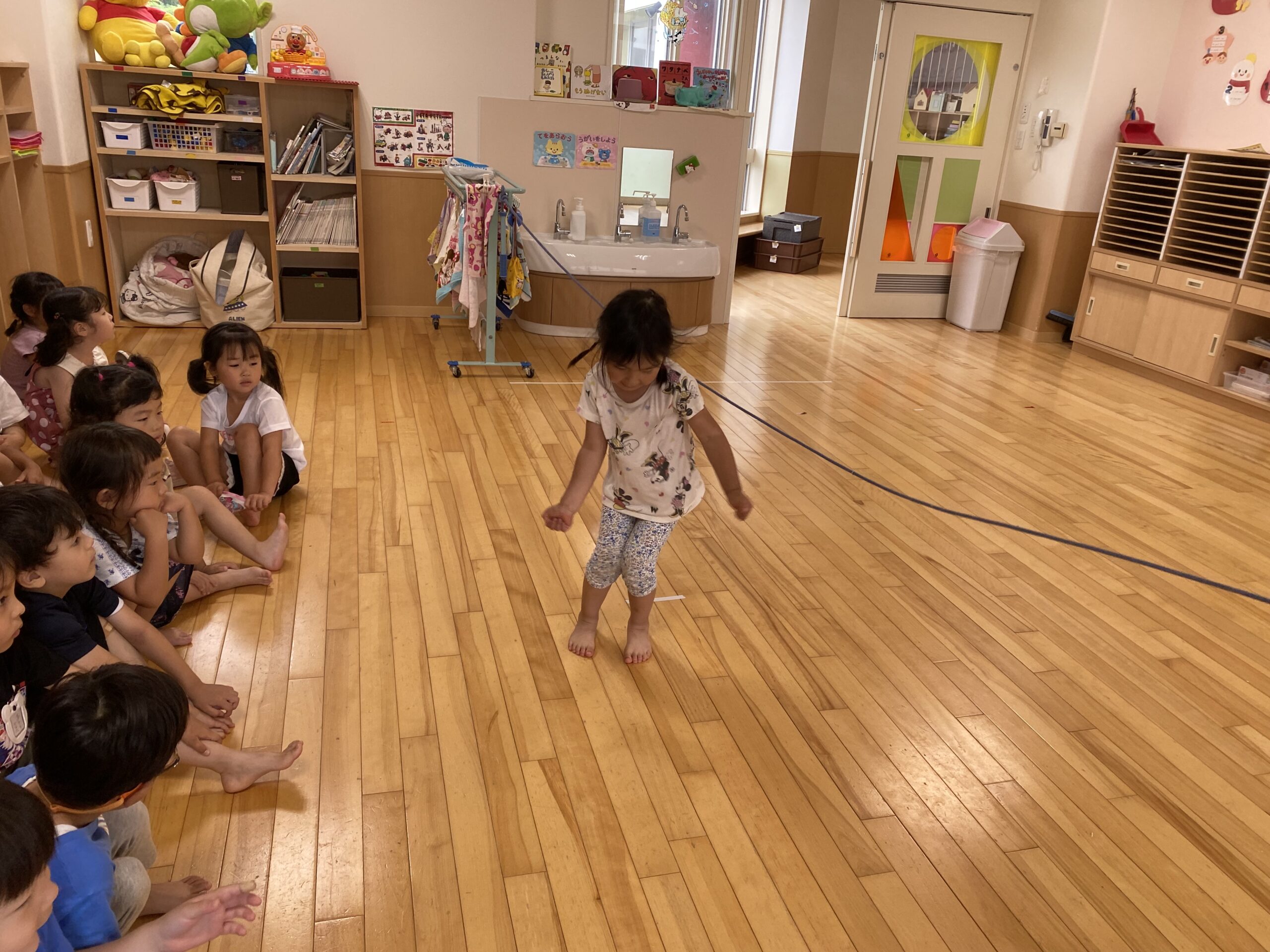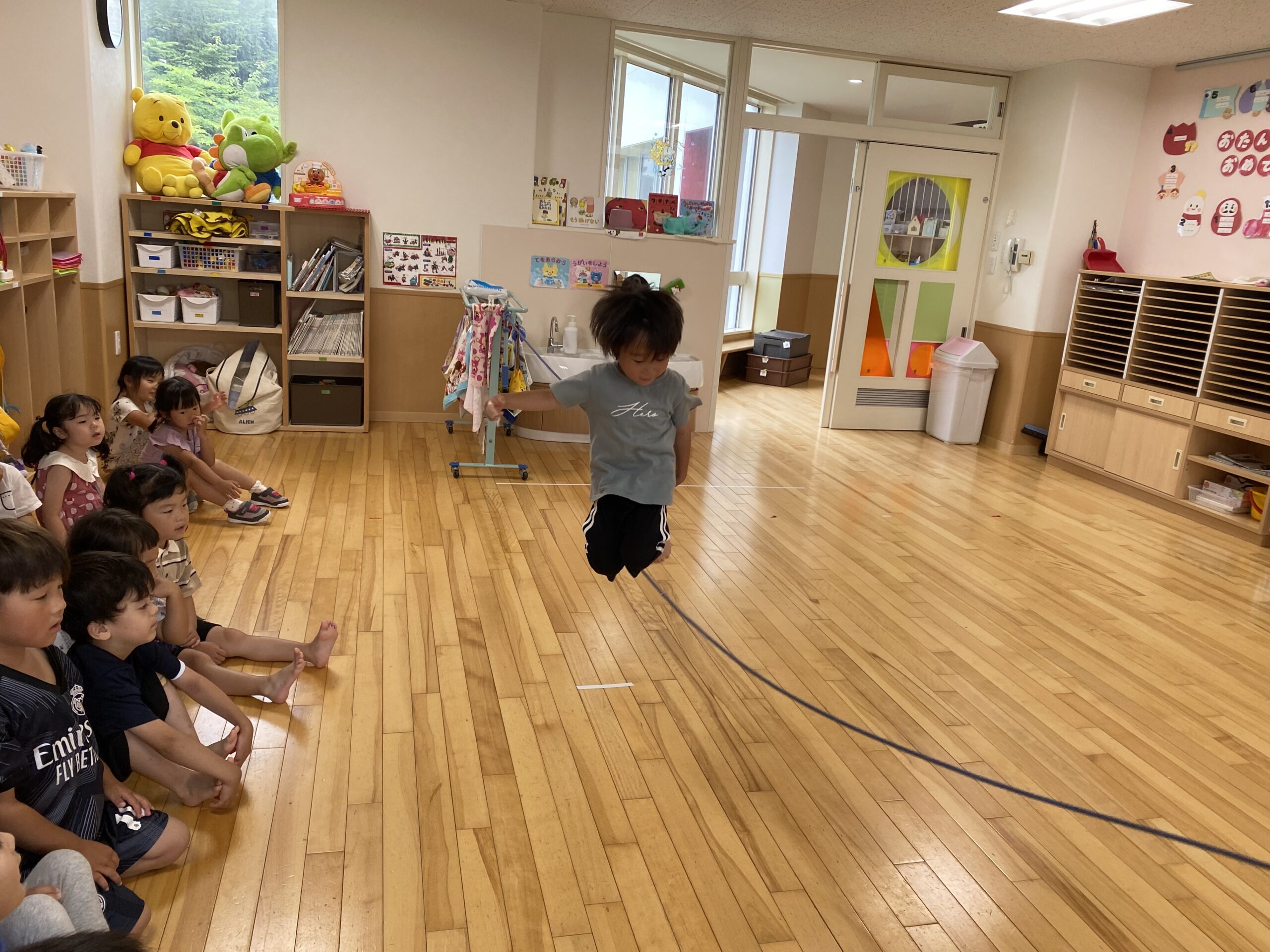 (38)令和5年度「年中学年 運動遊び」 2023年7月11日 園内ブログ 昨日の縄跳び遊びに続いて、今日はお部屋で運動遊びを行いました。雨が降り蒸し暑い中ですが、子どもたちは真剣に取り組んでいました。跳び箱や鉄棒、大縄跳びは意欲をもちながらも、楽しんでいる様子がみられました。体をたくさん動かして、暑さに負けない体づくりを目指したいと思います。明日は晴れたら水遊びで、雨の場合はリズム体操の予定です。 【ばら】 【ゆり】 【すみれ】