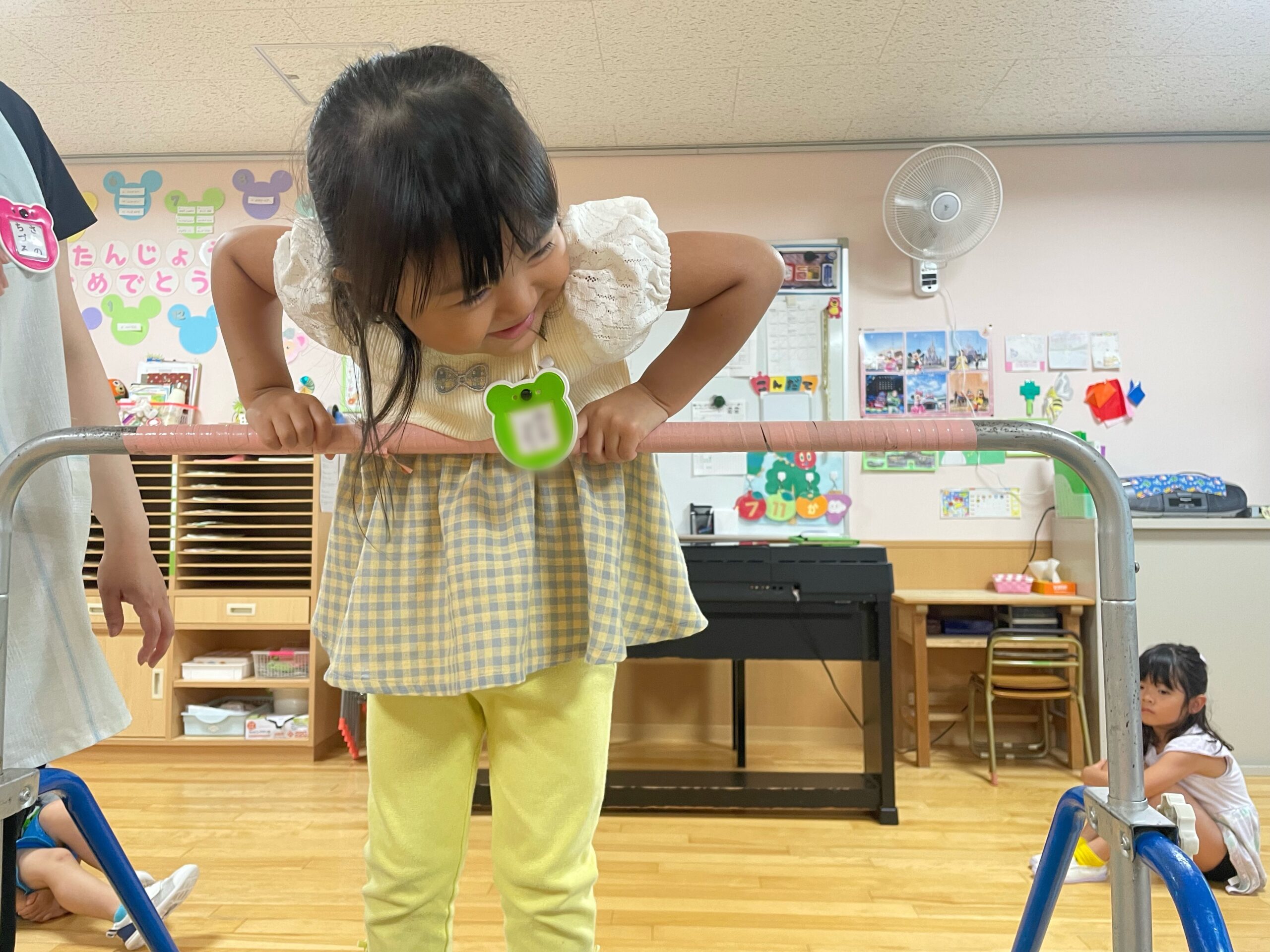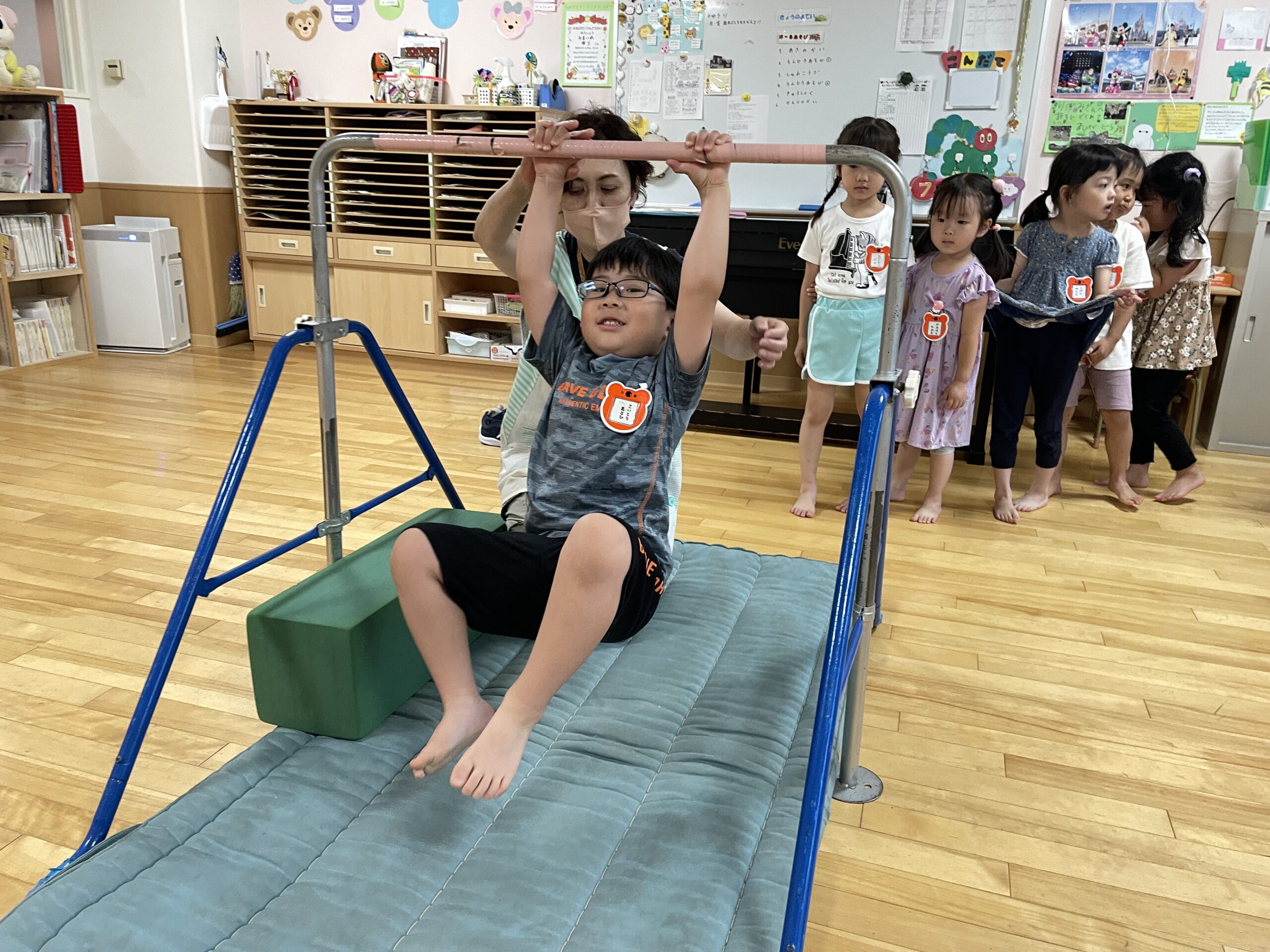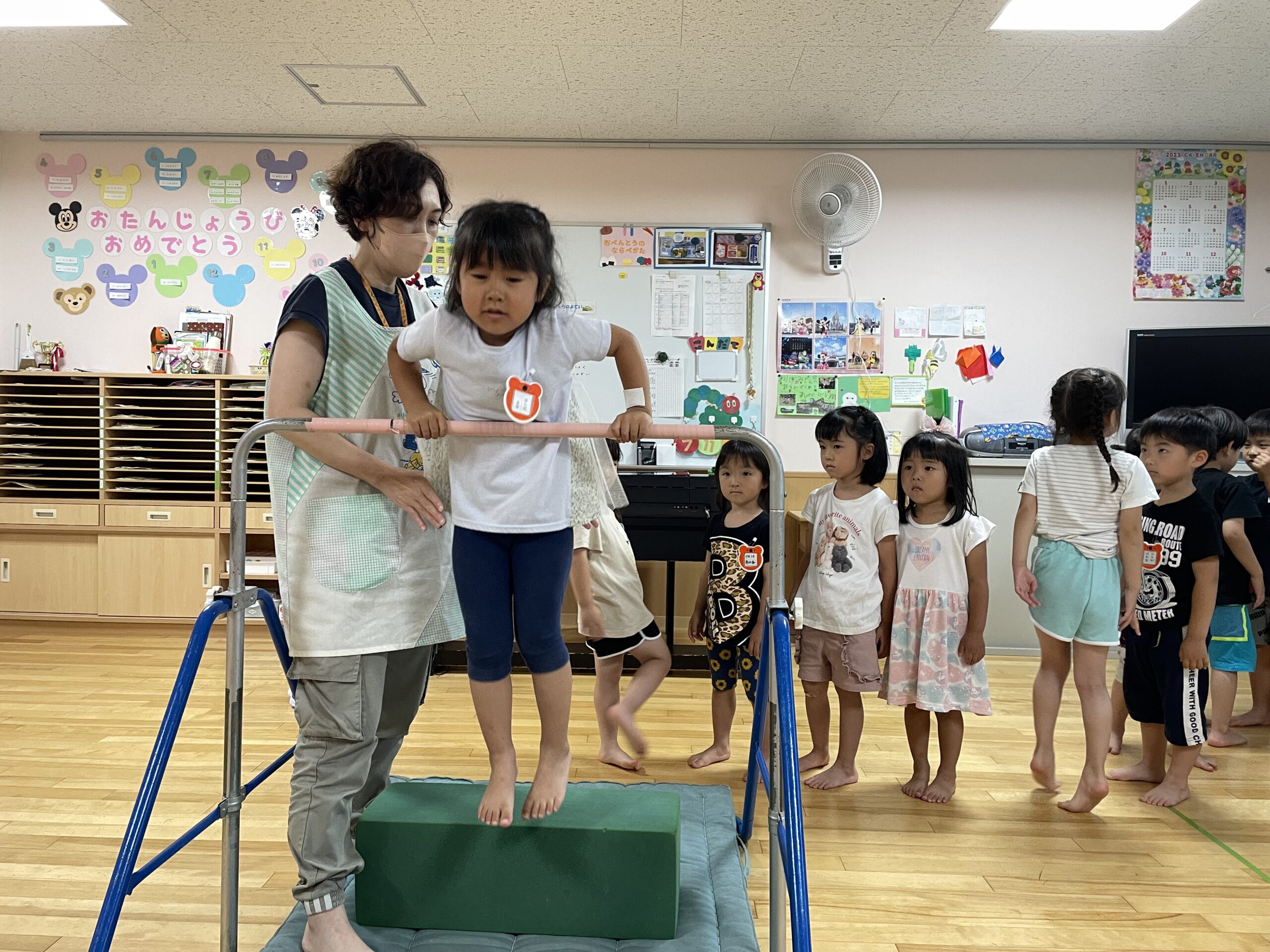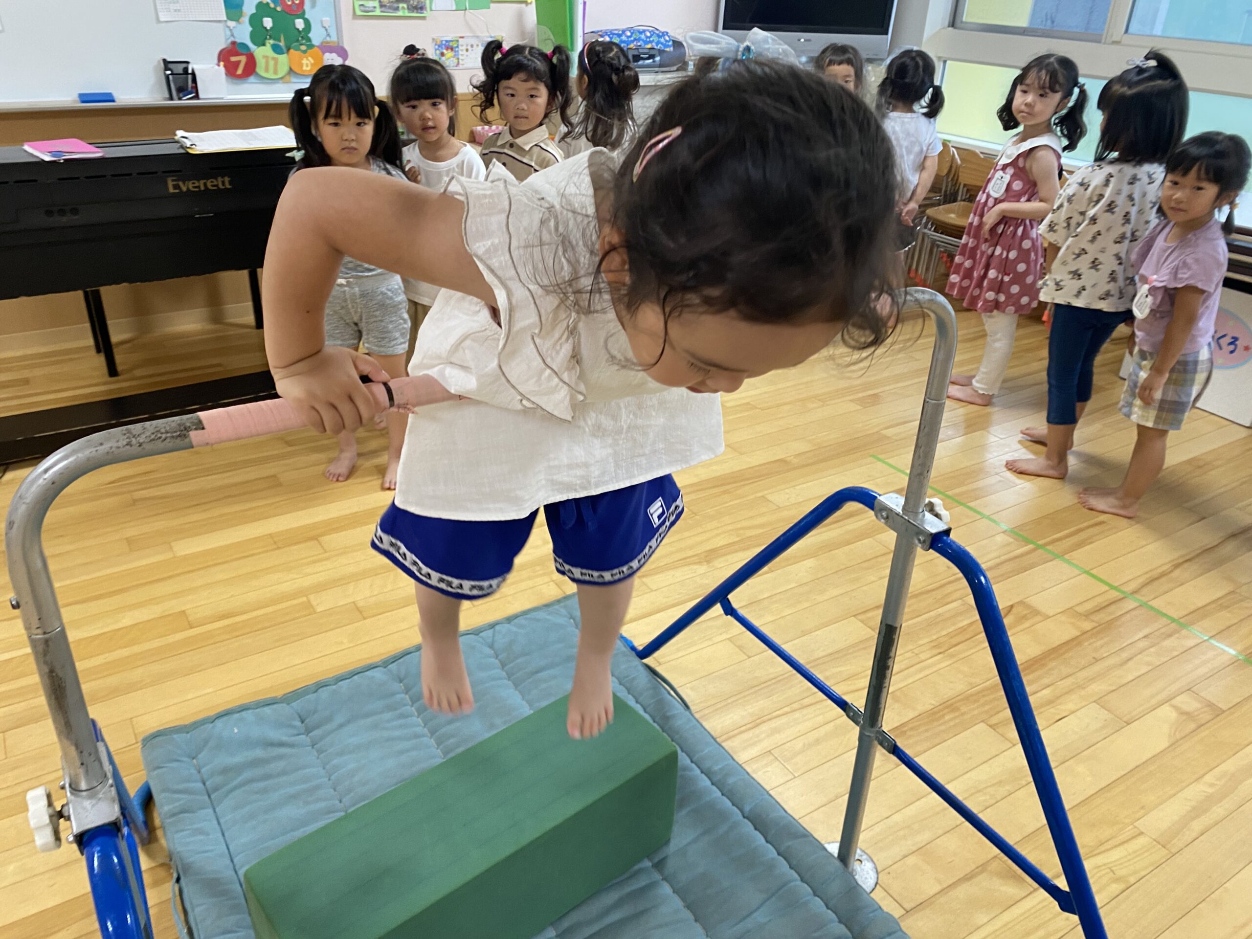 (38)令和5年度「年中学年 運動遊び」 2023年7月11日 園内ブログ 昨日の縄跳び遊びに続いて、今日はお部屋で運動遊びを行いました。雨が降り蒸し暑い中ですが、子どもたちは真剣に取り組んでいました。跳び箱や鉄棒、大縄跳びは意欲をもちながらも、楽しんでいる様子がみられました。体をたくさん動かして、暑さに負けない体づくりを目指したいと思います。明日は晴れたら水遊びで、雨の場合はリズム体操の予定です。 【ばら】 【ゆり】 【すみれ】