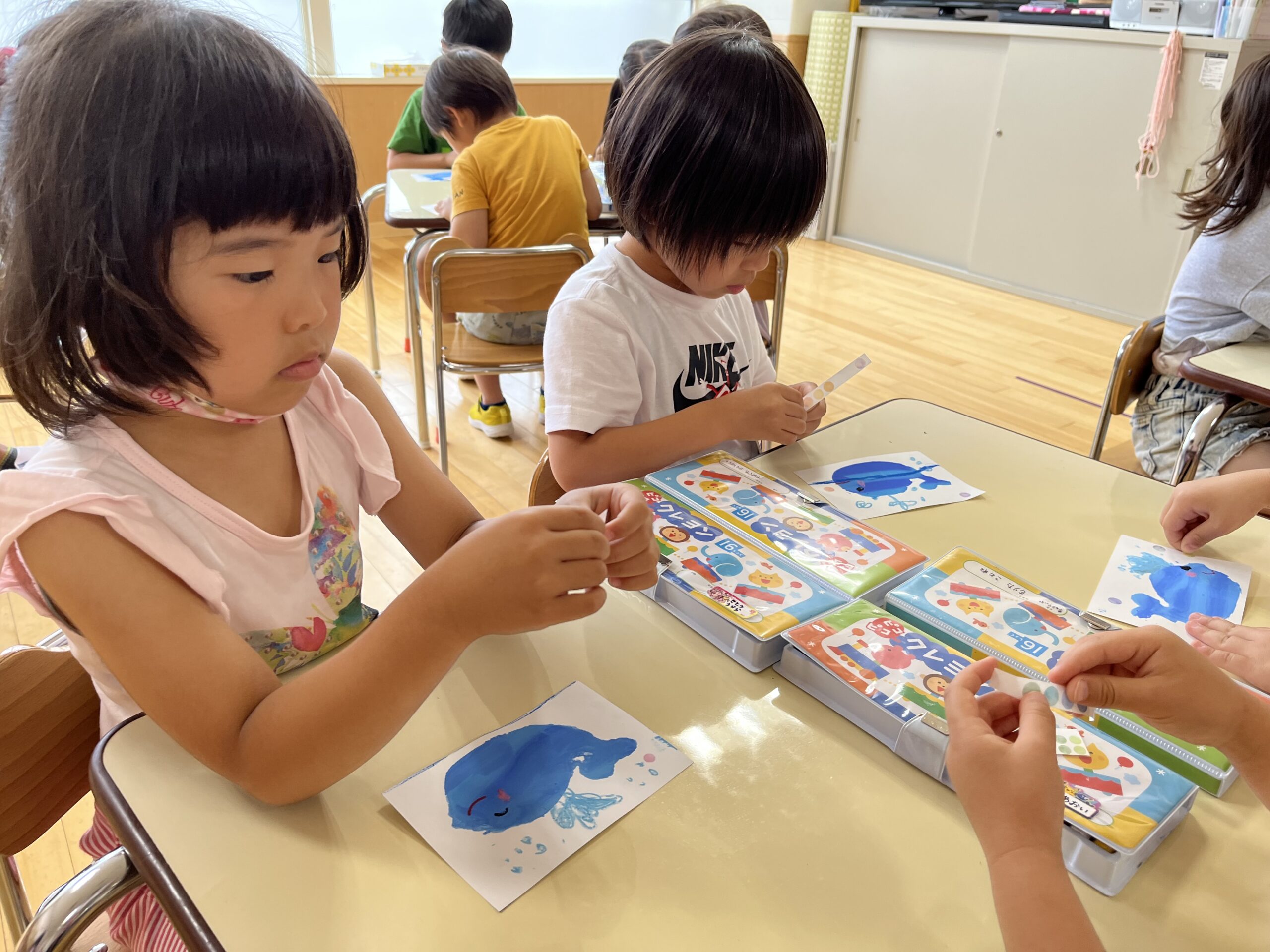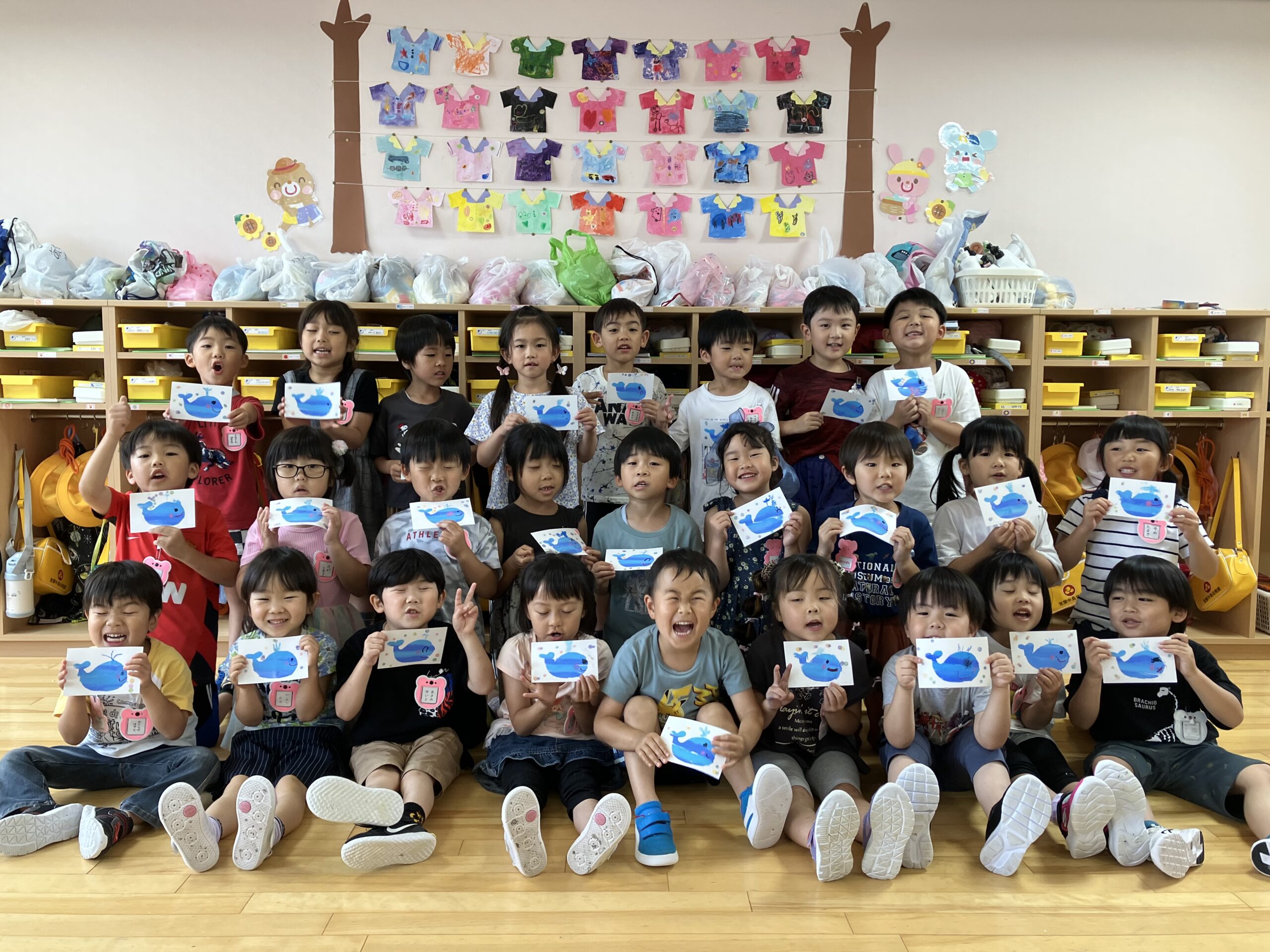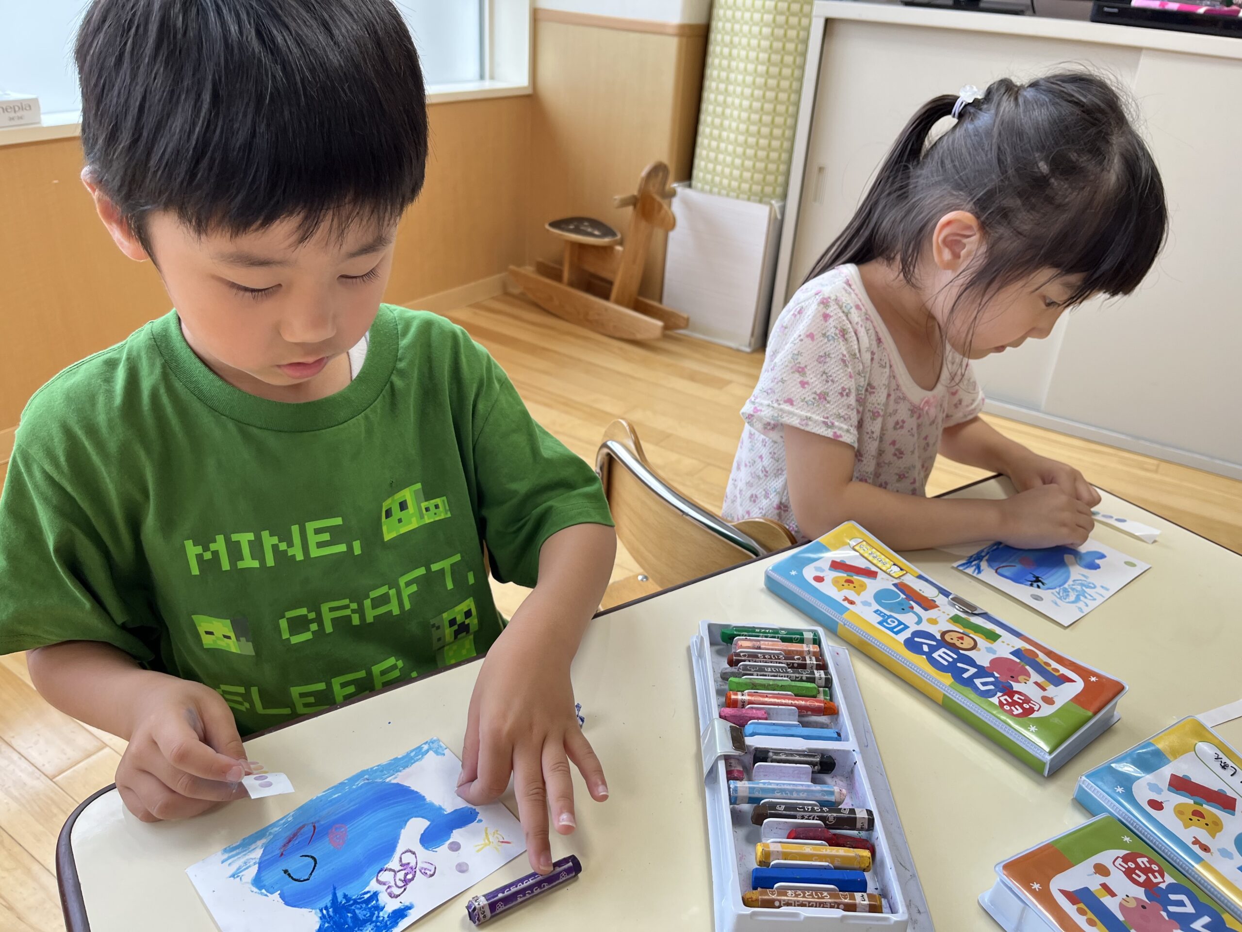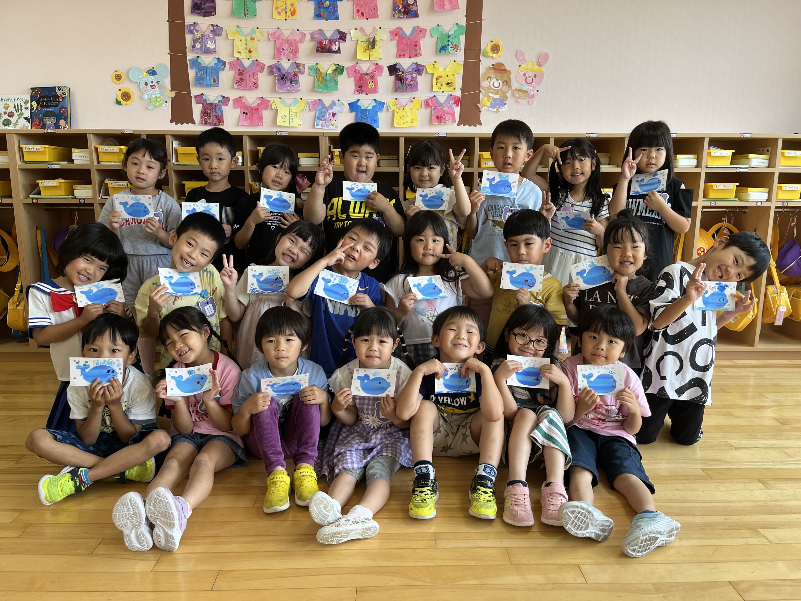 7月7日(金)7月12日(水)の2日間で、絵の具とスポンジを使ってはがき製作を行いました。グラデーションで綺麗なイルカが出来上がり子ども達も「きれい~」「かわいい」と製作を楽しむ姿が見られていました。本日、シール帳に挟めて持ち帰っています。切手を貼って投函できますので是非、ご活用ください♪