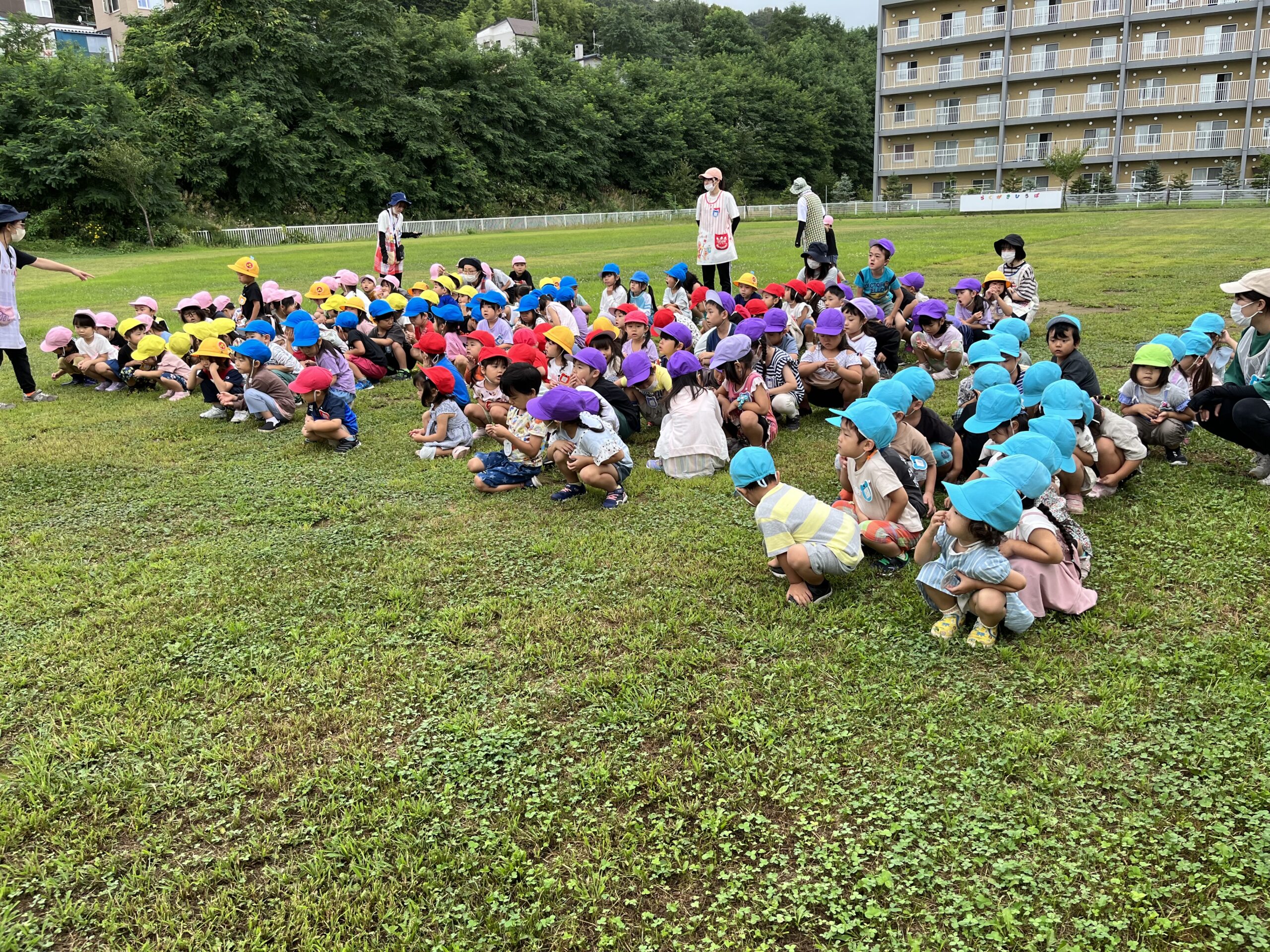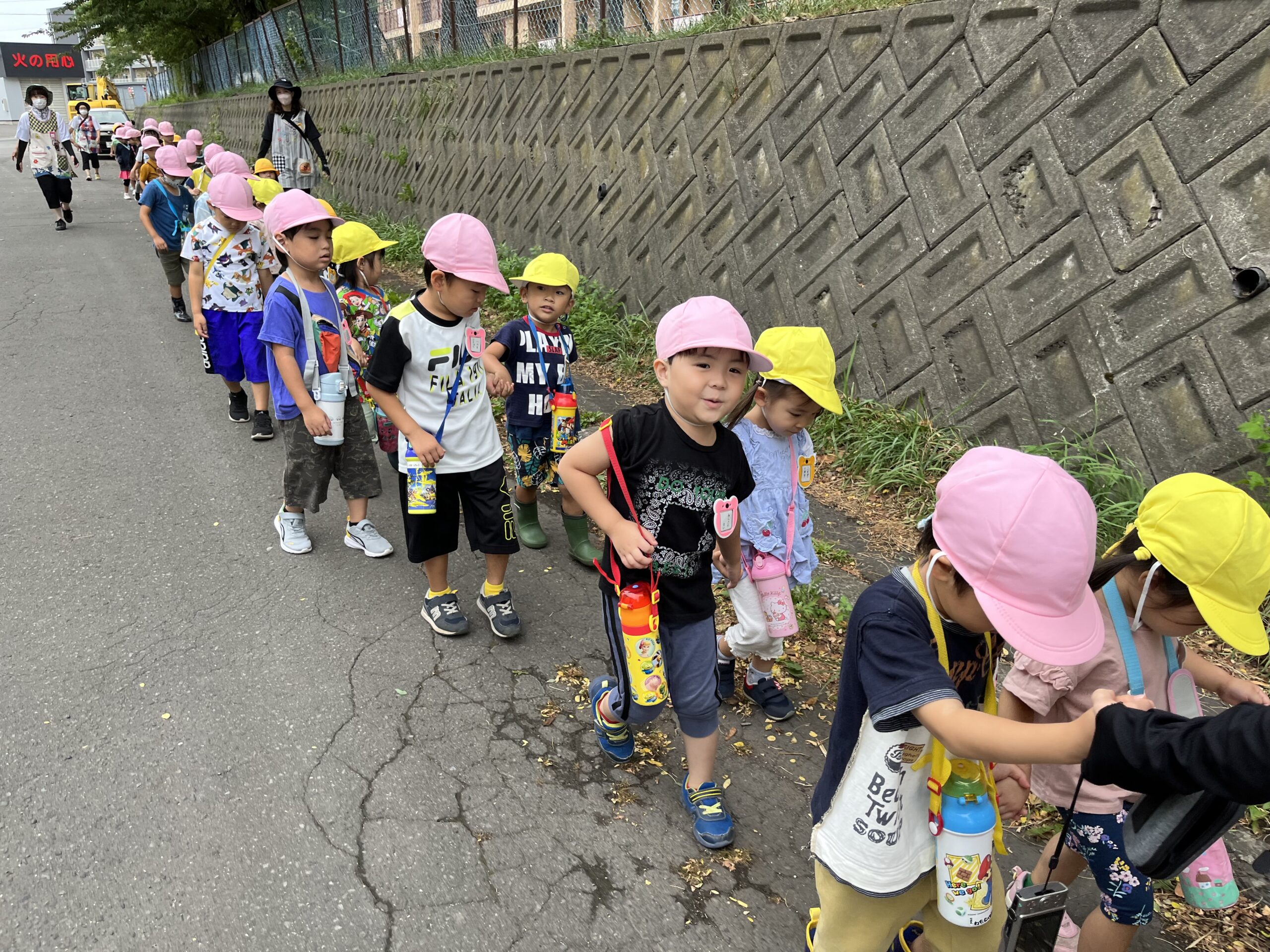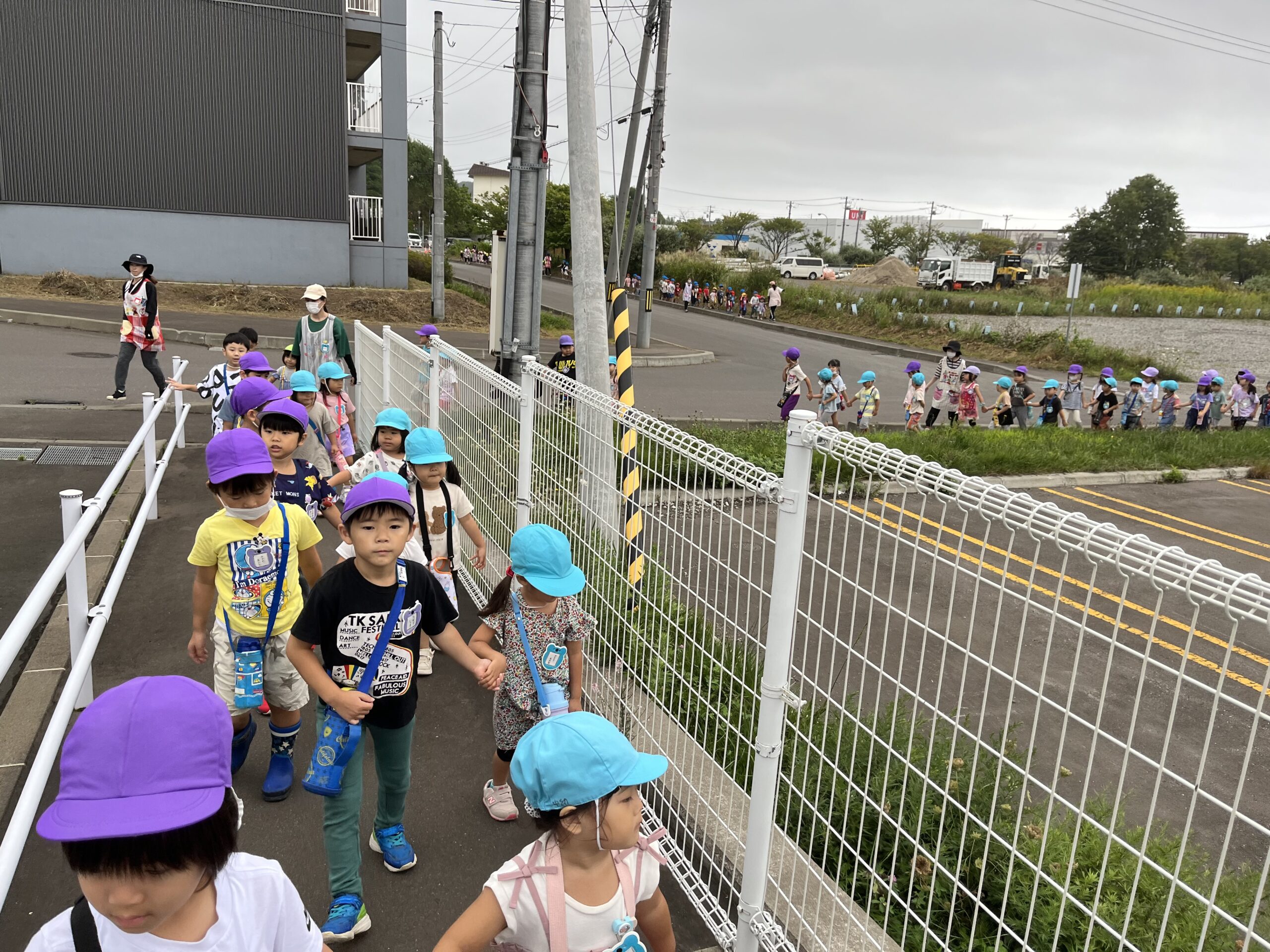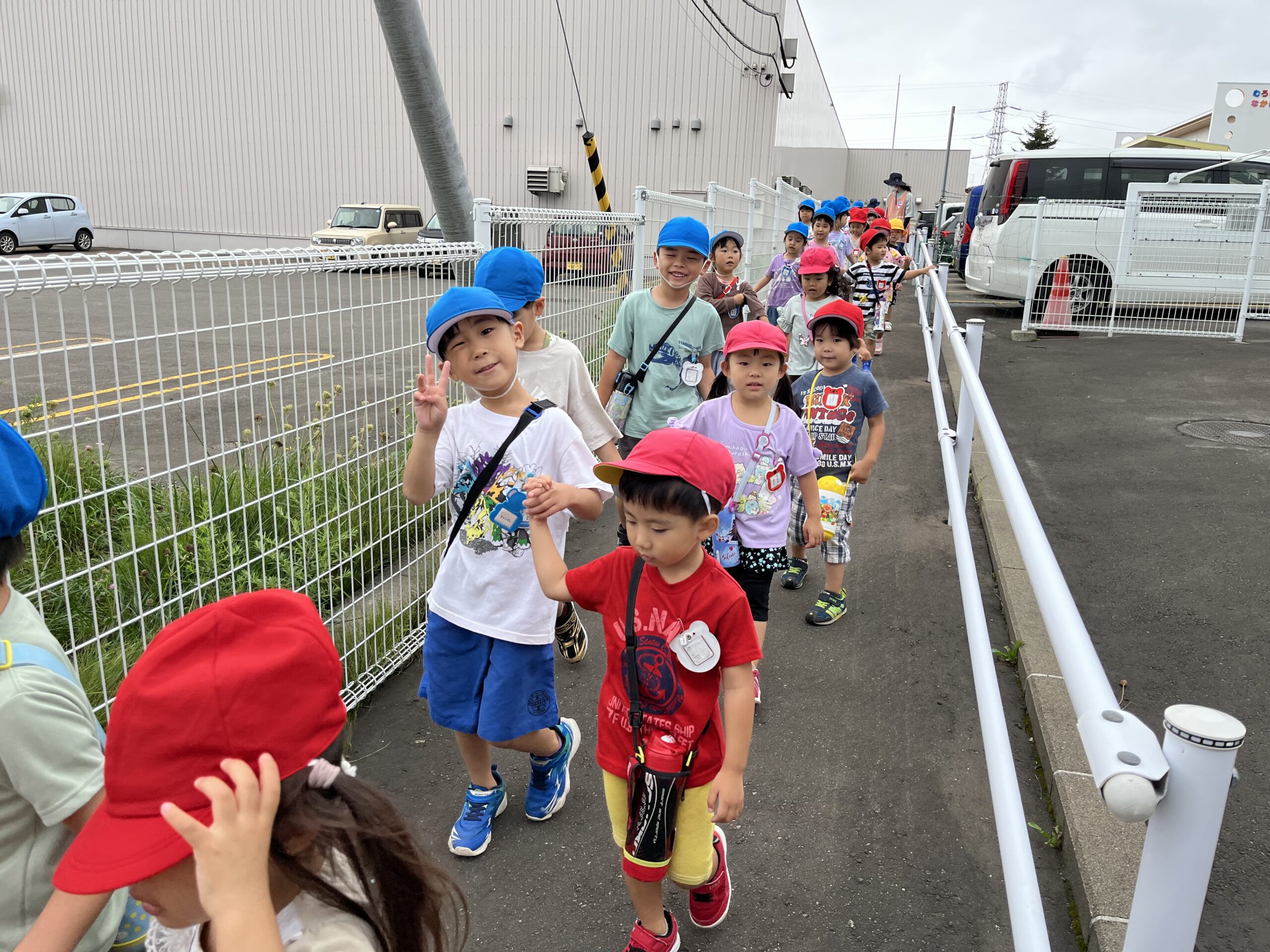 (55)令和5年度「年少・年長学年 お散歩」 2023年8月30日 園内ブログ 今日は年少・年長組合同でお散歩に出掛けました。年少さんは初めての園外活動でしたが、年長さんが手を繋ぎ、優しくリードしてくれたので、順調に歩き進めることができました。短い距離ではありましたが、年少さんは遠足の前に歩く練習をすることができて良かったと思います♪ 年長組さんありがとうございました☺️ 幼稚園に戻ってきたあとは外遊びをしました。曇り空ではありましたが、久しぶりに涼しかったので、たくさん遊ぶことができました! 今日の病気欠席者は、風邪1名、発熱7名、咳5名、鼻水1名、体調不良1名です。
