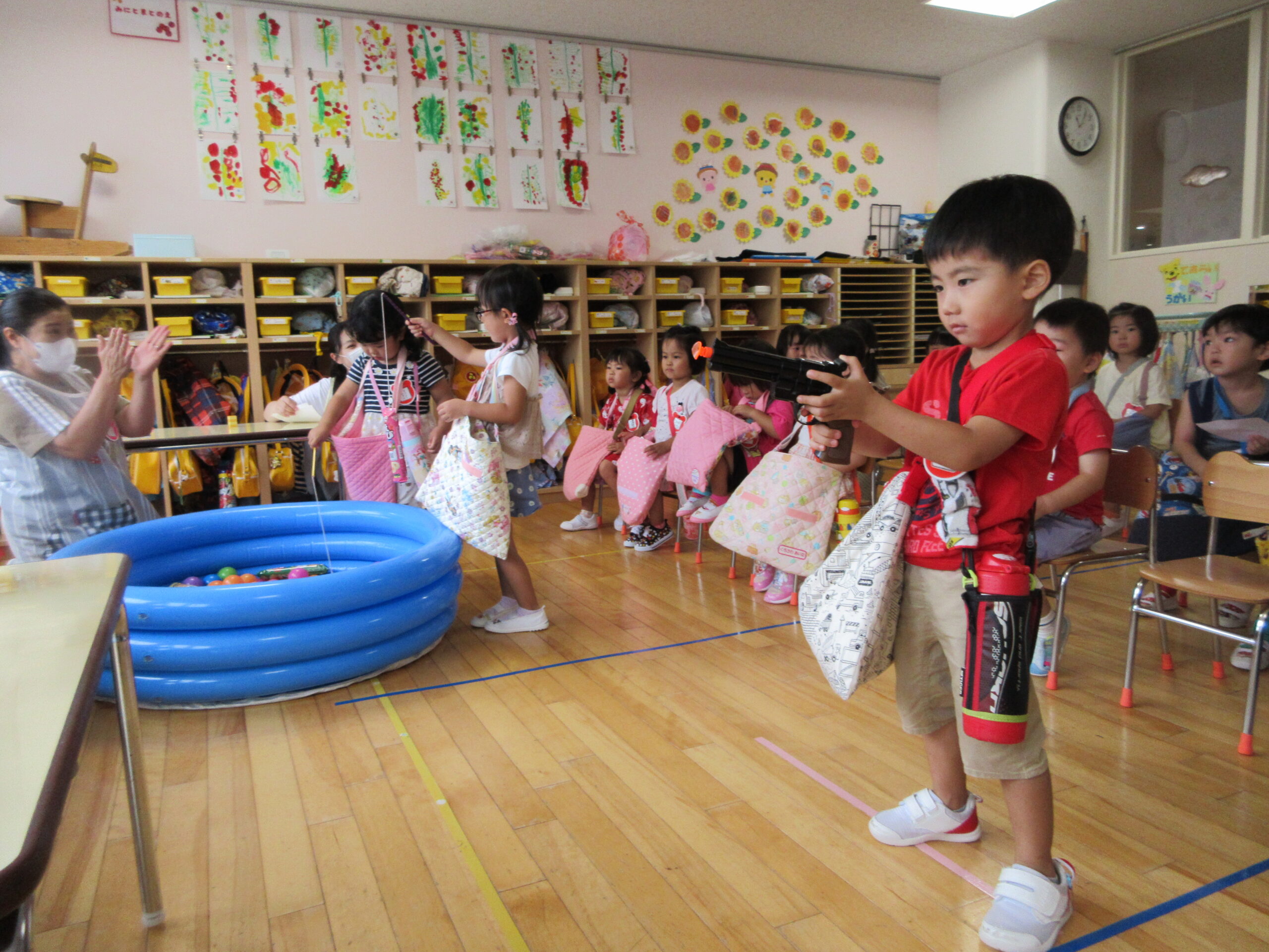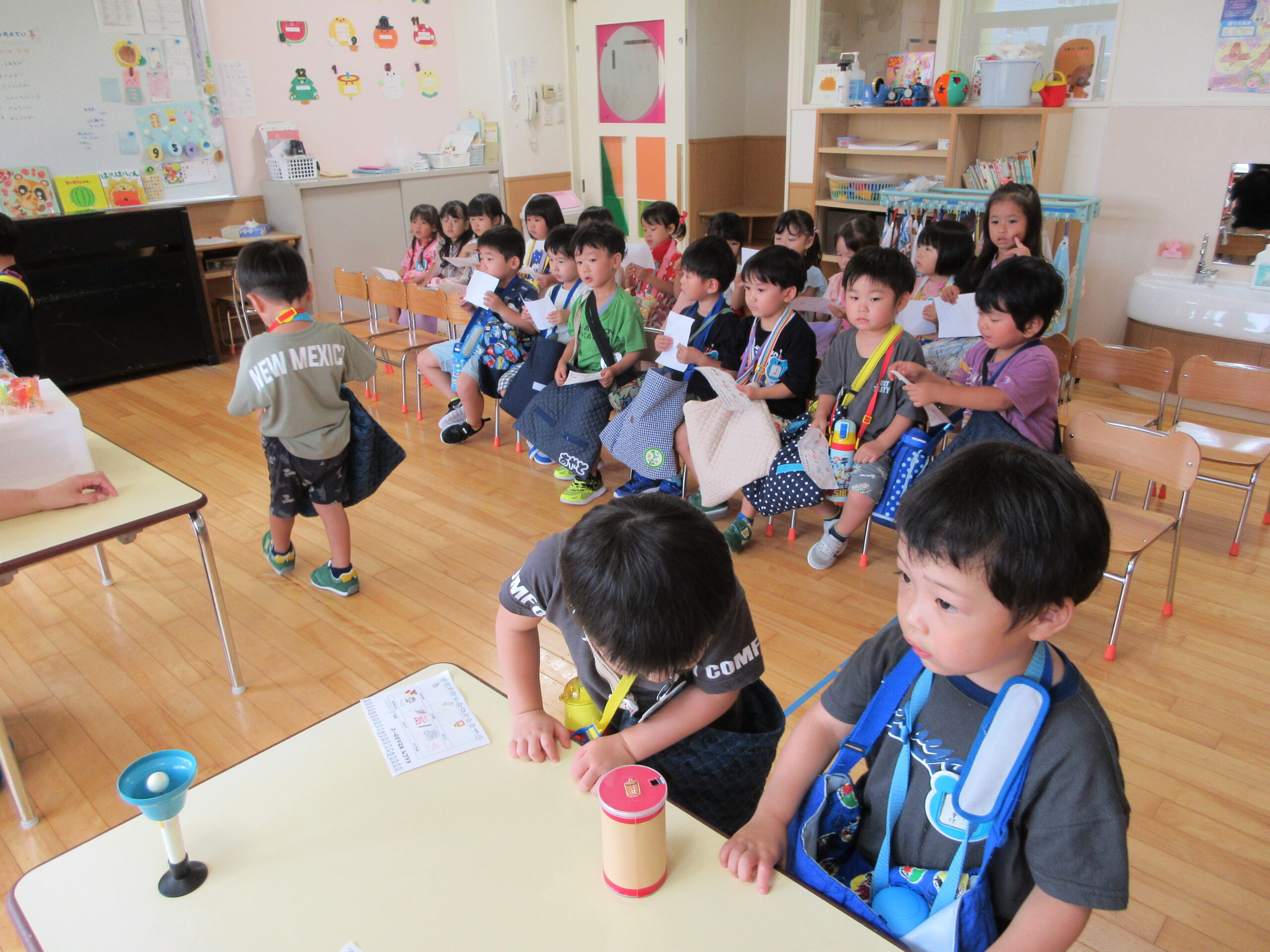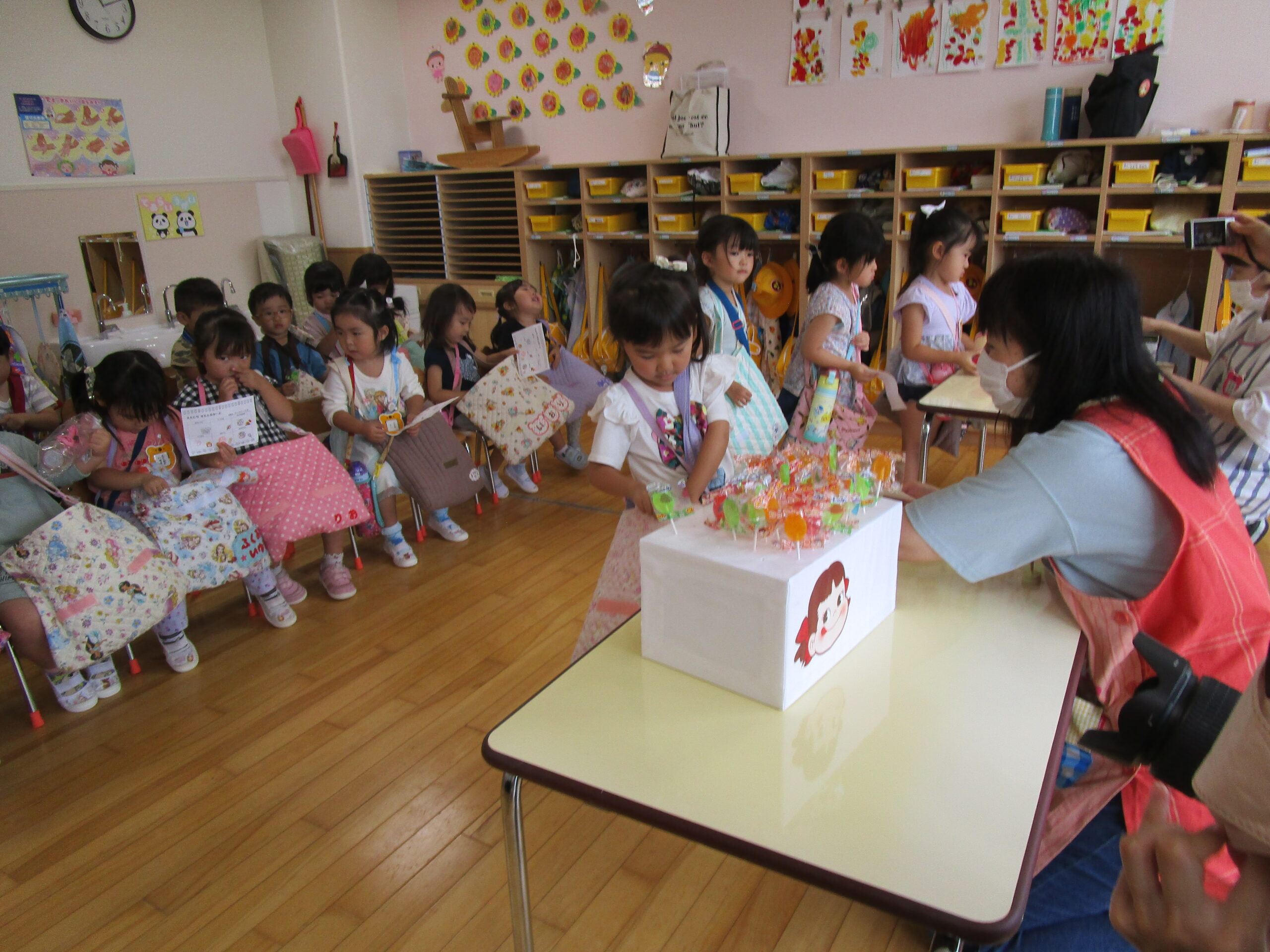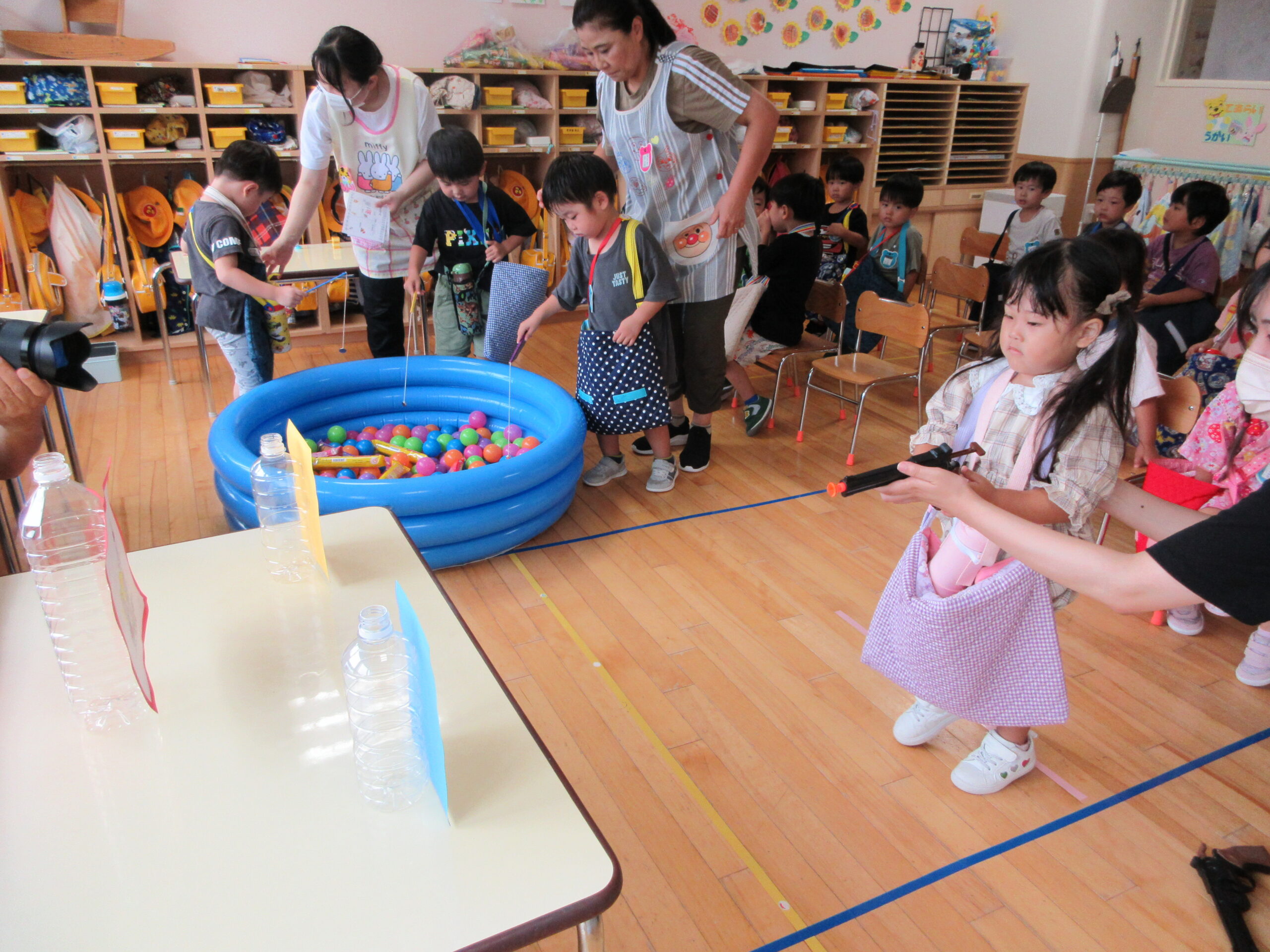 今年度より初めて取り組む行事の一つが「縁日ごっこ」です。お店屋さんごっこに因んで子ども達が興味を示し、楽しめる縁日ごっことなりました。今日9月5日(火)は年少学年であり、子ども達は各クラスの催し物に目をキラキラさせていました。射的や釣り、もぐらたたきやおみくじ等、クラスをまわりながら景品を受け取り、楽しい時間を過ごすことができました。