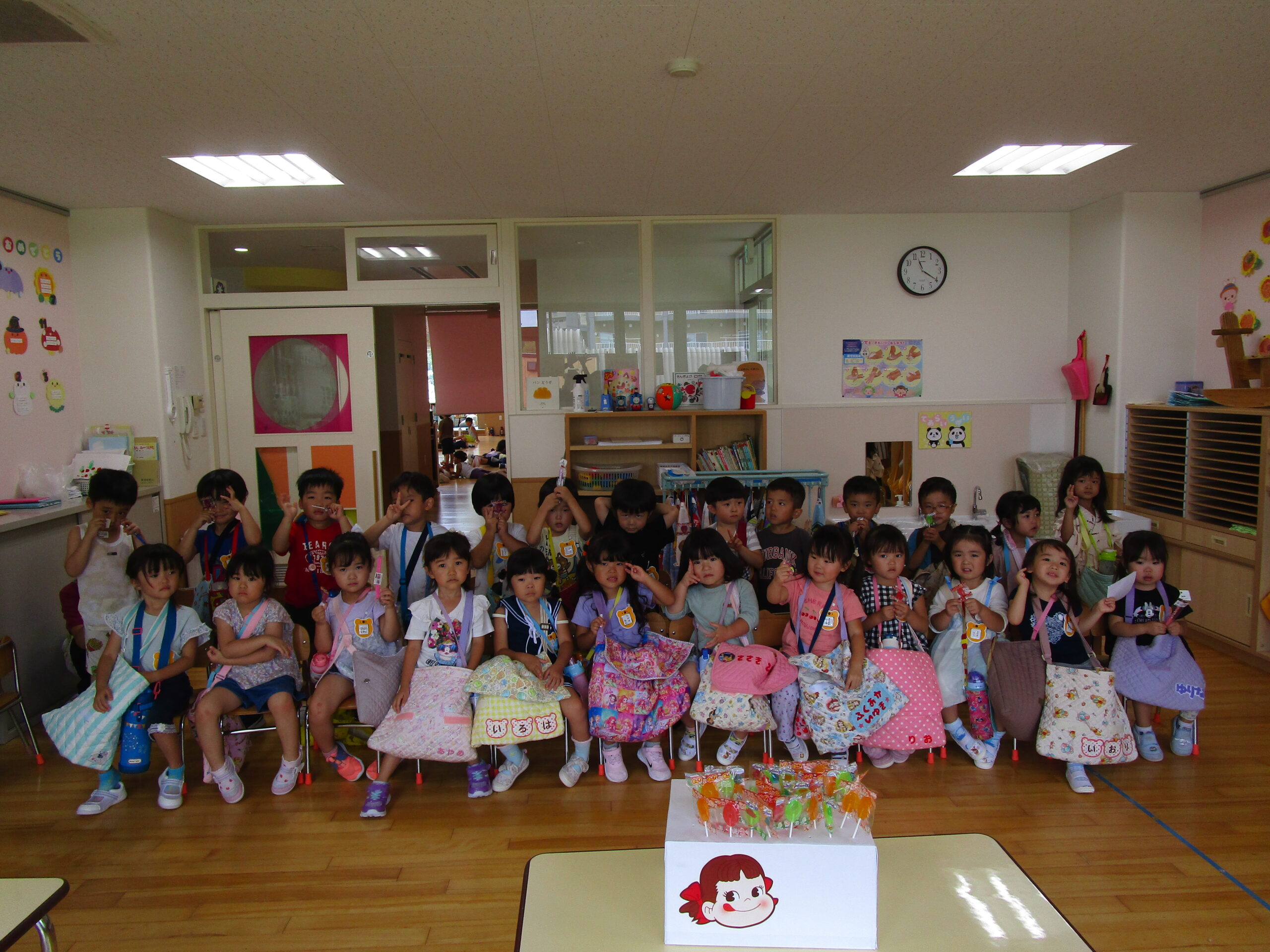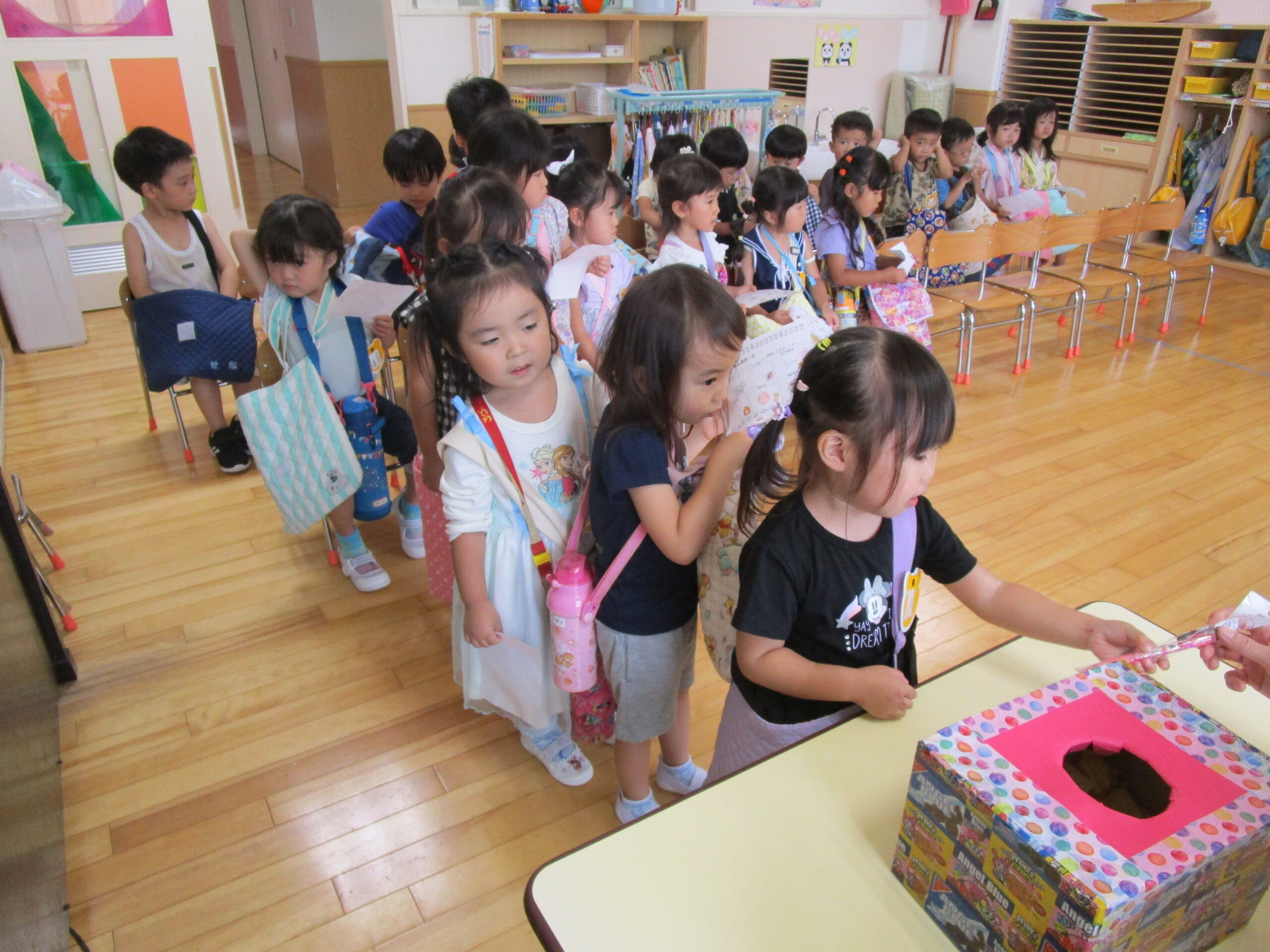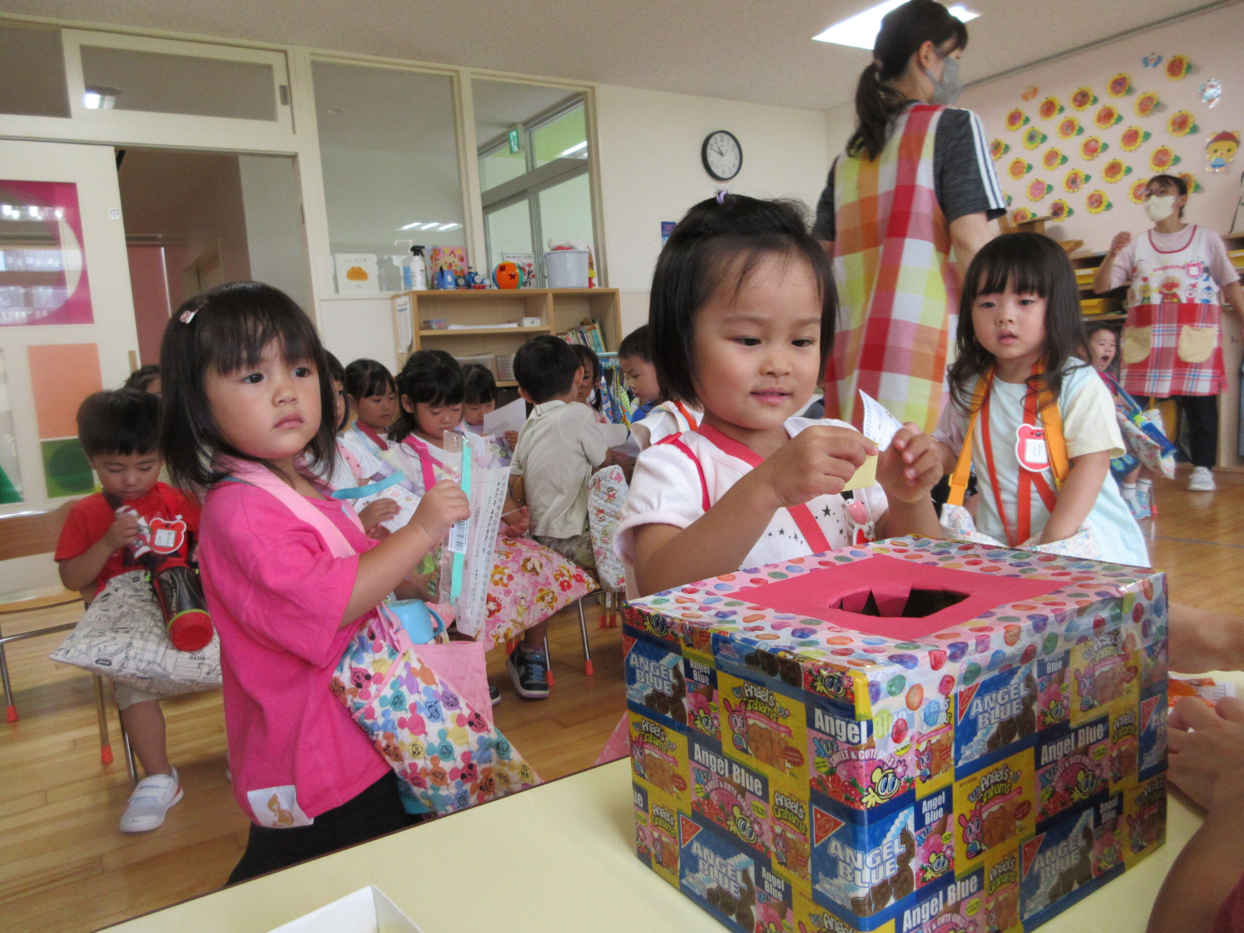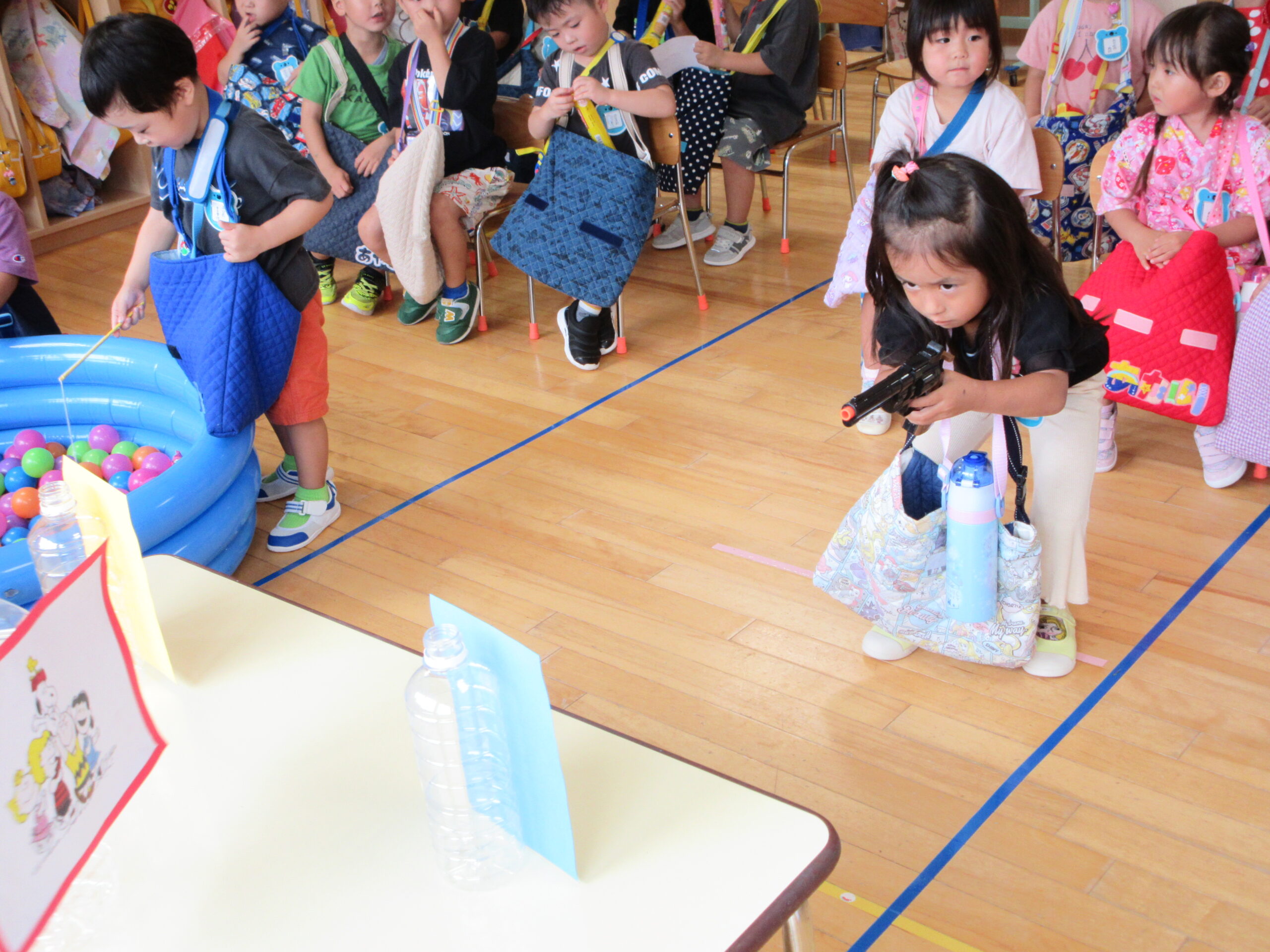 今年度より初めて取り組む行事の一つが「縁日ごっこ」です。お店屋さんごっこに因んで子ども達が興味を示し、楽しめる縁日ごっことなりました。今日9月5日(火)は年少学年であり、子ども達は各クラスの催し物に目をキラキラさせていました。射的や釣り、もぐらたたきやおみくじ等、クラスをまわりながら景品を受け取り、楽しい時間を過ごすことができました。