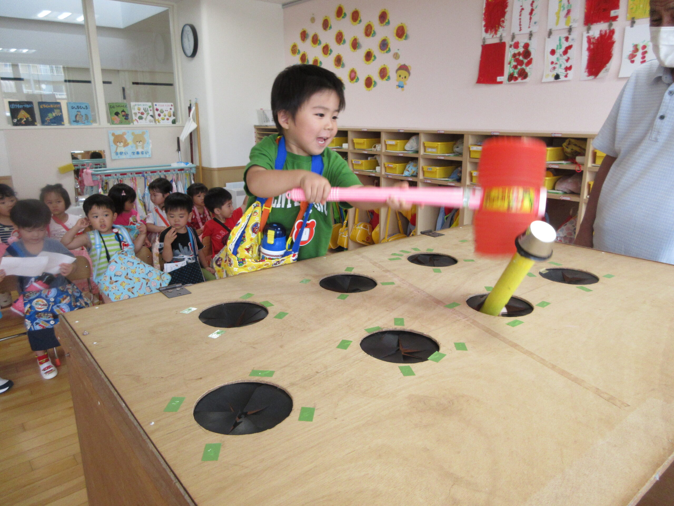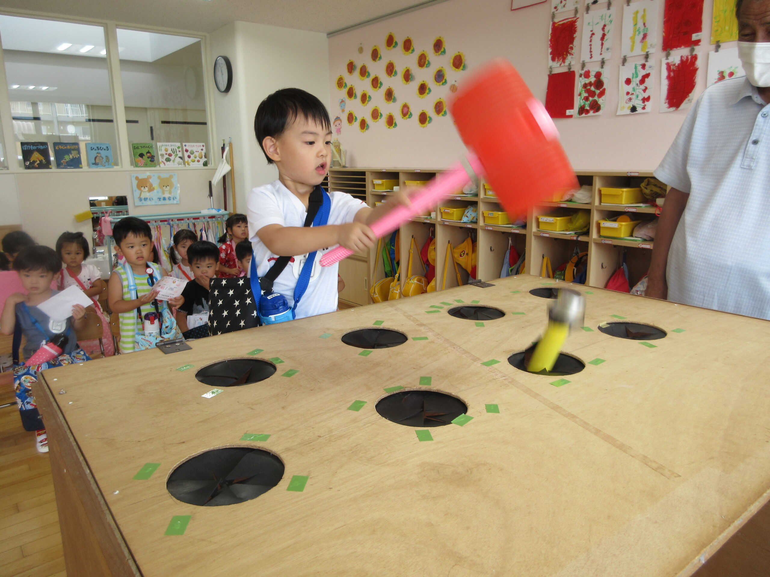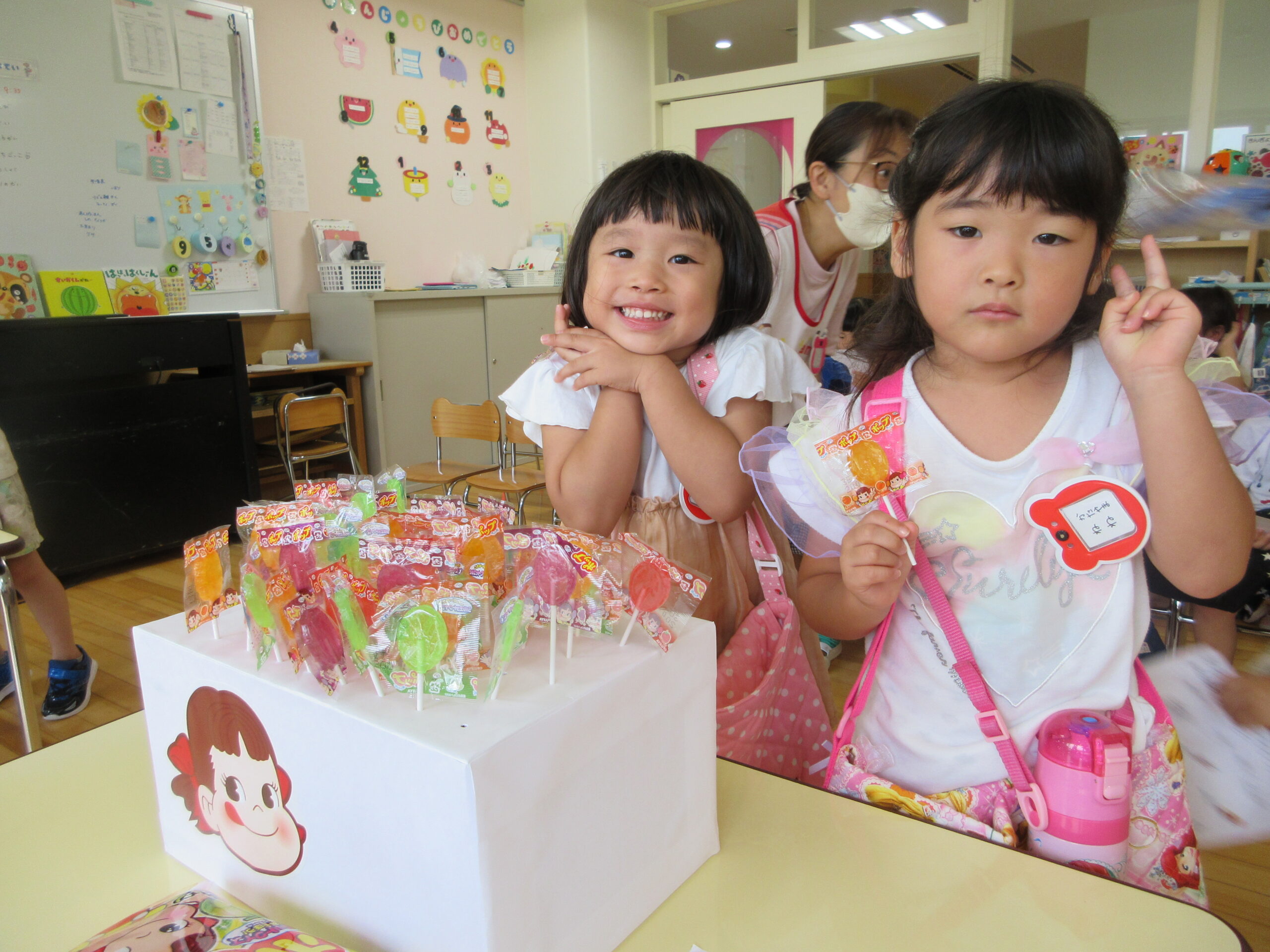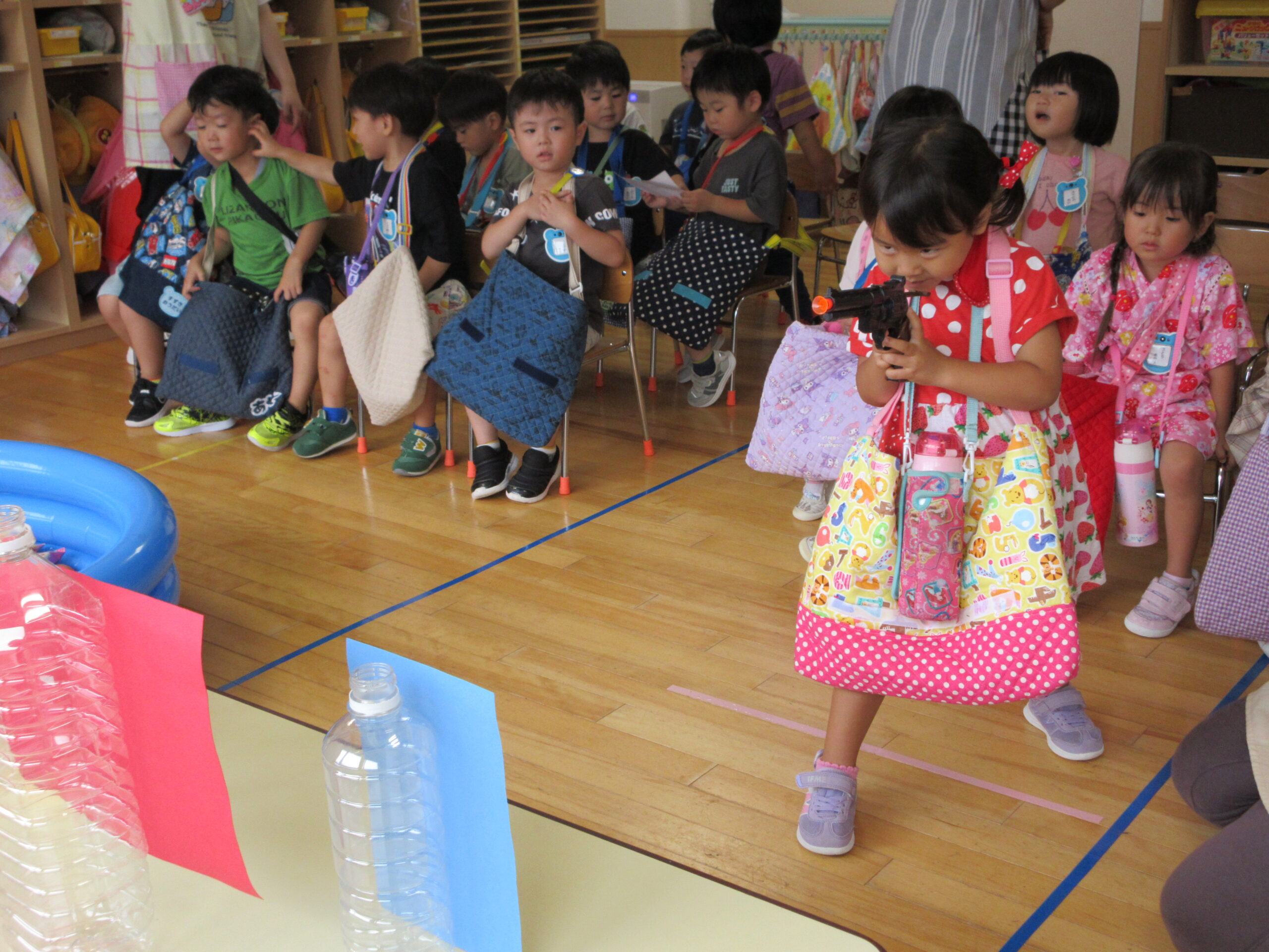今年度より初めて取り組む行事の一つが「縁日ごっこ」です。お店屋さんごっこに因んで子ども達が興味を示し、楽しめる縁日ごっことなりました。今日9月5日(火)は年少学年であり、子ども達は各クラスの催し物に目をキラキラさせていました。射的や釣り、もぐらたたきやおみくじ等、クラスをまわりながら景品を受け取り、楽しい時間を過ごすことができました。